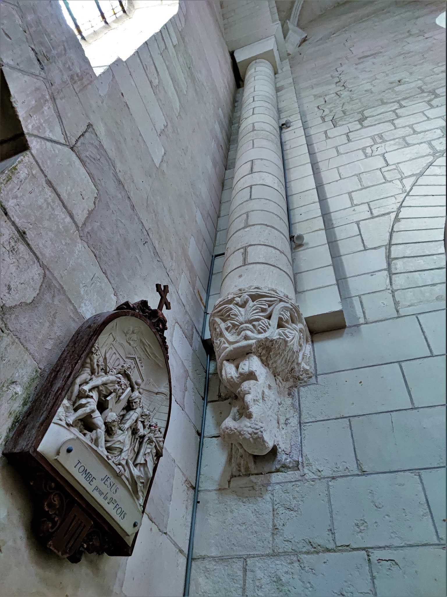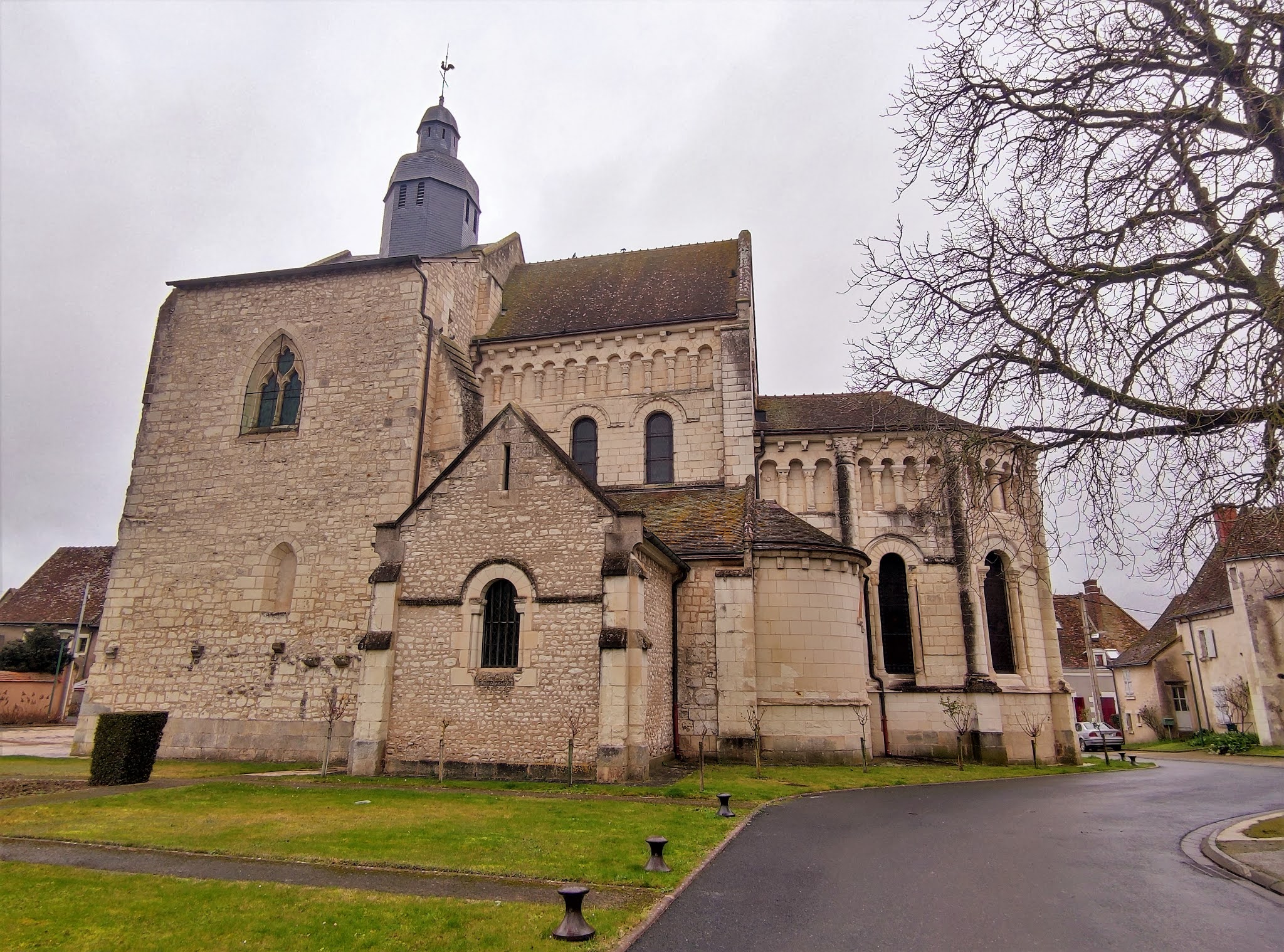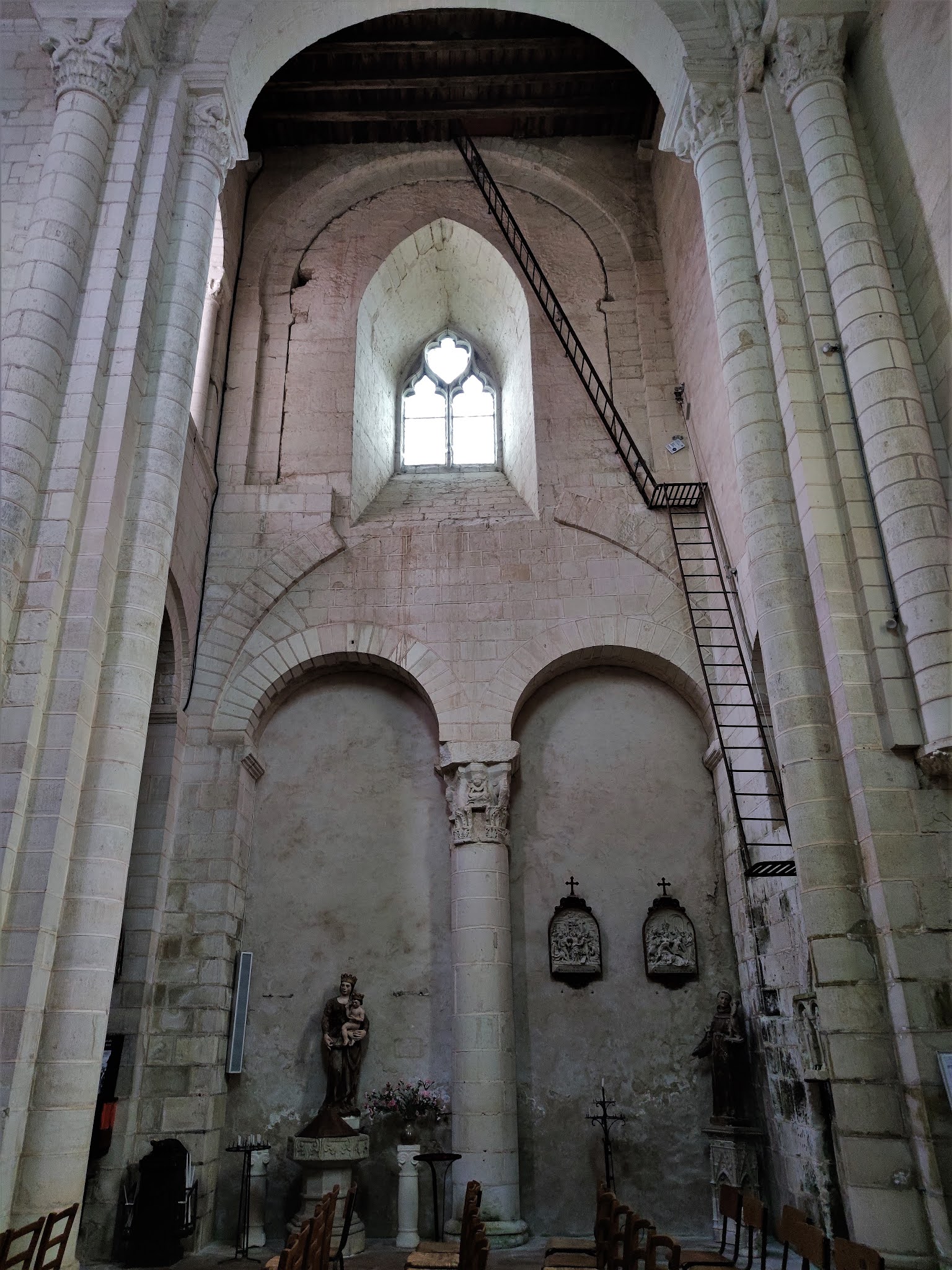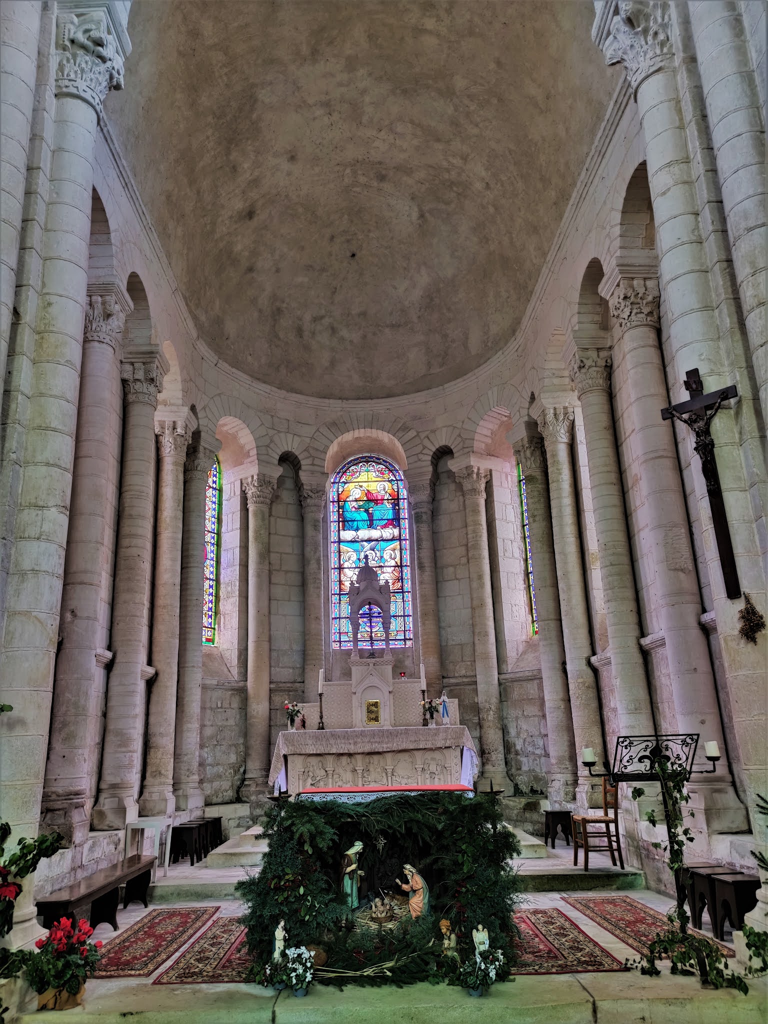 L'abbatiale Saint-Genou a été amputée de sa nef au 17ème siècle mais ce qu'il en reste est superbe. Les décors sculptés, à l'extérieur et surtout à l'intérieur sont des modèles de l'art roman. Les chapiteaux des colonnes du chœur sont exceptionnels et méritent à eux seuls un détour. Mais l'ensemble de l'édifice est magnifique, j'ai été enthousiasmé par cette visite. La nef, en piteux état au 17ème siècle, suite à un manque d'entretien, ne fut pas reconstruite. Restent de l'église, l'essentiel du transept, le chœur, ses bas côtés, séparés du vaisseau central par des arcades et colonnes, et le sanctuaire, abrité dans une abside. Cette dernière est encadrée au Sud et au Nord par deux absidioles qui limitent à l'Est les bas-côtés du chœur. L'abbatiale succéda à la création au 9ème siècle d'une communauté Bénédictine détruite par les Normands et autres envahisseurs. Construite, semble-t-il au début du 12ème siècle, son histoire et celle de Saint-Genou comportent quelques incertitudes, mais les légendes sont aussi parties intégrante de l'histoire et en alimentent le charme. Concernant l'histoire de l'église, les repères historiques manquent, les archives ayant été détruites par en 1580 par l'abbé aux commandes de l'abbaye. Ce que l'on sait, c'est que l'abbaye répondait à deux autorités, les archevêques de Tours et de Bourges. Cette double dépendance provoqua un manque complet de rectitude, la règle de Saint-Benoit était abandonnée, seul comptait l'enrichissement personnel de l'abbé. Le Patron de cette église vivait au 3ème siècle et fut désigné par le pape pour une mission d'évangélisation. Saint-Genou partit avec Saint-Genius (son père ou son compagnon selon les sources) et devint premier évêque de Cahors (pour certains, cela serait faux, conséquence d'une confusion dans le nom).