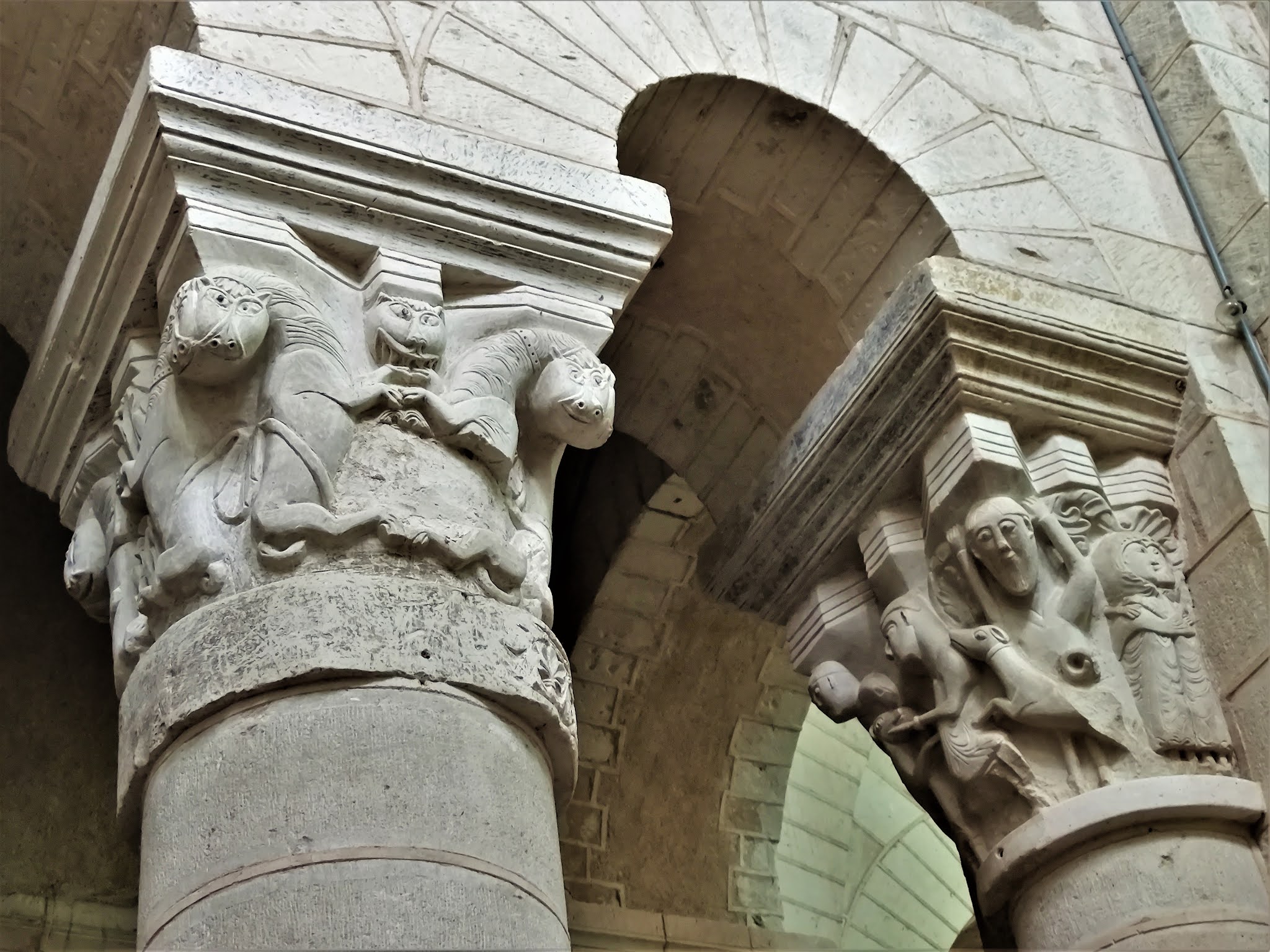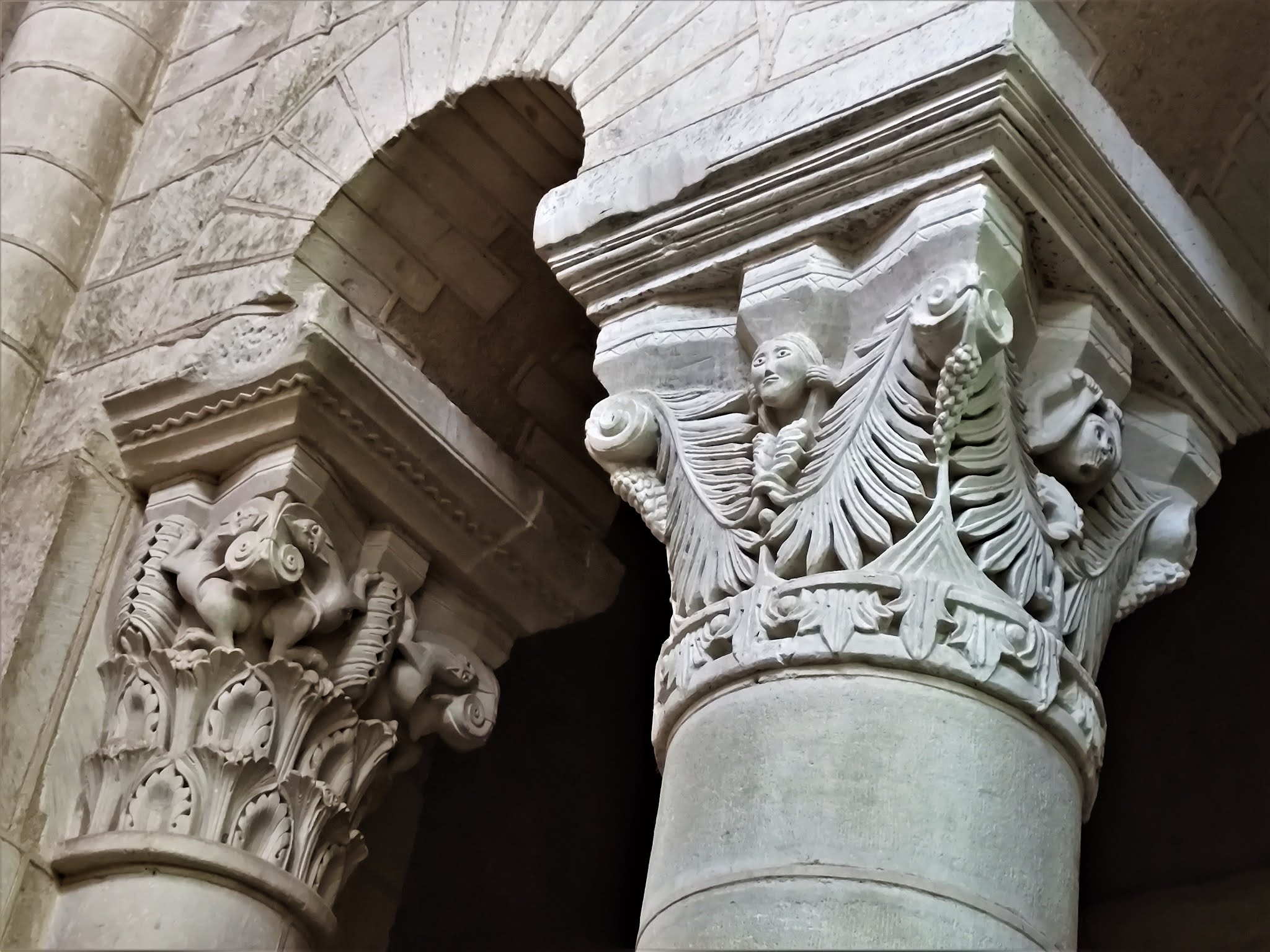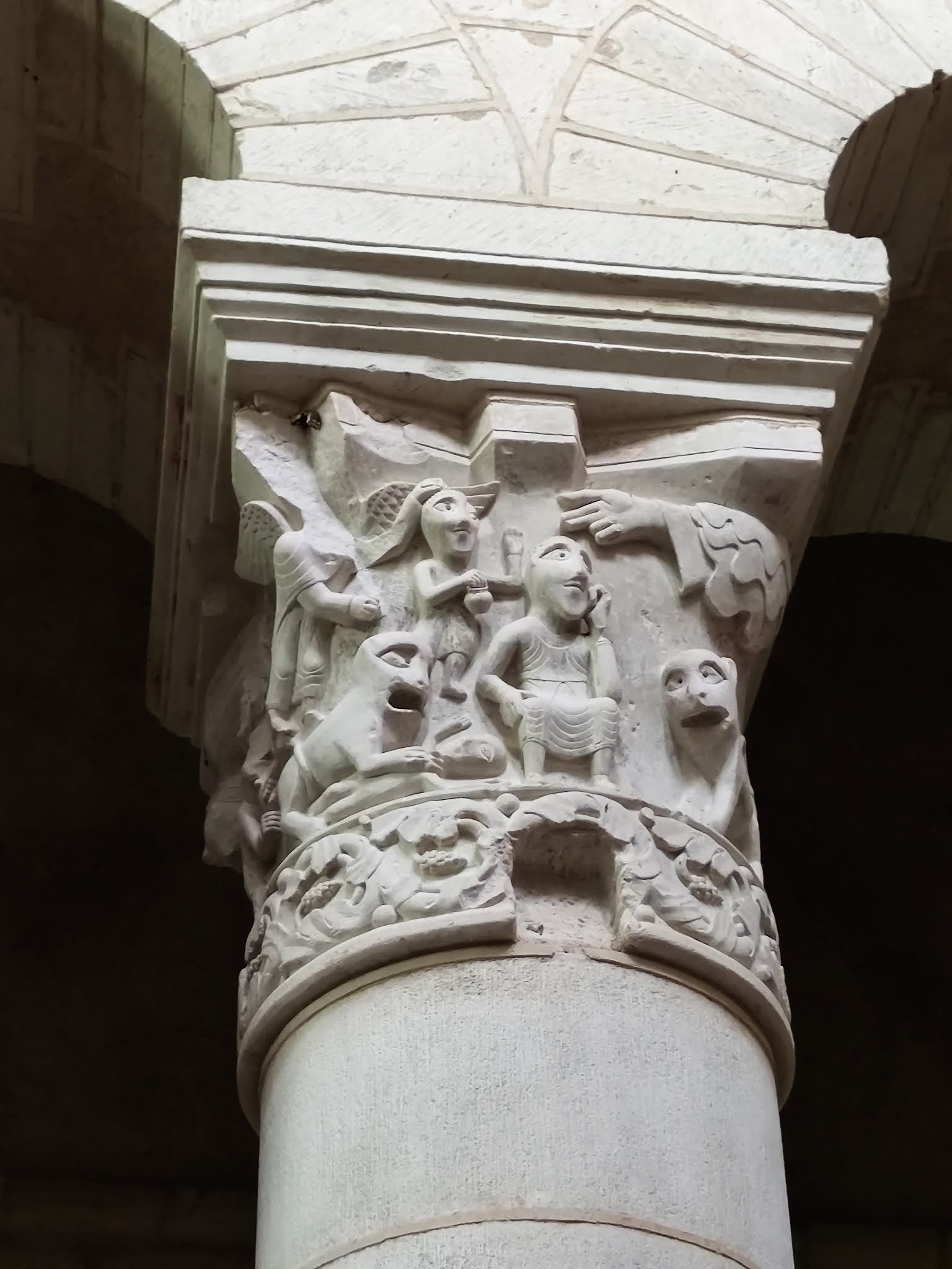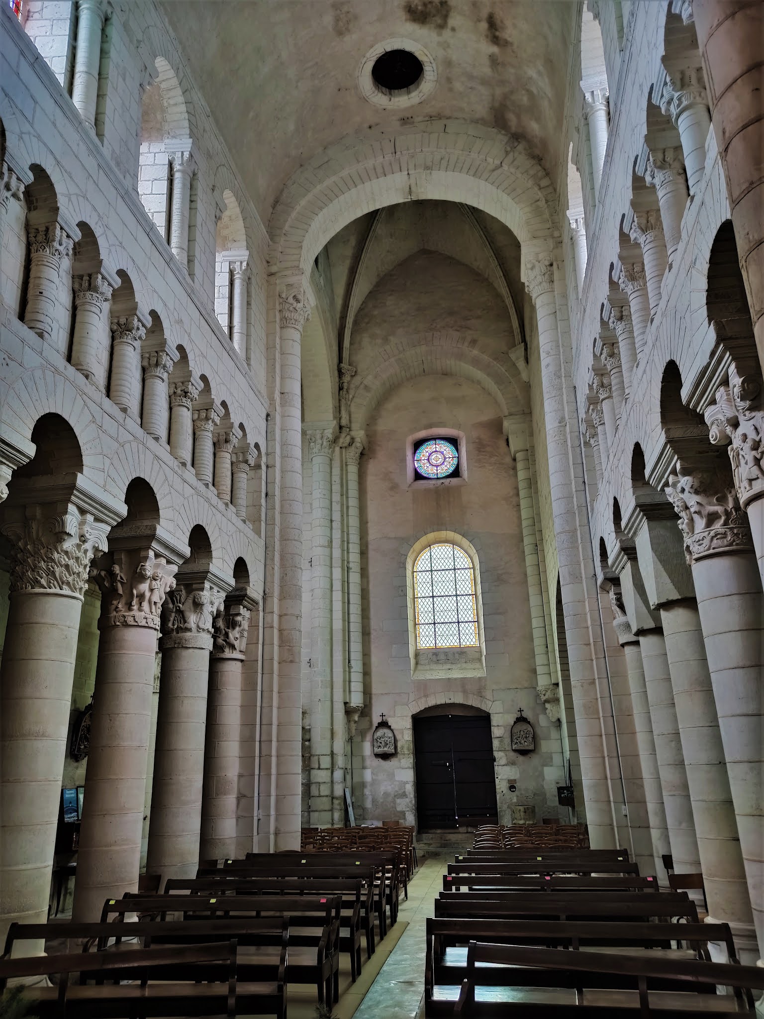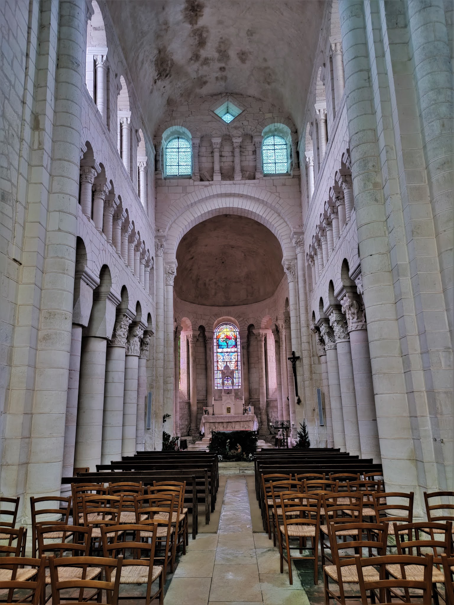 L'abbatiale Saint-Genou a été amputée de sa nef au 17ème siècle mais ce qu'il en reste est superbe. Les décors sculptés, à l'extérieur et surtout à l'intérieur sont des modèles de l'art roman. Les chapiteaux des colonnes du chœur sont exceptionnels et méritent à eux seuls un détour. Mais l'ensemble de l'édifice est magnifique, j'ai été enthousiasmé par cette visite. La nef, en piteux état au 17ème siècle, suite à un manque d'entretien, ne fut pas reconstruite. Restent de l'église, l'essentiel du transept, le chœur, ses bas côtés, séparés du vaisseau central par des arcades et colonnes, et le sanctuaire, abrité dans une abside. Cette dernière est encadrée au Sud et au Nord par deux absidioles qui limitent à l'Est les bas-côtés du chœur. L'abbatiale succéda à la création au 9ème siècle d'une communauté Bénédictine détruite par les Normands et autres envahisseurs. Construite, semble-t-il au début du 12ème siècle, son histoire et celle de Saint-Genou comportent quelques incertitudes, mais les légendes sont aussi parties intégrante de l'histoire et en alimentent le charme. Concernant l'histoire de l'église, les repères historiques manquent, les archives ayant été détruites par en 1580 par l'abbé aux commandes de l'abbaye. Ce que l'on sait, c'est que l'abbaye répondait à deux autorités, les archevêques de Tours et de Bourges. Cette double dépendance provoqua un manque complet de rectitude, la règle de Saint-Benoit était abandonnée, seul comptait l'enrichissement personnel de l'abbé. Le Patron de cette église vivait au 3ème siècle et fut désigné par le pape pour une mission d'évangélisation. Saint-Genou partit avec Saint-Genius (son père ou son compagnon selon les sources) et devint premier évêque de Cahors (pour certains, cela serait faux, conséquence d'une confusion dans le nom).