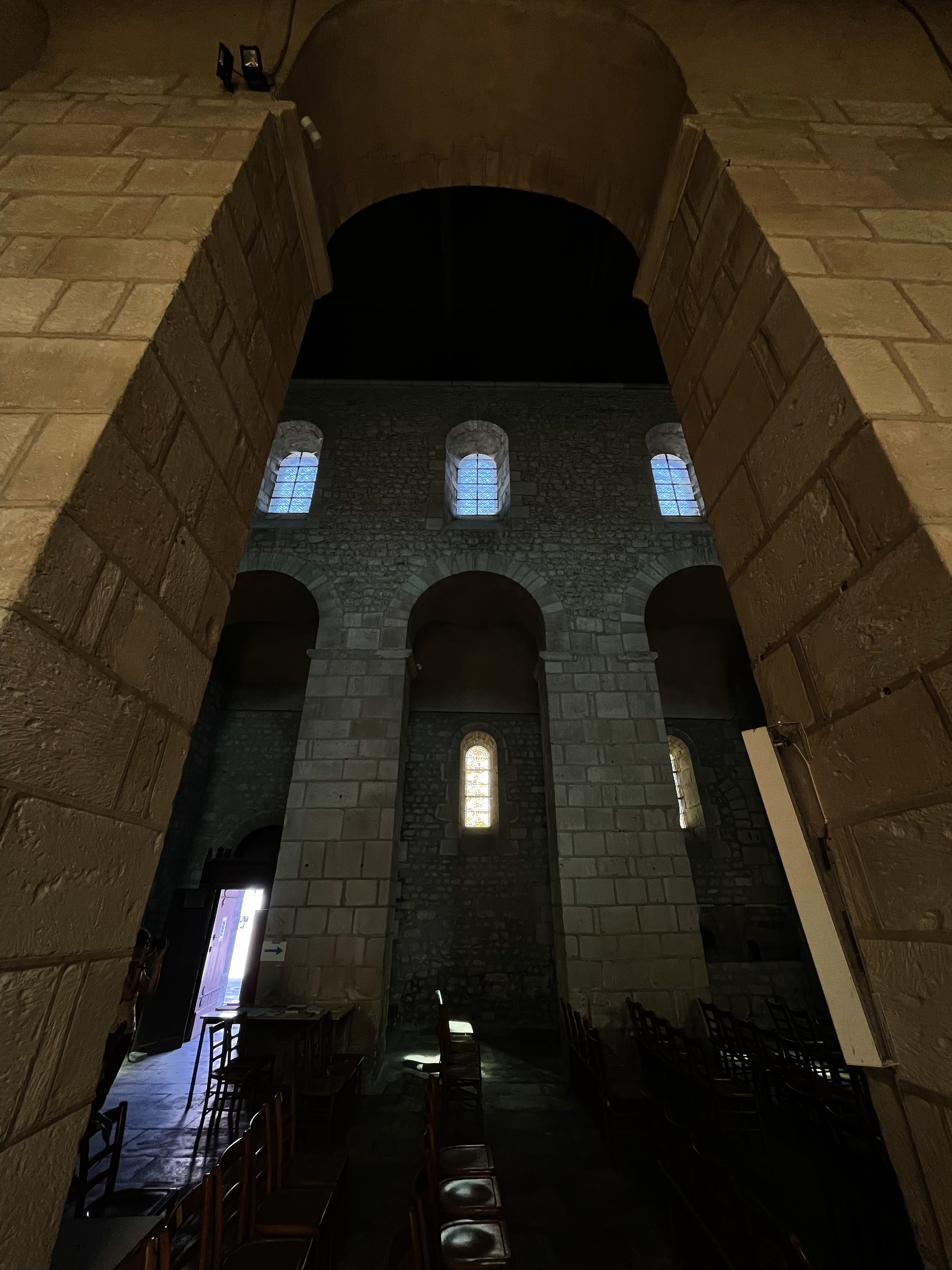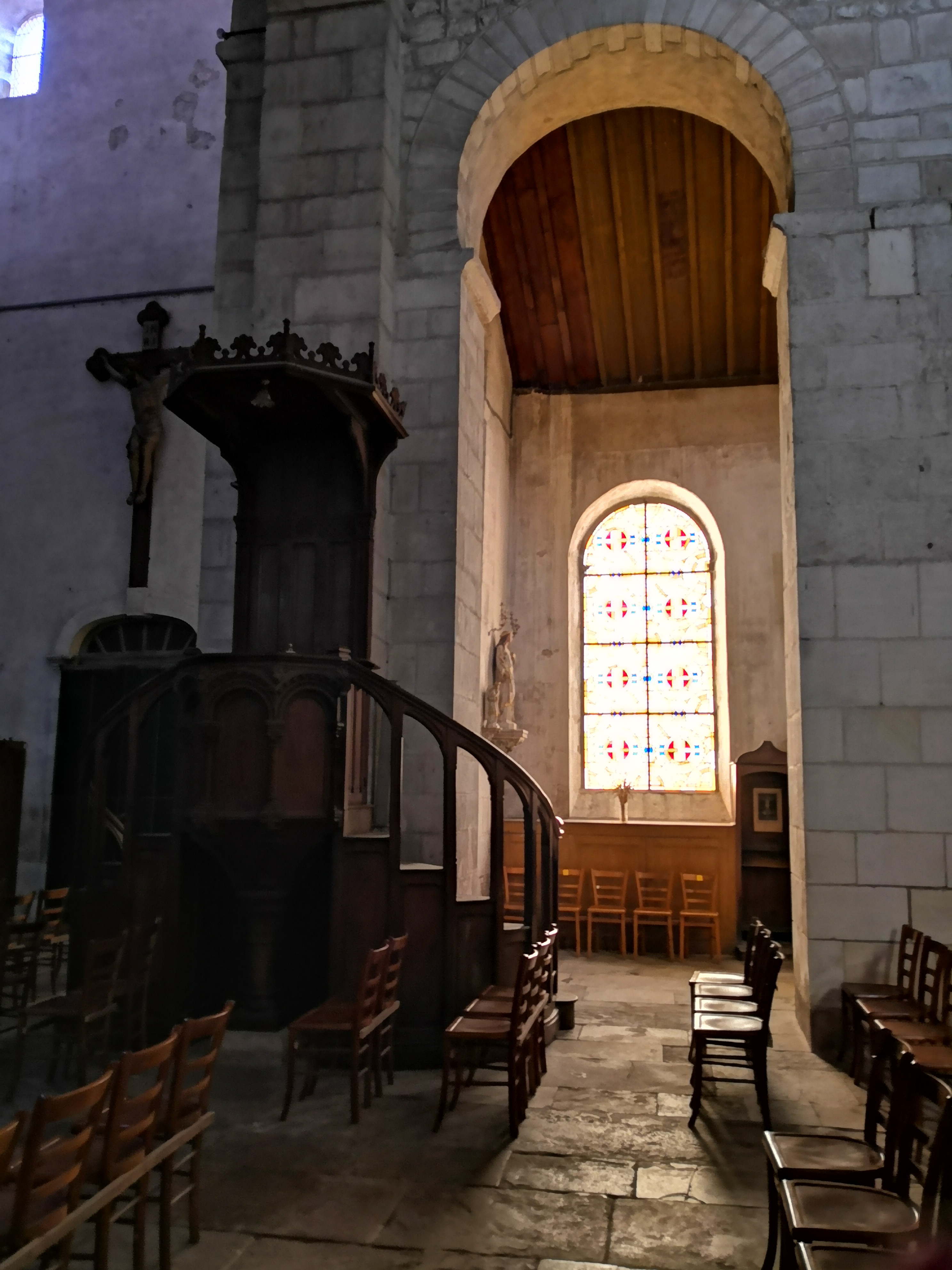 En passant sur le pont de pierre ancien, j'ai entrevue cette 'eglise' et j'ai donc décidé de faire le détour. Quel bon choix j'ai fait ce jour là ! Très belle église, j'ai adoré sa rénovation, elle est dans ses tons pierres blanches éclatantes, son allure sobre mais immense et ses vitraux qui laissaient filtrer de superbes rayons à l'intérieur. Il y a aussi de belles peintures murales à hauteur des yeux. La surprise fut complète en entrant dans la cour à côté qui abritait une jolie exposition de peintres locaux. Il y avait aussi des maquettes en allumettes. Ce n'est pas mon truc mais les reproductions étaient très fidèles et impressionnantes. Merci à tous ceux qui entretiennent patiemment ce patrimoine et ces passions.