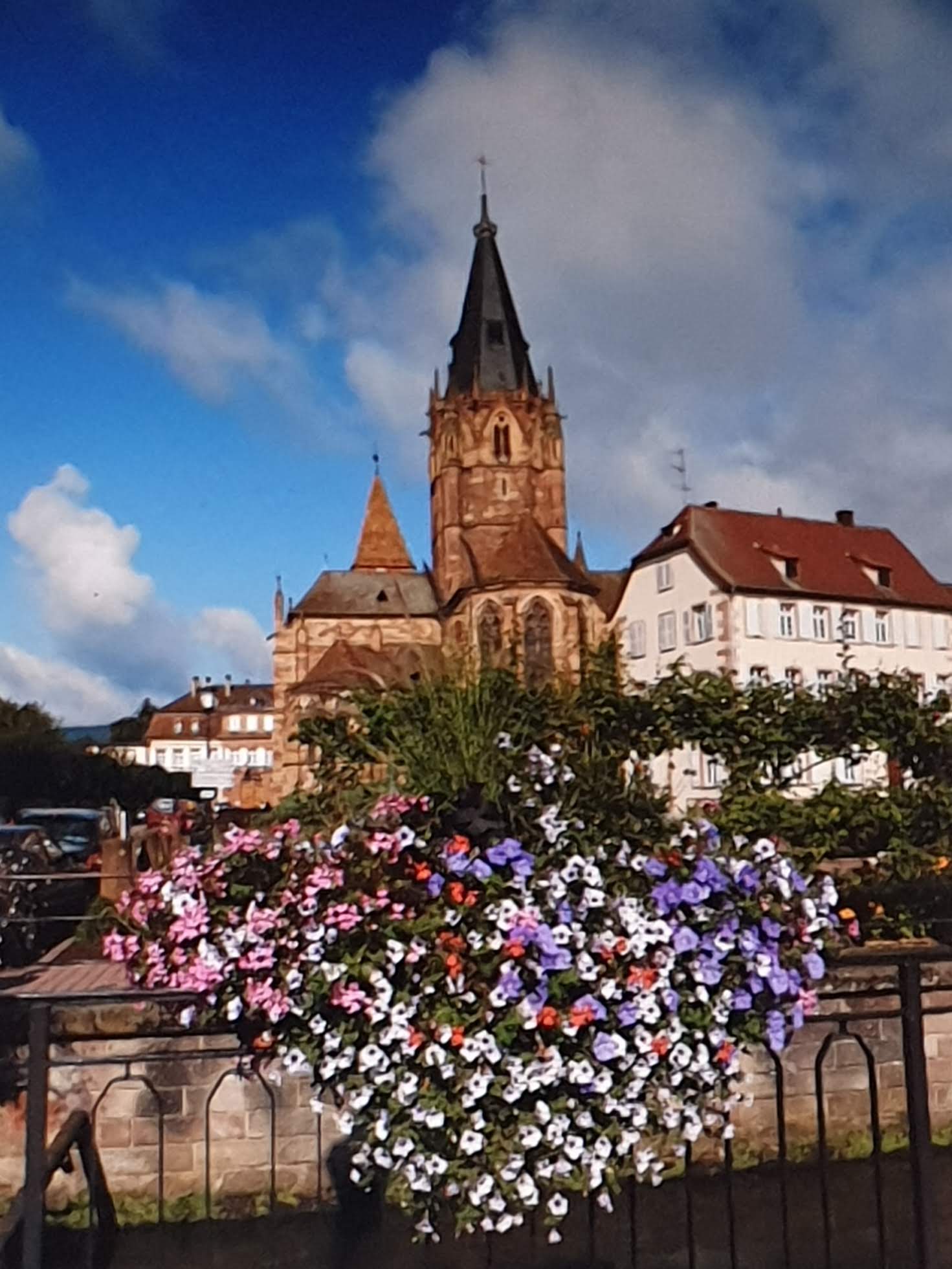 Un arrêt a Wissembourg pour sa basilique. De beaux vitraux. L' été la ville décore ses rues, ses ponts de géraniums.