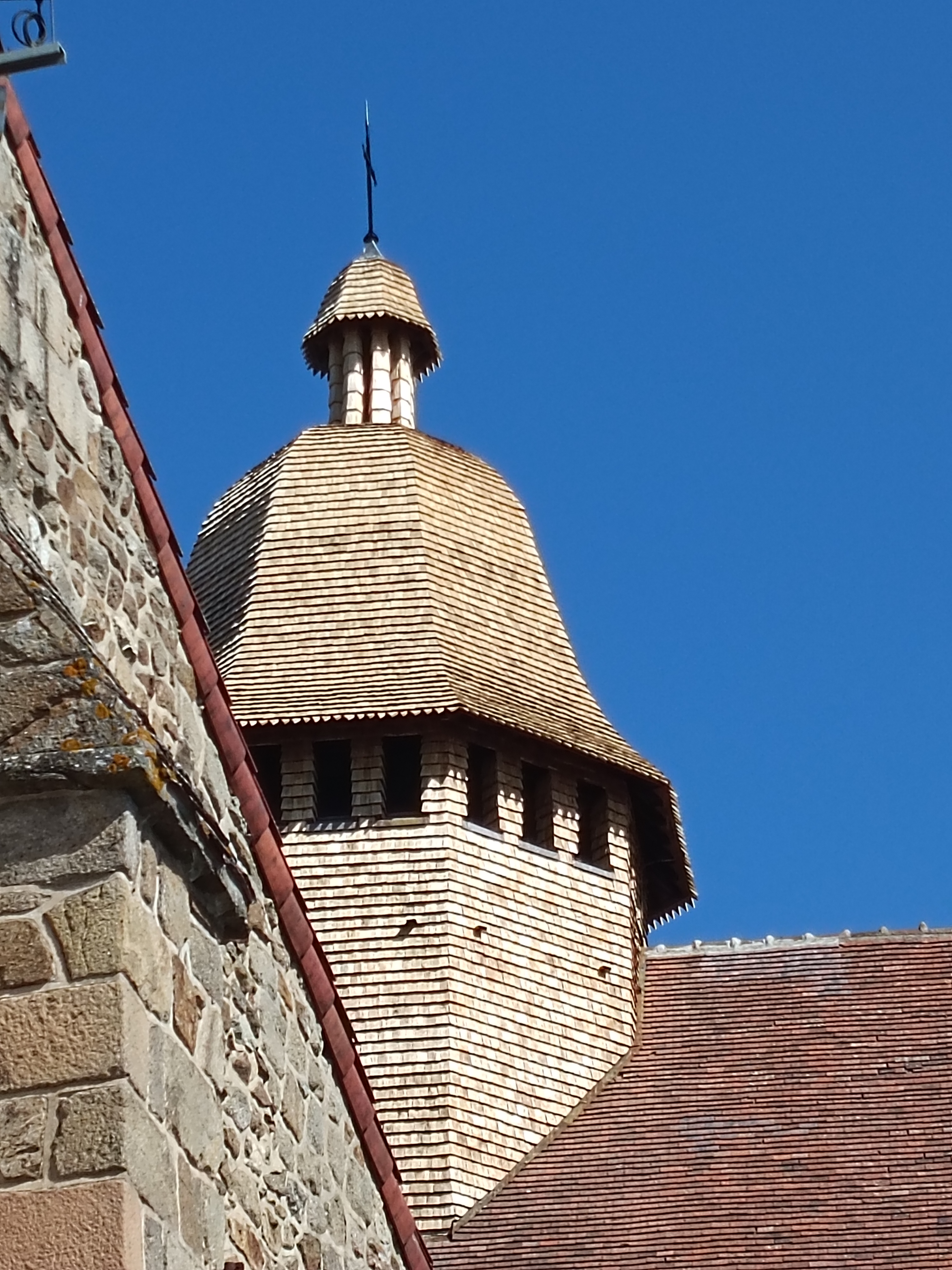 Biscornunique ! A la fois gracieuse et imposante, l'église St Pierre-St Paul, vestige d'un monastère, est dotée d'un clocher-porche de forme irrégulière – donc biscornu – unique en Limousin Poitou-Charentes. Carré à sa base, il devient circulaire puis octogonal au sommet. Autre particularité : Il est composé de deux types de pierres très différentes, le granit et la pierre volcanique, des matériaux issus de cette région à la géologie contrastée qui sont utilisés ici en une alternance décorative. Enfin, sa toiture est faite de bardeaux de châtaignier. L'arbre emblématique du Limousin est également présent à l'intérieur (voûte) où styles gothique et roman se mêlent étonnement. Autre richesse de ce lieu hors du temps: La chasse reliquaire de St Marien, en bois sculpté et doré.