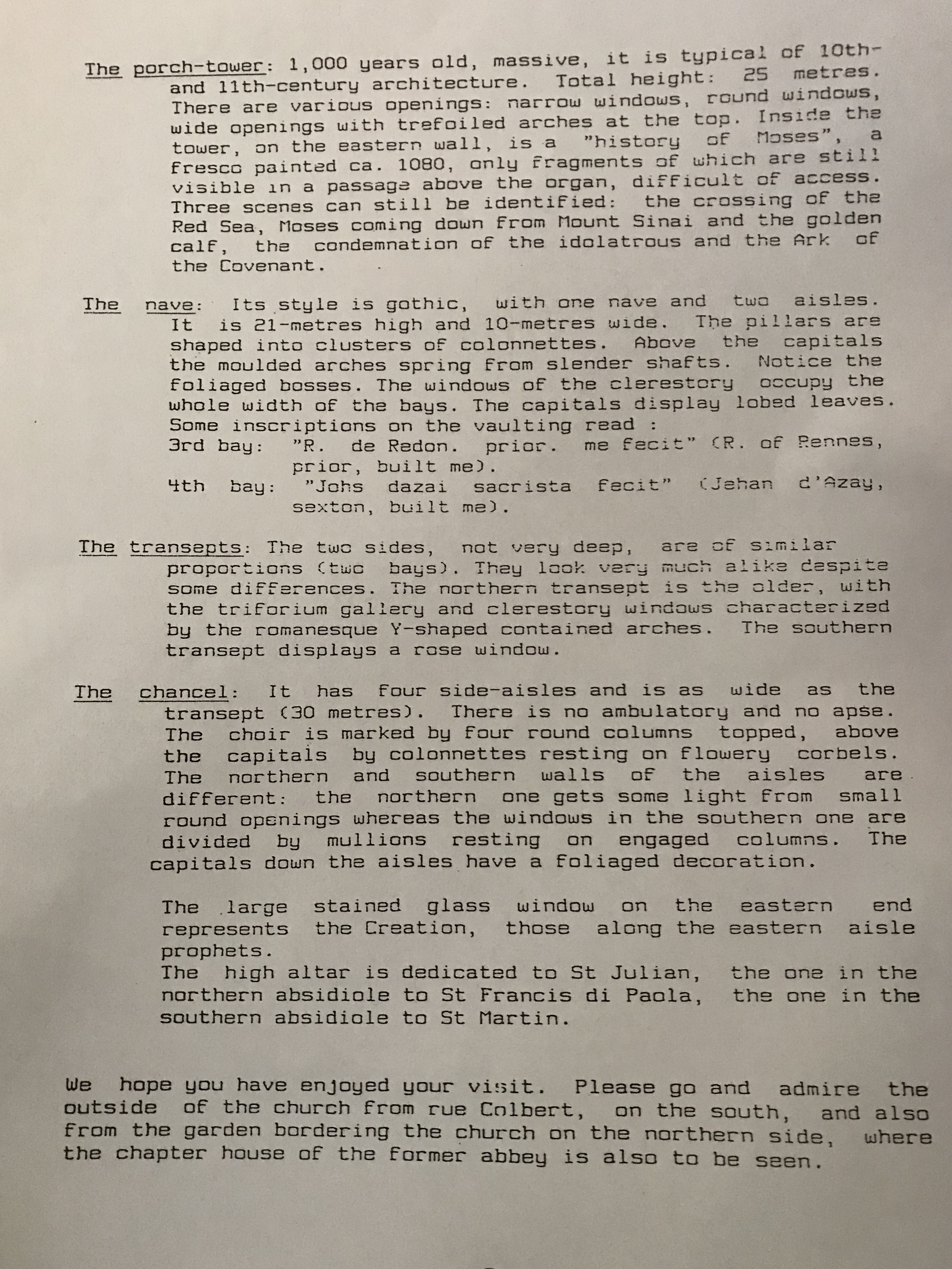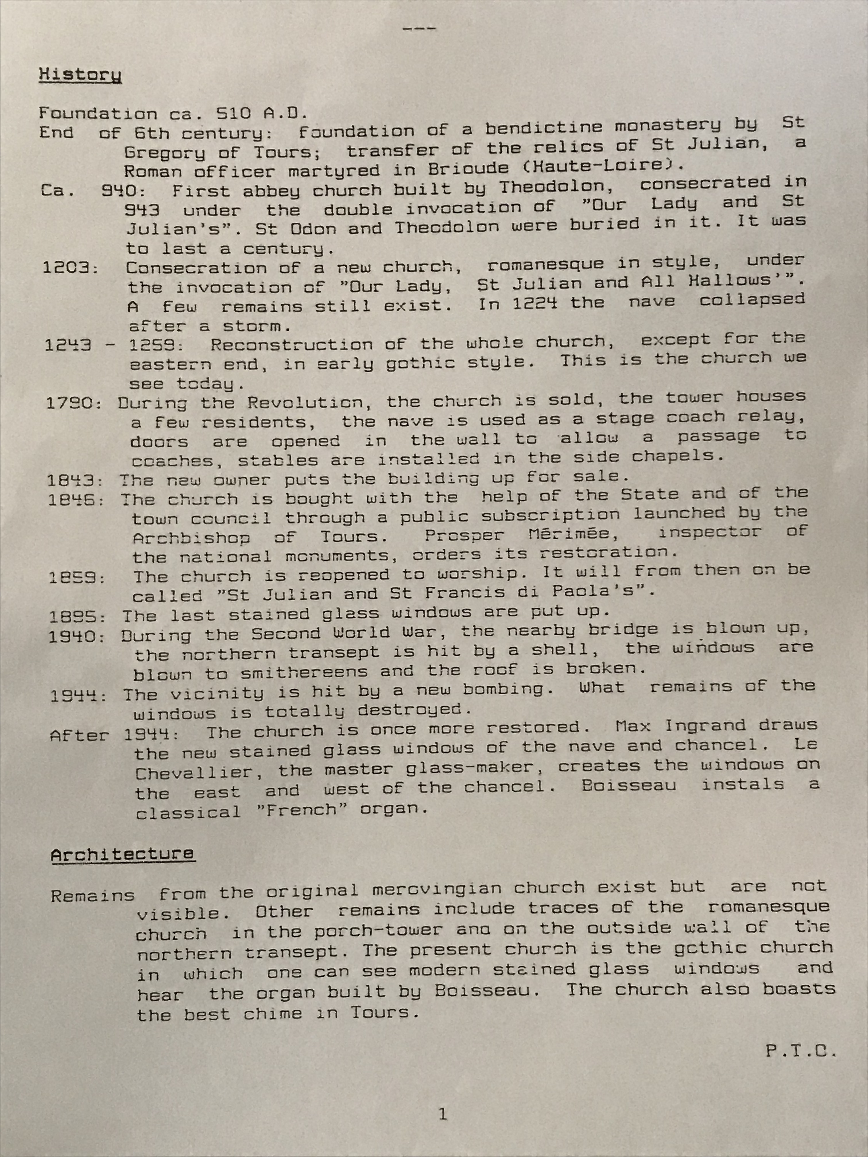 ❝ Édifice survivant de l'abbaye bénédictine de Saint Julien, il fut consacré en 943 après les raids Normands. ❞