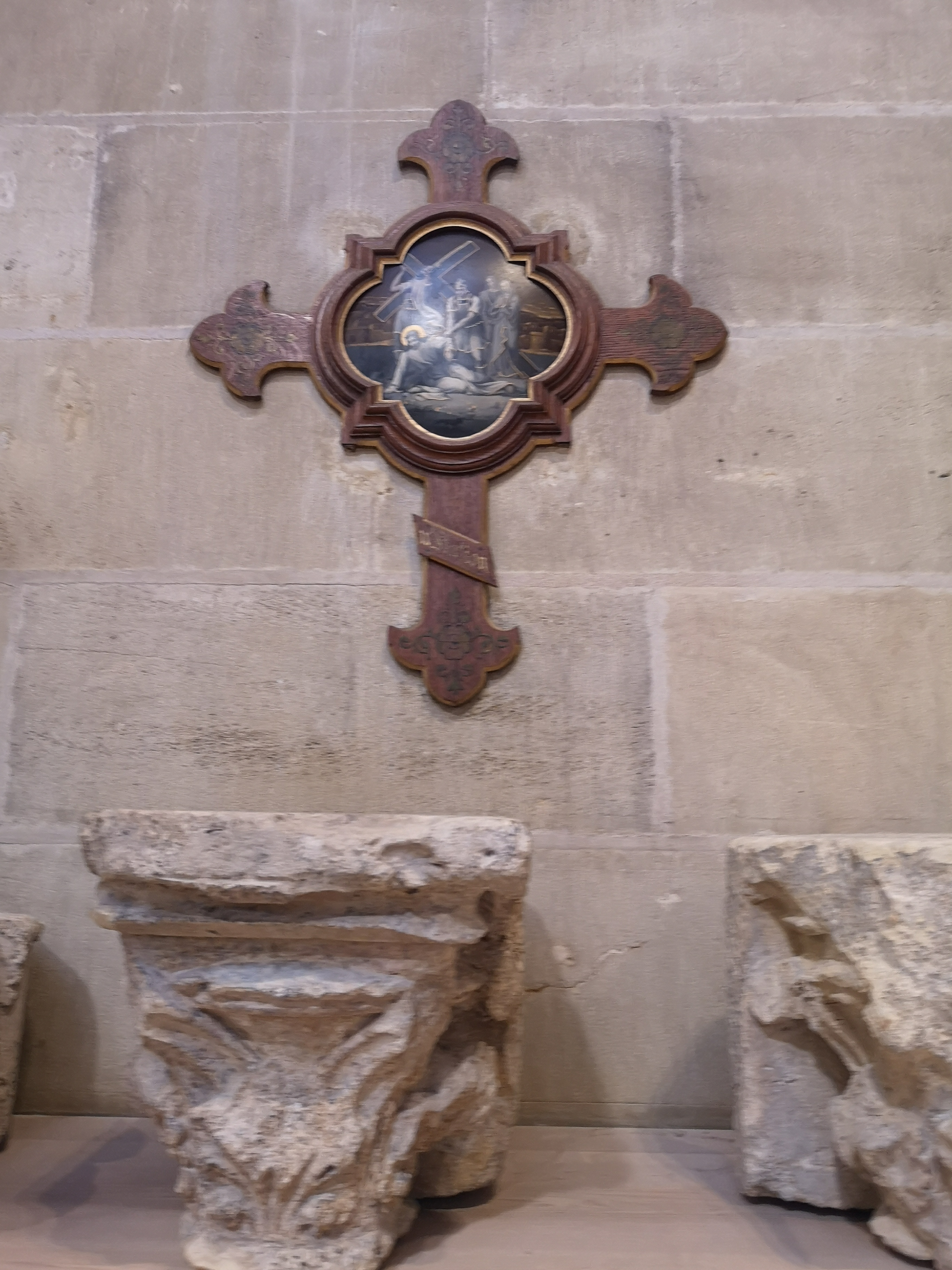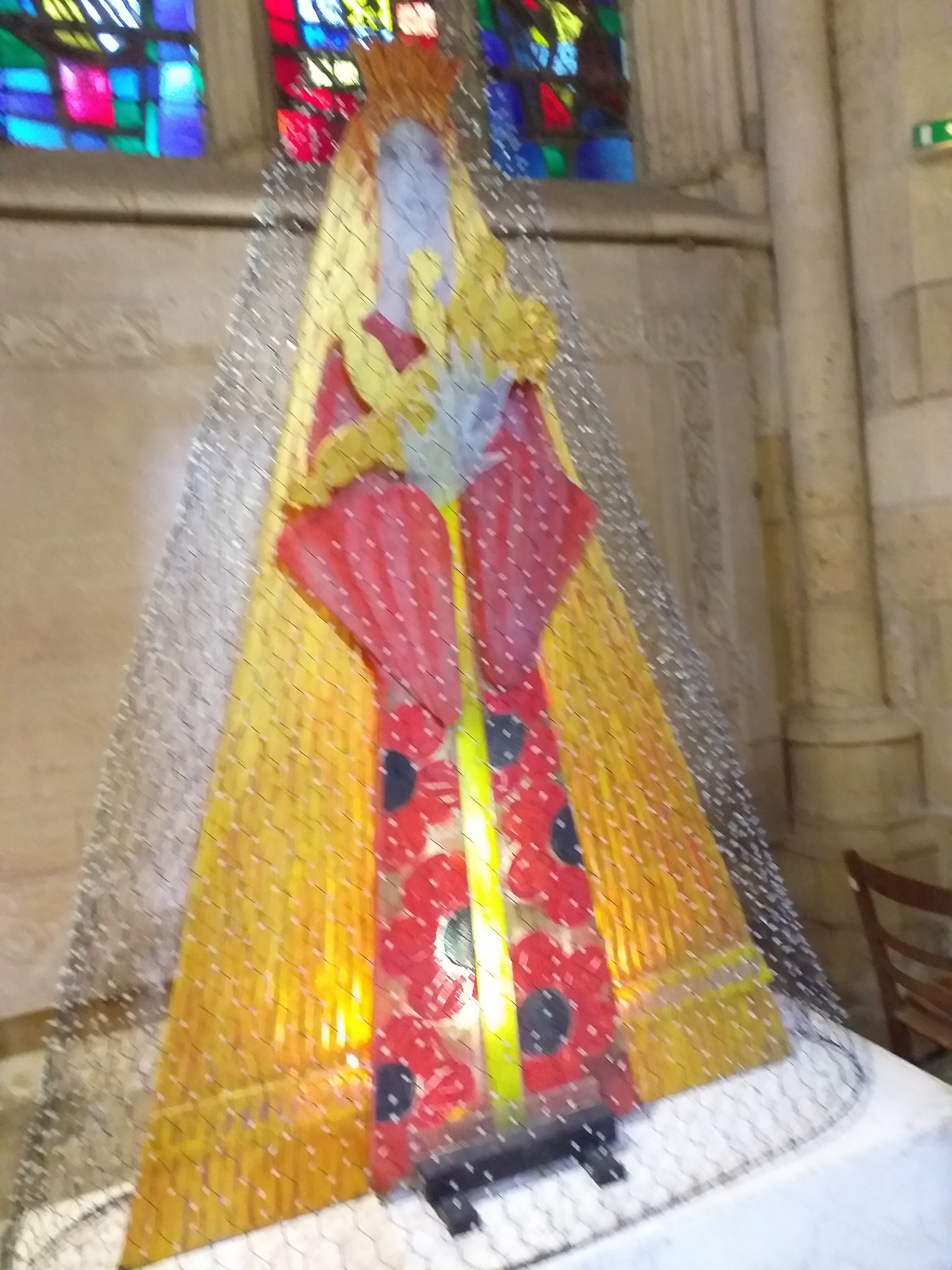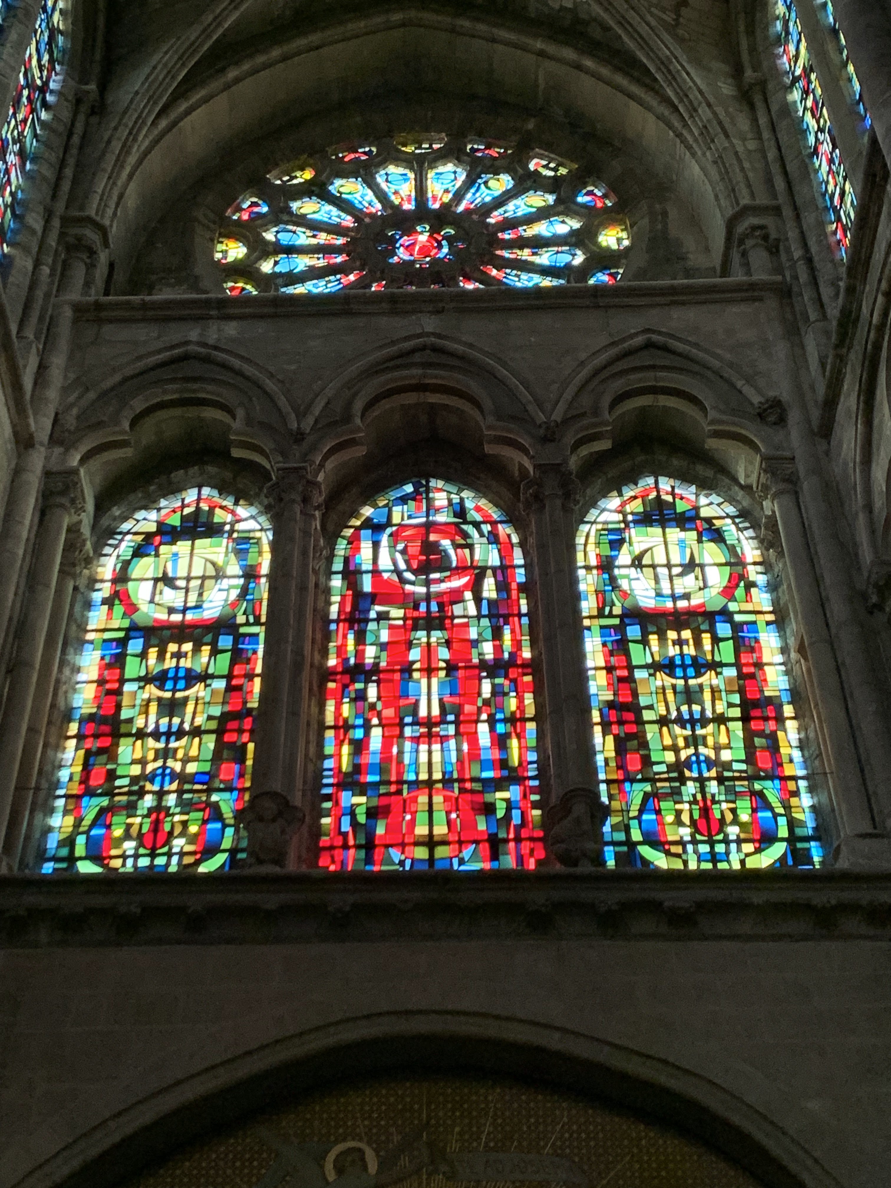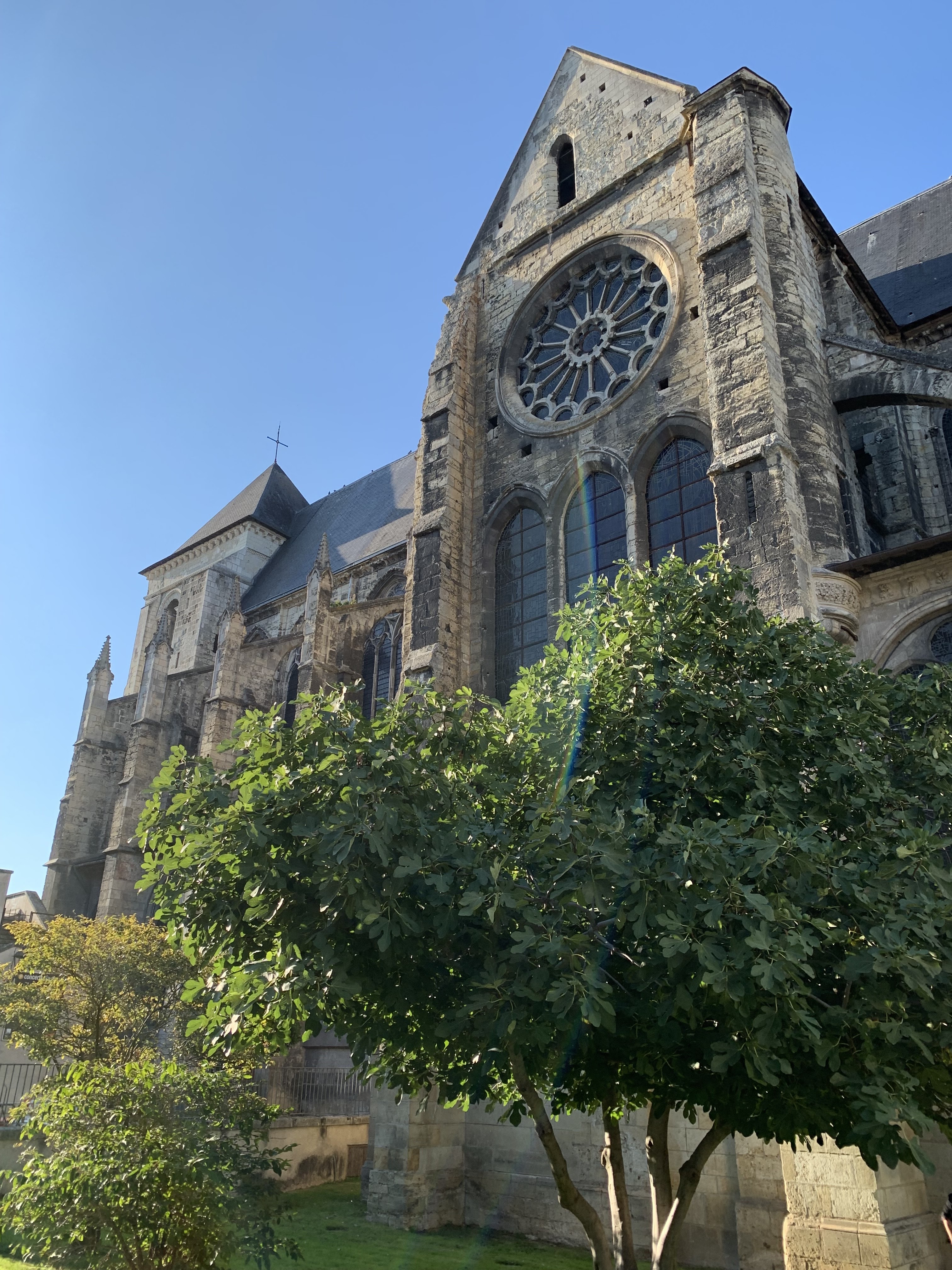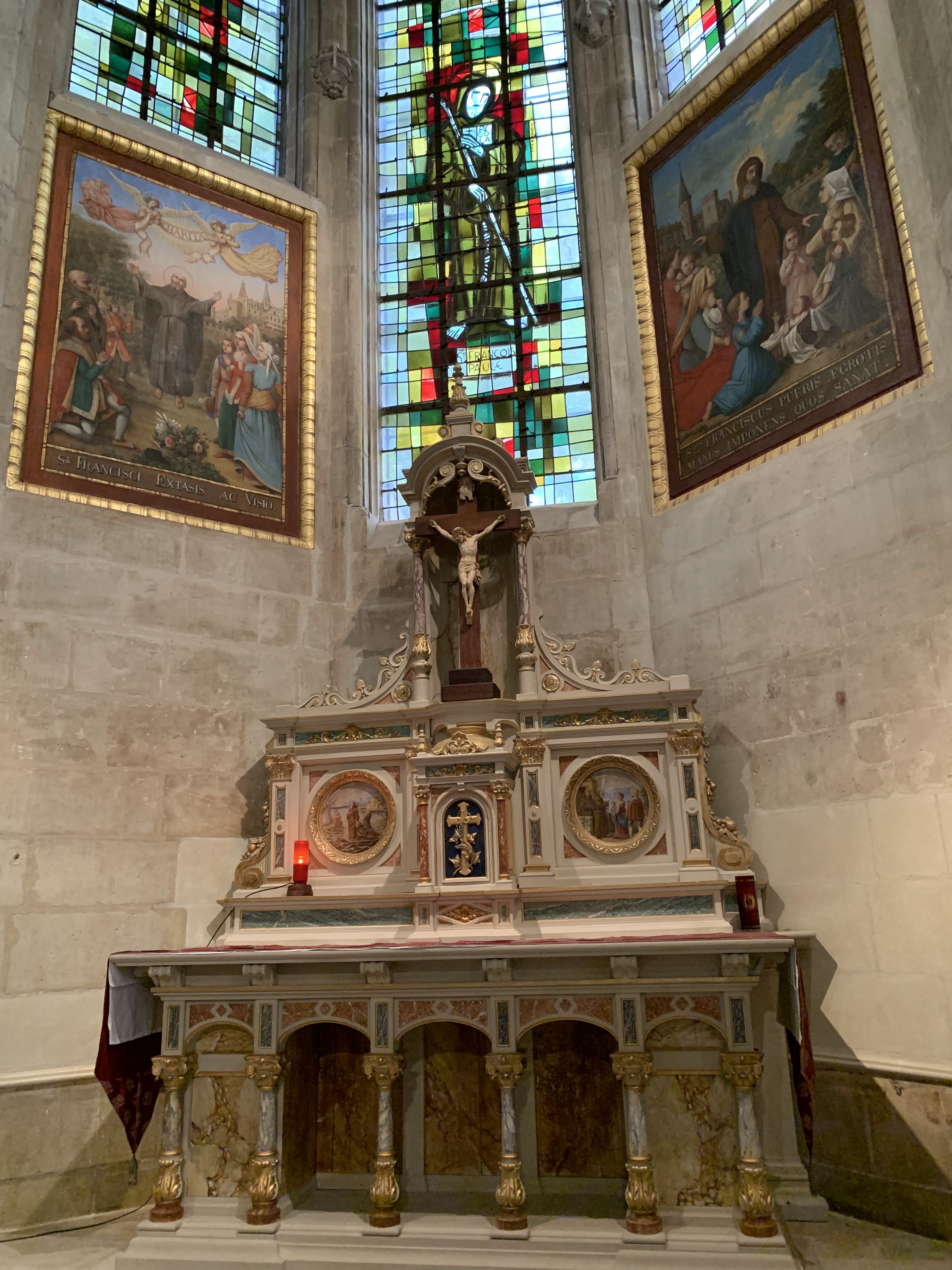 Fondée en 510 après JC et reconstruite à plusieurs reprises, l'église témoigne de la capacité des Français à reconstruire et à survivre. Le vitrail, probablement la 3ème installation au cours des 1500 ans, reste impressionnant.
