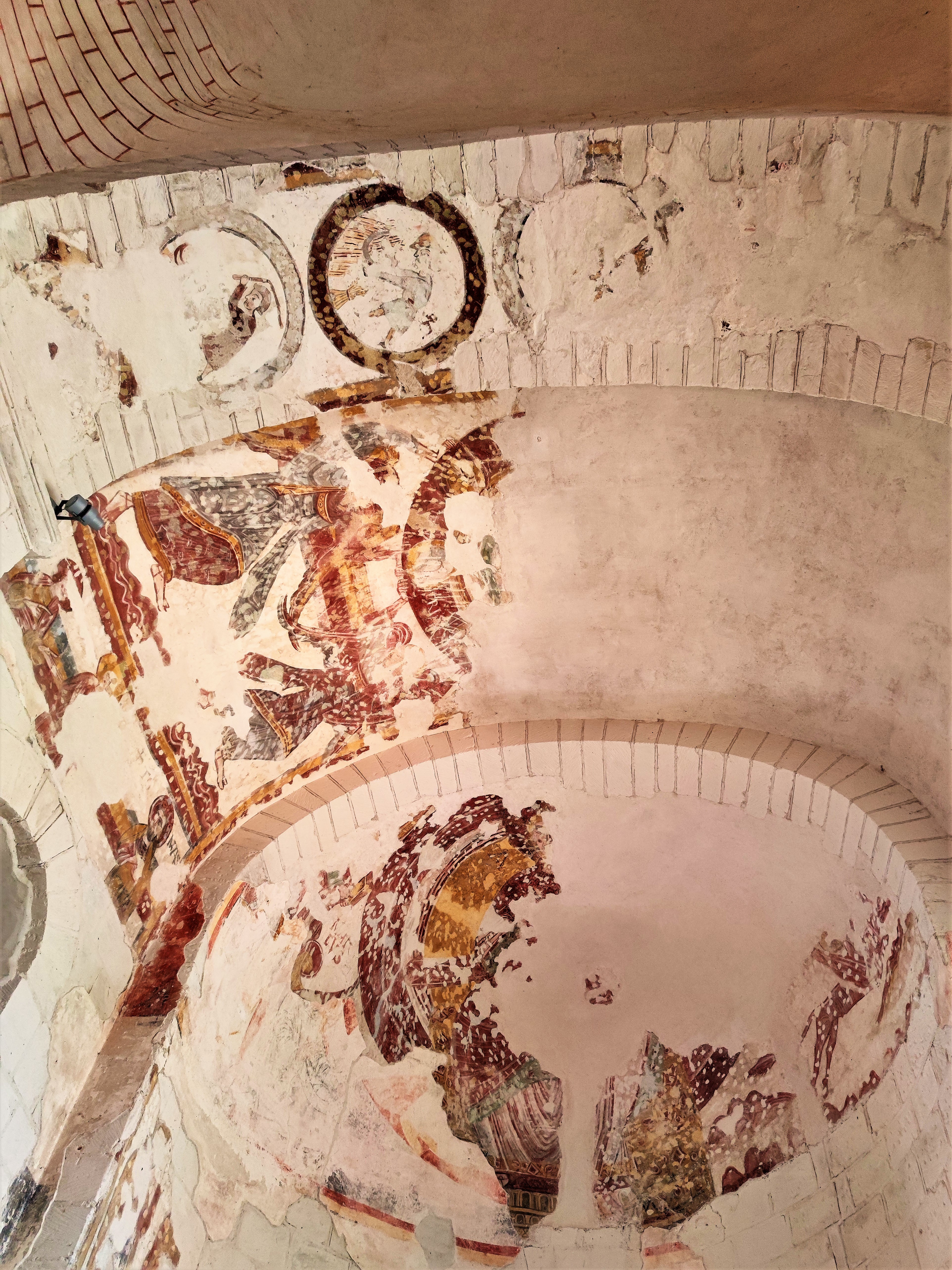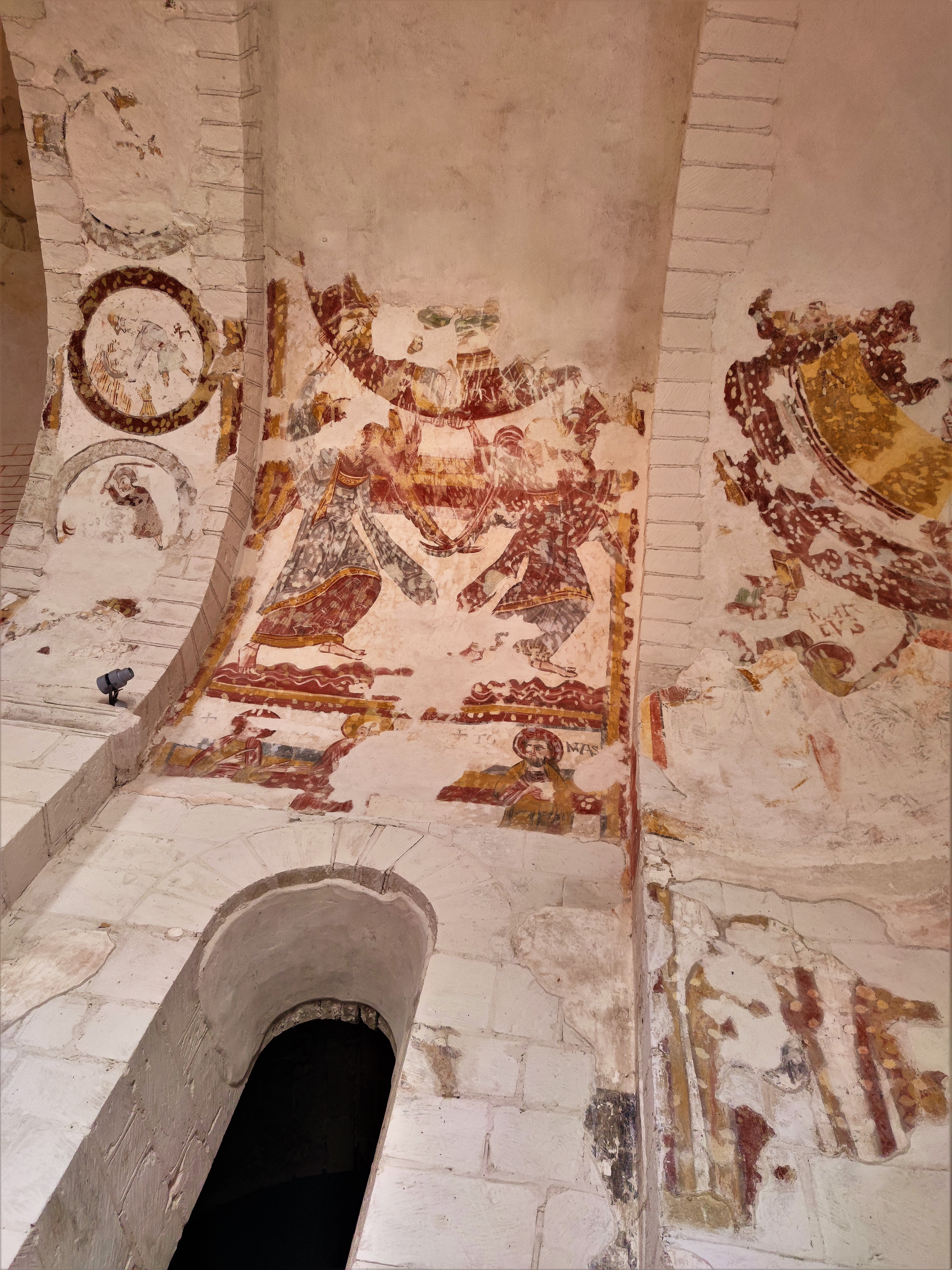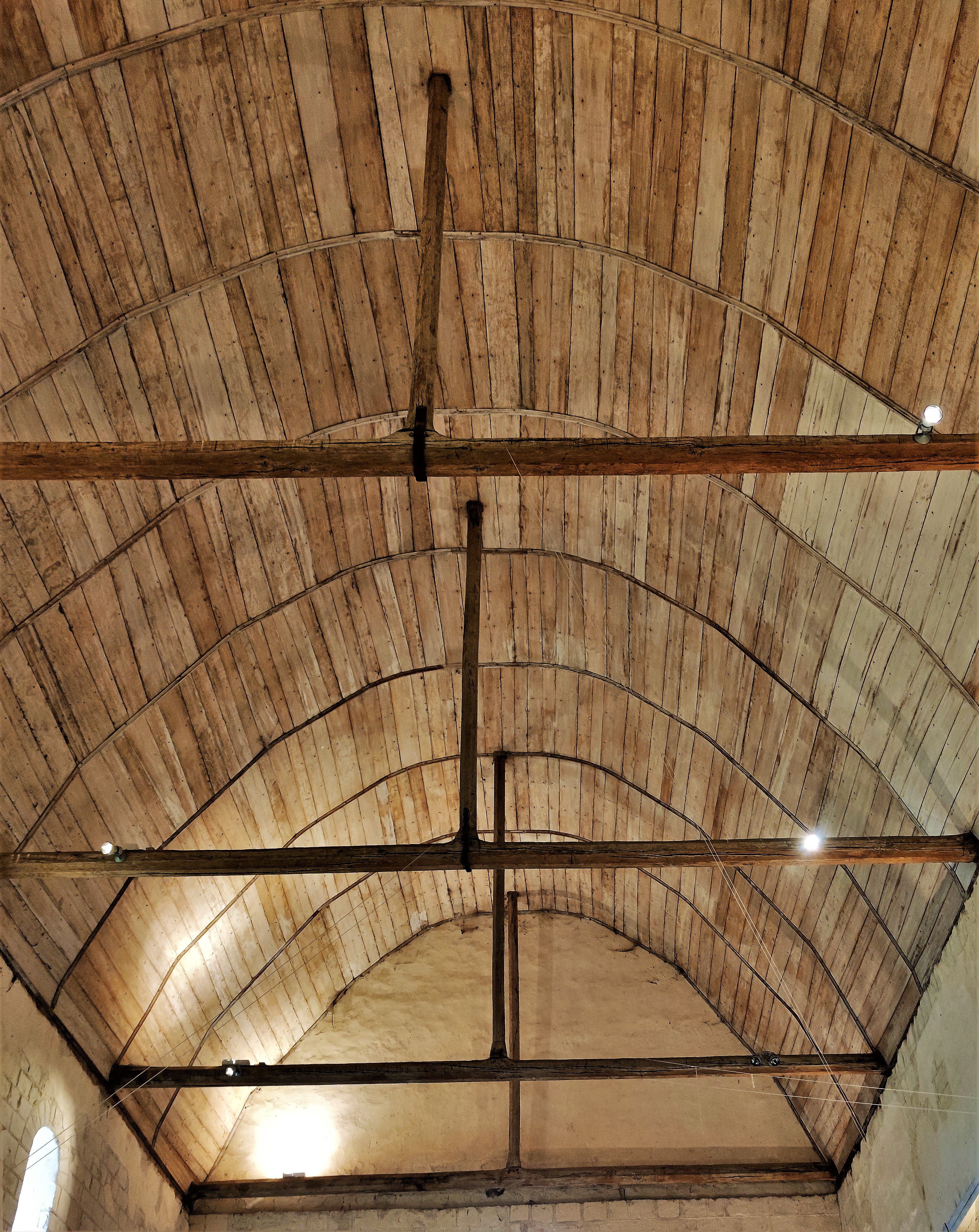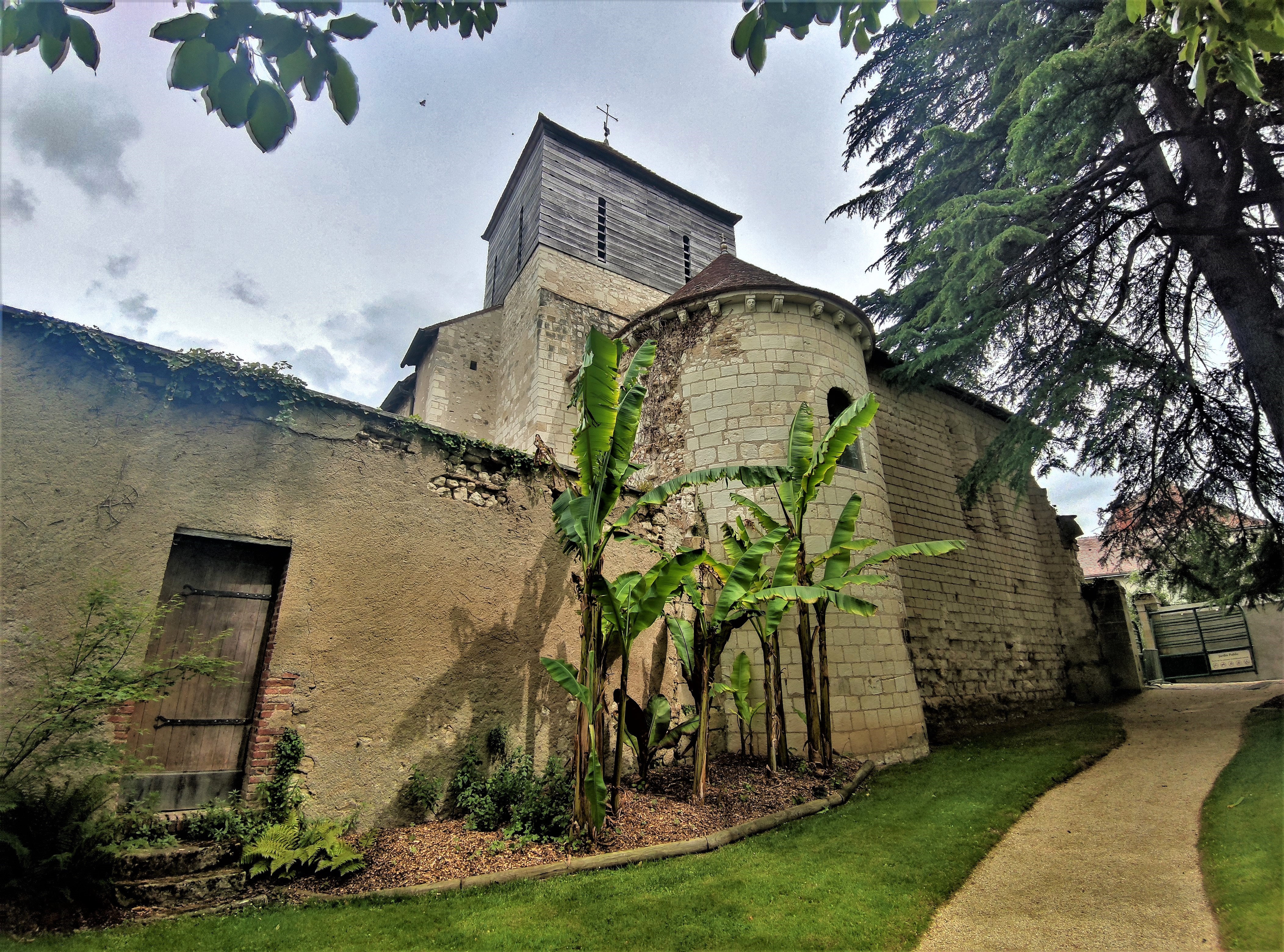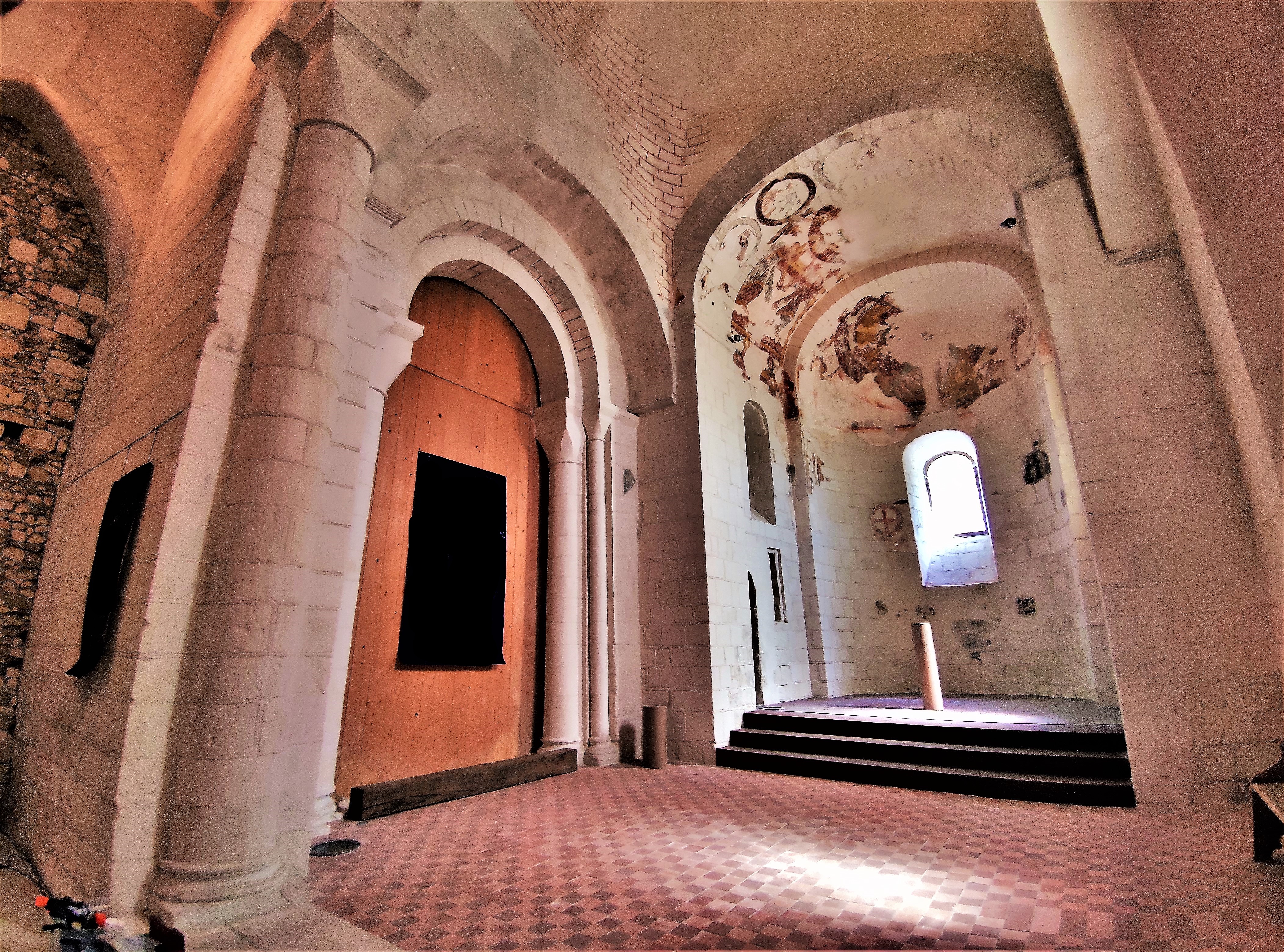 Lorsque l'on en fait le tour, l'envie d'entrer s'impose, il faut pour ça profiter des nombreuses expositions programmées. Chapelle castrale construite au 11ème et 12ème, elle était une partie des fortifications du château de Foulques Nerra. Le château disparut, elle devint église paroissiale catholique puis protestante au 16ème. La révolution connut sa vente comme bien national, elle devint une grange à fourrage et laissée sans entretien. Sa reconnaissance par les M.H. ont permis de la sauver. Orientée du Nord-Ouest au Sud-Est (chœur) la face Est présente l'inquiétante allure d'un bâtiment tombant en ruines. Puis l'impression est meilleure au chevet et sur la face Ouest. L'envie d'entrer s'impose, il faut pour ça profiter des nombreuses expositions programmées. L'intérieur, nef et sanctuaire en bel état sont une agréable surprise. Des traces de peintures murales sont visibles, les élévations qui restent témoignent du glorieux passé de cette église amputée de quelques parties effondrées ou étayées.