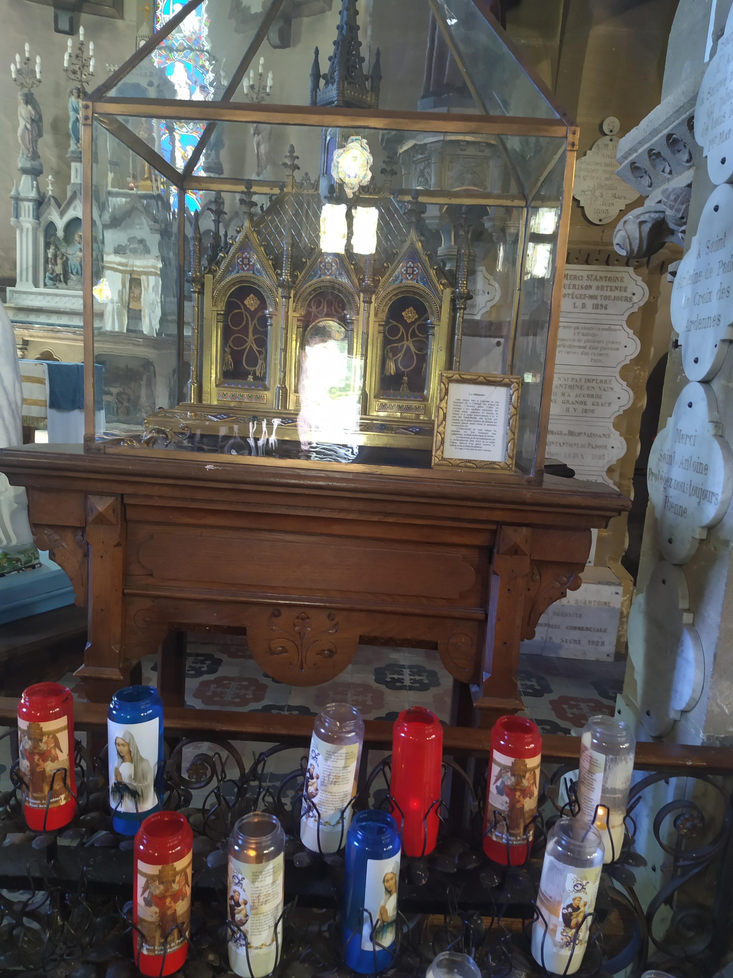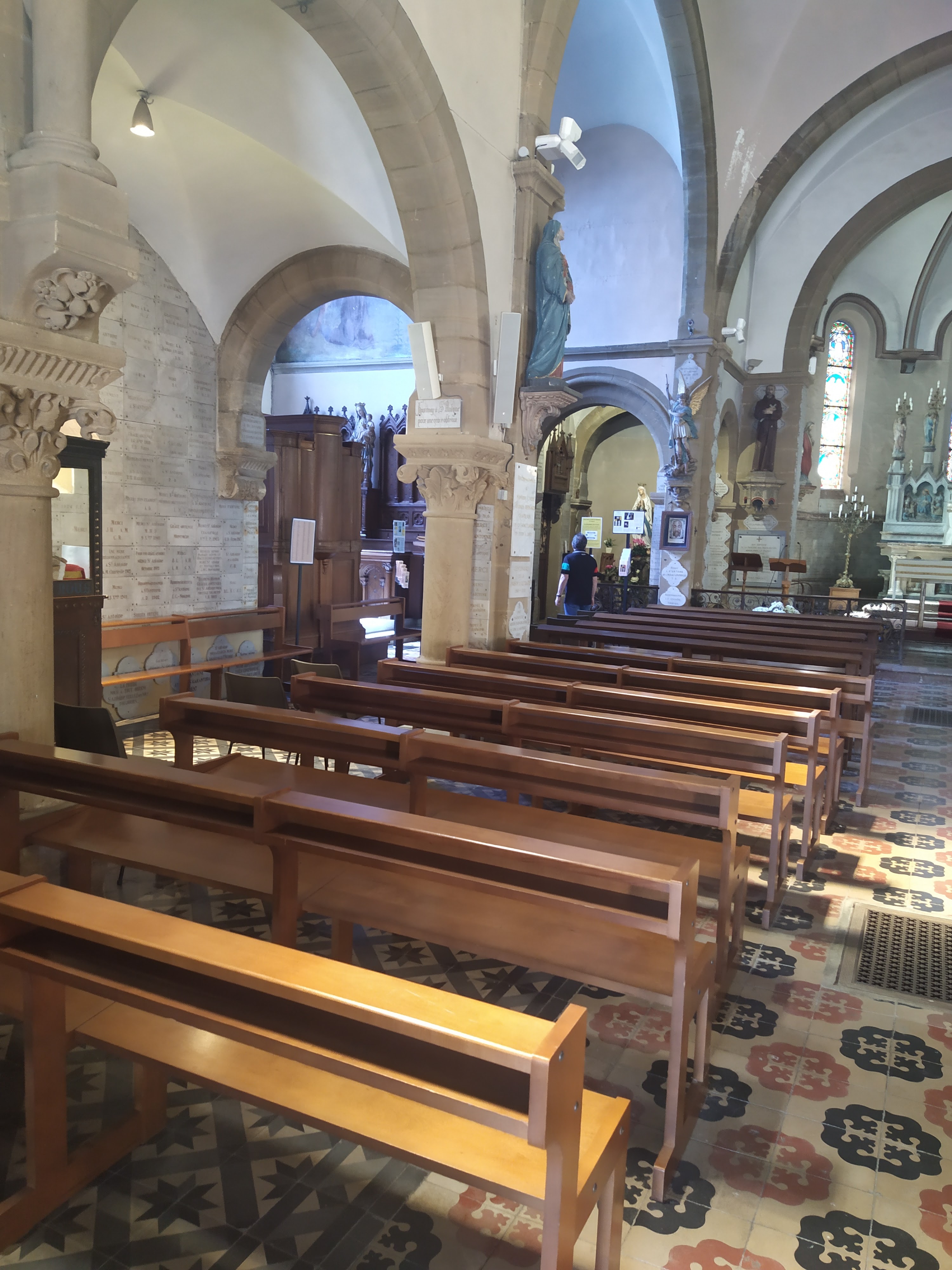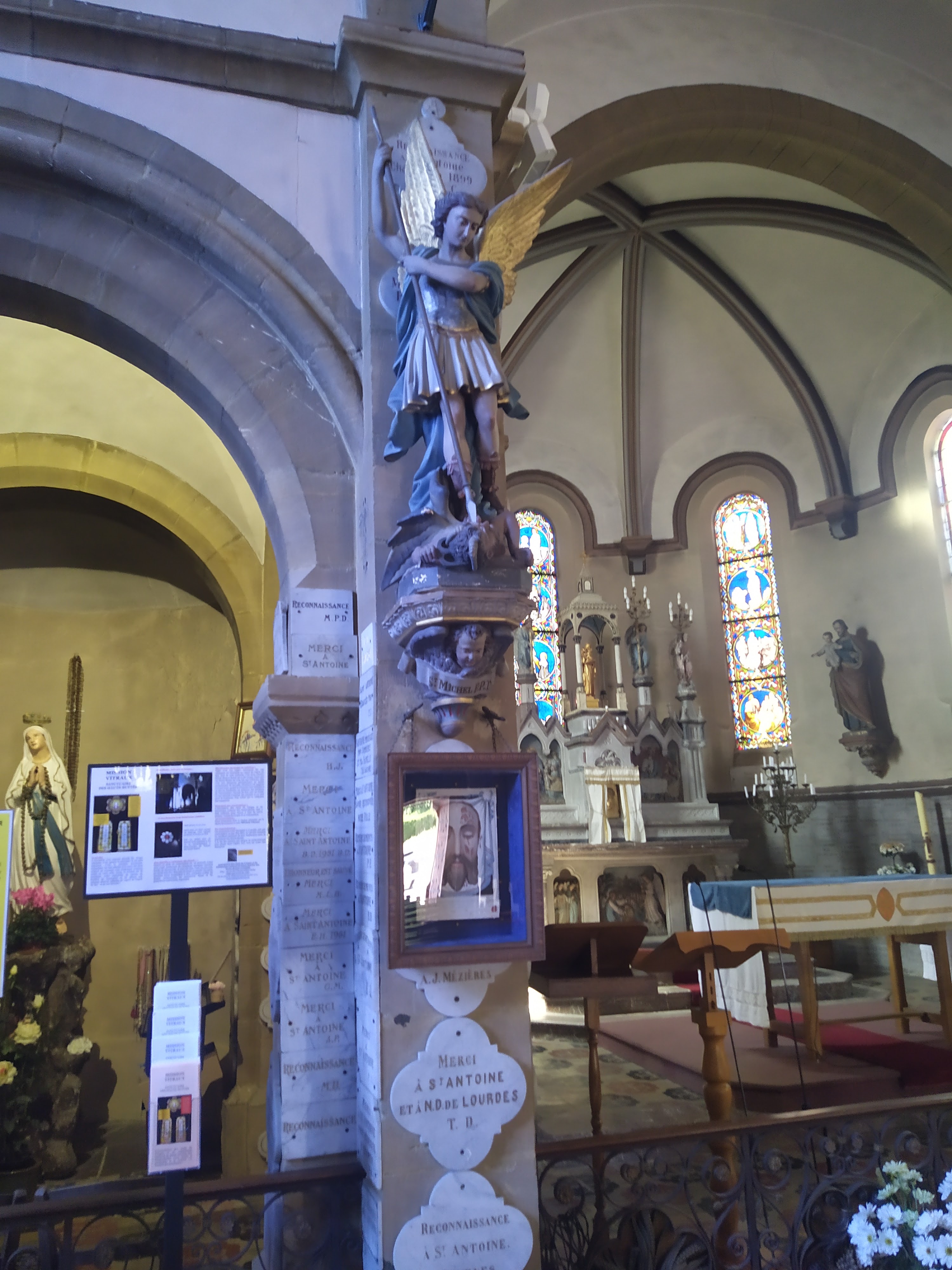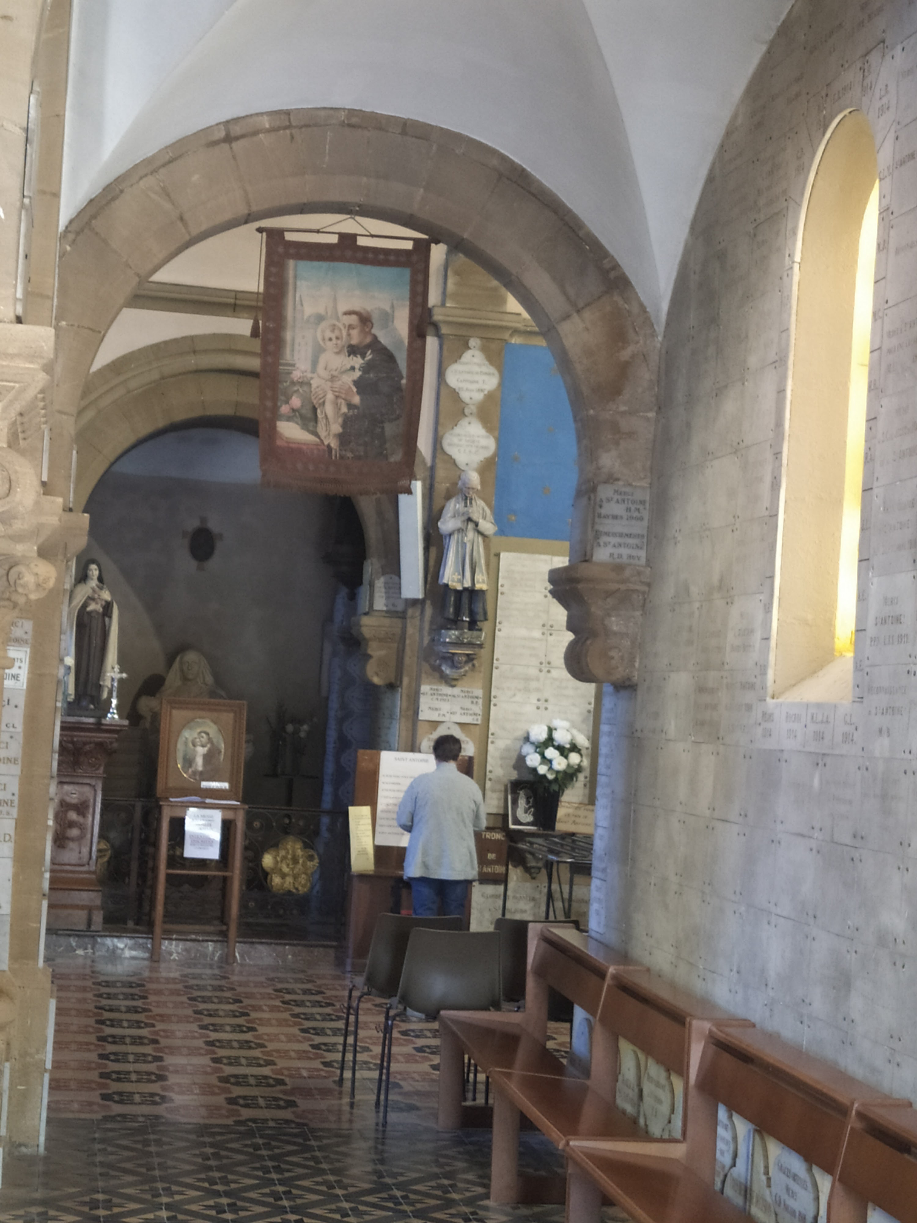 Belle eglise. Impressionnante par le nombre de plaques de remerciement partout sur les murs, piliers...reliques d'une côte de Saint-Antoine de Padoue et du jeune Saint-Florent.