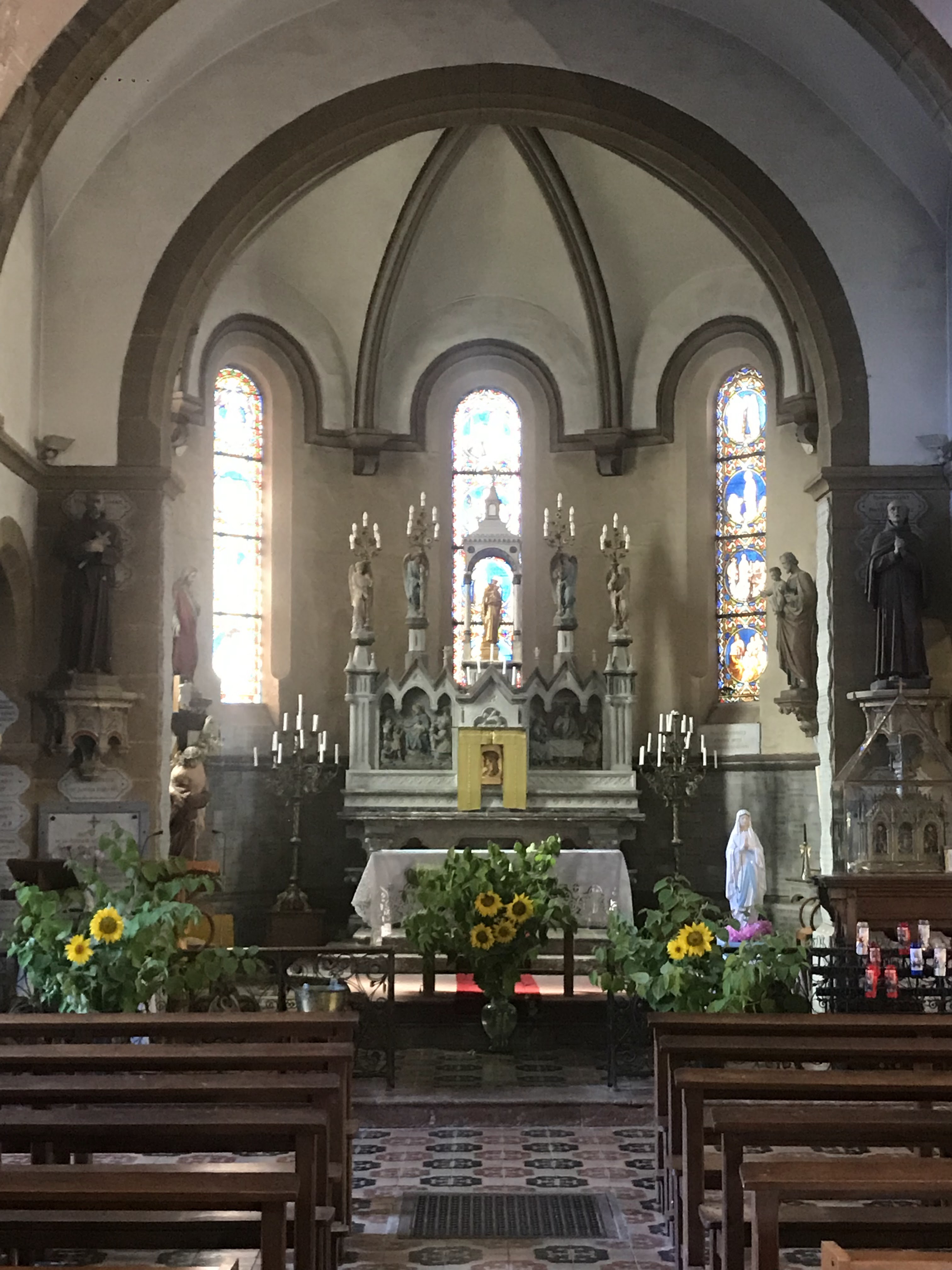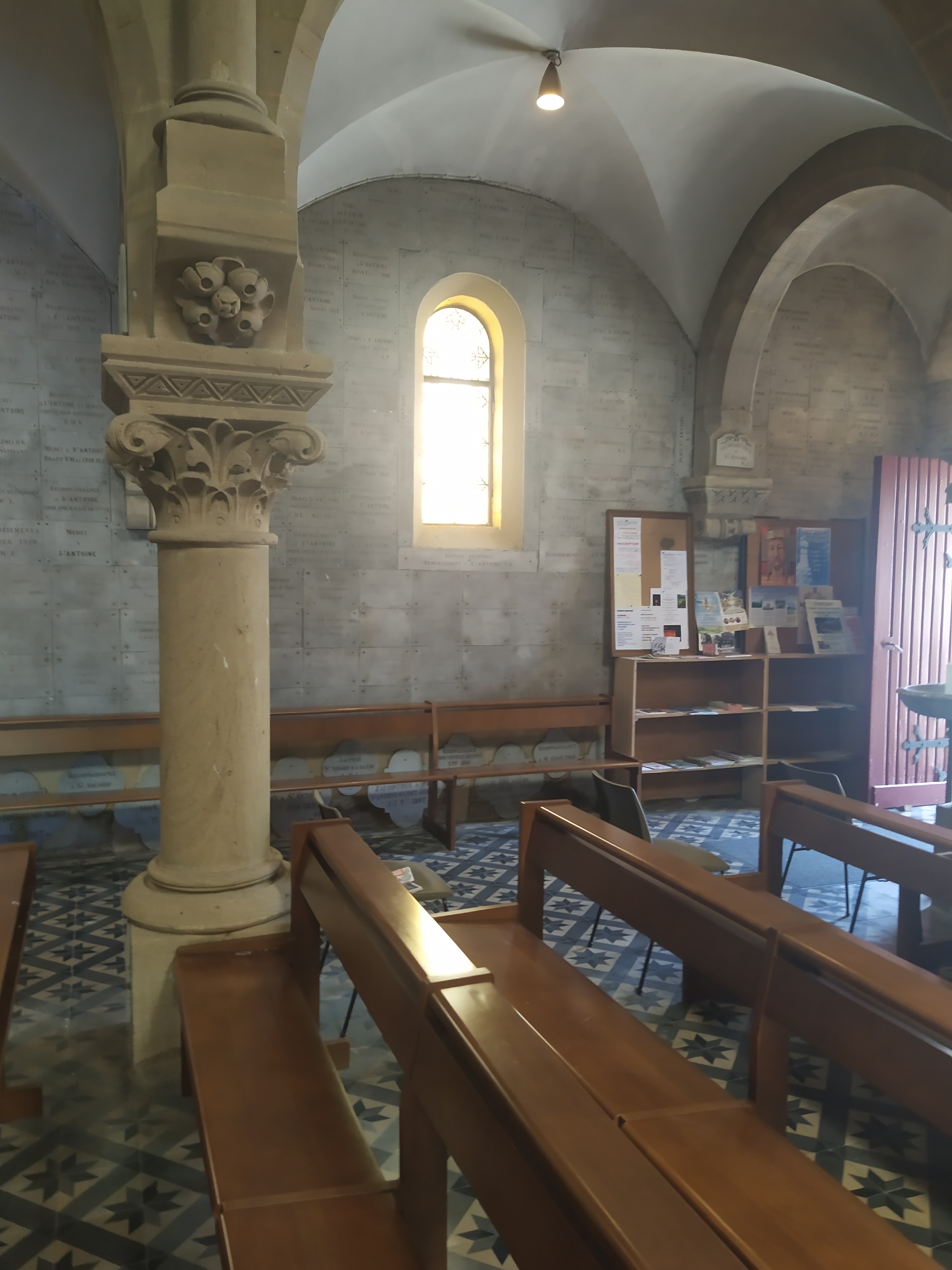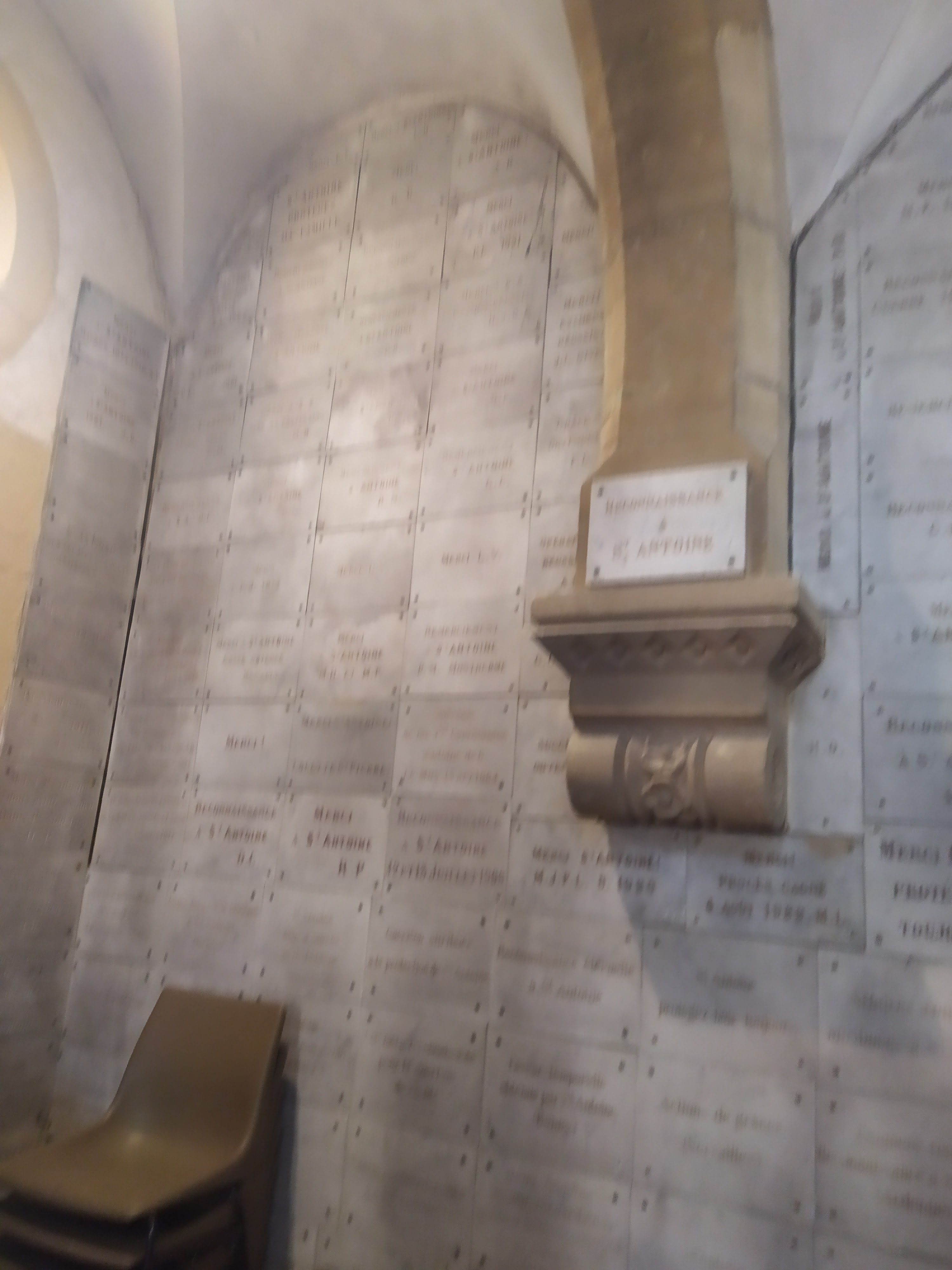 Belle eglise. Impressionnante par le nombre de plaques de remerciement partout sur les murs, piliers...reliques d'une côte de Saint-Antoine de Padoue et du jeune Saint-Florent.