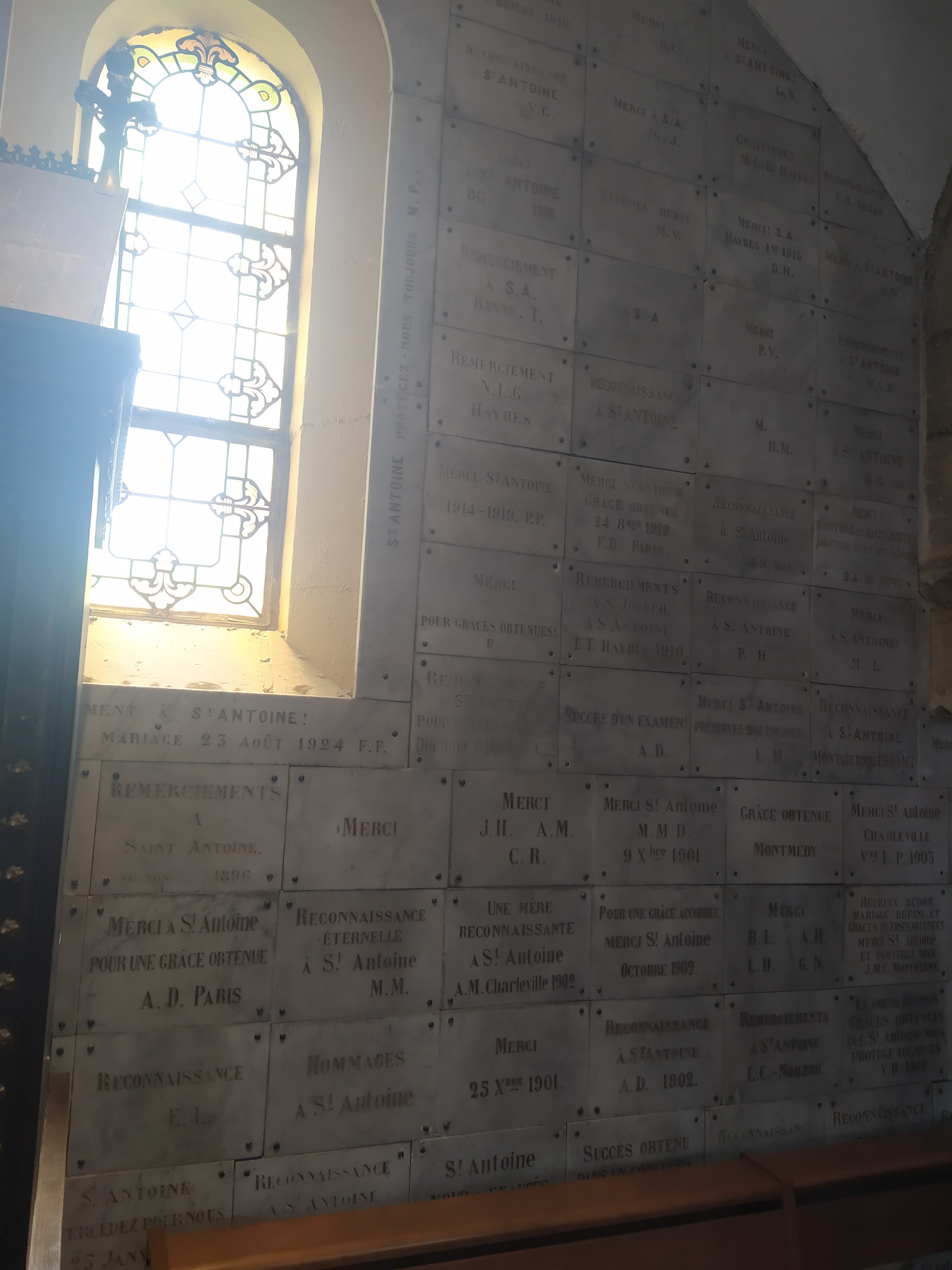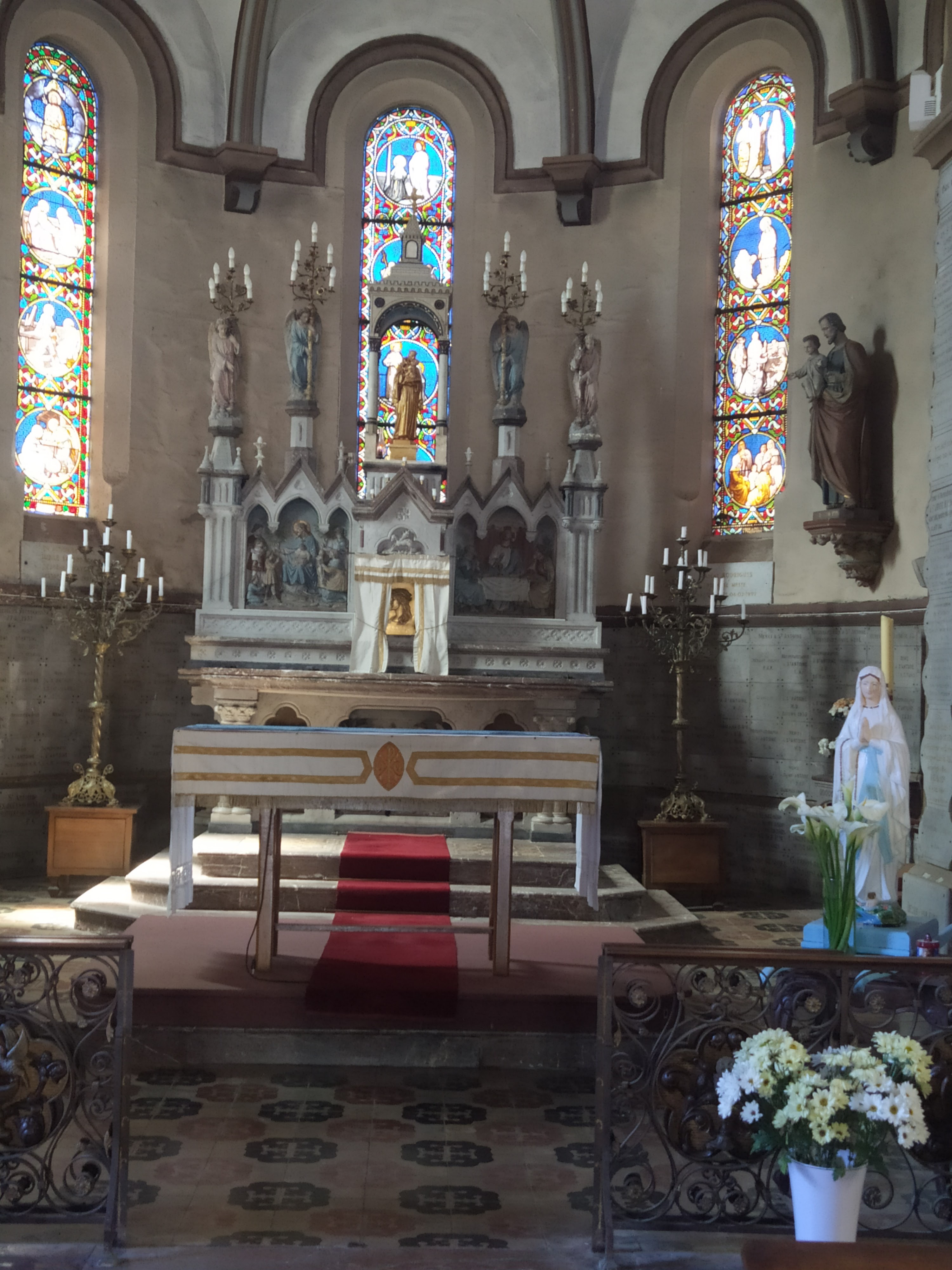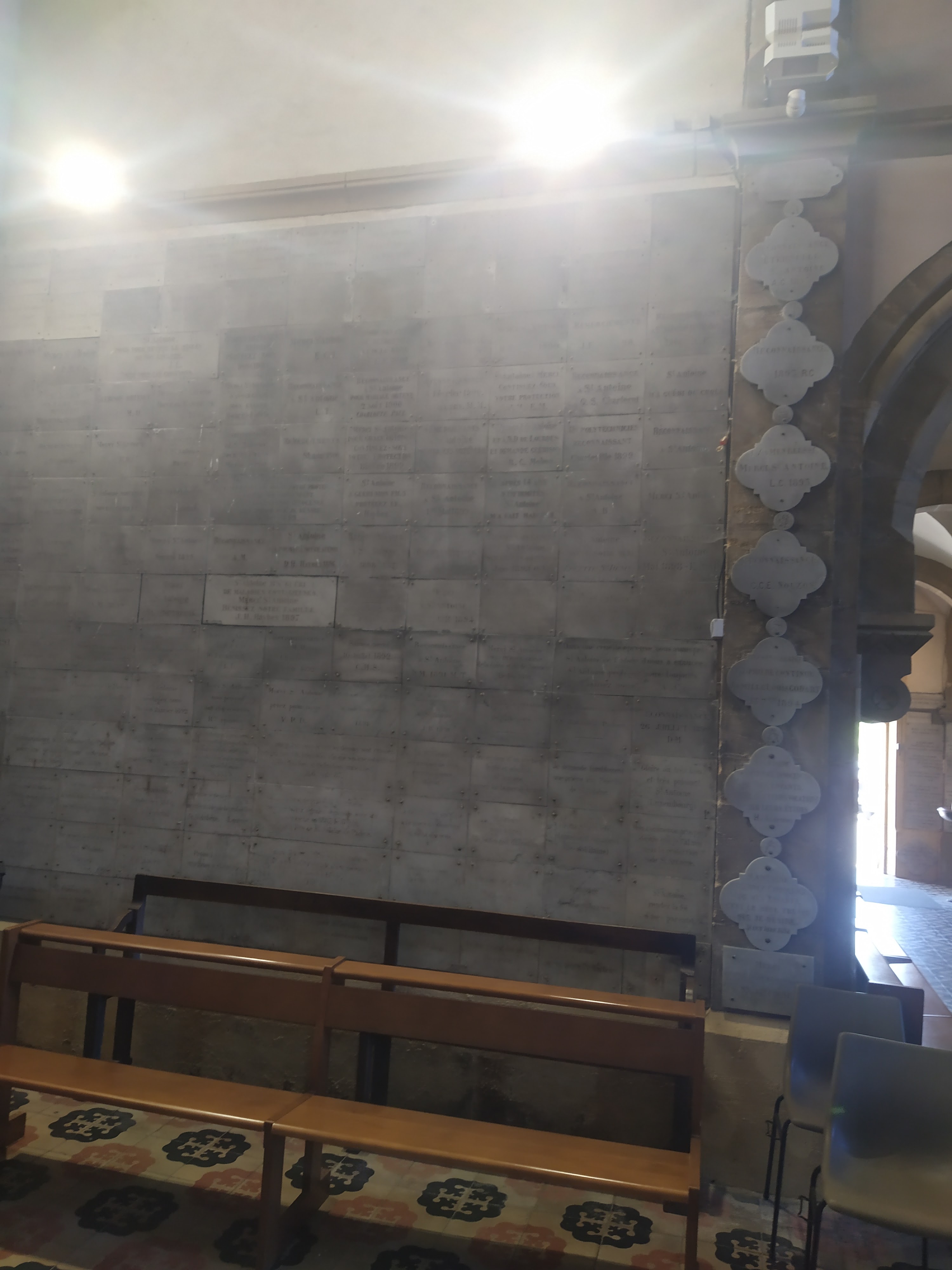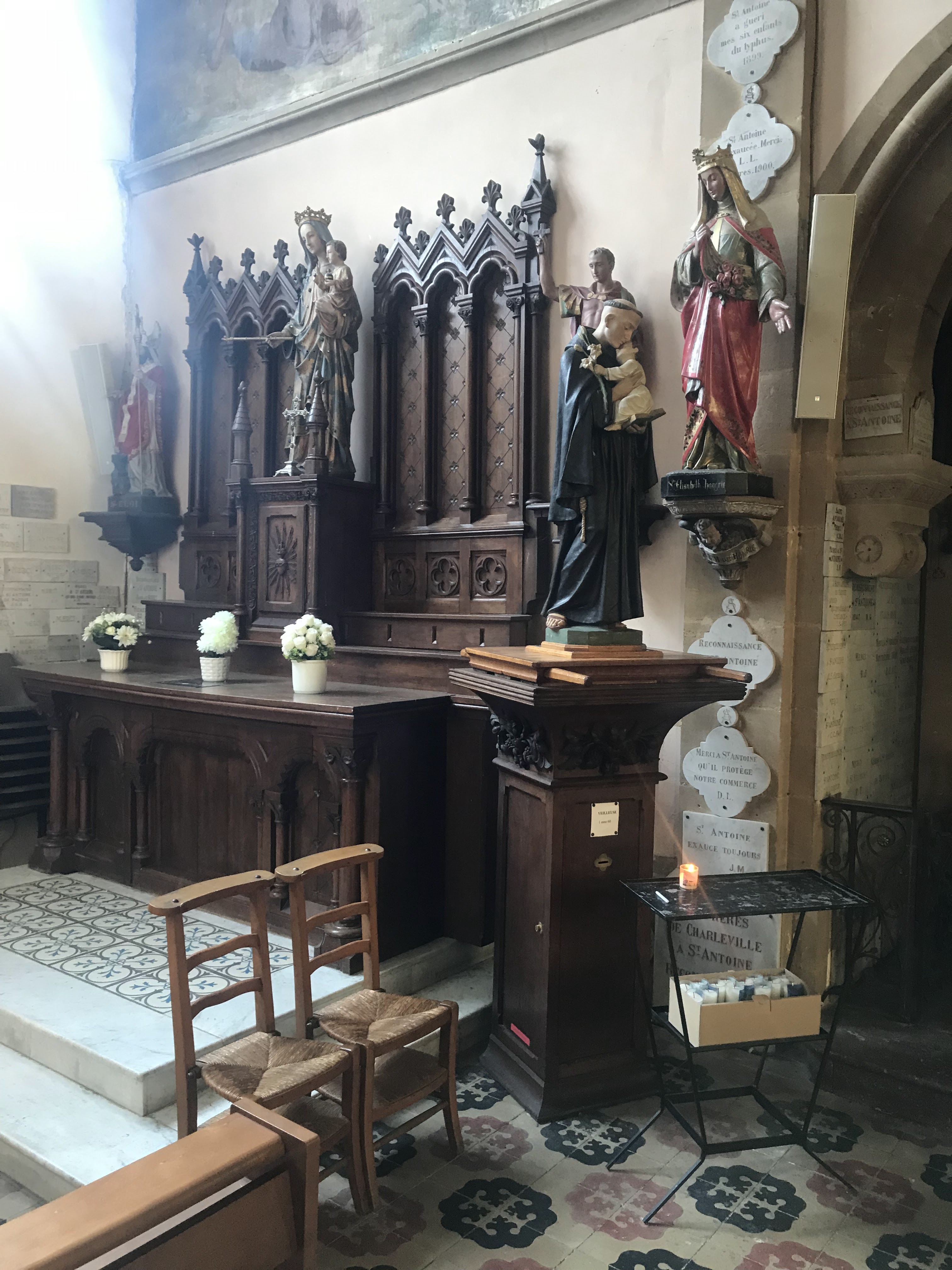 Belle eglise. Impressionnante par le nombre de plaques de remerciement partout sur les murs, piliers...reliques d'une côte de Saint-Antoine de Padoue et du jeune Saint-Florent.