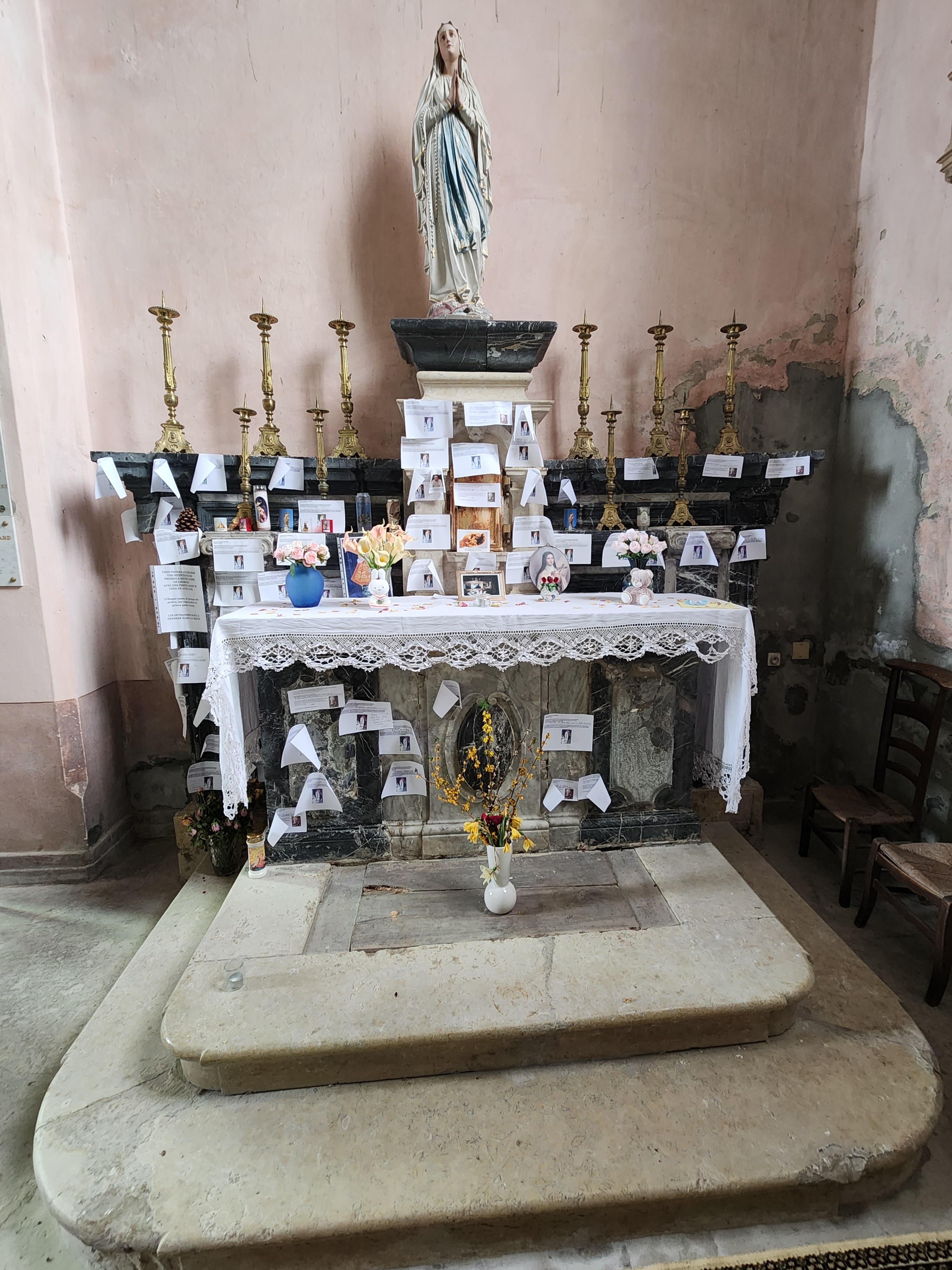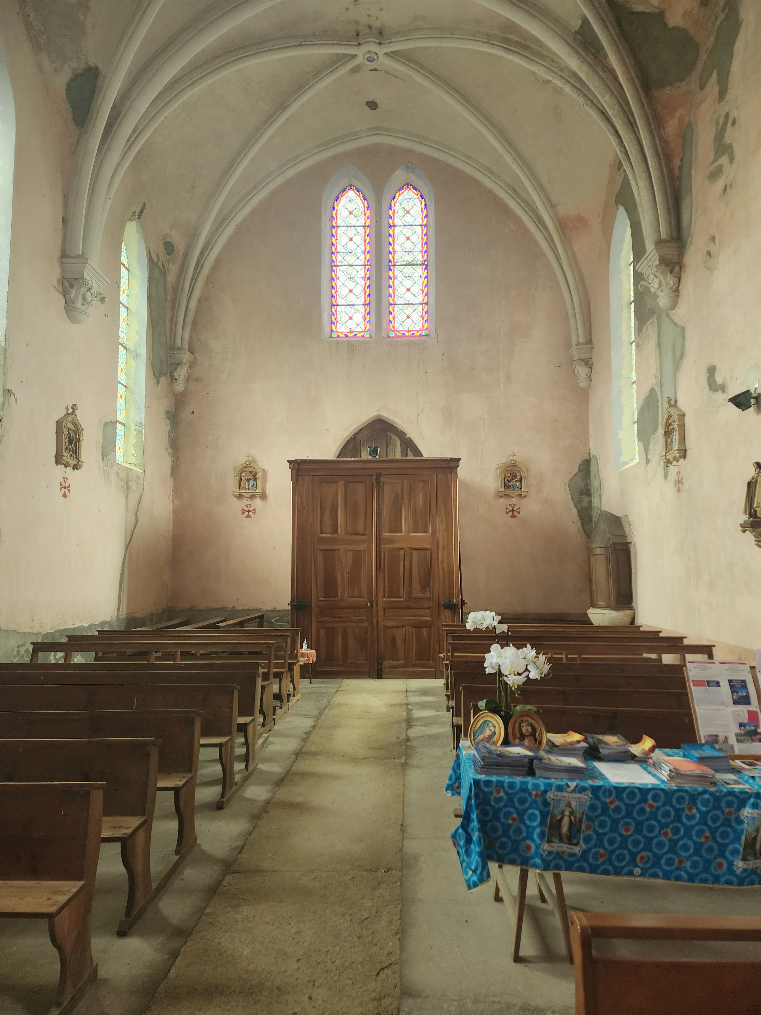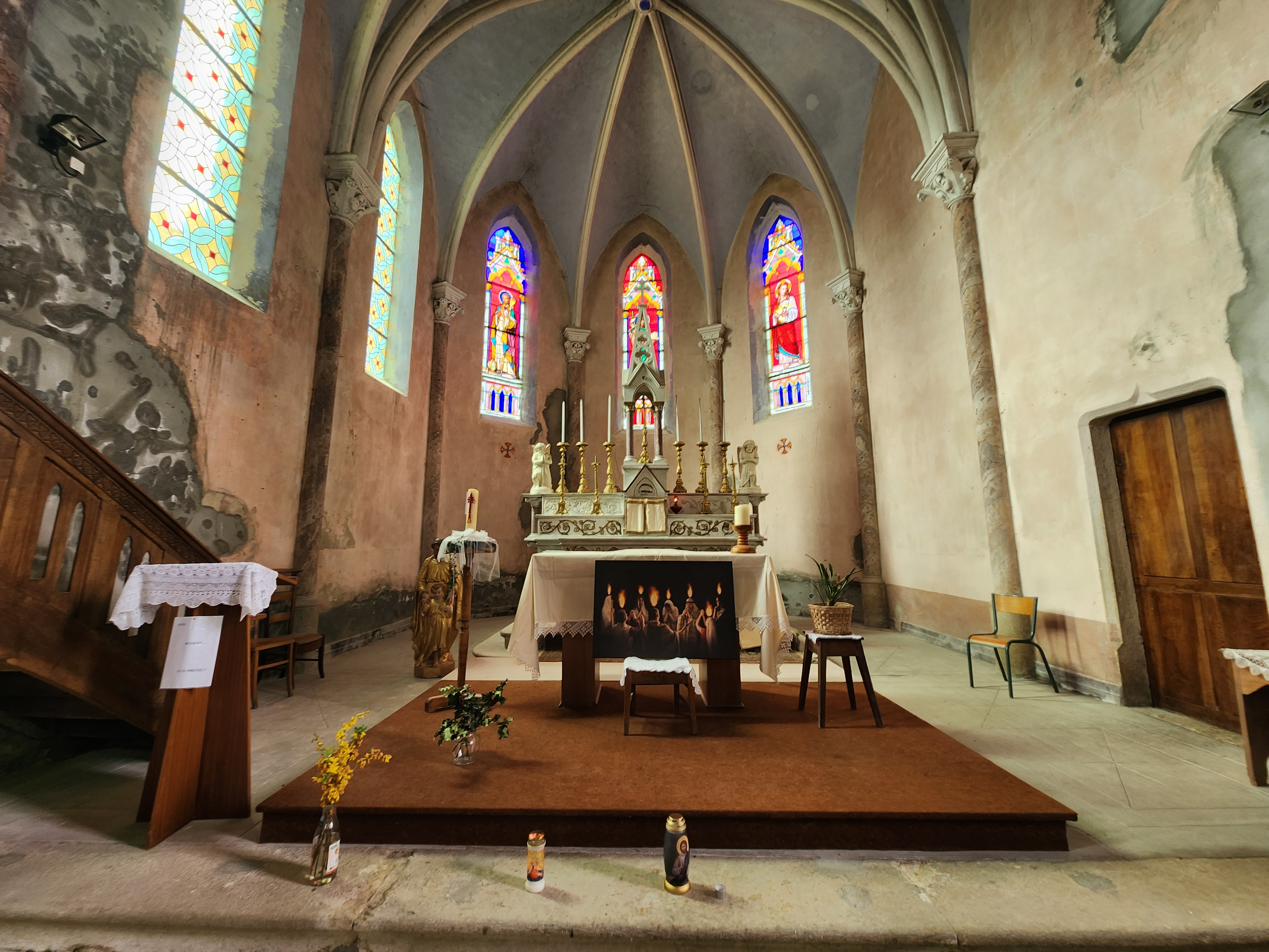 Situé dans une ville très calme avec peu de monde à l'extérieur. Les seuls bruits que l'on pouvait entendre étaient le bruit de l'eau qui coulait dans les Alpes françaises. La porte latérale de l'église était ouverte et elle semble être en bois traditionnel. L'église est très vieille, délabrée et nécessite des réparations immédiates. Tout près du maître-autel, à gauche vous avez la statue de St Joseph et à droite la statue de Mère Marie (Lourdes). Vous pouvez déposer vos pétitions dans l’un ou l’autre coin des Saints. La statue de Saint Michel Archange est en métal et elle était la plus importante L'église a peut-être adopté saint Joseph comme saint patron car l'église possède quelques-unes de ses images. Digne d'une visite. Et les fidèles peuvent eux aussi passer un moment de calme.