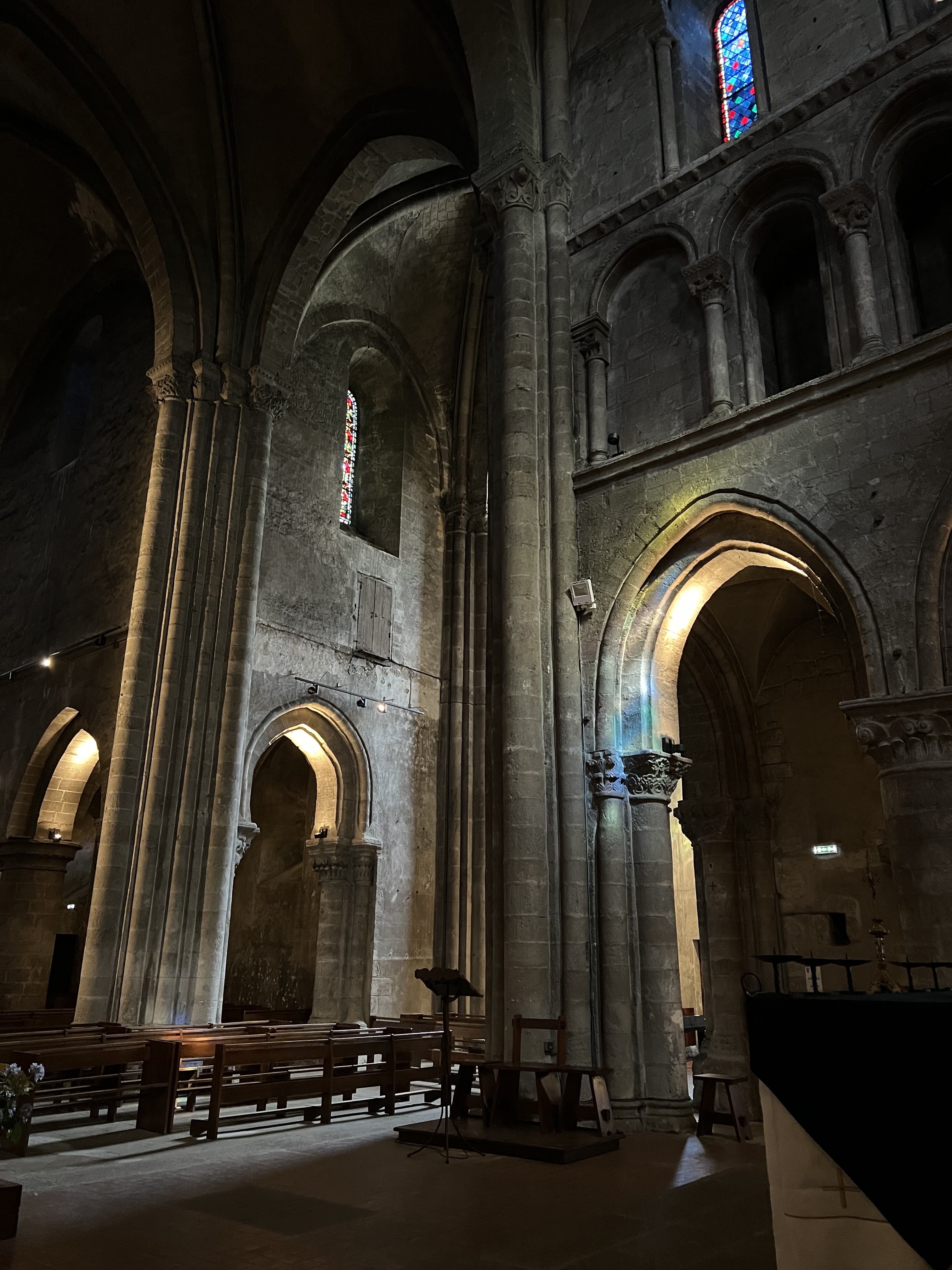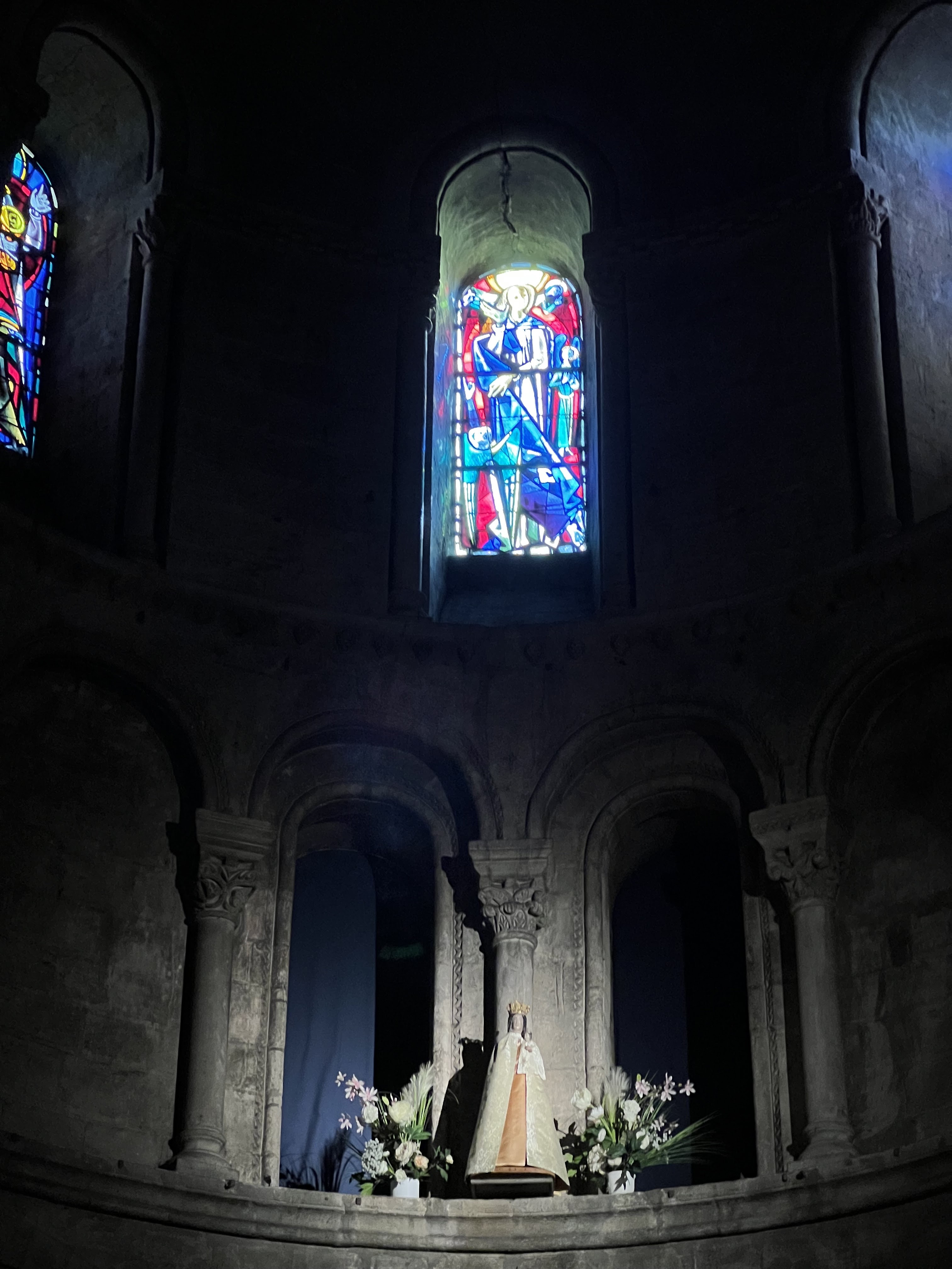 L'extérieur ne trompe pas. Et la visite s'impose. La basilique est globalement sombre. Un éclairage sobre et juste suffisant, qui invite et permet simplement l'expérience. Les géants de l'entrée ne sont que prémices, car les autres, plus subtiles, nous révèlent La Dame aux miracles accomplis. Je suis curieux de l'office, confiant que l'étonnante Présence permanente du Feu soit une source qui enflamme les âmes.