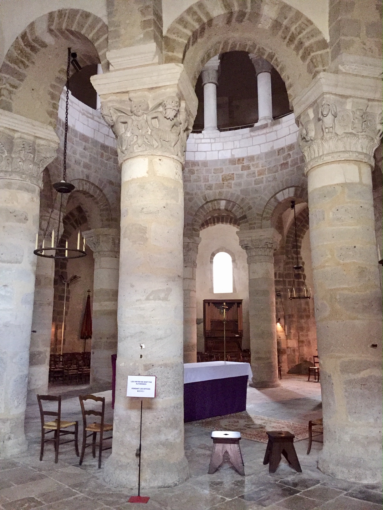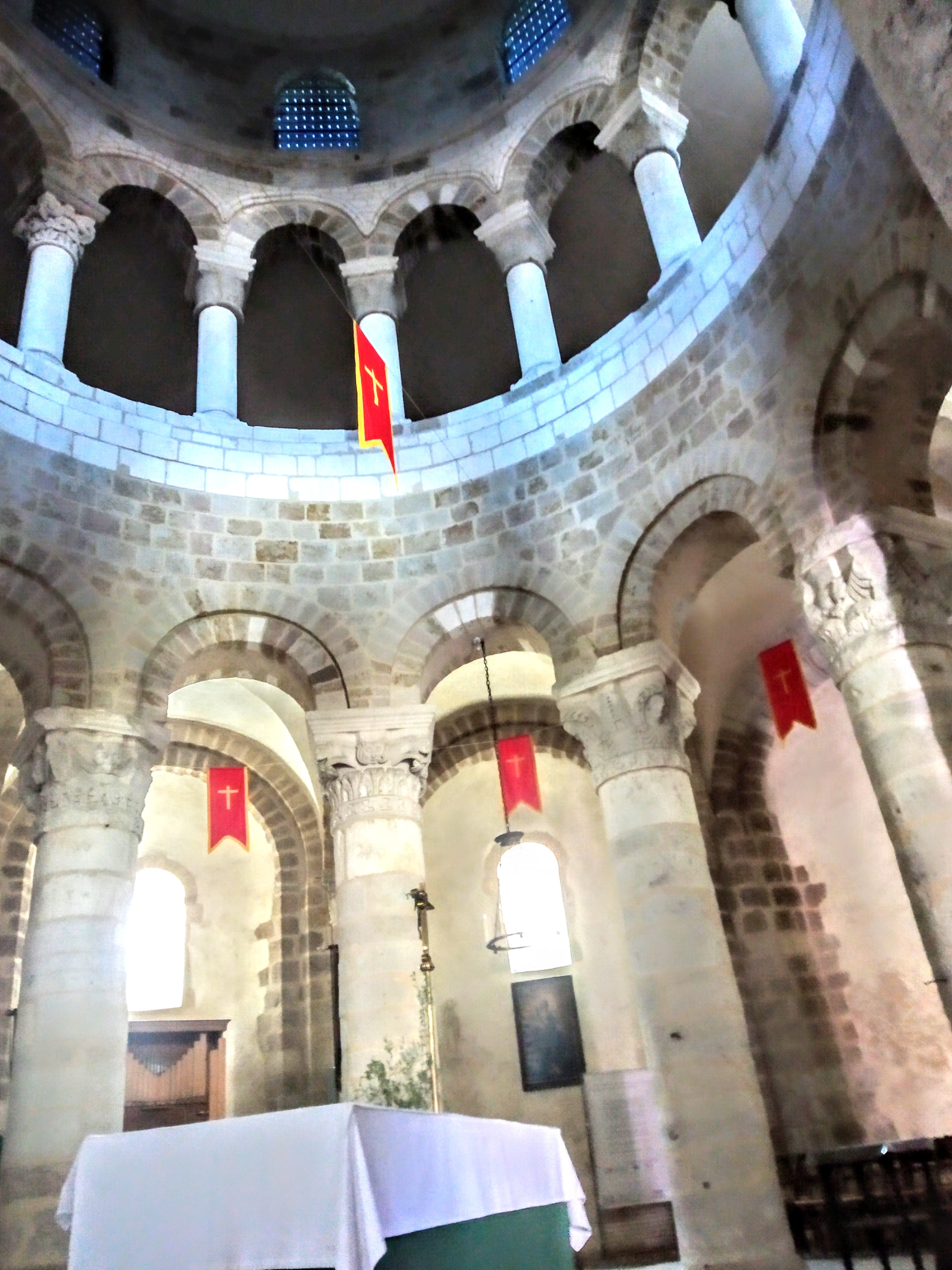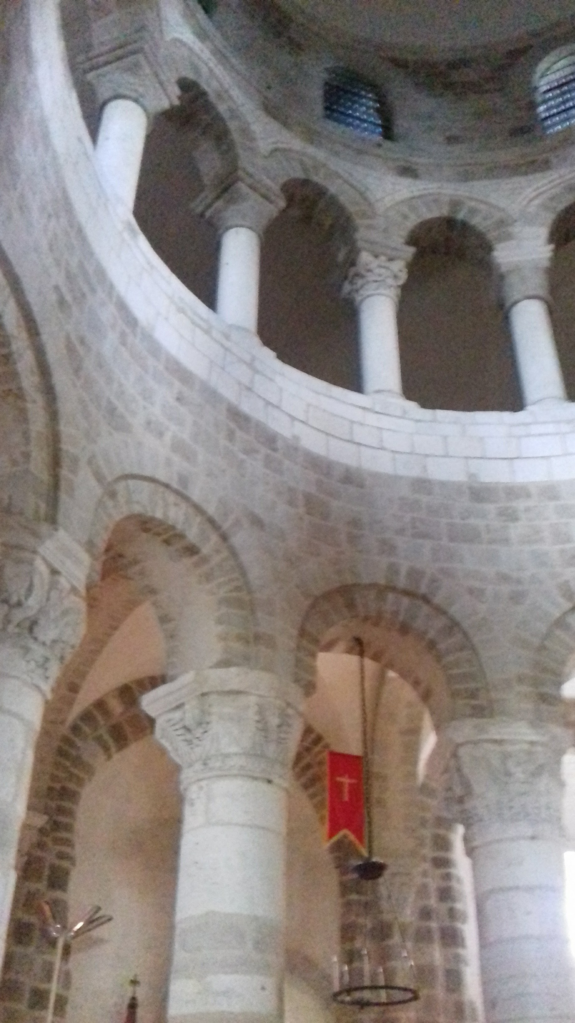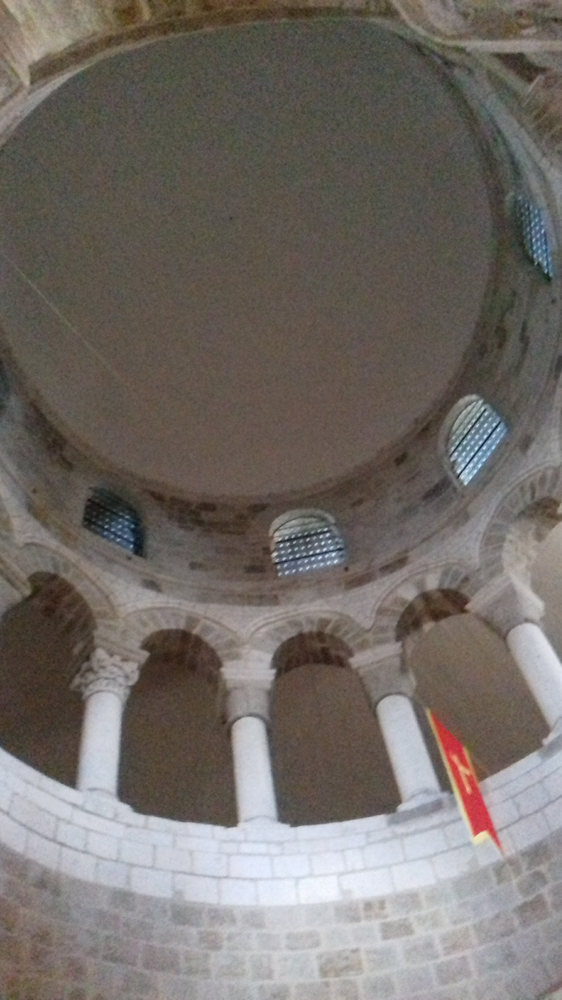 De la rue, cet édifice, classé a l'UNESCO, situé sur la voie de Vézelay vers Compostelle, semble coincé entre la route principale et une ruelle. De l'extérieur, on ne peut présager du joyaux que l'on va trouver à l'intérieur. Magnifique rotonde, construite par le seigneur du village qui revenant des croisades voulait que les villageois qui ne pourraient se rendre en Orient puisse avoir une copie du st Sépulchre. Plus petit 11 piliers et non 14 comme à Jérusalem. Une nef à été ajoutée plus tard. Viollet le Duc a changé la coupole originelle pour un toit chapeau chinois. Dans une chapelle, un reliquaire contiendrait 3 gouttes de sang du Christ et un clou de la croix. Comme nous avons visité le matin, nous n'avons pas pu voir l'expo sur la galerie supérieure. Mérite une visite