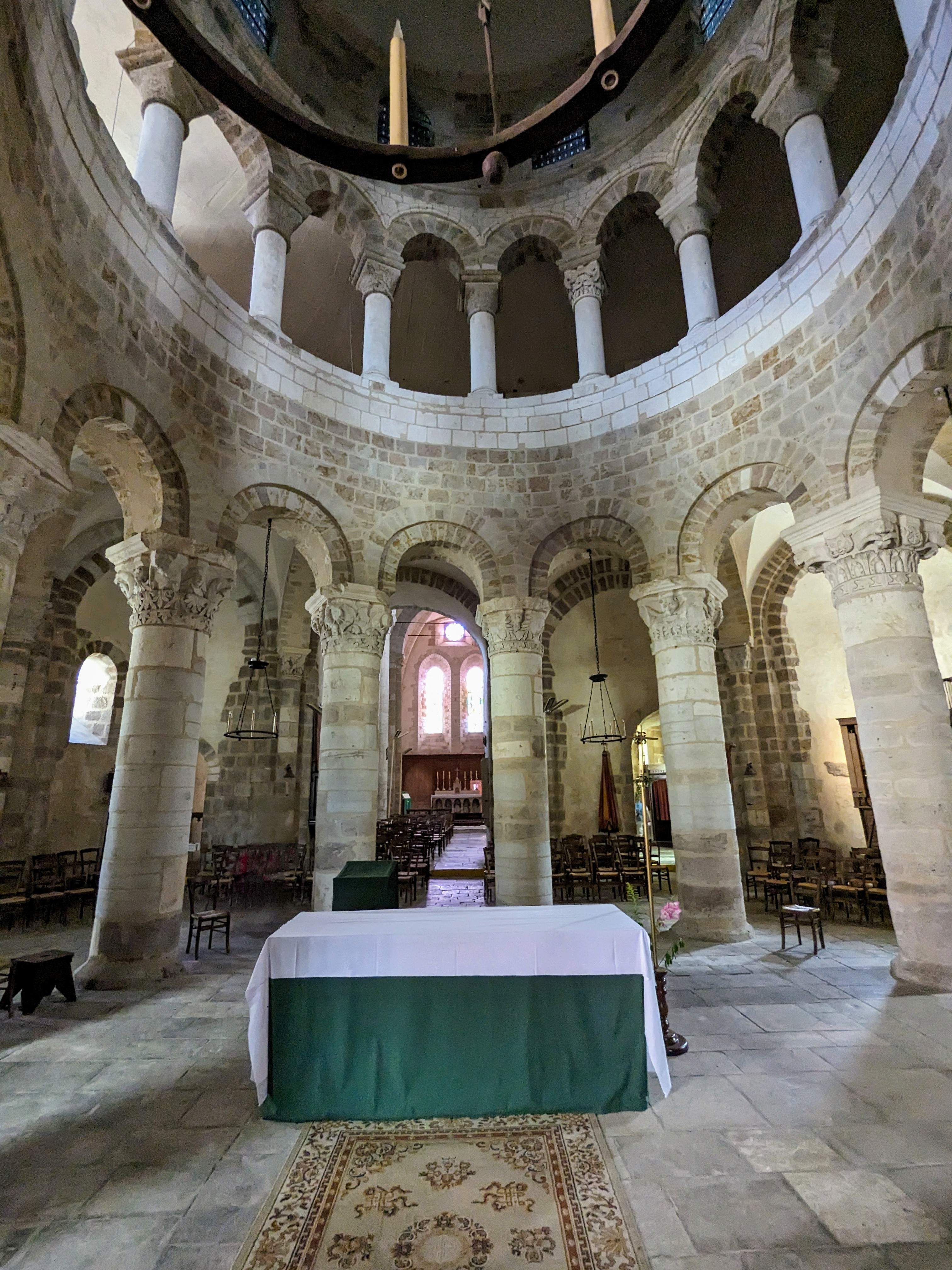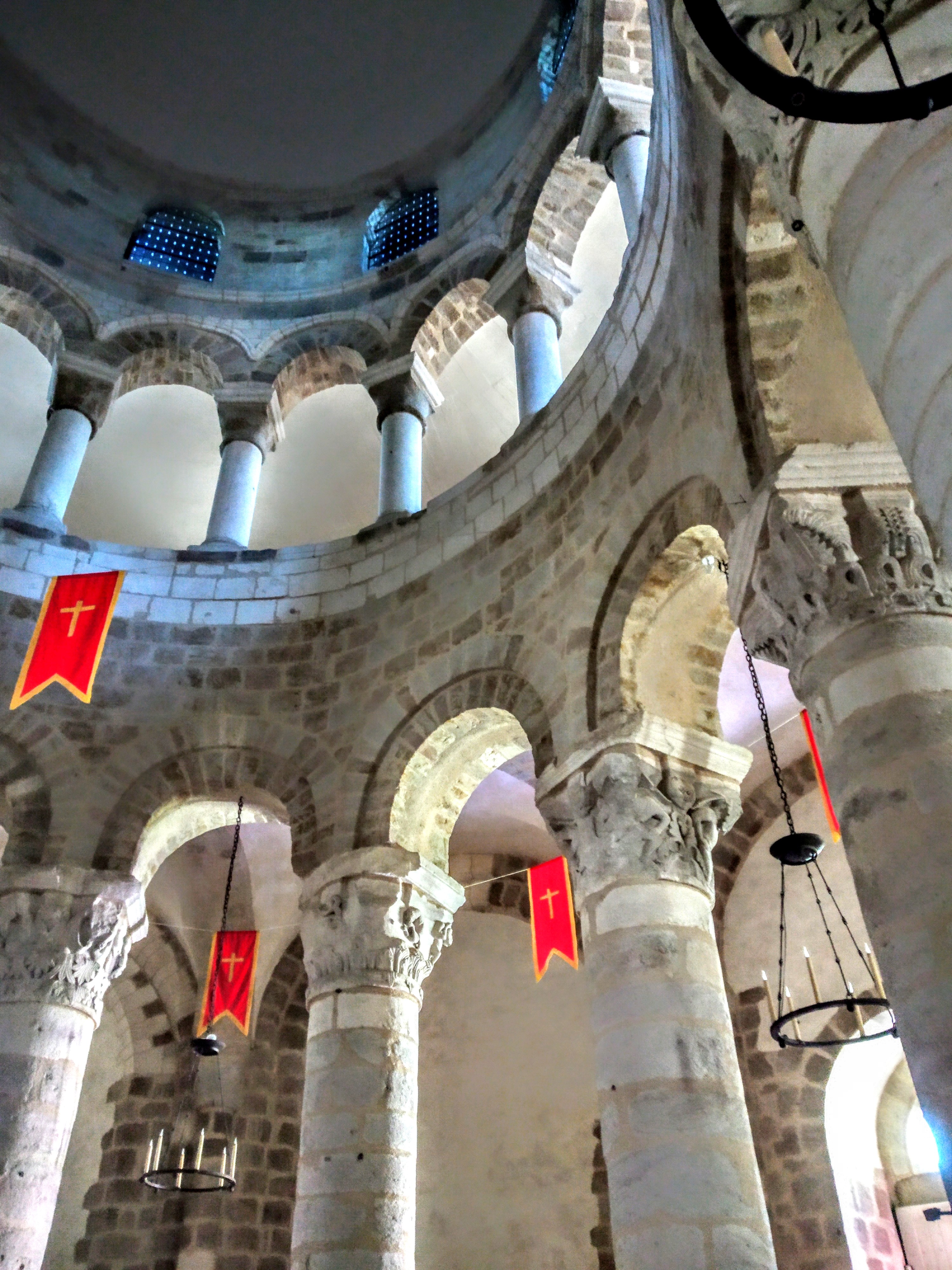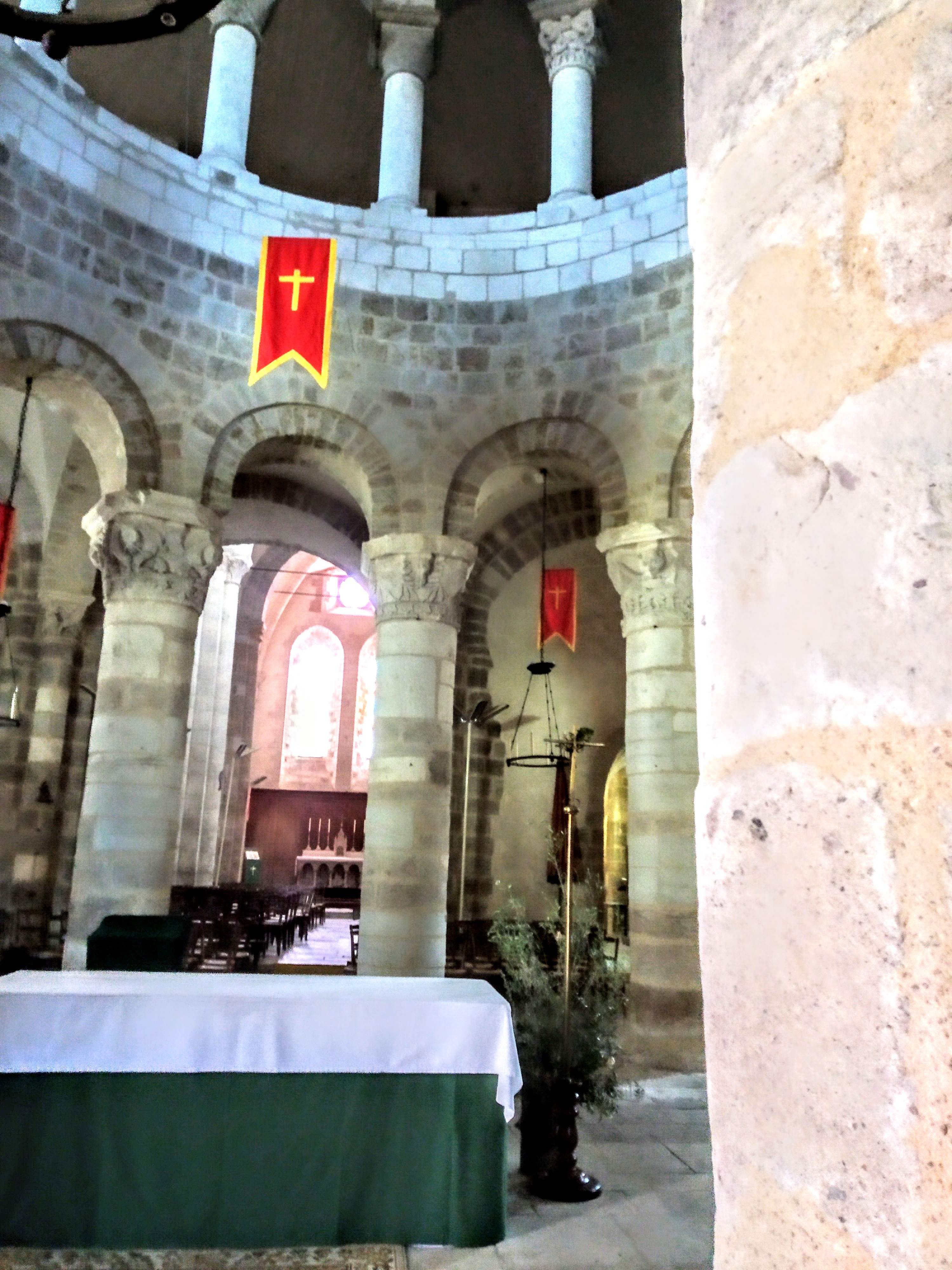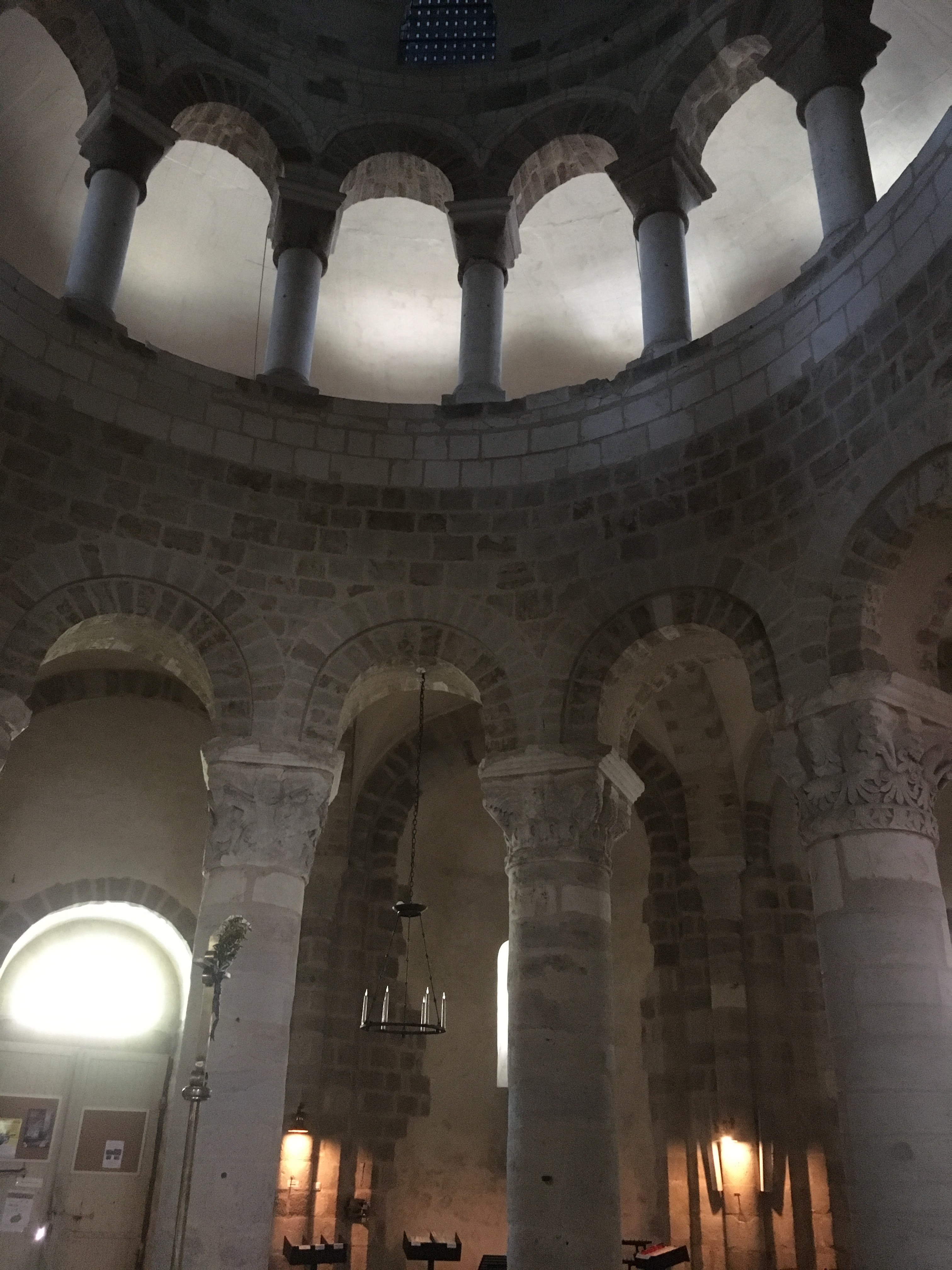 De la rue, cet édifice, classé a l'UNESCO, situé sur la voie de Vézelay vers Compostelle, semble coincé entre la route principale et une ruelle. De l'extérieur, on ne peut présager du joyaux que l'on va trouver à l'intérieur. Magnifique rotonde, construite par le seigneur du village qui revenant des croisades voulait que les villageois qui ne pourraient se rendre en Orient puisse avoir une copie du st Sépulchre. Plus petit 11 piliers et non 14 comme à Jérusalem. Une nef à été ajoutée plus tard. Viollet le Duc a changé la coupole originelle pour un toit chapeau chinois. Dans une chapelle, un reliquaire contiendrait 3 gouttes de sang du Christ et un clou de la croix. Comme nous avons visité le matin, nous n'avons pas pu voir l'expo sur la galerie supérieure. Mérite une visite