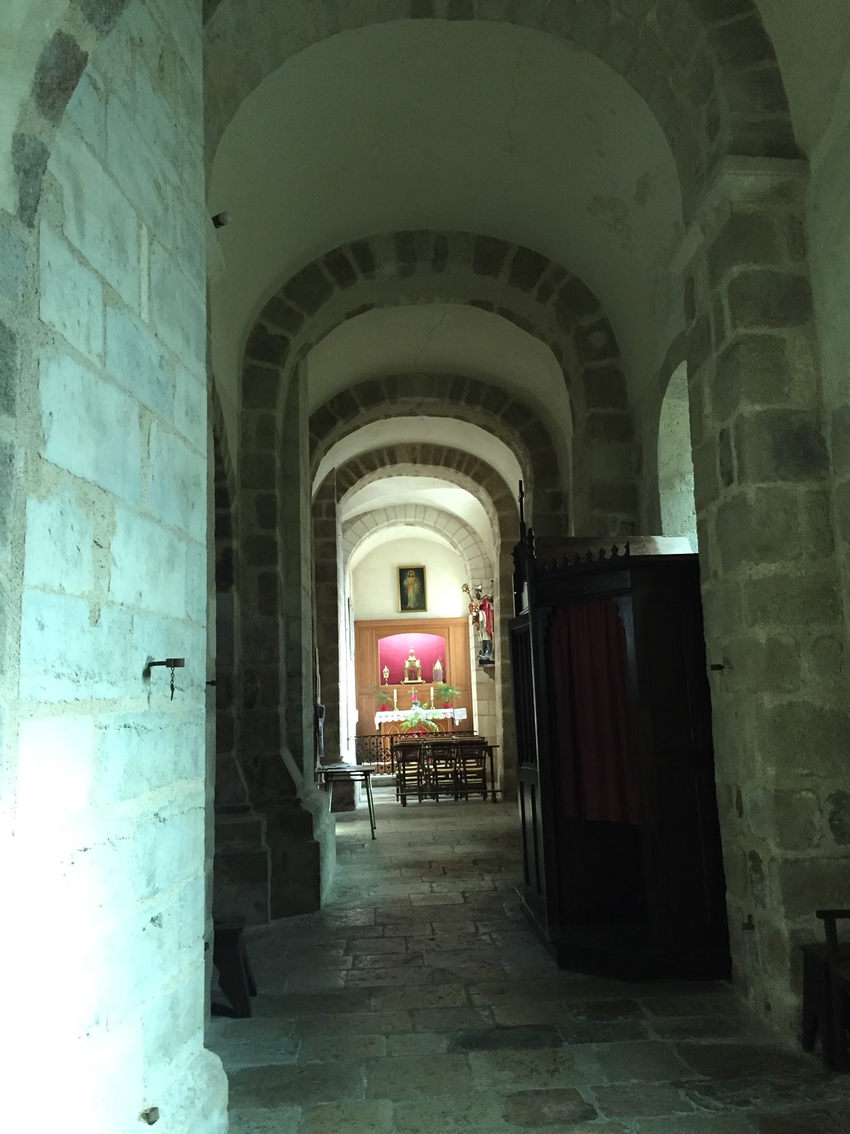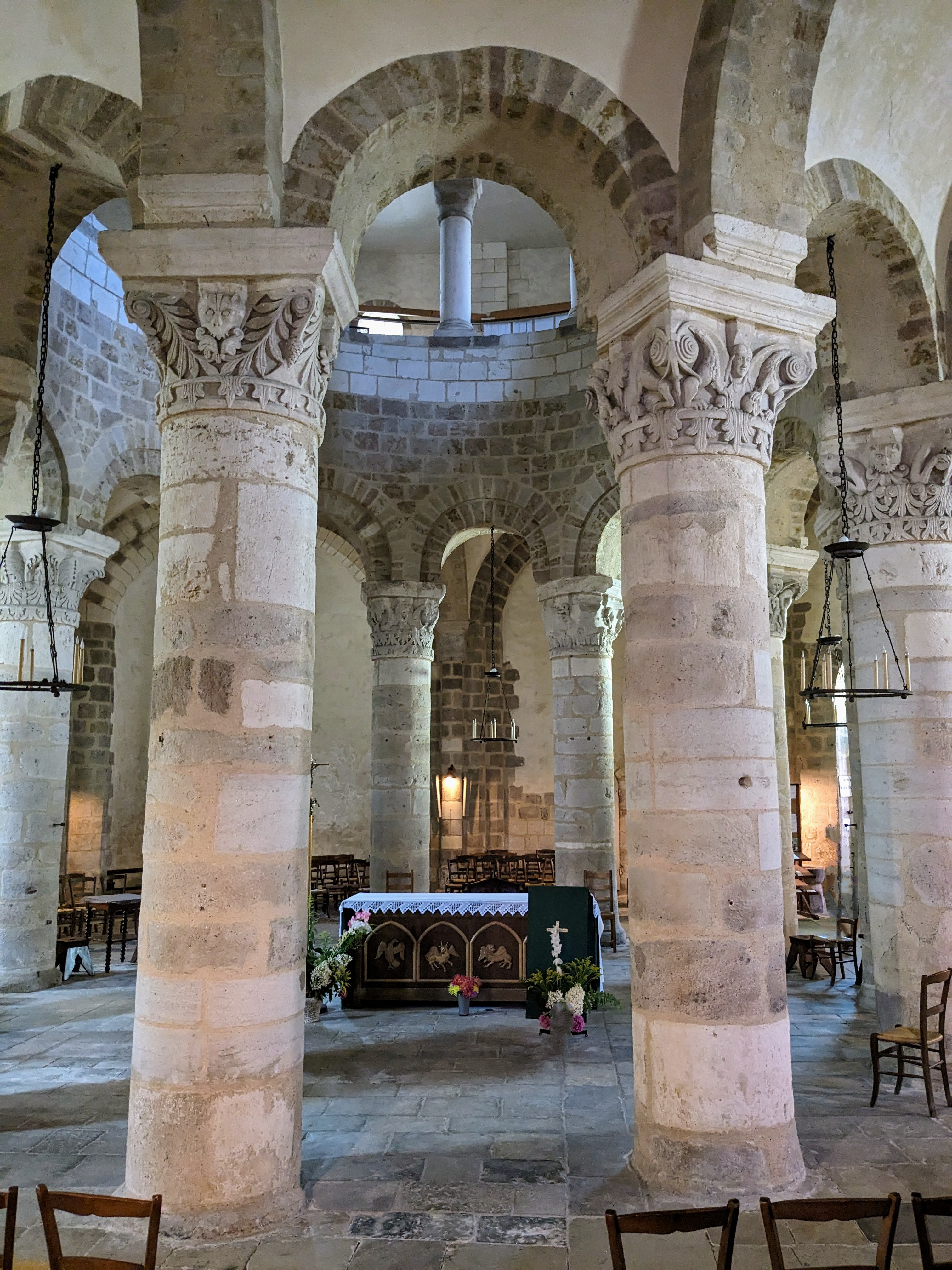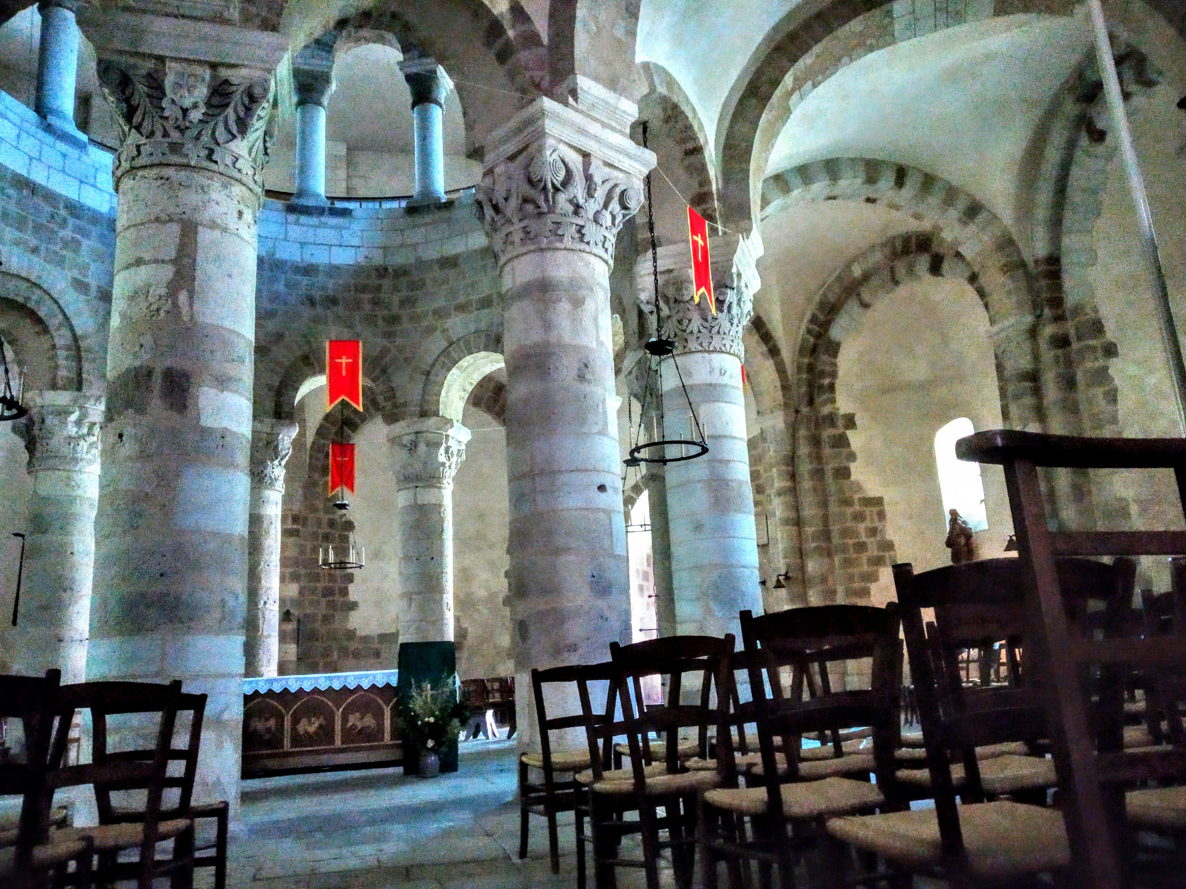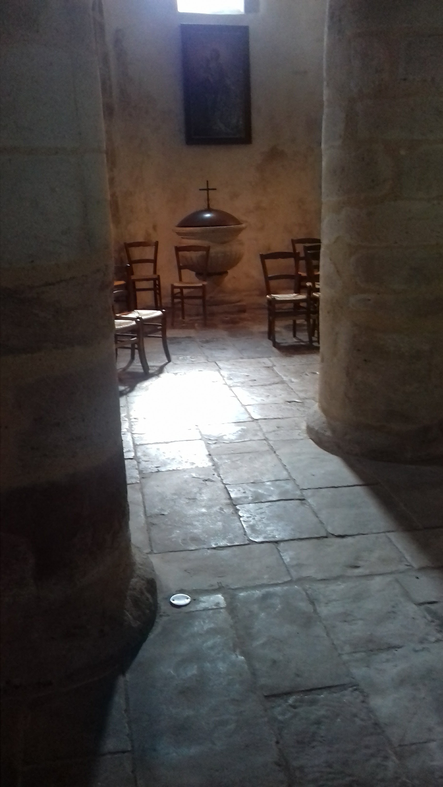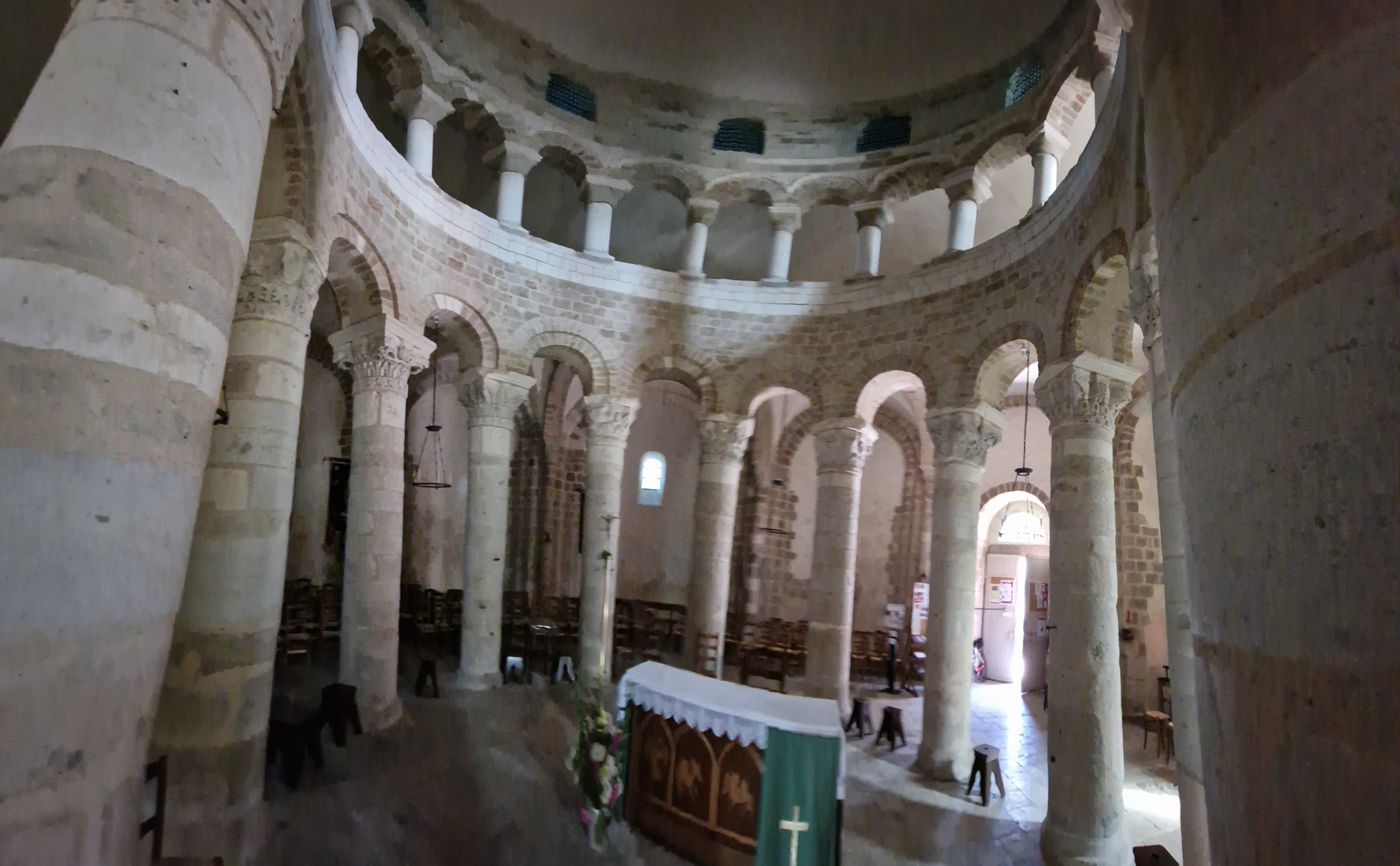 De la rue, cet édifice, classé a l'UNESCO, situé sur la voie de Vézelay vers Compostelle, semble coincé entre la route principale et une ruelle. De l'extérieur, on ne peut présager du joyaux que l'on va trouver à l'intérieur. Magnifique rotonde, construite par le seigneur du village qui revenant des croisades voulait que les villageois qui ne pourraient se rendre en Orient puisse avoir une copie du st Sépulchre. Plus petit 11 piliers et non 14 comme à Jérusalem. Une nef à été ajoutée plus tard. Viollet le Duc a changé la coupole originelle pour un toit chapeau chinois. Dans une chapelle, un reliquaire contiendrait 3 gouttes de sang du Christ et un clou de la croix. Comme nous avons visité le matin, nous n'avons pas pu voir l'expo sur la galerie supérieure. Mérite une visite