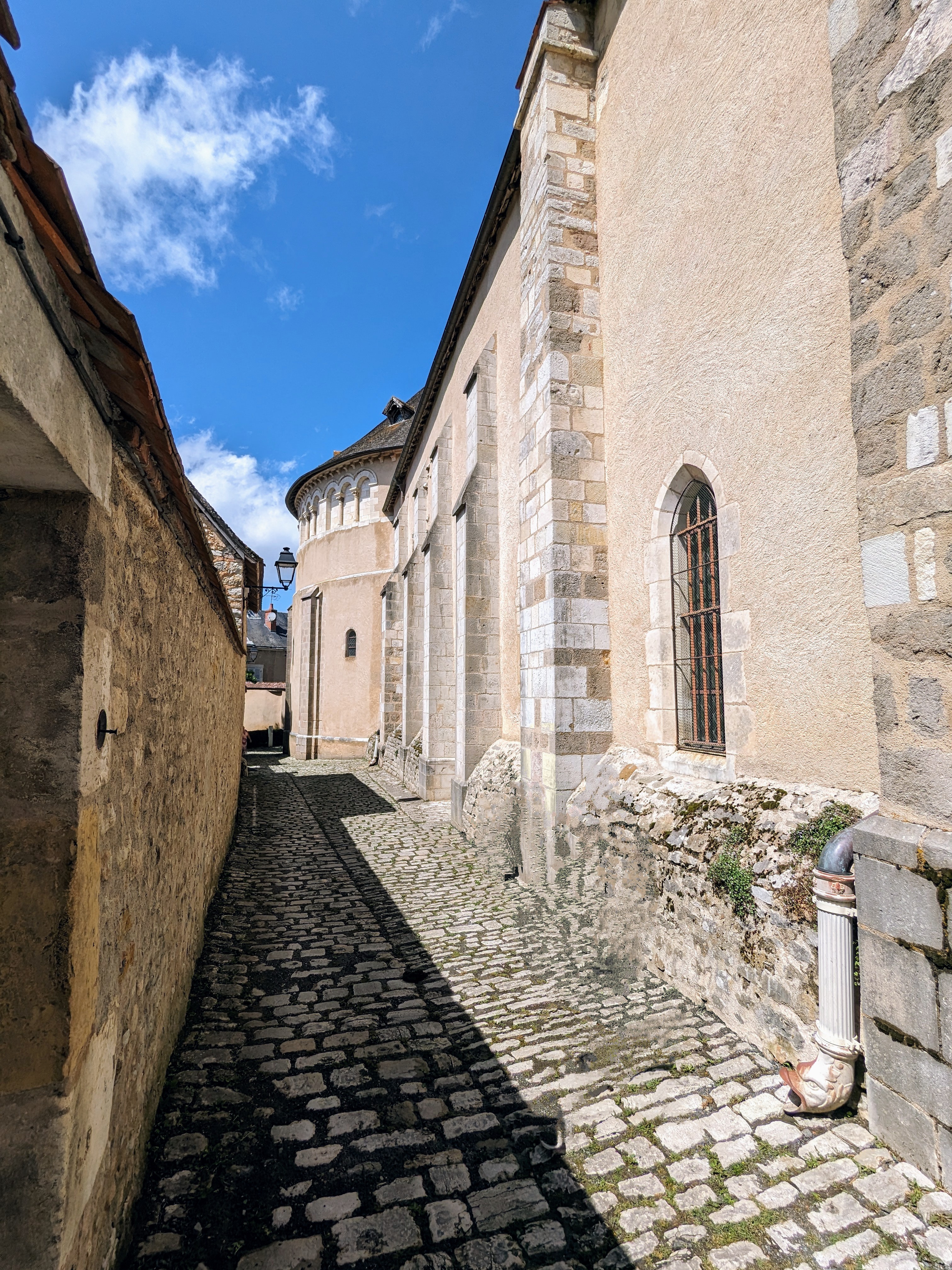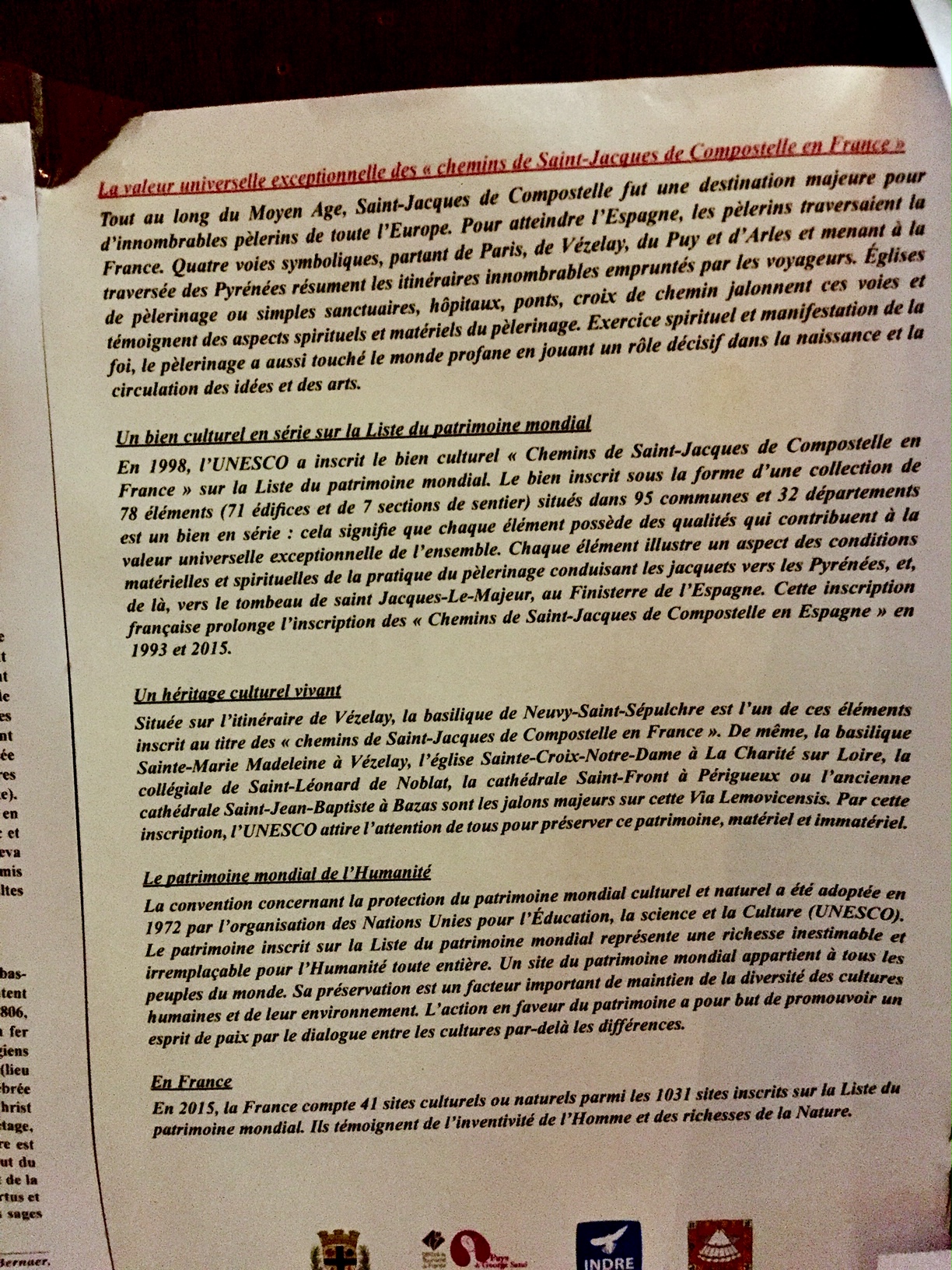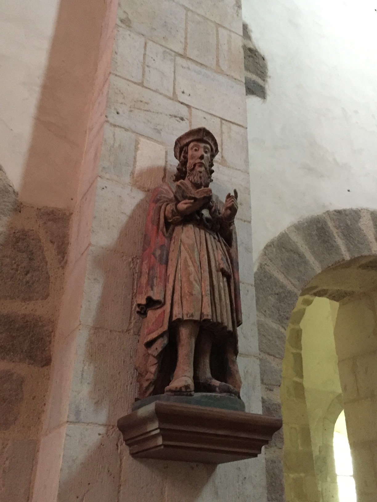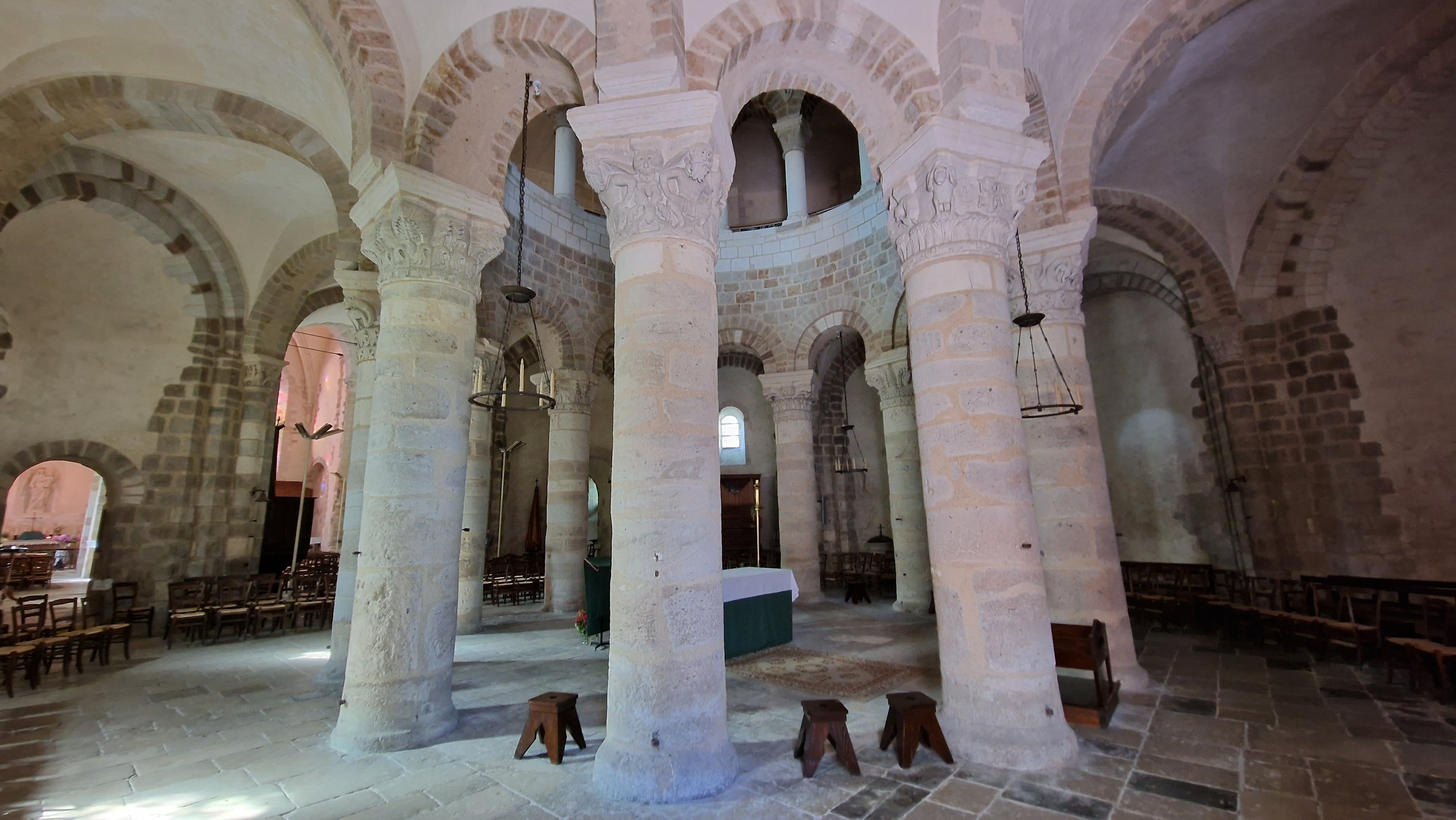 De la rue, cet édifice, classé a l'UNESCO, situé sur la voie de Vézelay vers Compostelle, semble coincé entre la route principale et une ruelle. De l'extérieur, on ne peut présager du joyaux que l'on va trouver à l'intérieur. Magnifique rotonde, construite par le seigneur du village qui revenant des croisades voulait que les villageois qui ne pourraient se rendre en Orient puisse avoir une copie du st Sépulchre. Plus petit 11 piliers et non 14 comme à Jérusalem. Une nef à été ajoutée plus tard. Viollet le Duc a changé la coupole originelle pour un toit chapeau chinois. Dans une chapelle, un reliquaire contiendrait 3 gouttes de sang du Christ et un clou de la croix. Comme nous avons visité le matin, nous n'avons pas pu voir l'expo sur la galerie supérieure. Mérite une visite