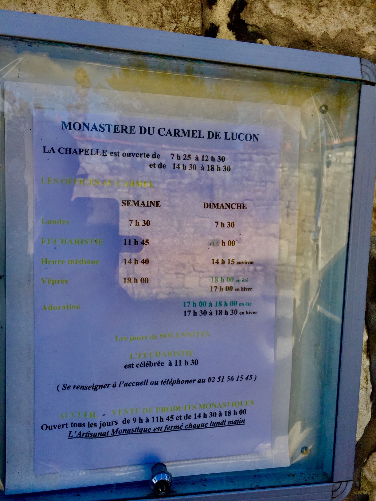 Un endroit accueillant. On entre d'abord dans une petite cour qui donne accès au Carmel de Luçon et à la Chapelle Sainte Thérèse par deux portes indépendantes l'une de l'autre. Le Carmel propose dans sa boutique des produits monastiques, tous les jours (sauf le lundi matin), de 9h à 11h 45 et de 14h 30 à 18h. Des chambres permettent d'accueillir des personnes en vue d'une retraite spirituelle. Un petit oratoire, à l'accueil du Carmel leur offre un lieu de recueillement ; La chapelle Sainte Thérèse, attenante au Carmel leur est également ouverte. Une jolie chapelle, simple, mais une belle architecture et des voûtes en bois originales. L'éclairage intérieur doit son agrément à des vitraux de styles variés aux superbes couleurs. On y accède facilement par l'entrée de la petite cour du Carmel. Ne pas la confondre Chapelle Sainte-Thérèse (ou Millessouris) avec La Chapelle Sainte-Ursule accessible pour les seules journées du patrimoine ou la Chapelle Sainte-Madeleine (ou chapelle de l'hôpital)