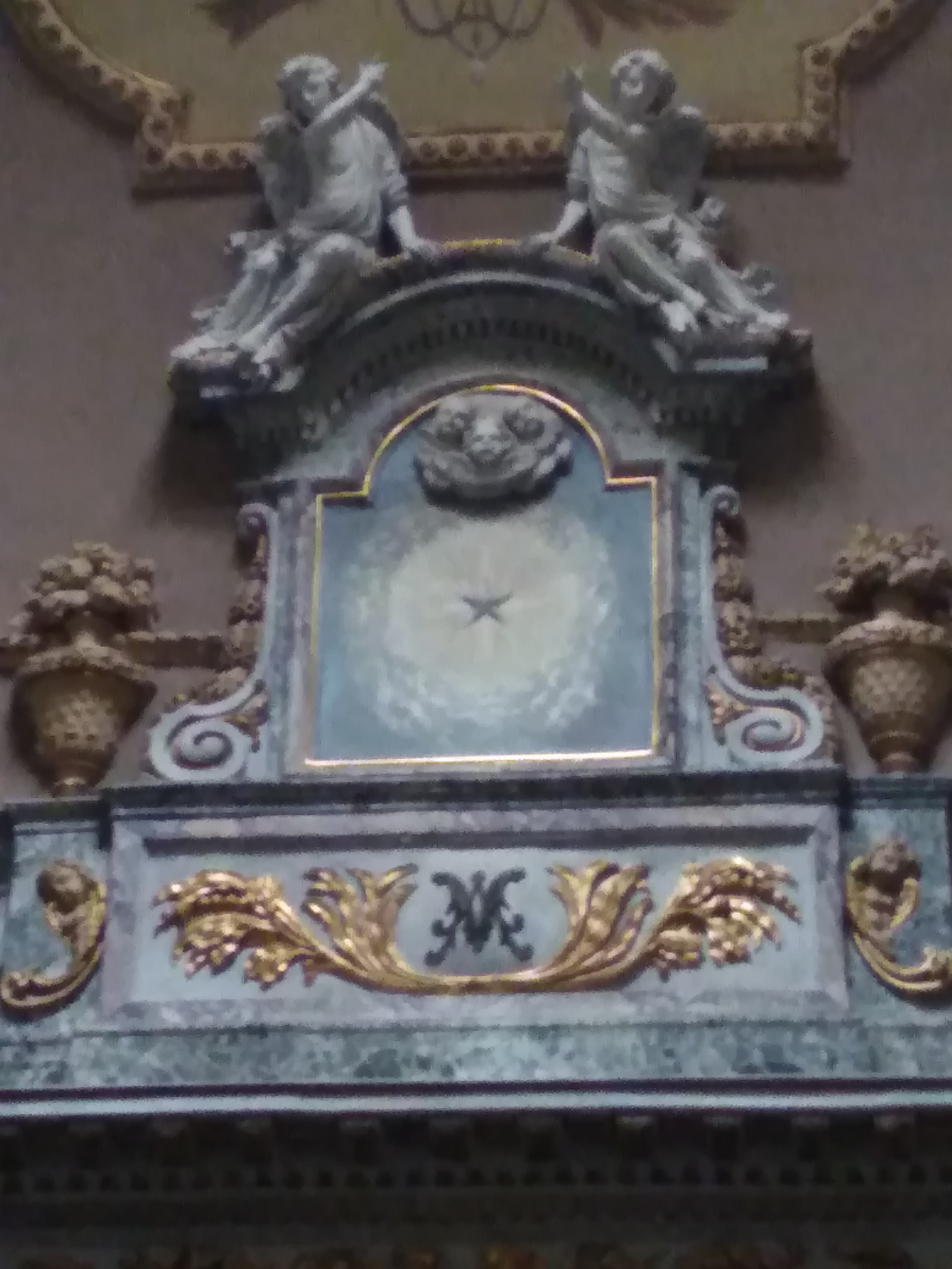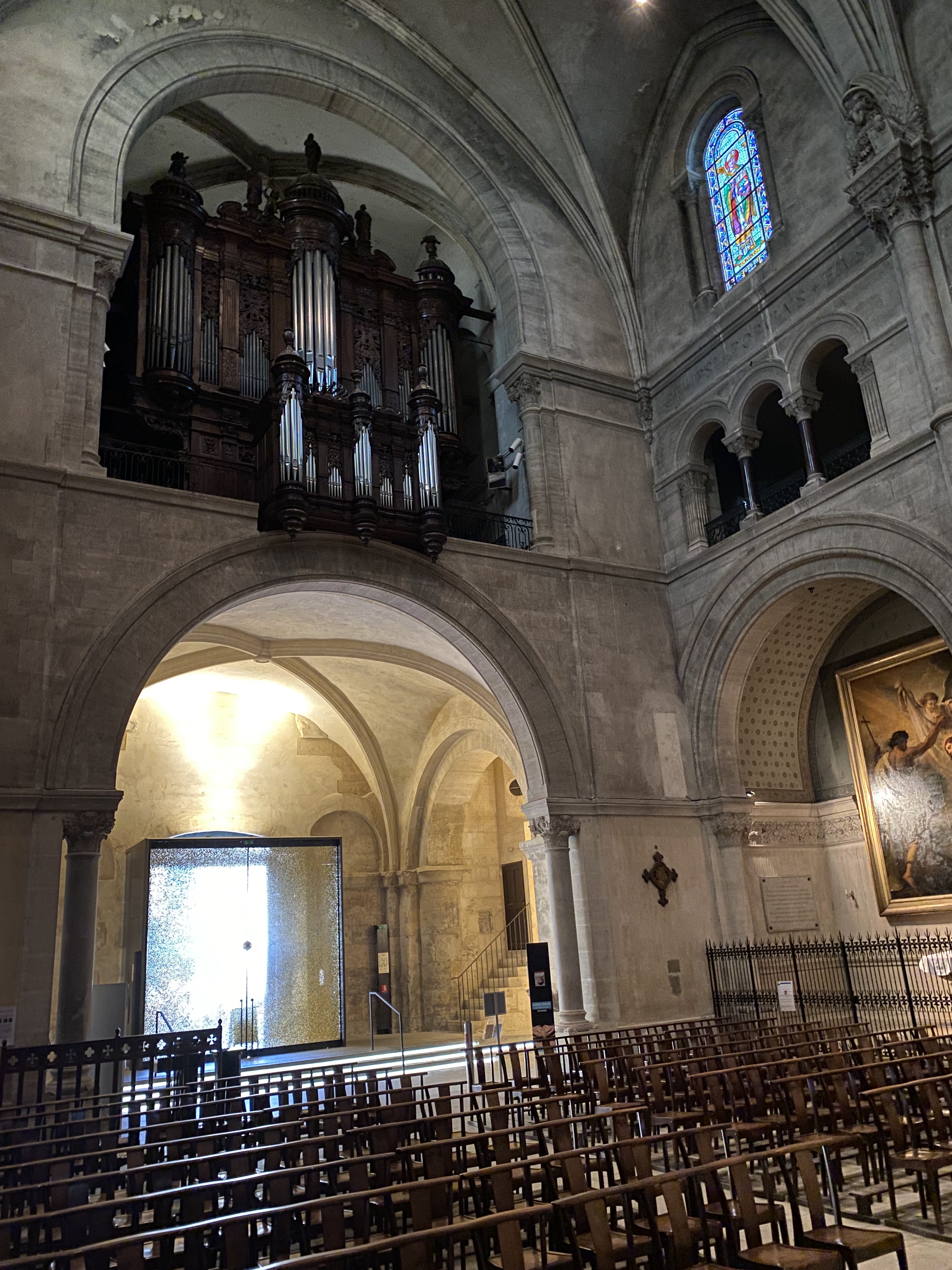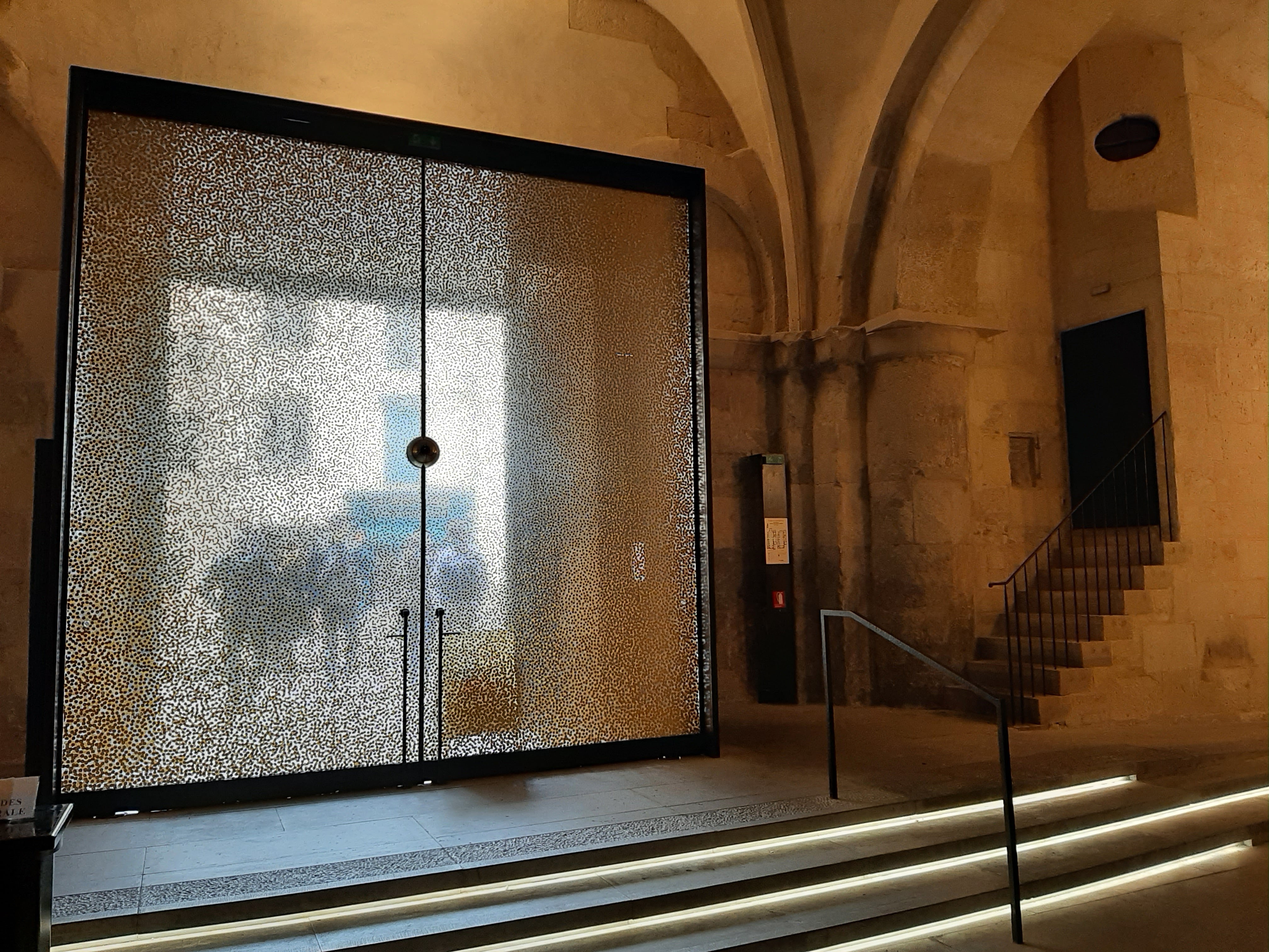 J’aime la porte moderne en verre gravé de 1000 points dorés à la feuille d’or, qui, comme ailleurs à Nîmes, inscrit ce monument millénaire dans notre siècle. “Cette nuée de points tous différents évoque le peuple de dieu convergeant vers la Jérusalem céleste. La citée idéale est ici figurée par une sphère centrale dorée qui porte , gravés dans le métal, des symboles bibliques.“ (Citation et photos de l’atelier Emmanuel Barrois, artisan auteur de cette œuvre magnifique)