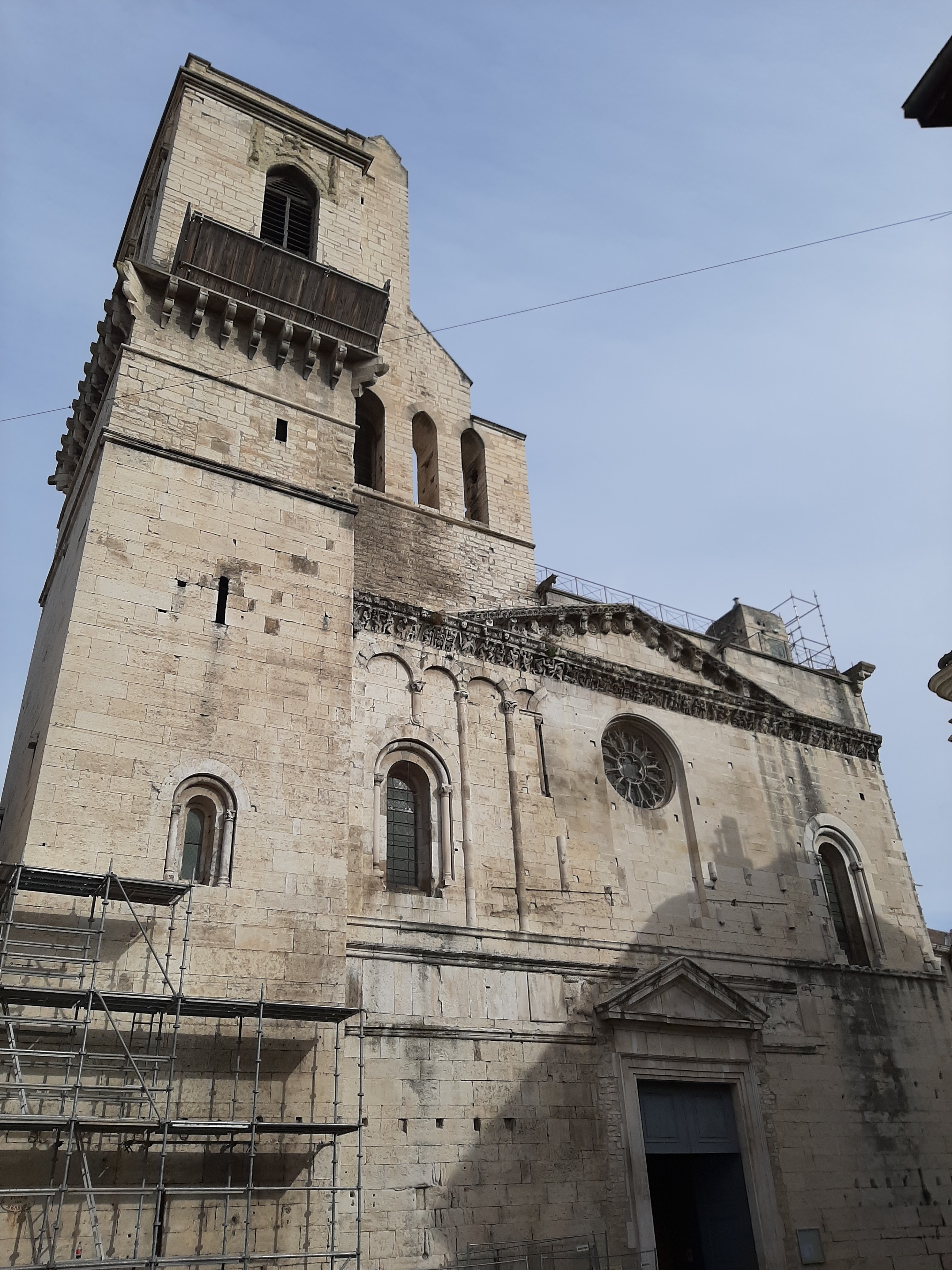 La cathédrale romane, construite sur des édifices plus anciens (de l'époque romaine), fut consacrée en 1096. De cette époque sont conservées certaines parties des façades. Sur le côté gauche, vous pouvez voir un ensemble de bas-reliefs de l'Ancien Testament.