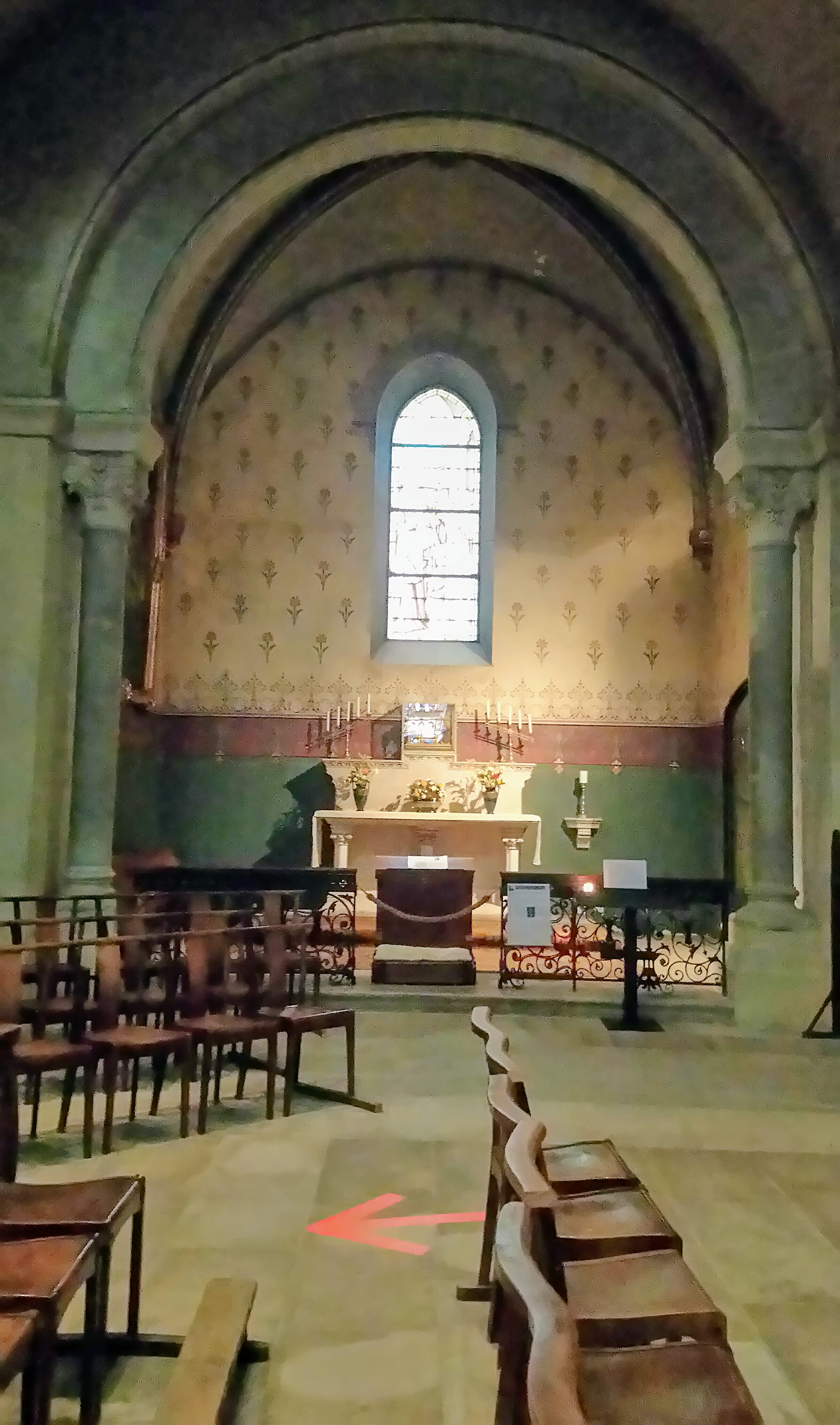 Belle église romane, sombre car peu d'ouvertures. Bel autel