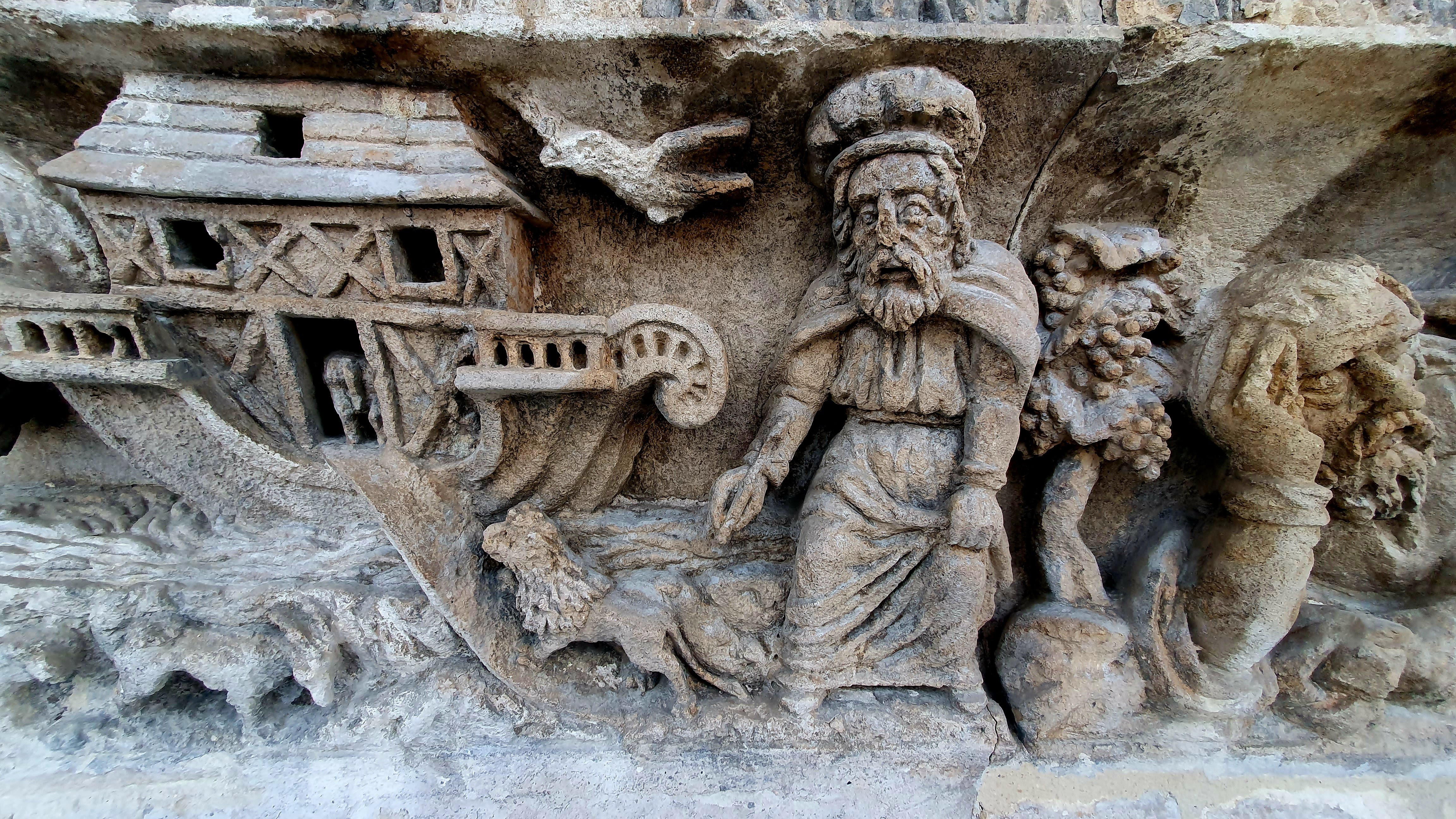 Regardez la frise de l’histoire biblique juste en dessous du toit, à droite du bâtiment.
