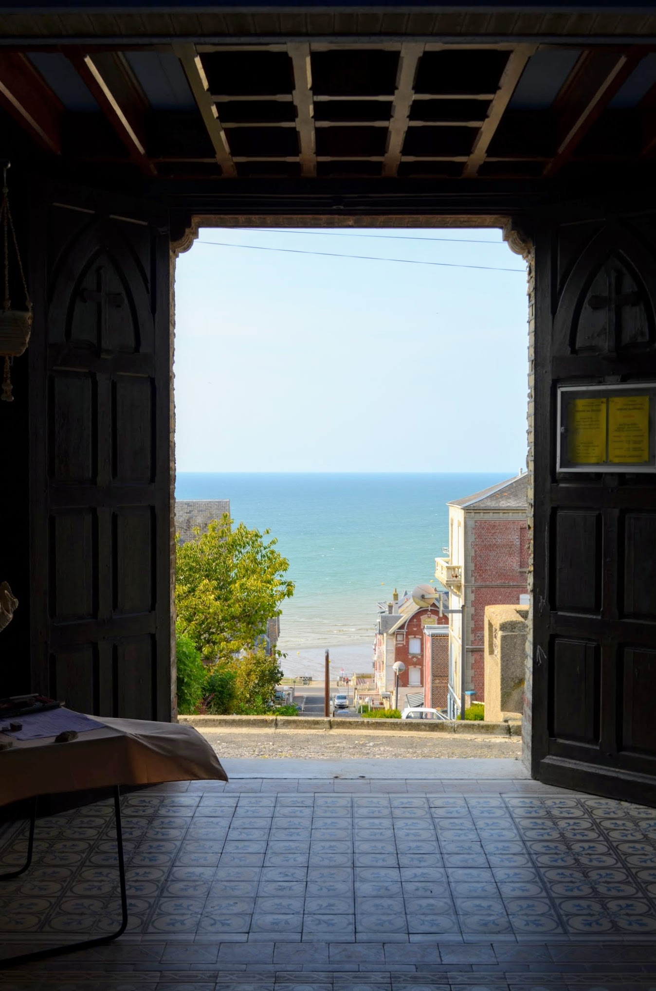 Petite église avec vue sur la mer. La rue en contrebas (avenue du Casino) est bordée de belles maisons anciennes.
