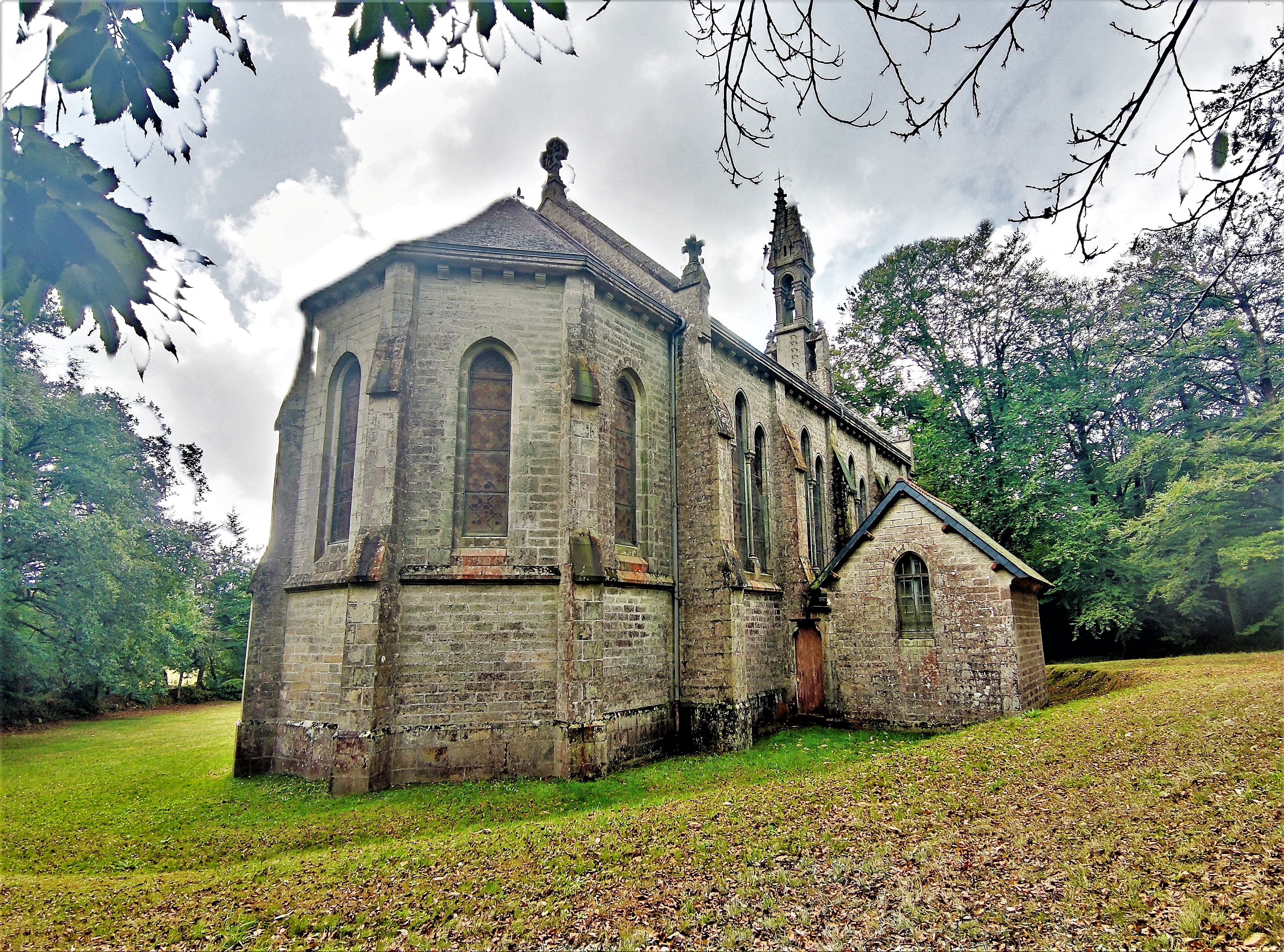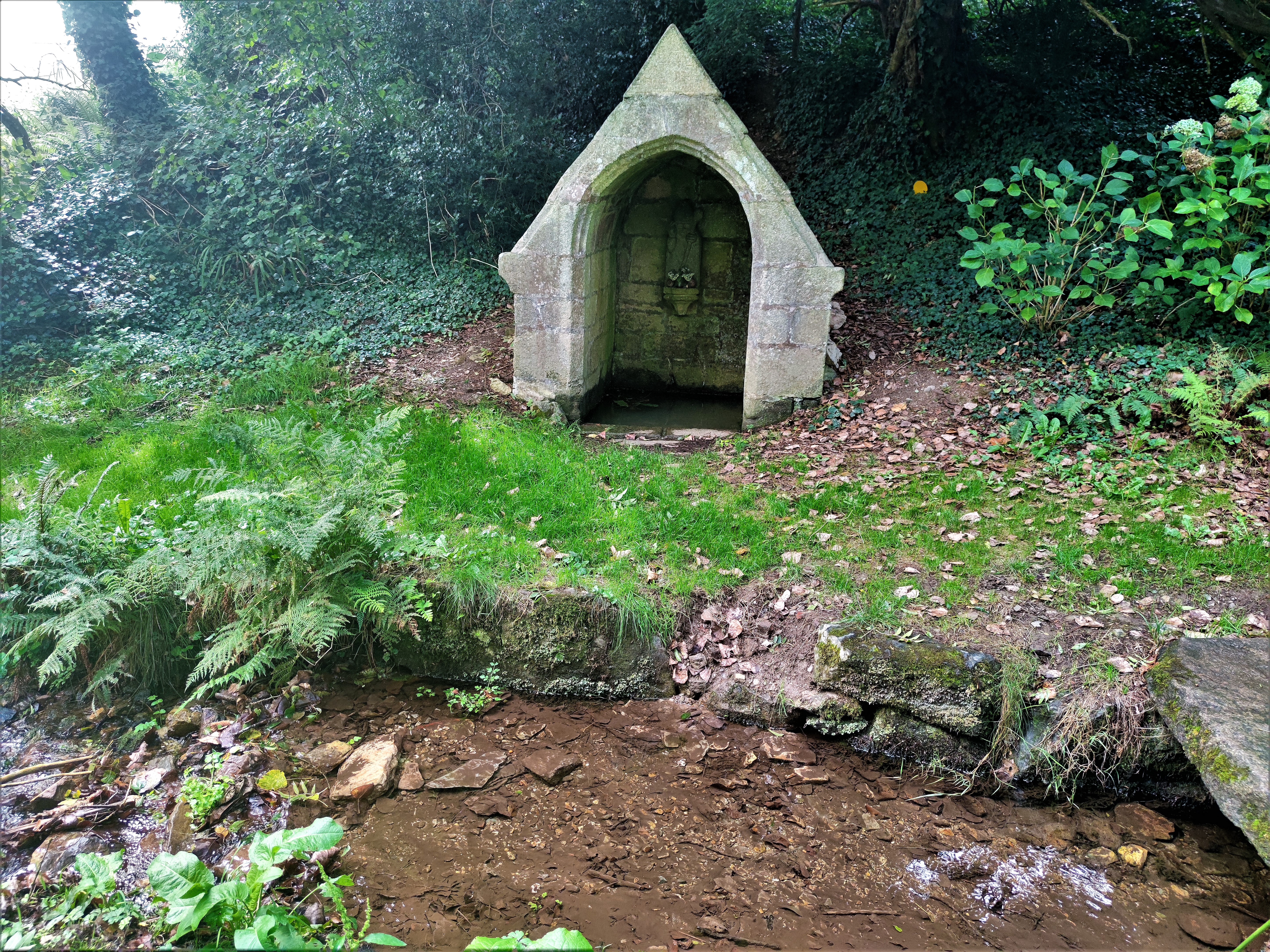 La chapelle est au centre d'un espace de verdure, entourée d'arbres. Un ruisseau passe à côté ou se trouve la fontaine Saint Corentin. Un lieu authentique, dans le calme absolu ou se trouve cette imposante chapelle mise en lumière par le soleil dans l'après midi.