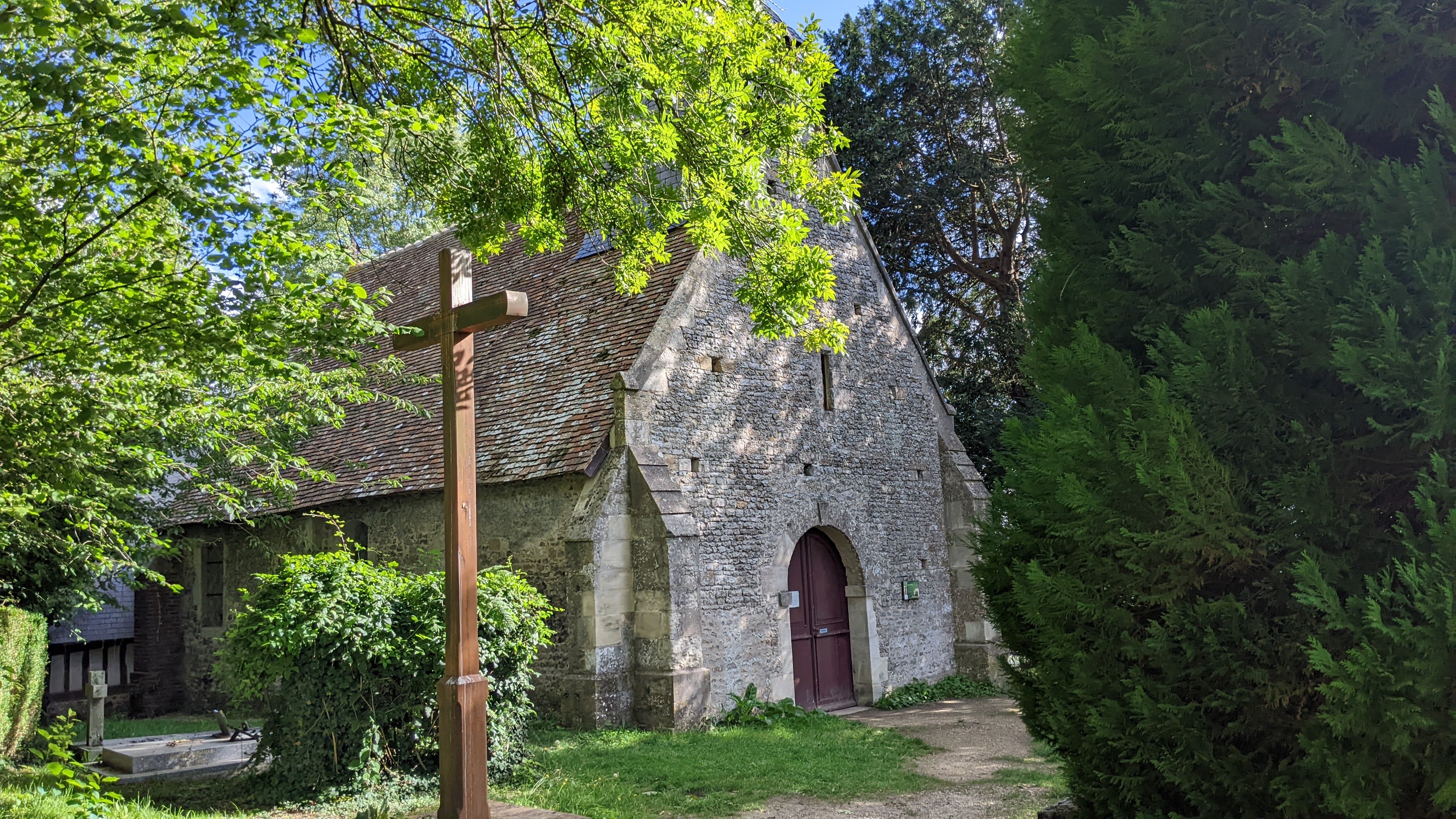 Petite église rurale mignonne au milieu des bois que sur plombe la vallée de l’Auge