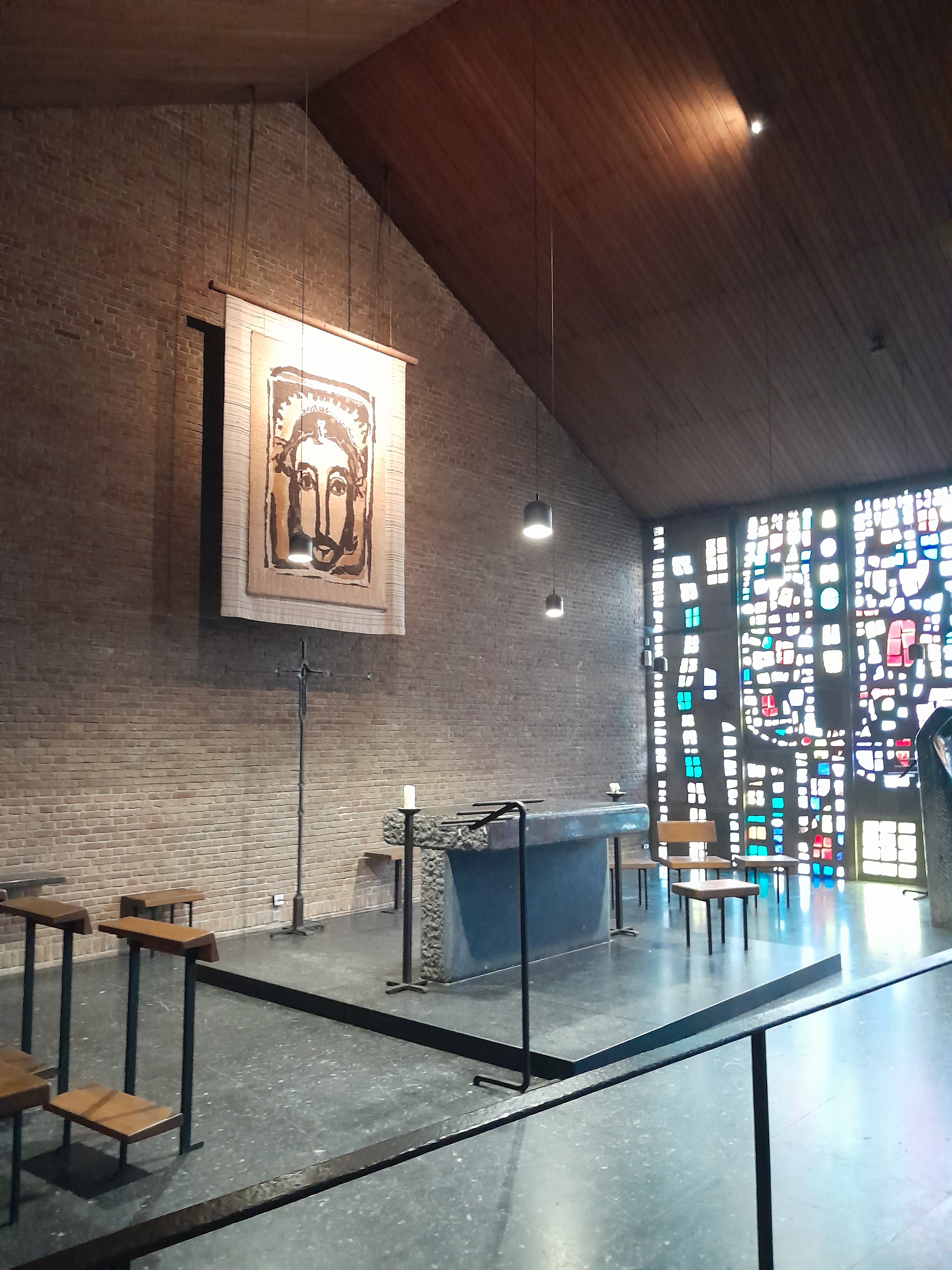 Magnifique architecture d'Hermann Baur, tapisserie d'après Rouault, vitraux de Manessier, mobilier liturgique de Dodeigne