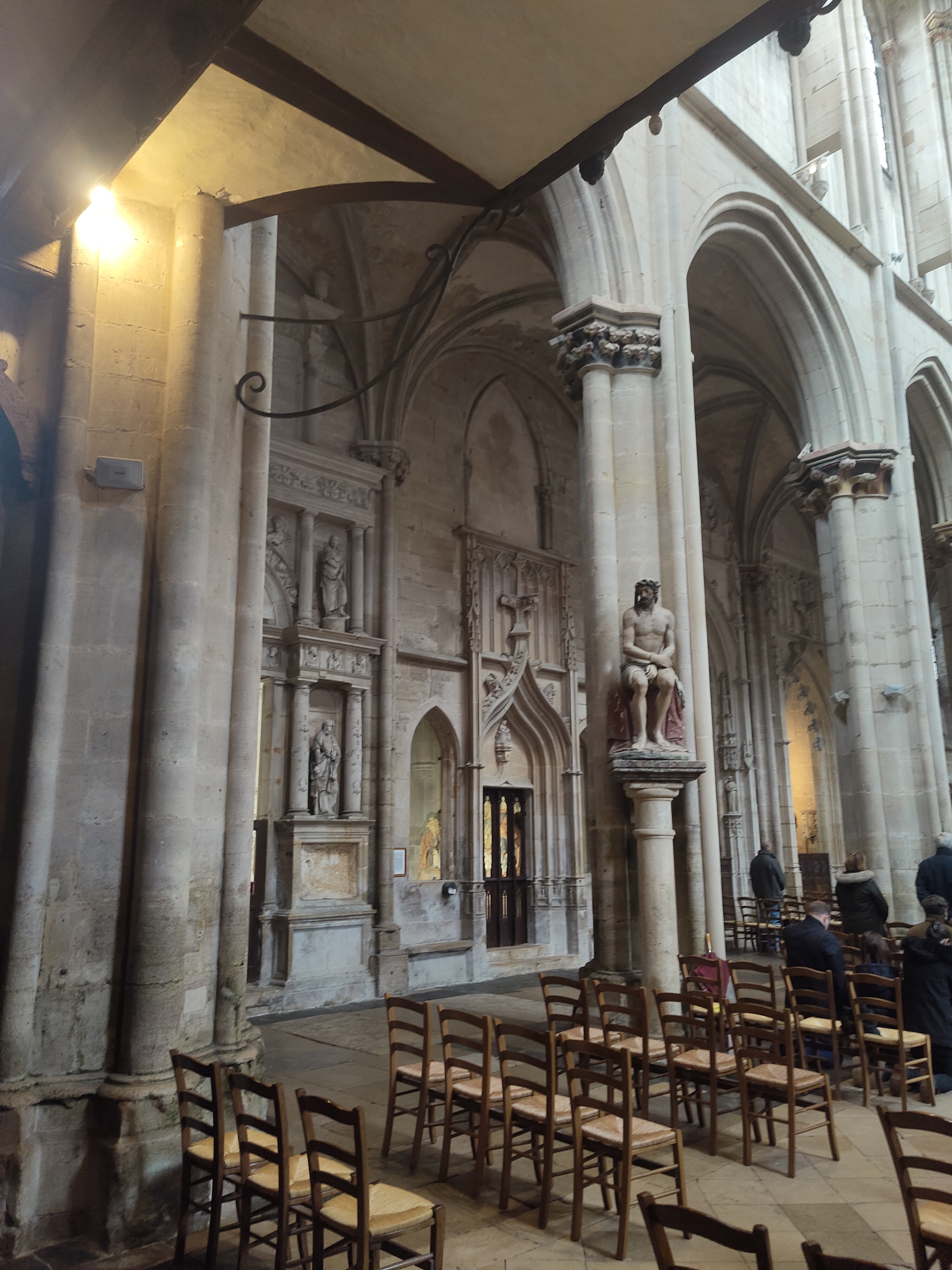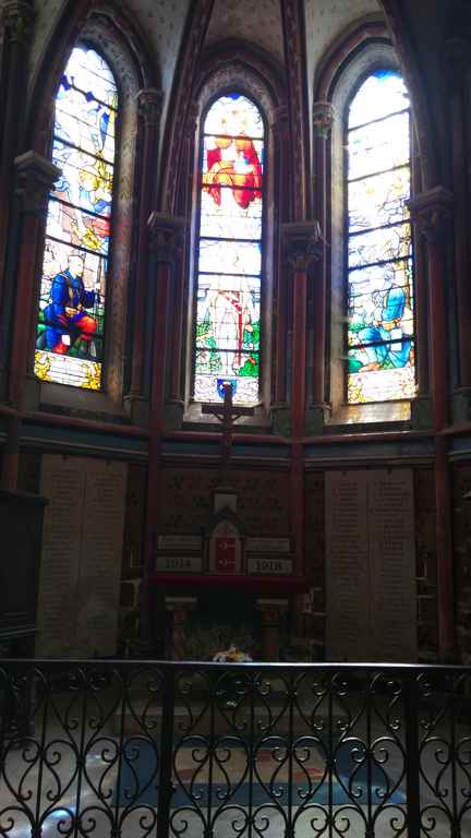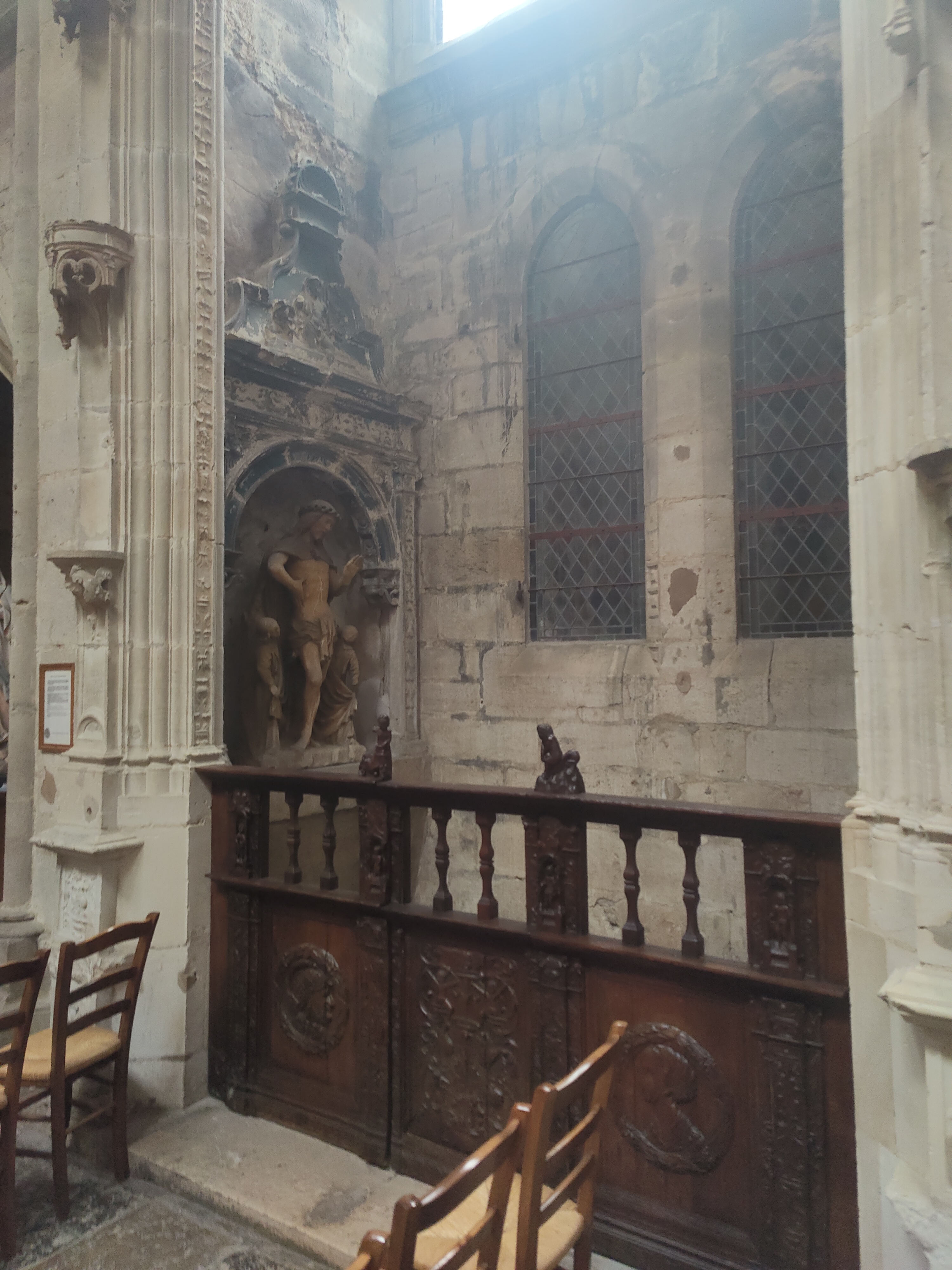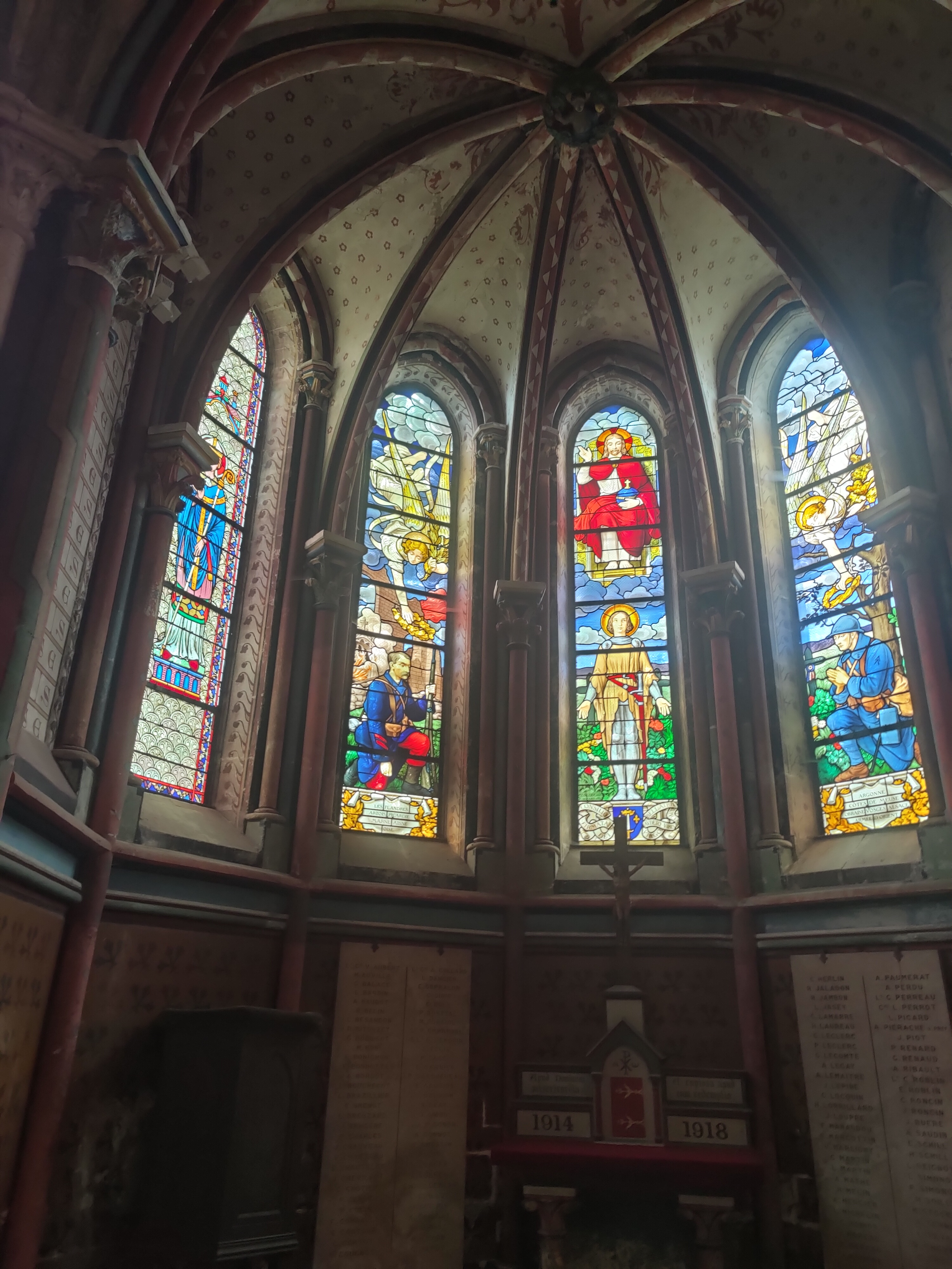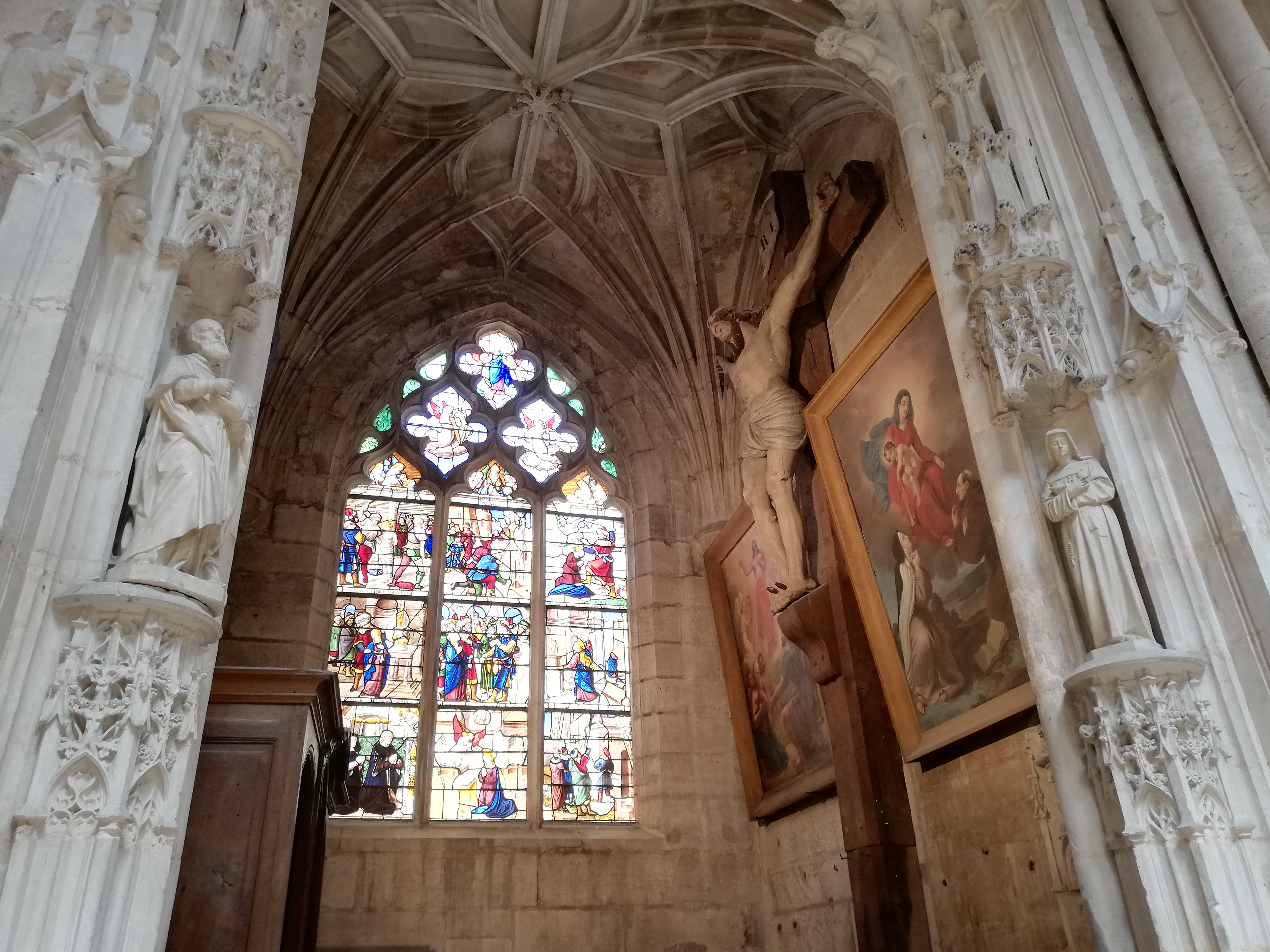 Très intéressant ! Quelques vitraux très anciens représentant les métiers, de magnifiques sculptures et éléments de décor, des grilles de toute beauté et une descente de croix polychrome, grandeur nature, absolument remarquable