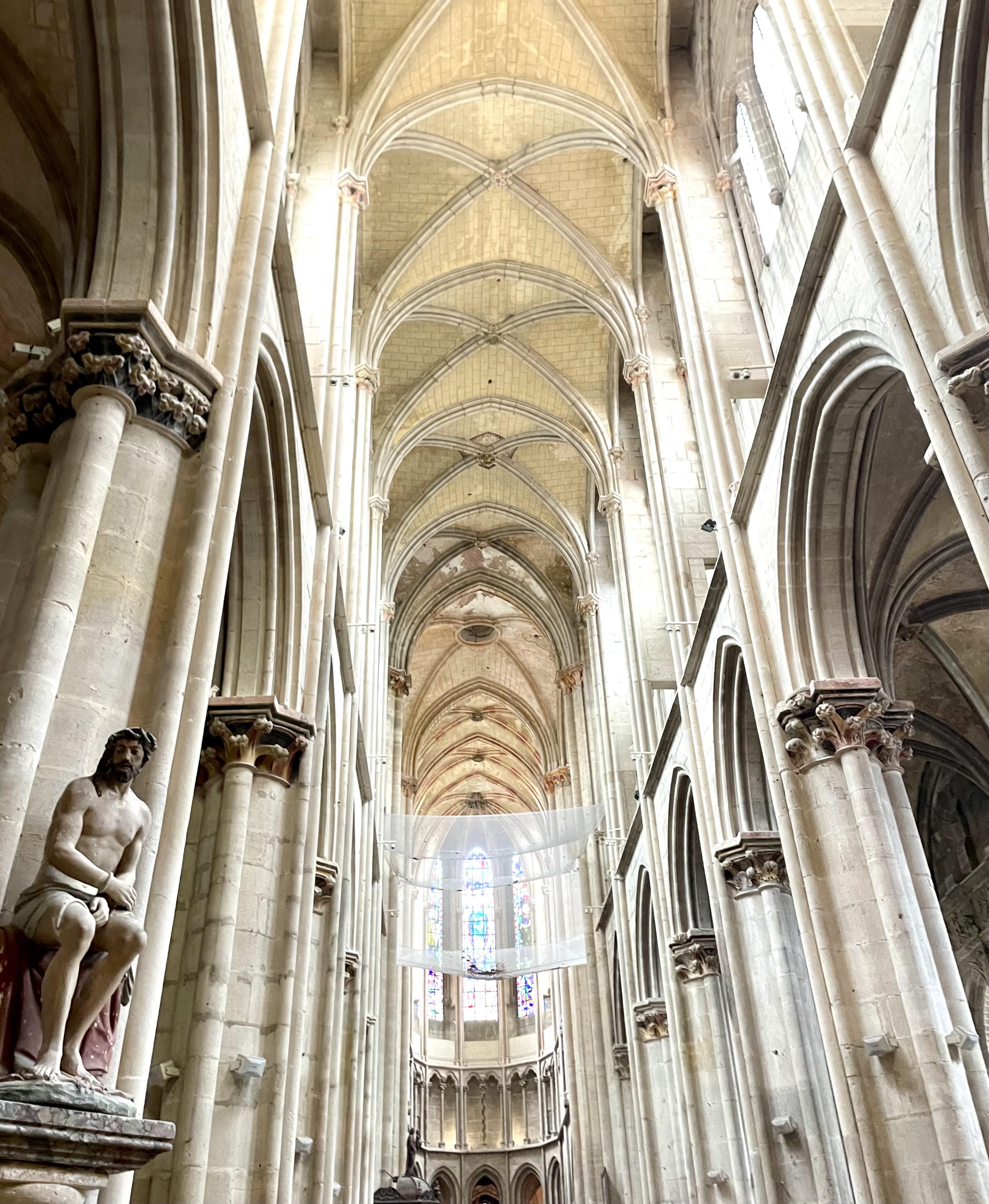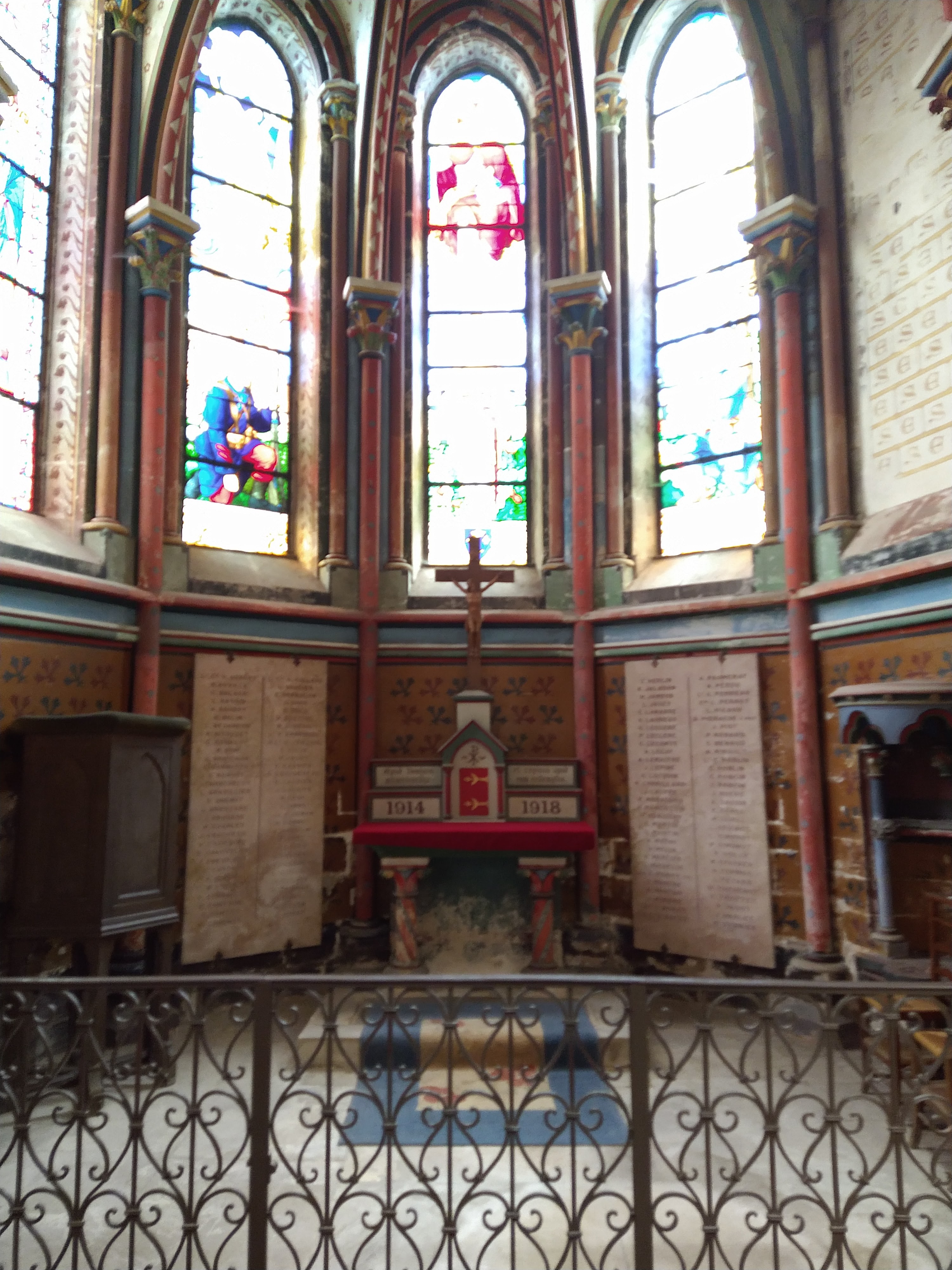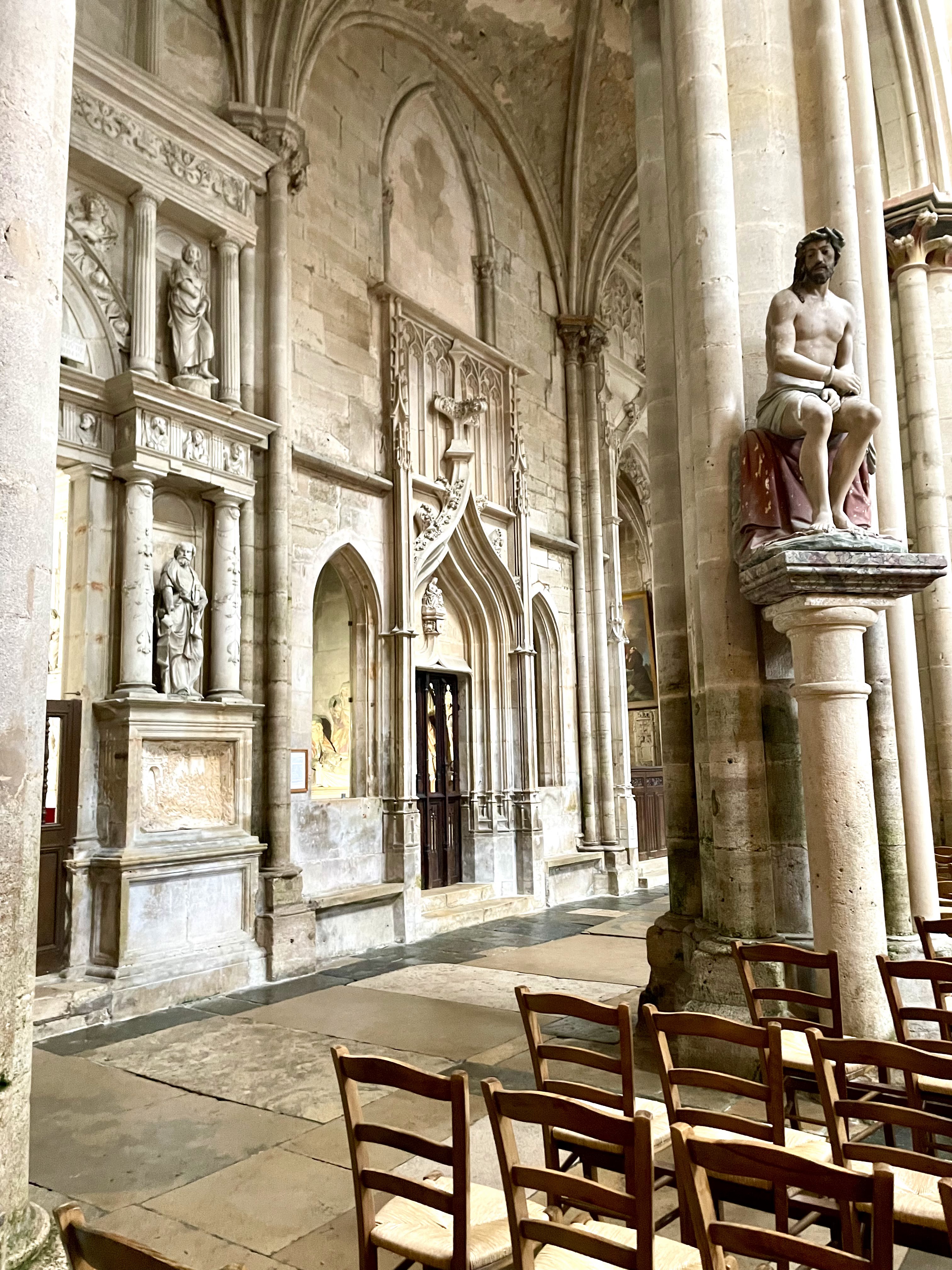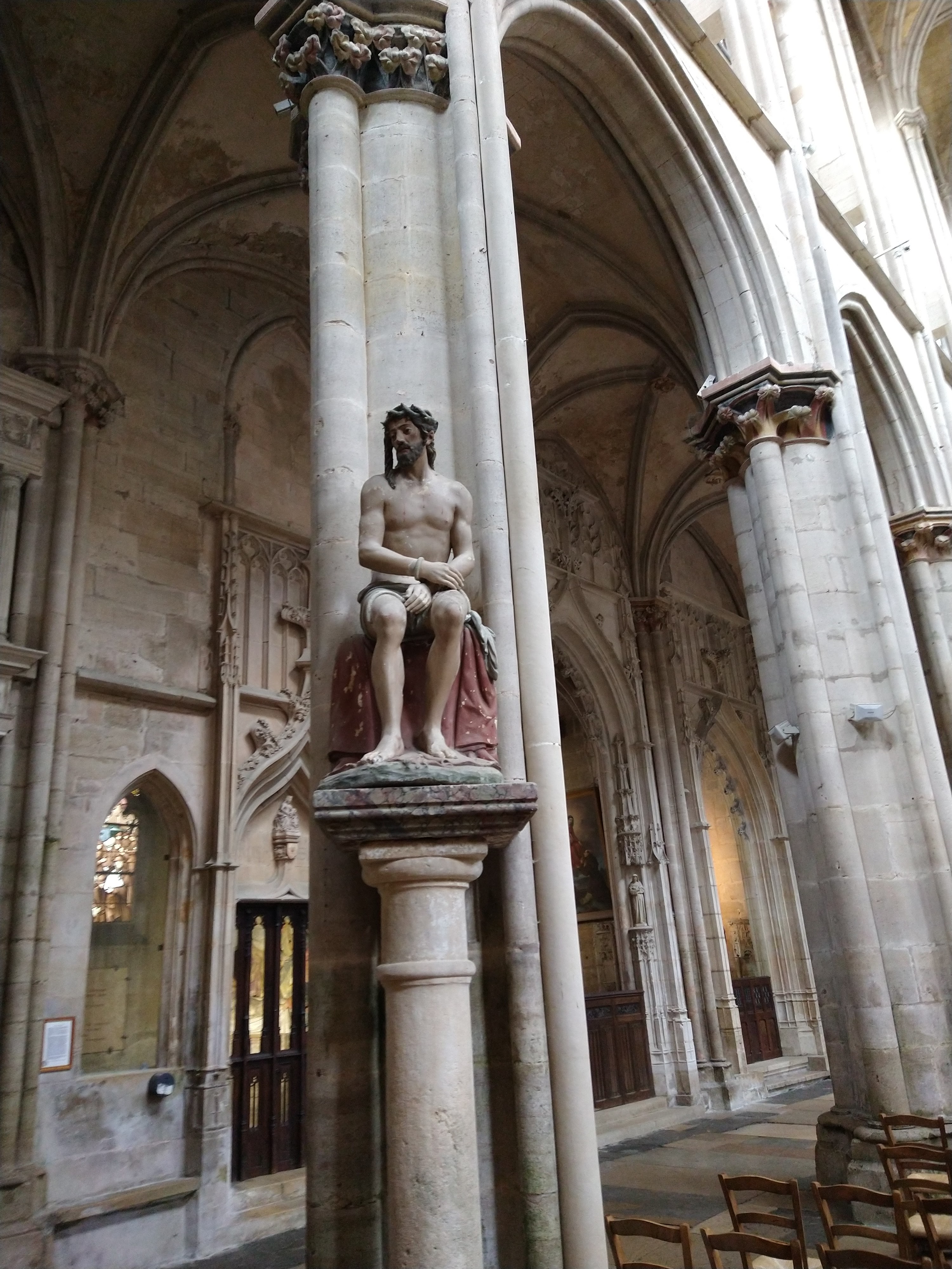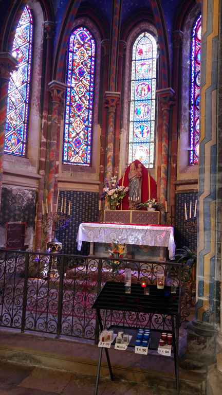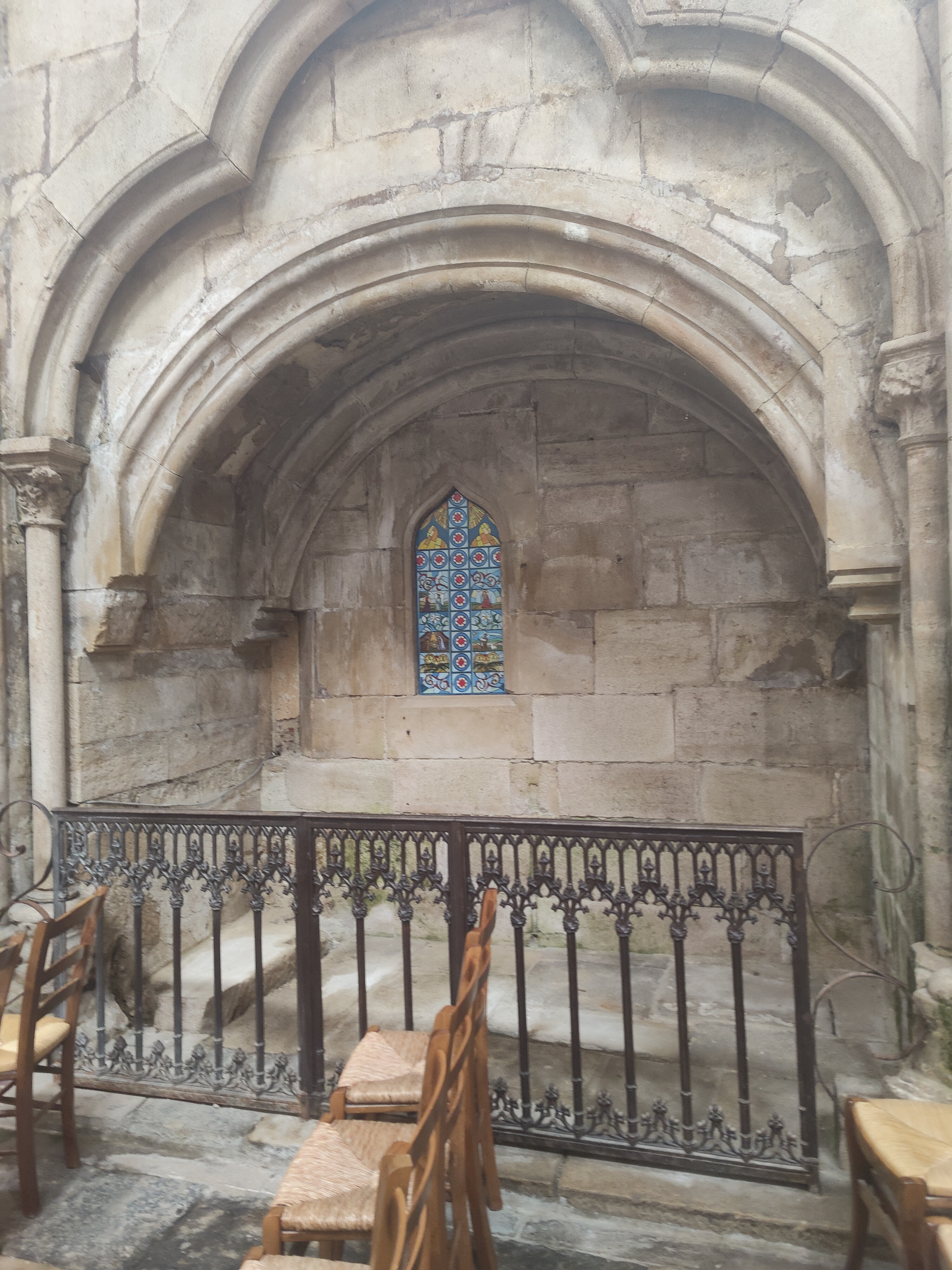 Très intéressant ! Quelques vitraux très anciens représentant les métiers, de magnifiques sculptures et éléments de décor, des grilles de toute beauté et une descente de croix polychrome, grandeur nature, absolument remarquable