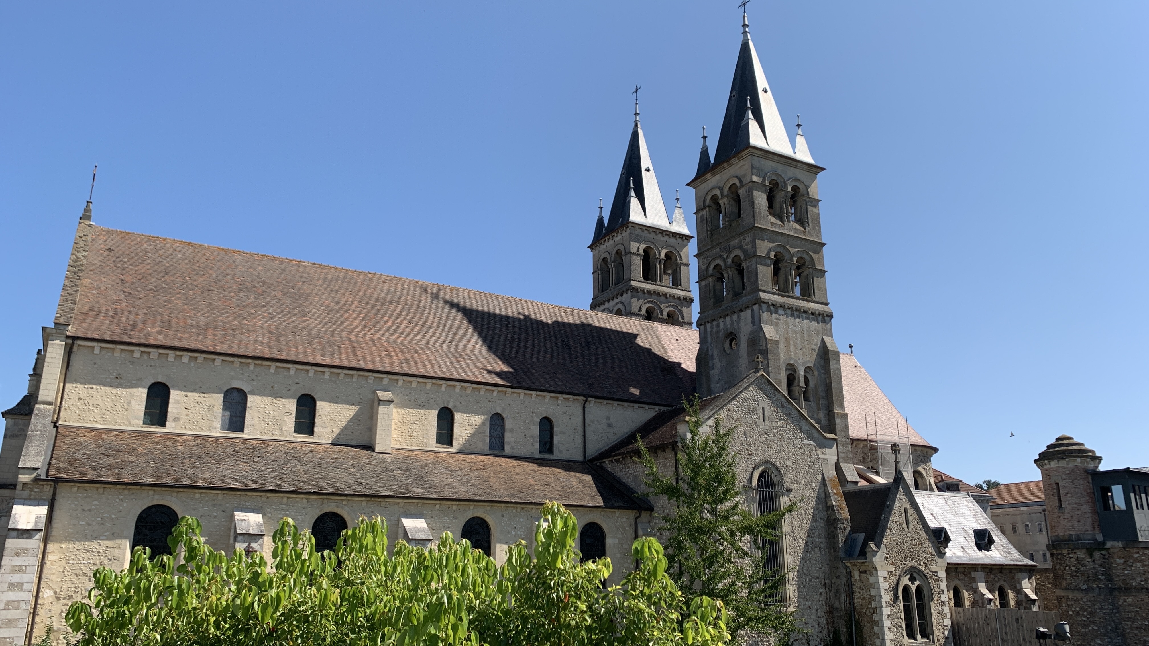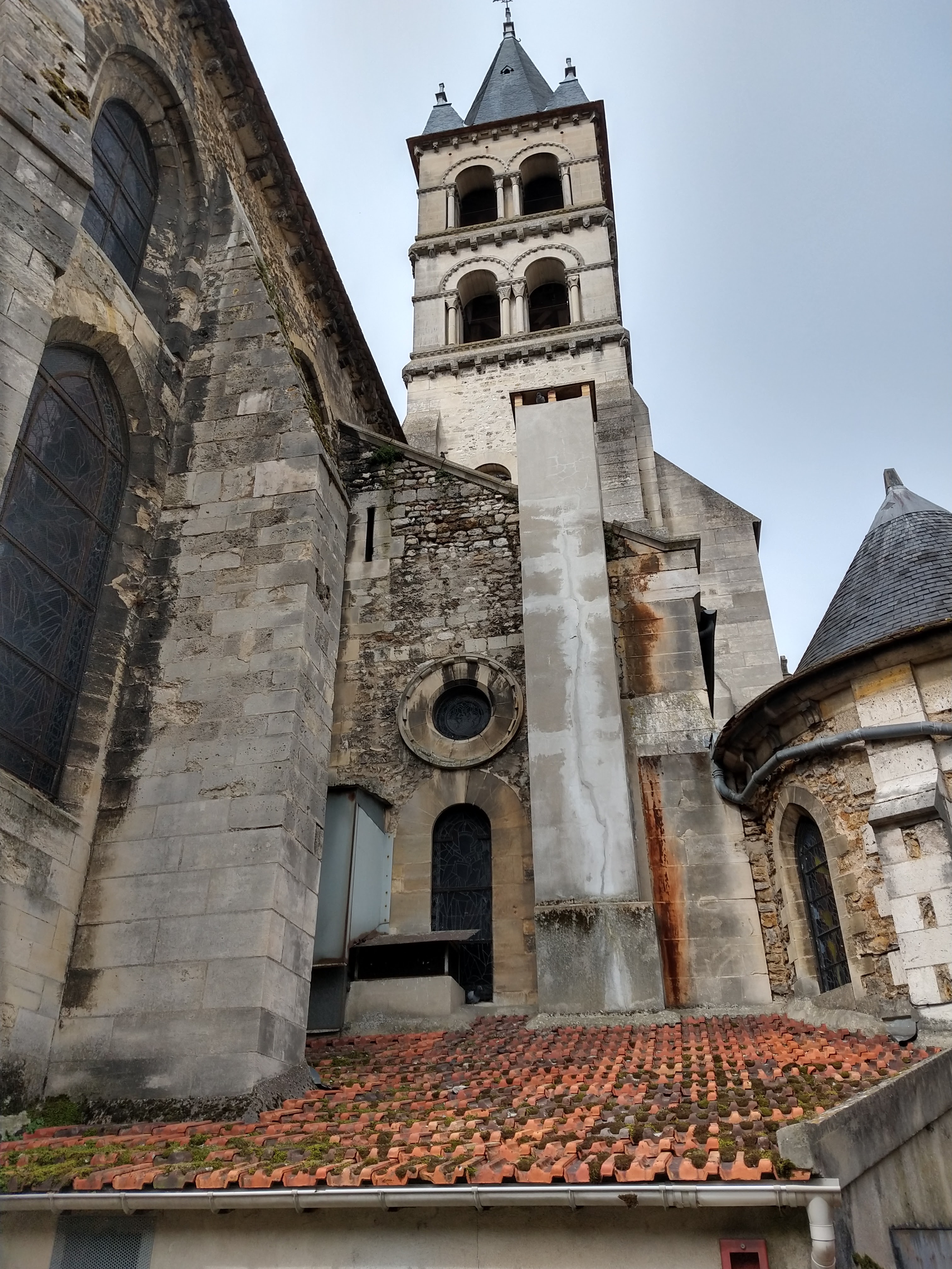 Belle église du 11ème siècle située sur l’île Saint-Etienne à Melun (les grands bâtiments qui se trouvent derrière constituent le centre de détention/prison de Melun).