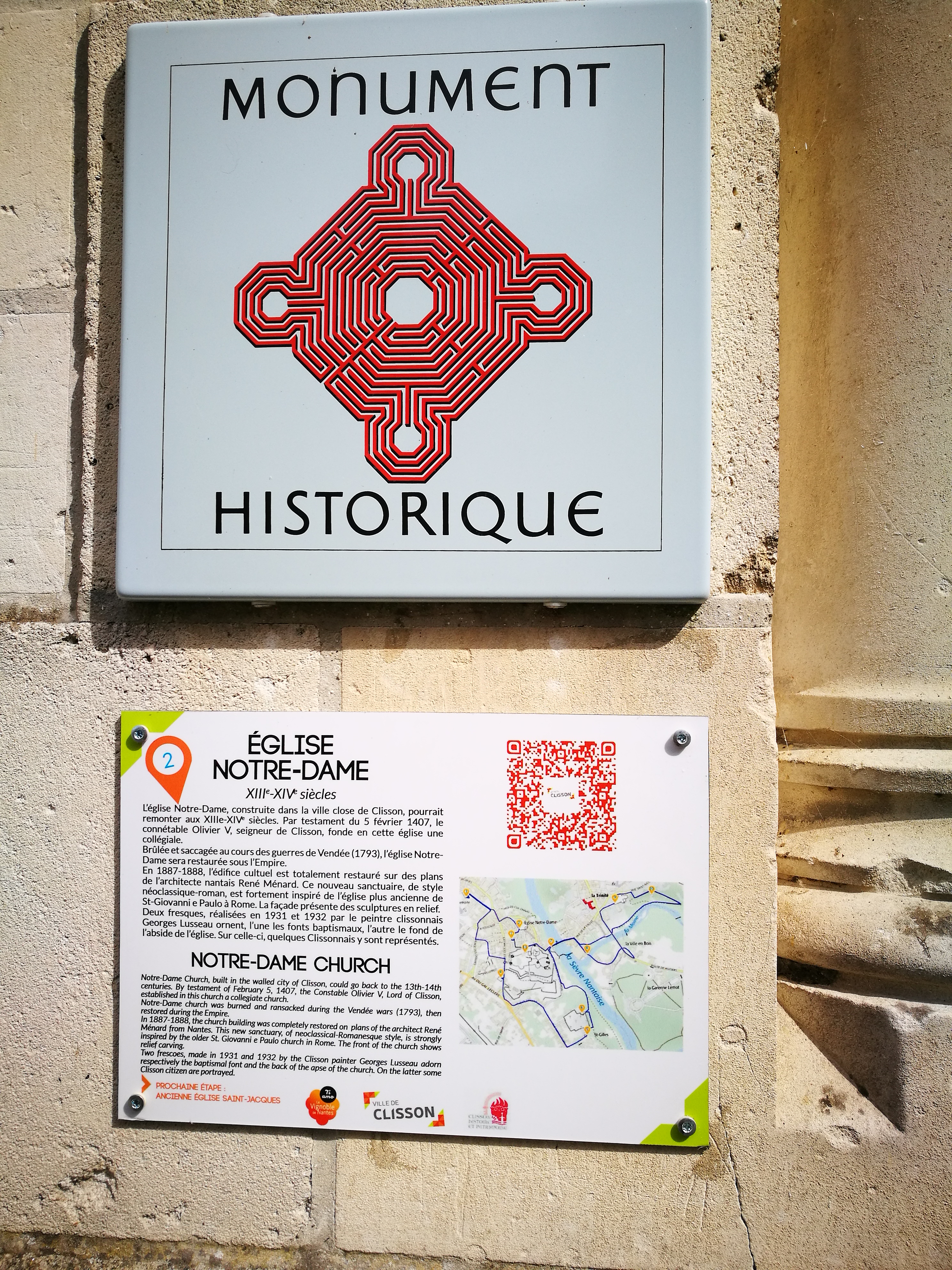 Église construite après la révolution de style italien (toscane) comme la ville de Clisson. Beaux vitraux. A voir, le décor peint au fond du choeur. L'autre église (la Trinité ) du 12 ème siècle est fermée pour un certain temps (Travaux)