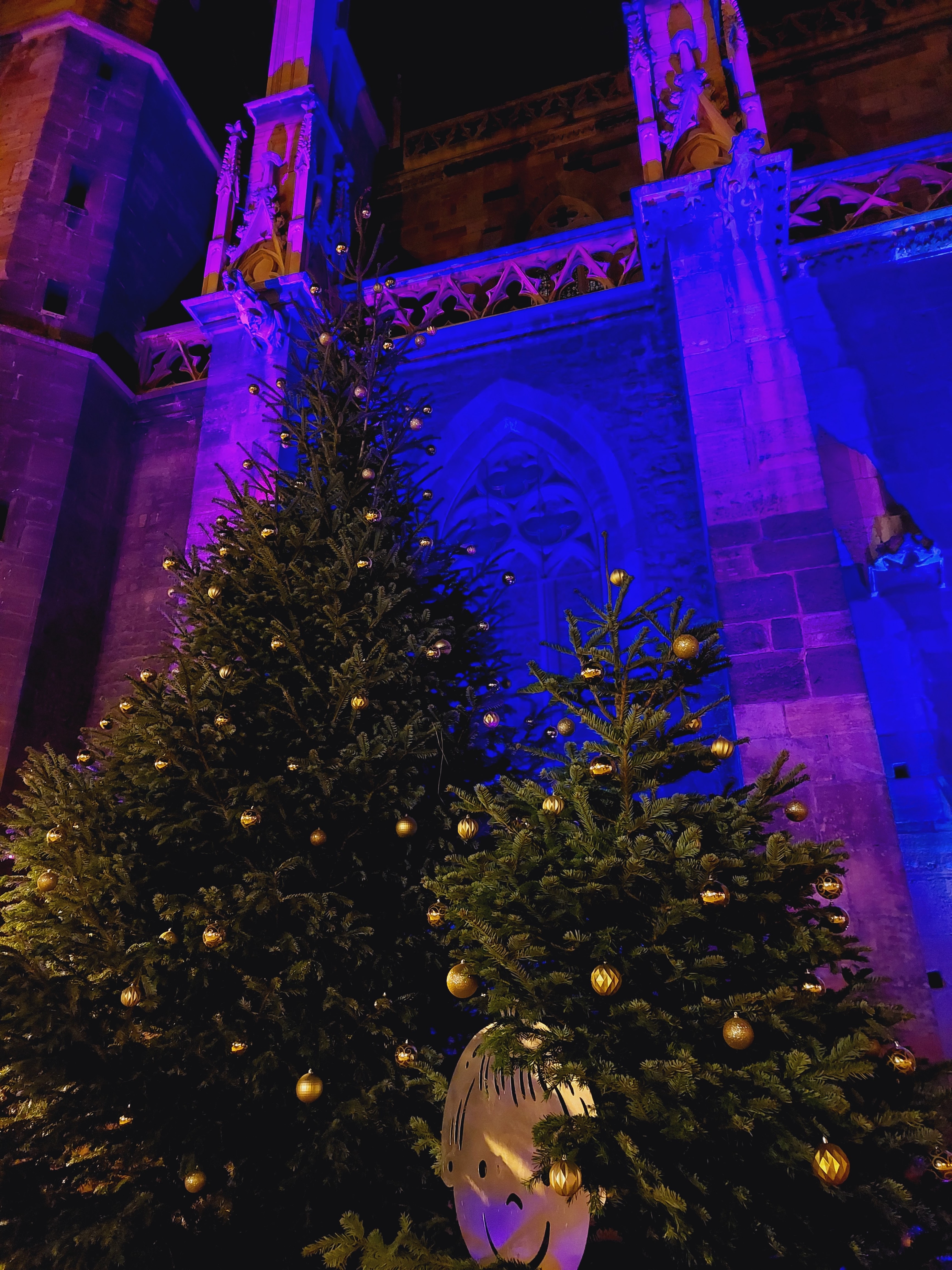 La cathédrale est visible de partout. Pendant le marché de Noël, tout autour regorge d'étals de Noël.
