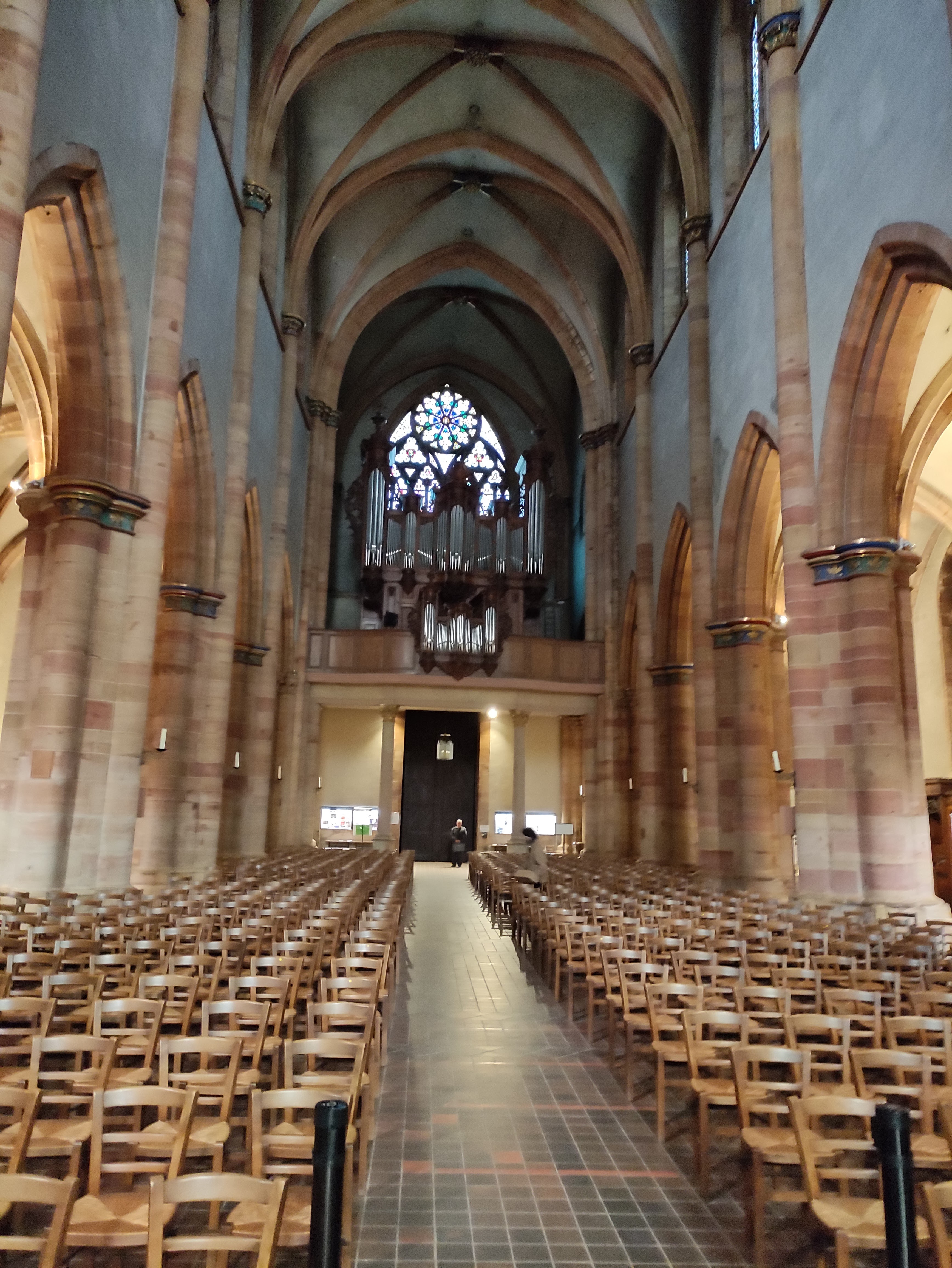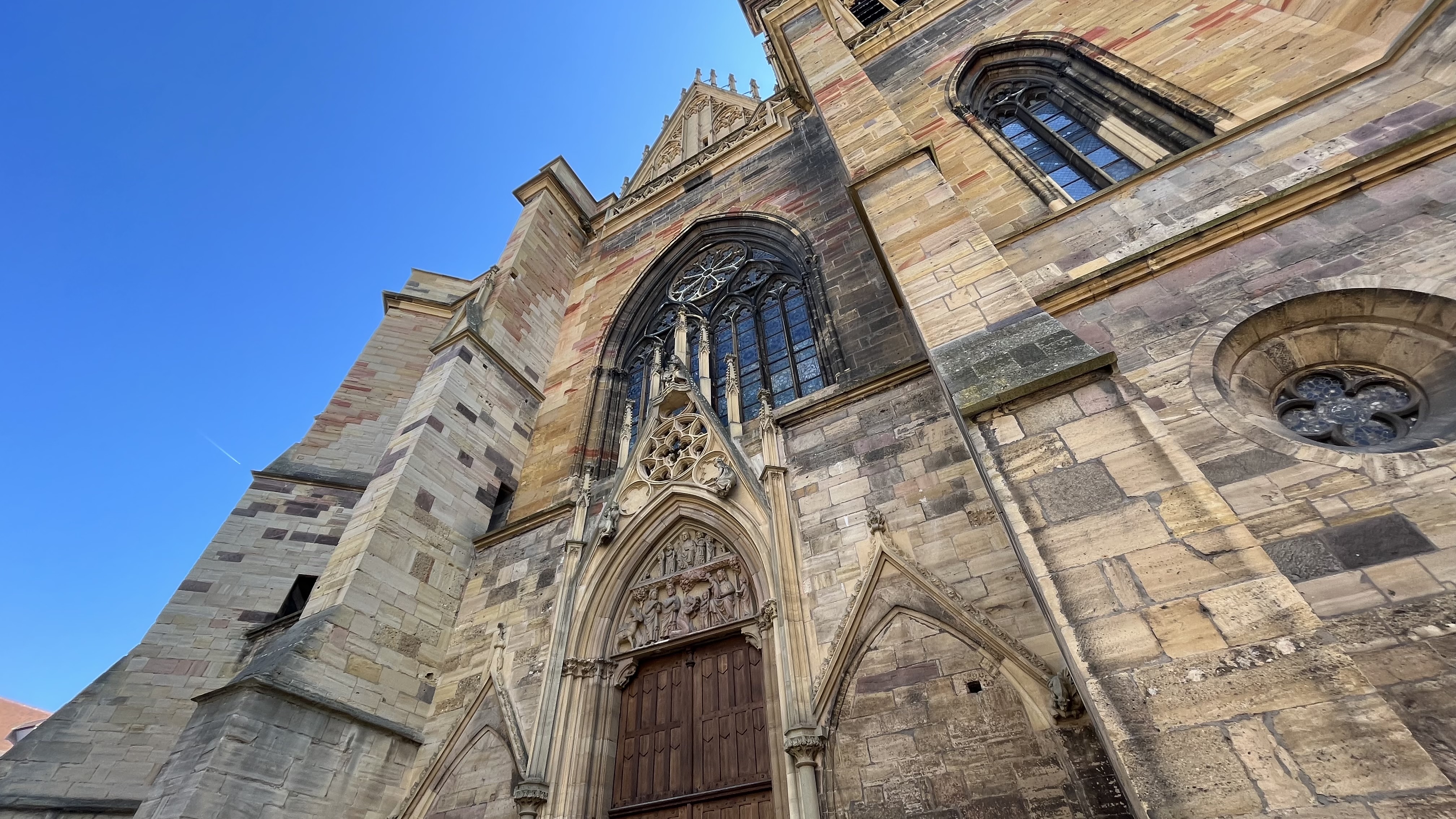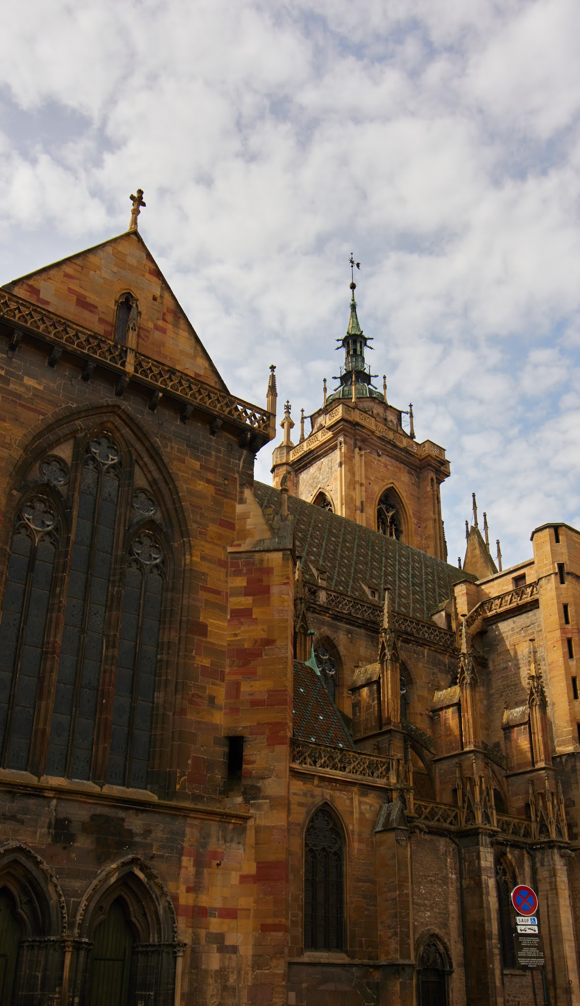 Cette ancienne Cathédrale est bâtie avec des parements en grès ... jaunes typique de la région de Rouffach où se trouvaient la carrière du Strangenberg. La construction débutée en 1235 ne fut jamais terminée d'où l'absence d'une seconde tour. Cet édifice religieux de style gothique est le second plus grand d'Alsace après la Cathédrale de Strasbourg et son clocher culmine à 71 mètres. On notera la présence d'une gargouille dite de la Judensau rare témoignage en Alsace de l'antisémitisme religieux du Moyen Age, autre temps autres mœurs L'intérieur est particulièrement sobre et les clefs de voute culminent à plus de 20 mètres.