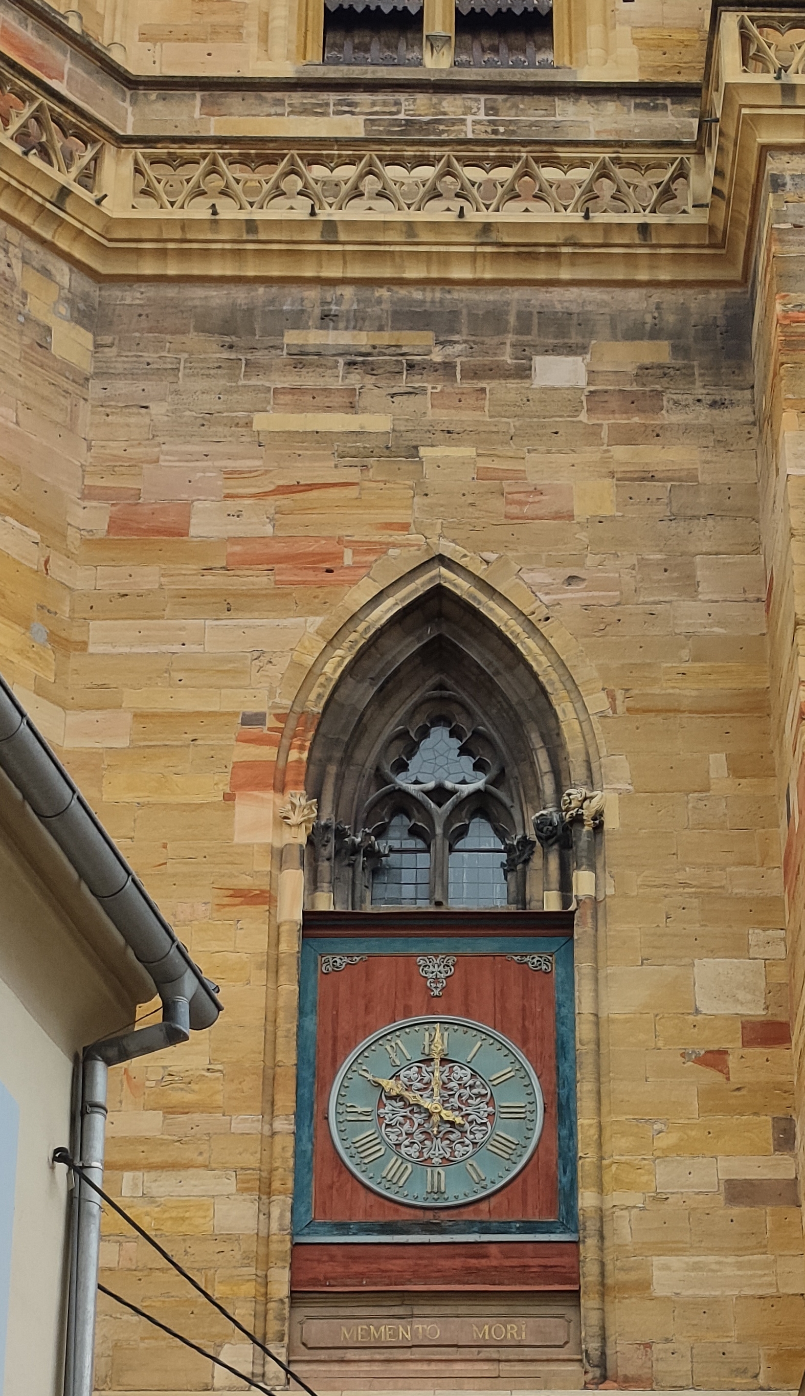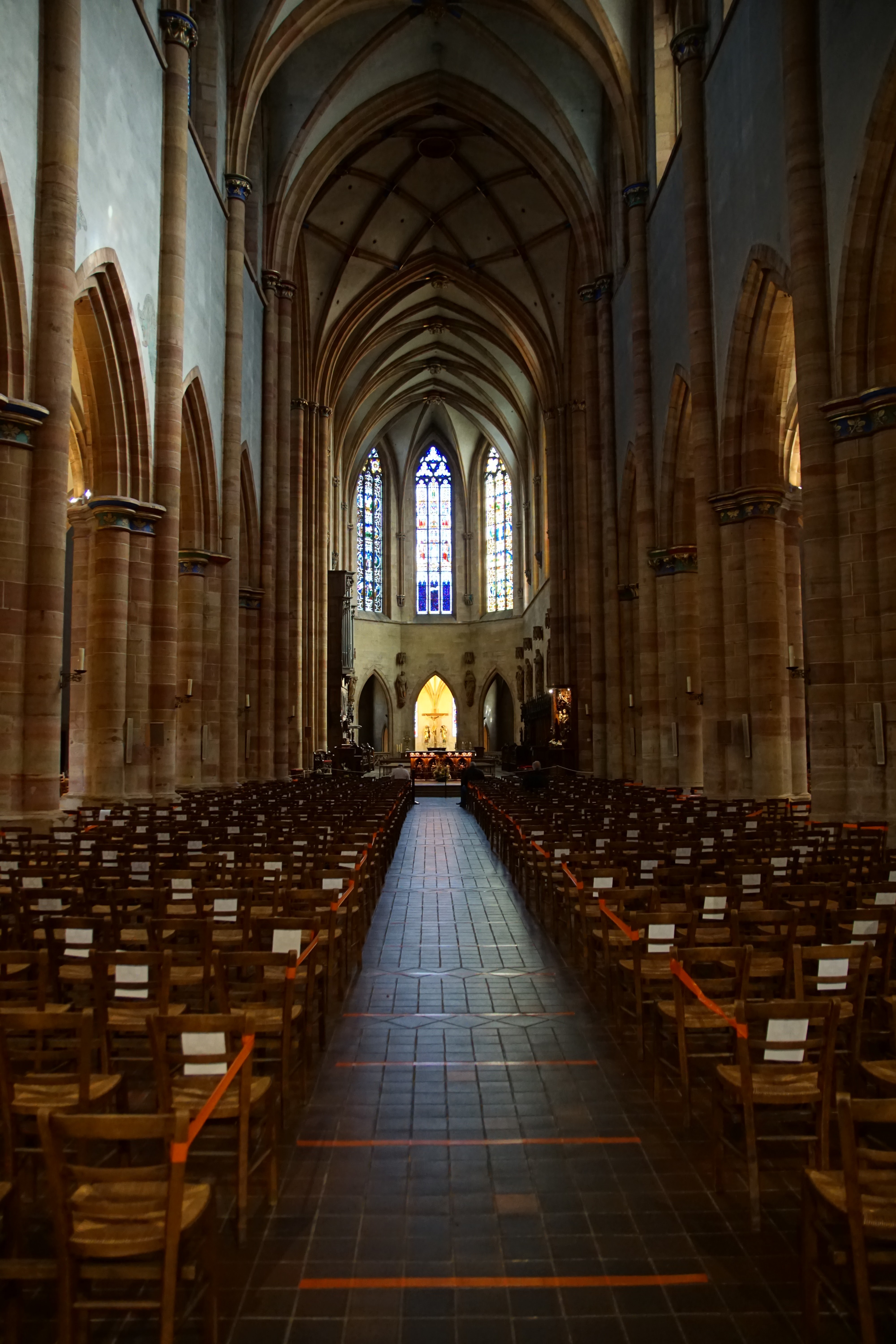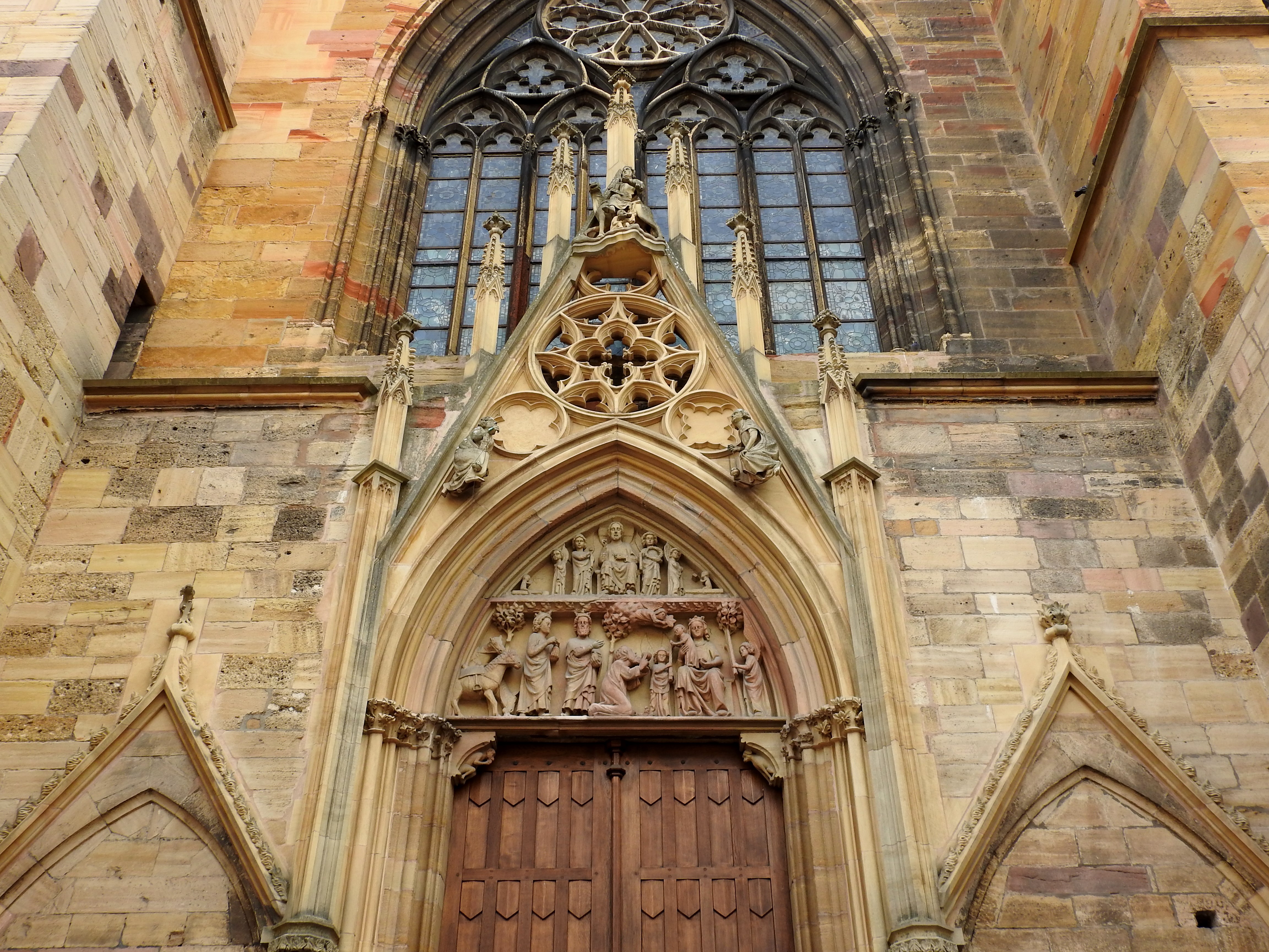 Cette ancienne Cathédrale est bâtie avec des parements en grès ... jaunes typique de la région de Rouffach où se trouvaient la carrière du Strangenberg. La construction débutée en 1235 ne fut jamais terminée d'où l'absence d'une seconde tour. Cet édifice religieux de style gothique est le second plus grand d'Alsace après la Cathédrale de Strasbourg et son clocher culmine à 71 mètres. On notera la présence d'une gargouille dite de la Judensau rare témoignage en Alsace de l'antisémitisme religieux du Moyen Age, autre temps autres mœurs L'intérieur est particulièrement sobre et les clefs de voute culminent à plus de 20 mètres.