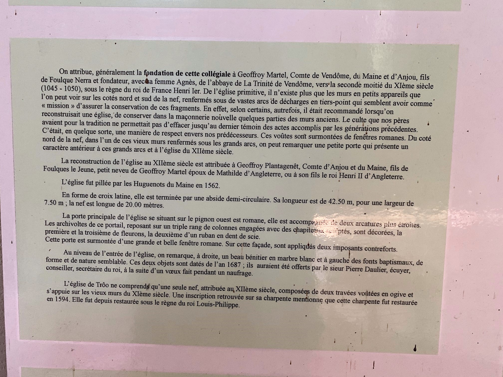 Cette église a un charme particulier, bel édifice, situé sur les hauteurs, à proximité de la motte castrale. Un premier édifice fut bâti au 11ème siècle, dont quelques éléments subsistent dans les murs de la nef. Puis viendront la pose de voûtes, diverses modifications et agrandissements, au cours des siècles. Au 18ème la foudre détruit la flèche clocher qui sera reconstruit en bâti charpenté. Cette église a un charme particulier, bel édifice, situé sur les hauteurs, à proximité de la motte castrale. Monter en haut de cette dernière, permet d'accéder à une vue panoramique sur la vallée du Loir, et de de s'offrir une vue presque plongeante sur la collégiale. Des décors sculptés, quelques peintures, des stalles, des vitraux sont à découvrir. J'ai particulièrement apprécié les chapiteaux et une sculpture de Saint-martin et un mendiant du 17ème siècle.