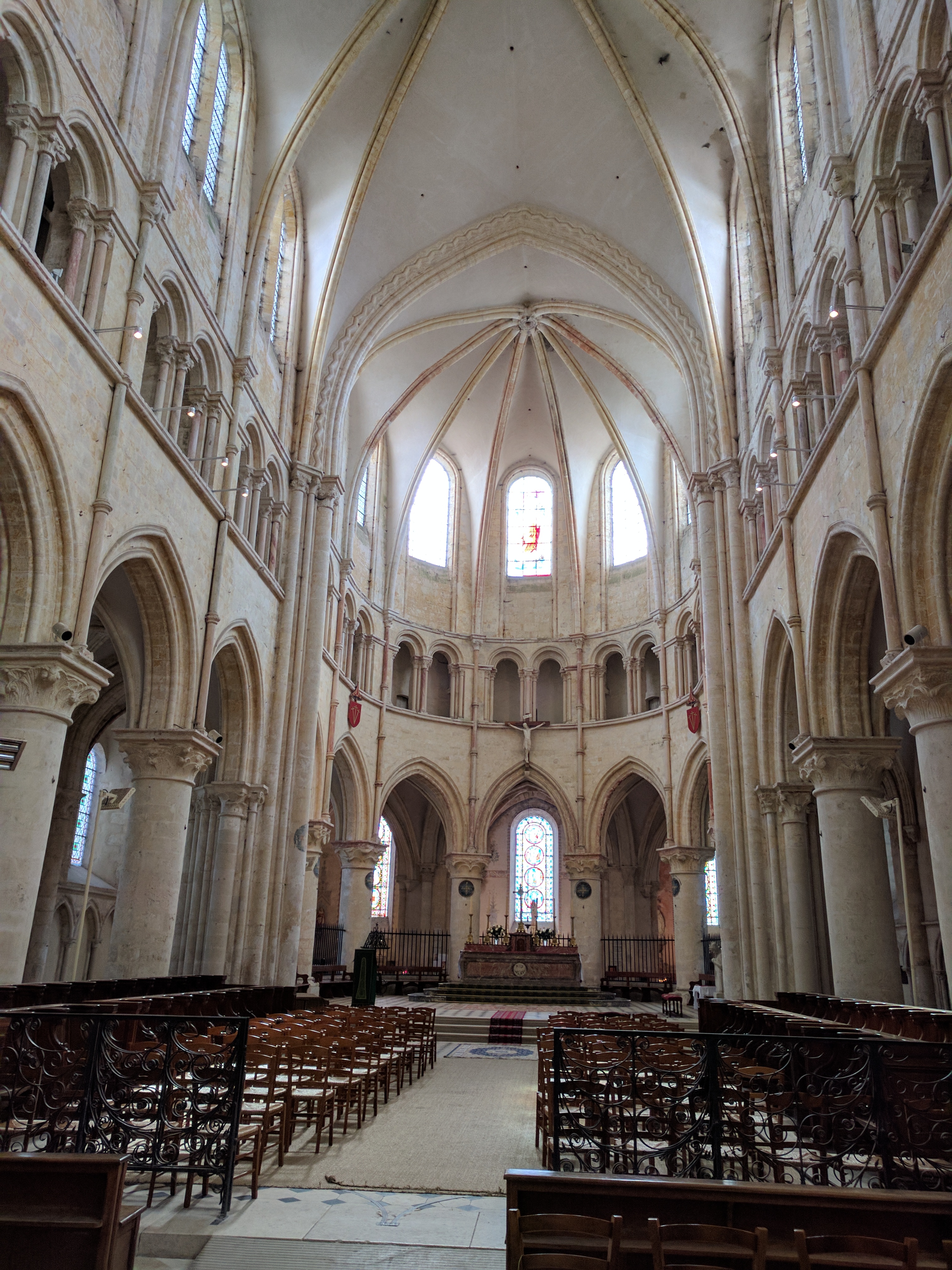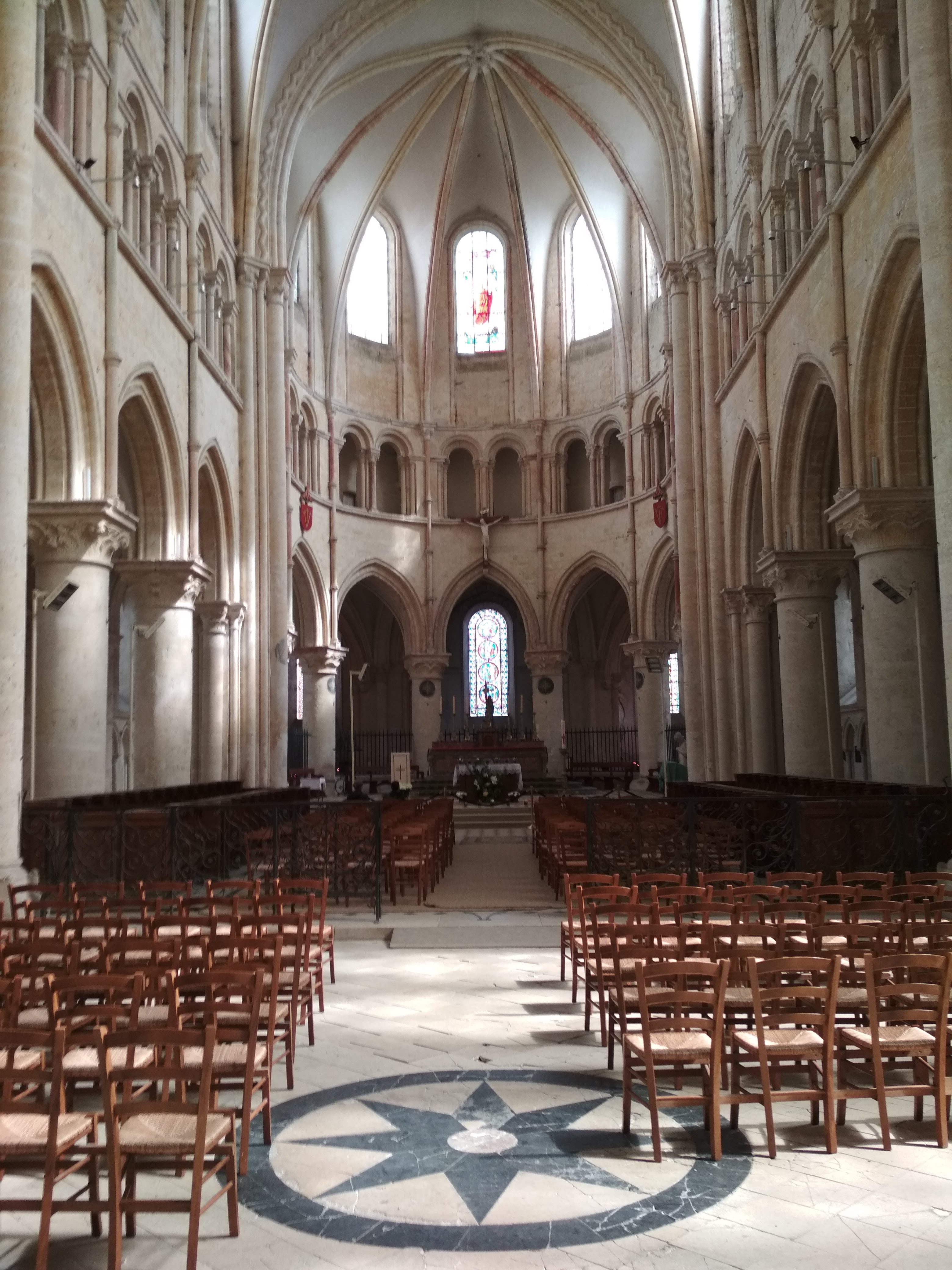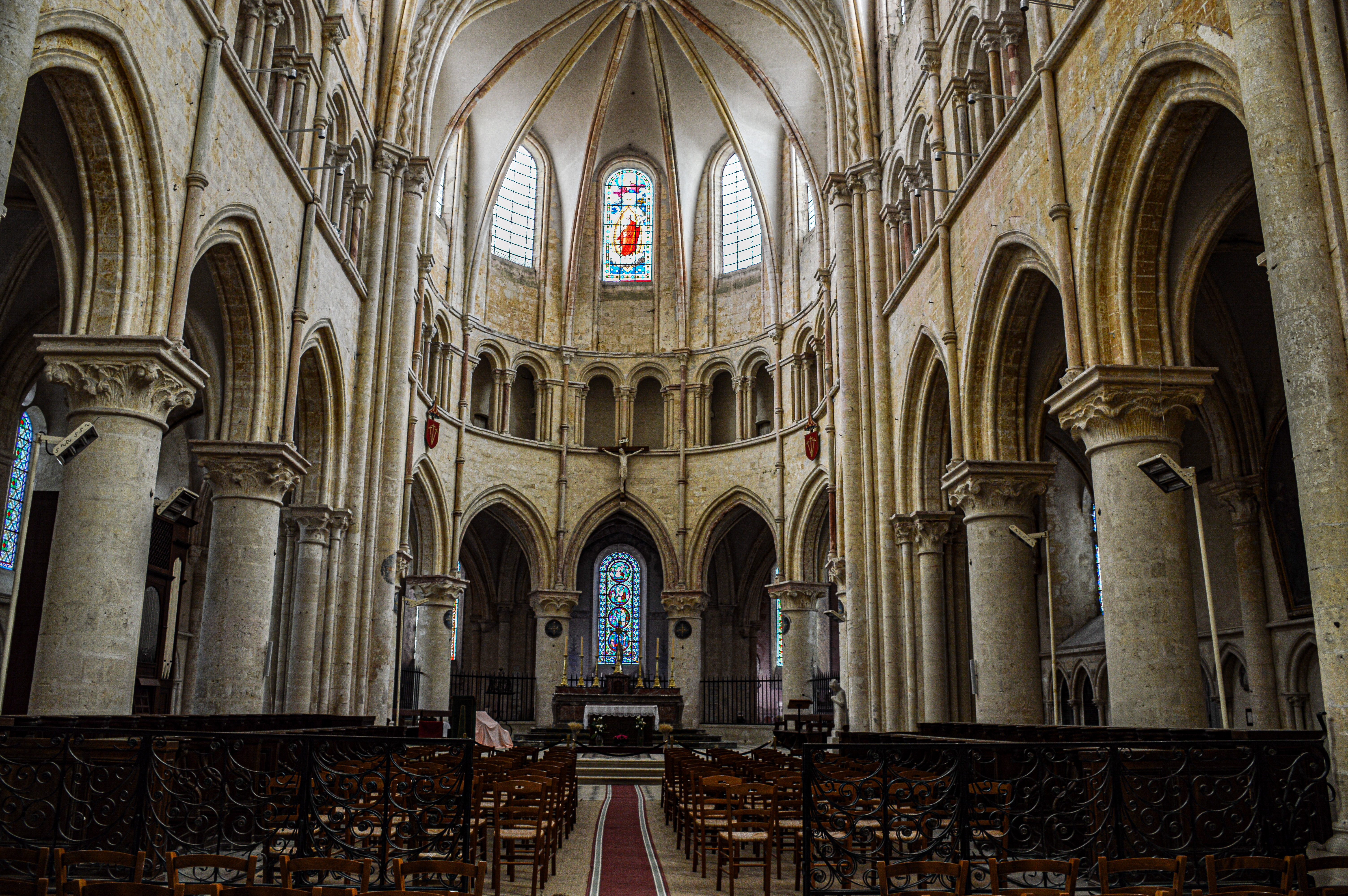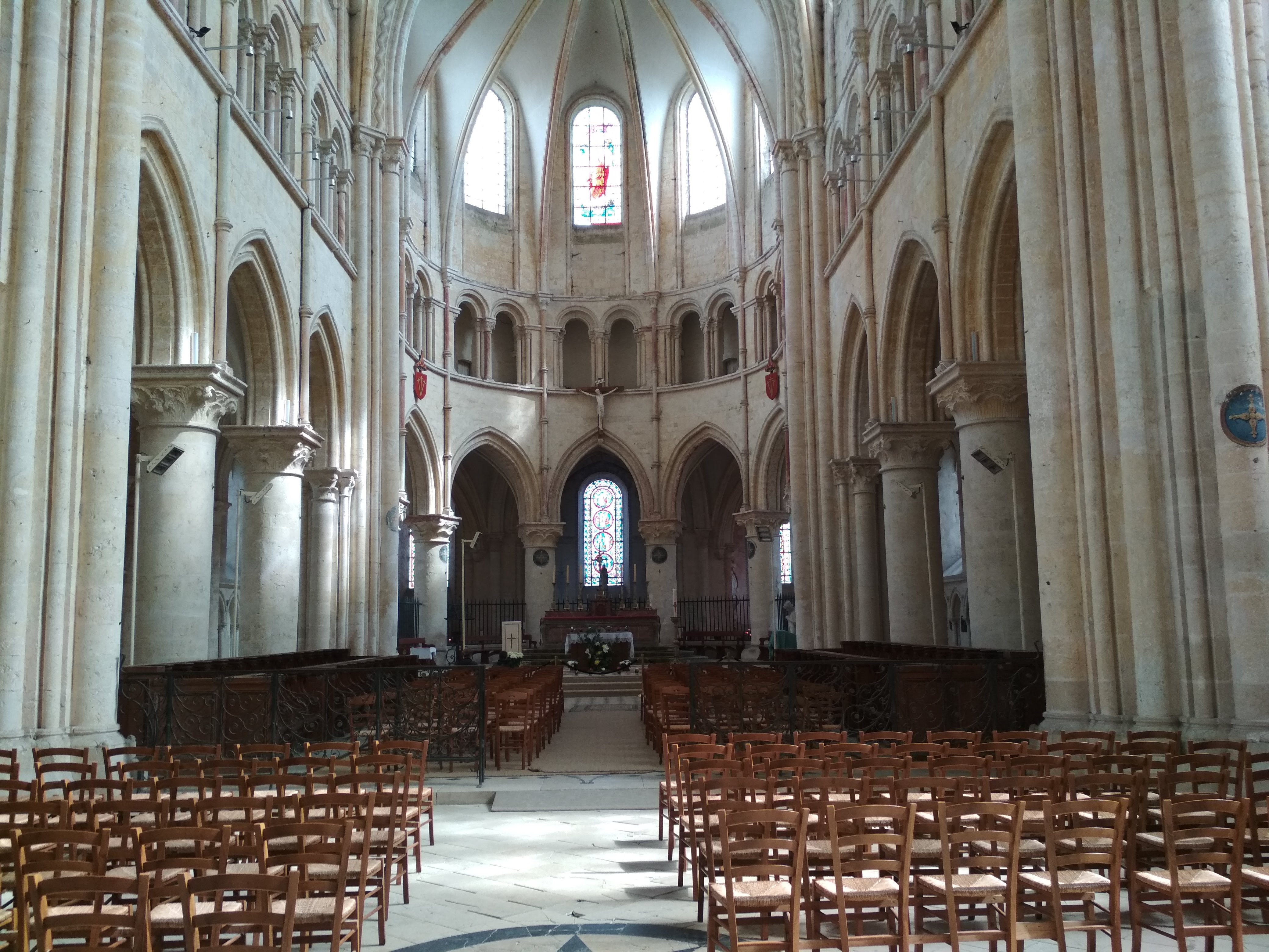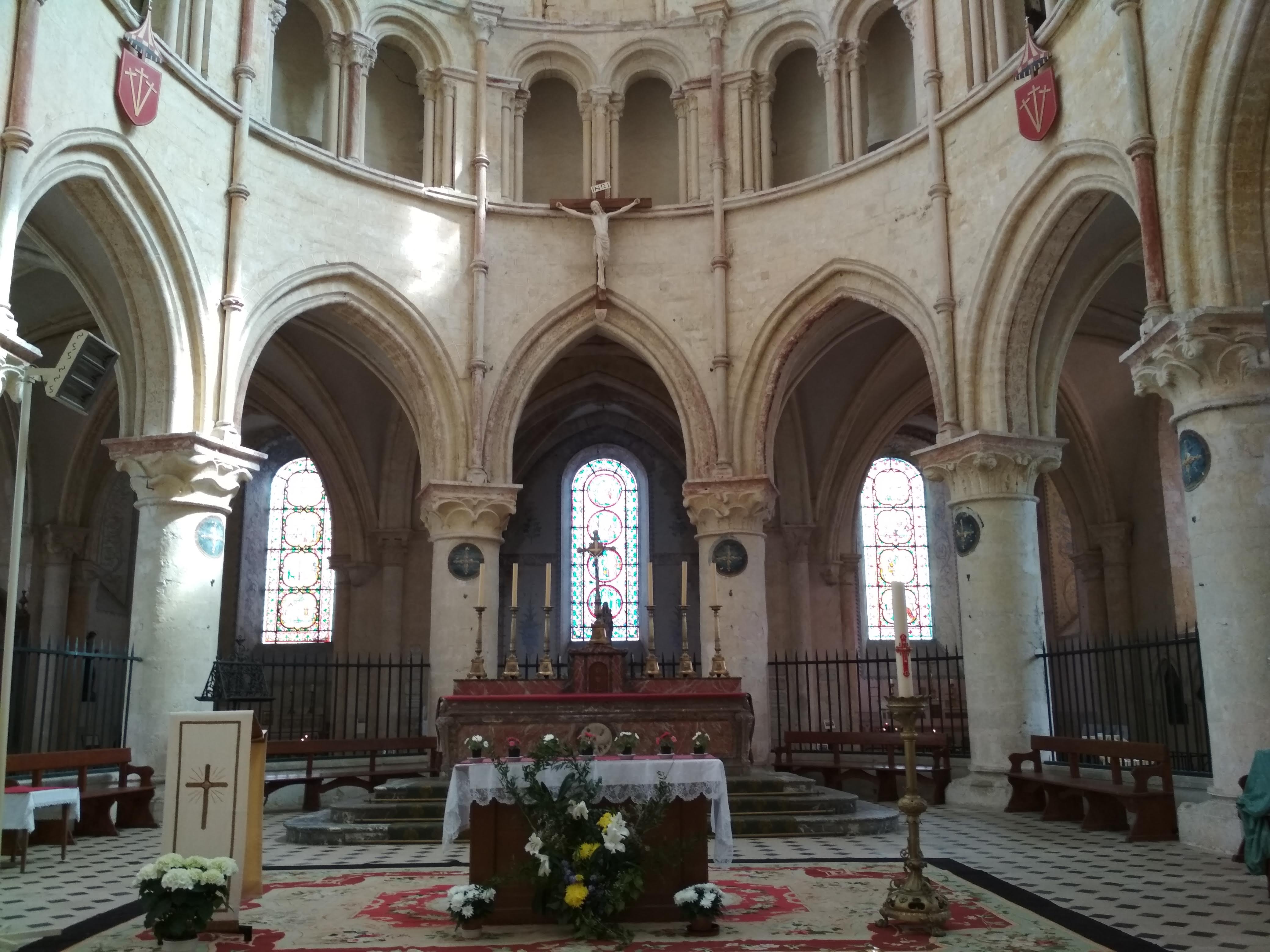 Église massive qui fait face à la Tour César. Quelques beaux vitraux et colonnades
