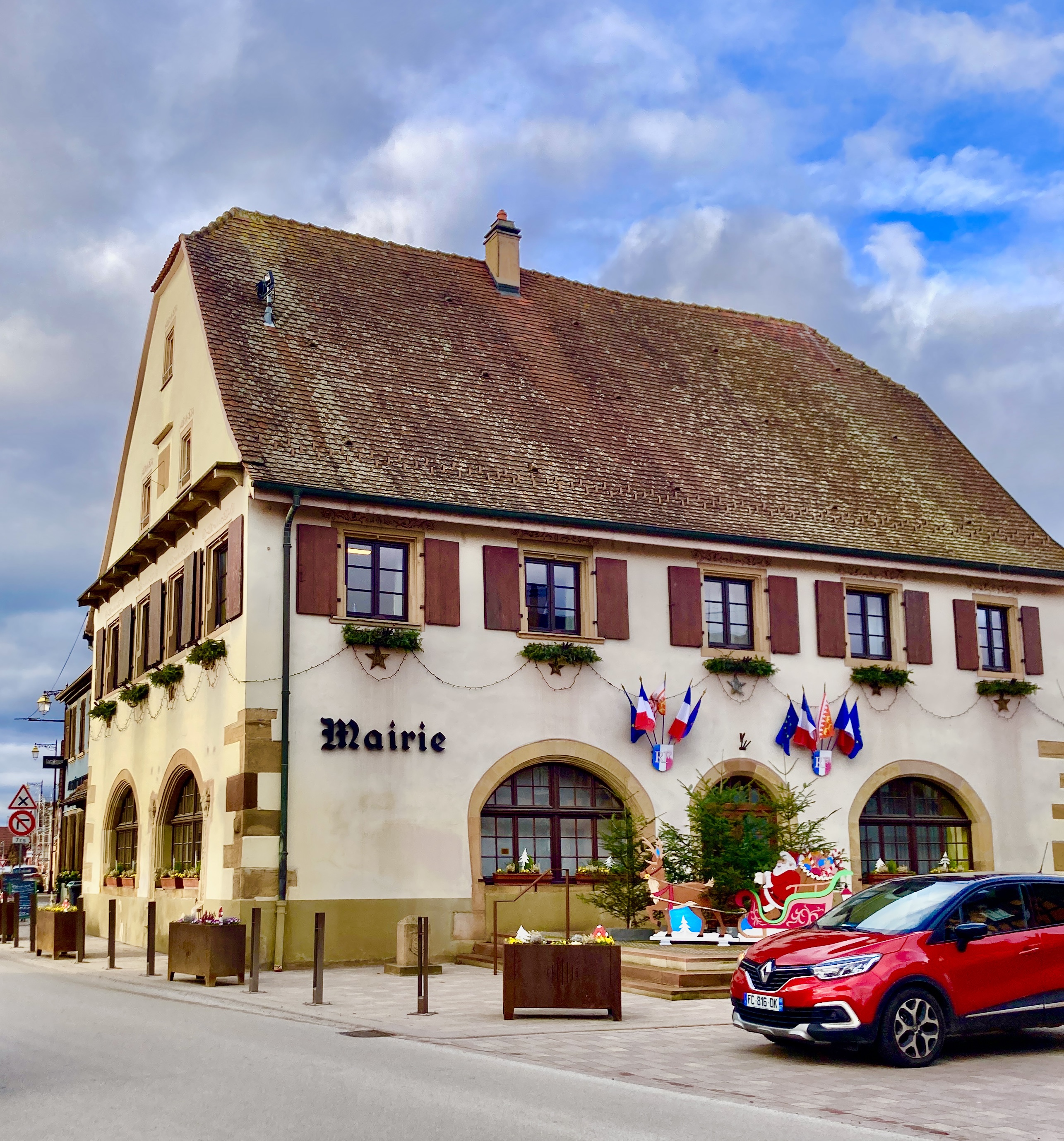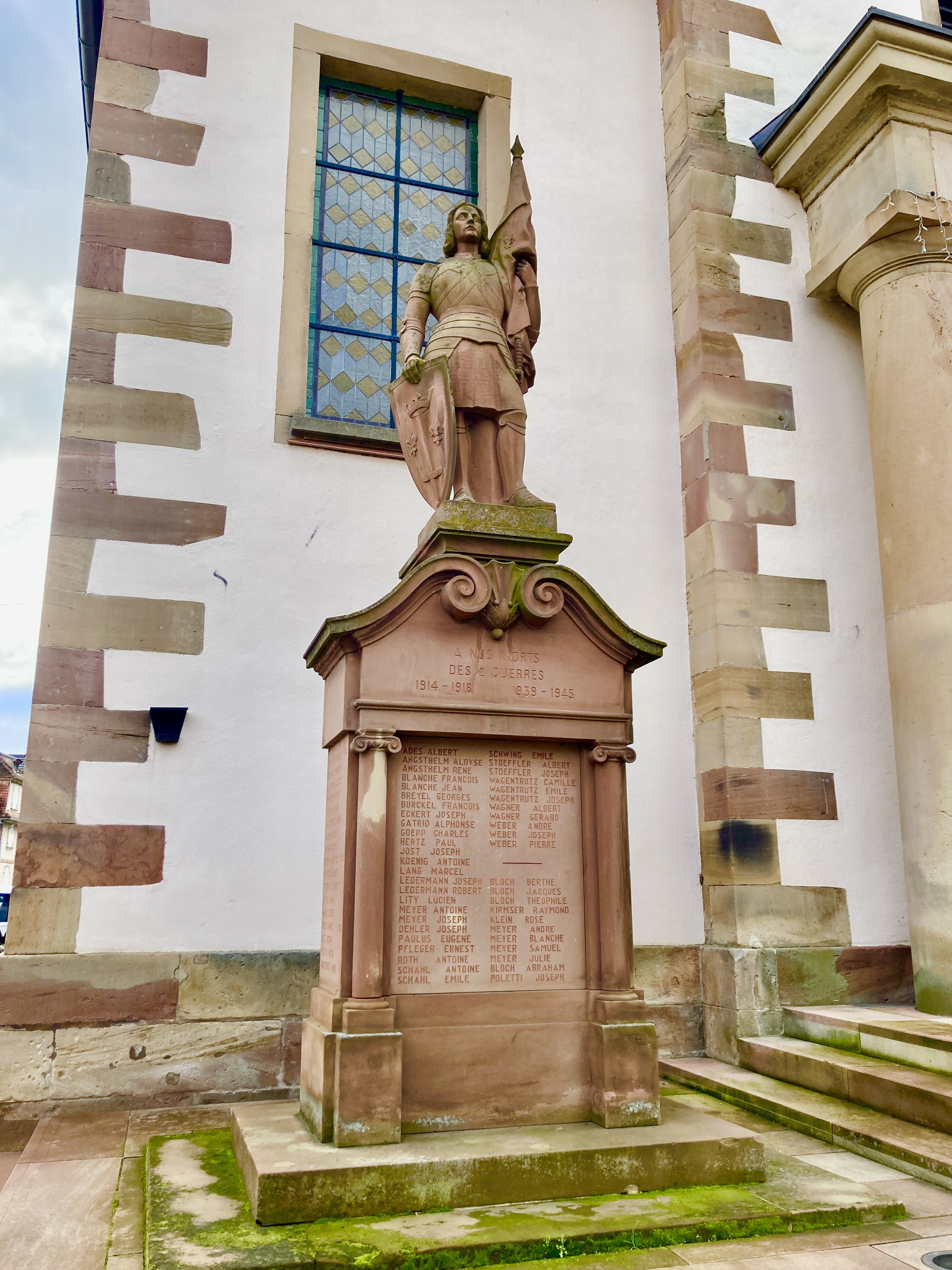 Église du centre-ville avec une statue de Jeanne d'Arc et une croix devant elle, face à la Mairie joliment décorée, la mairie.