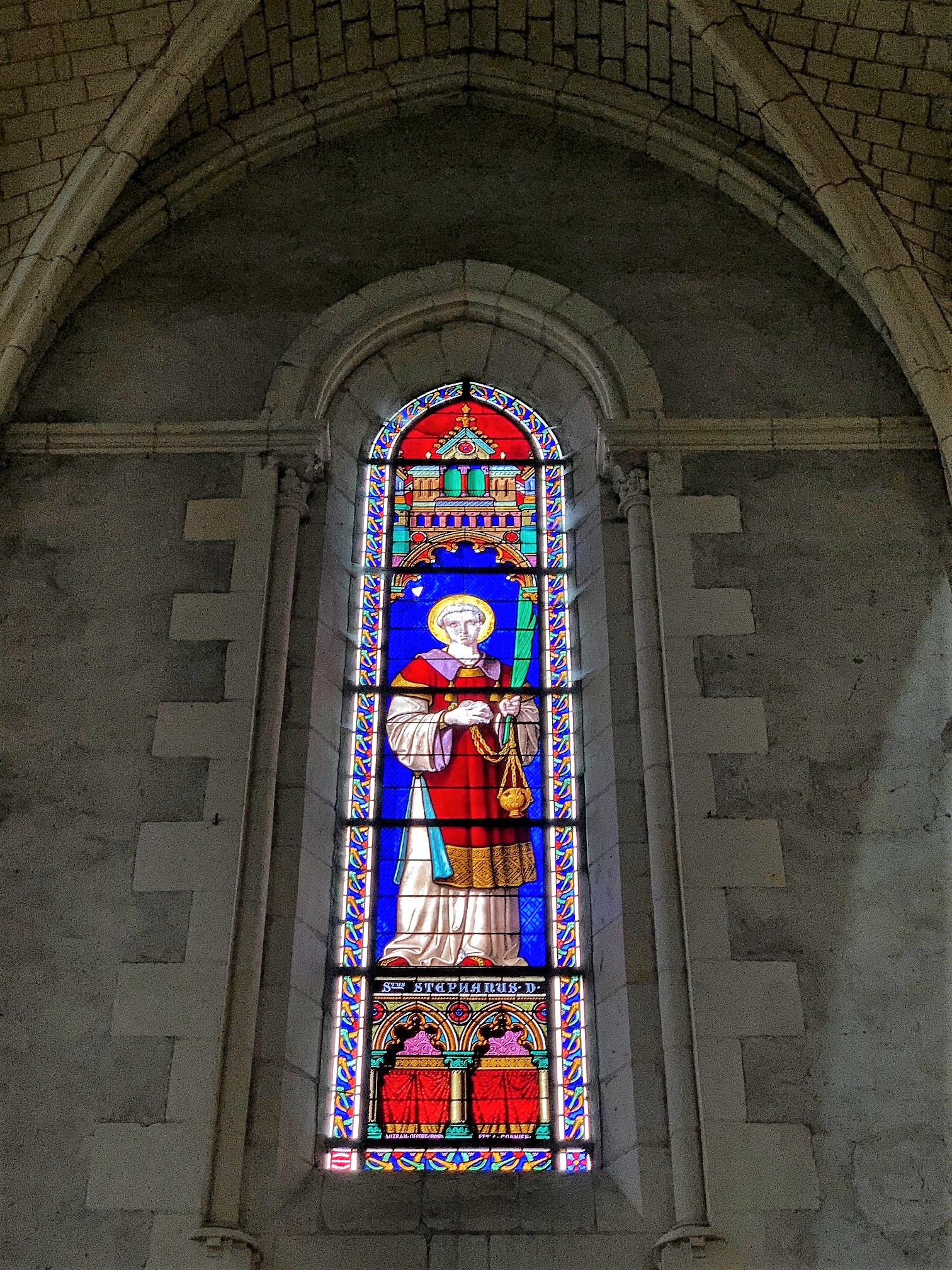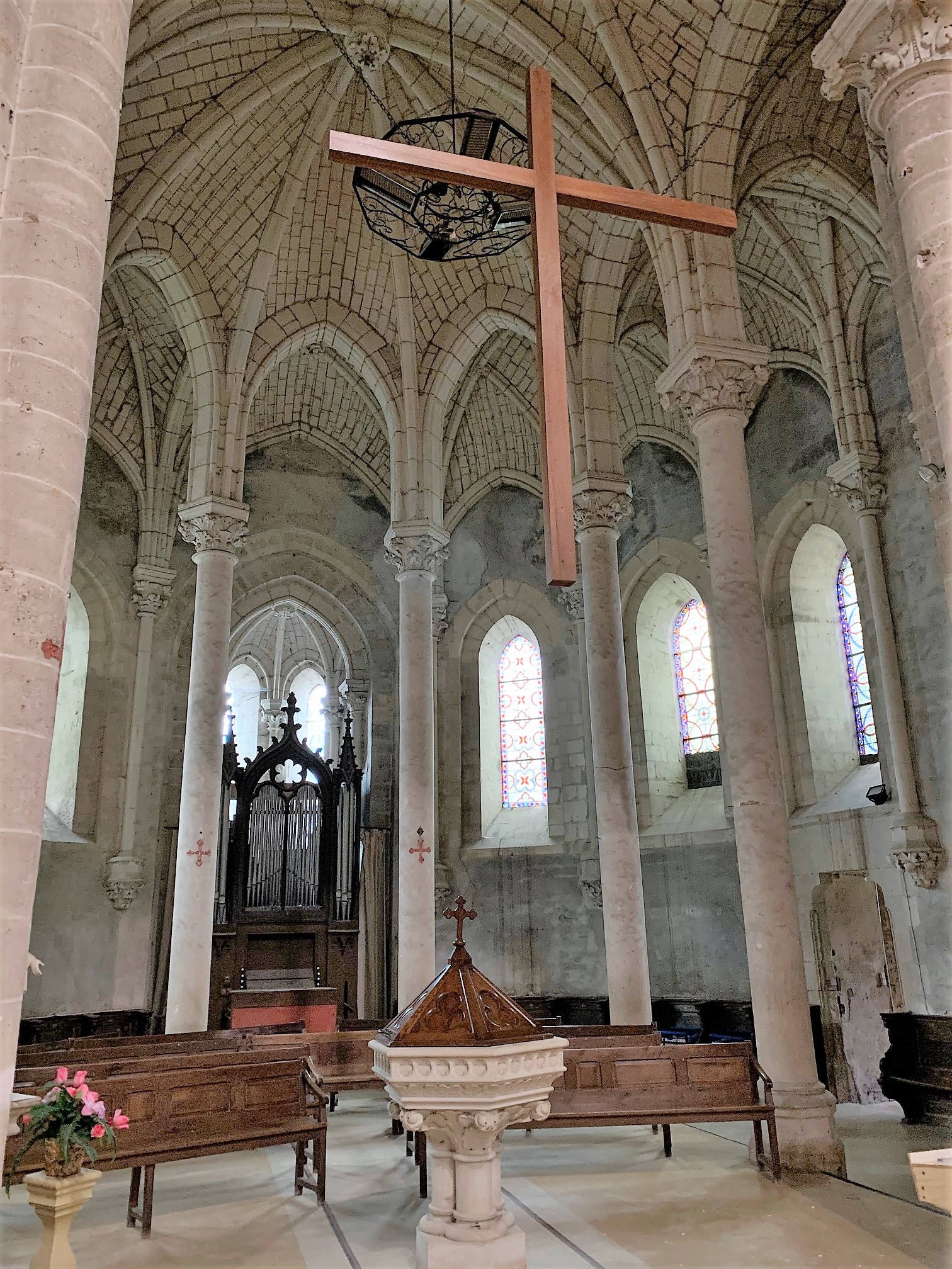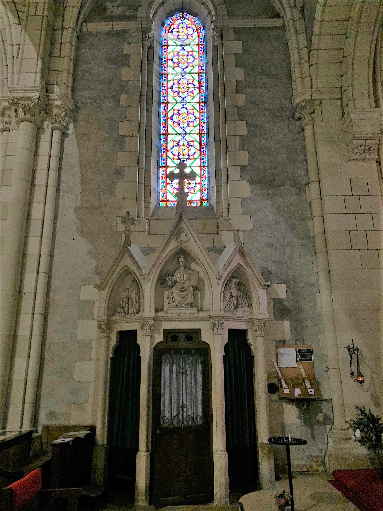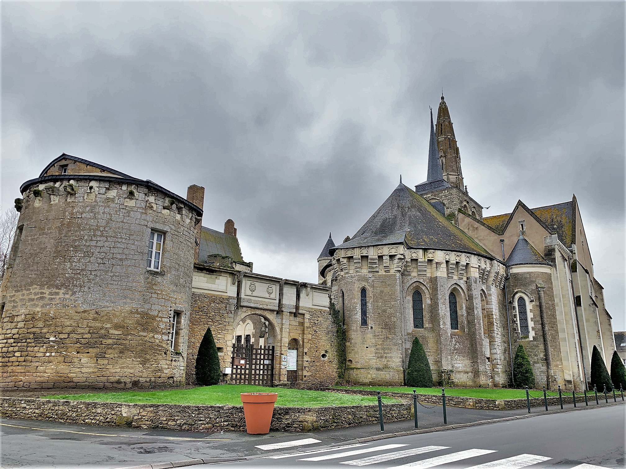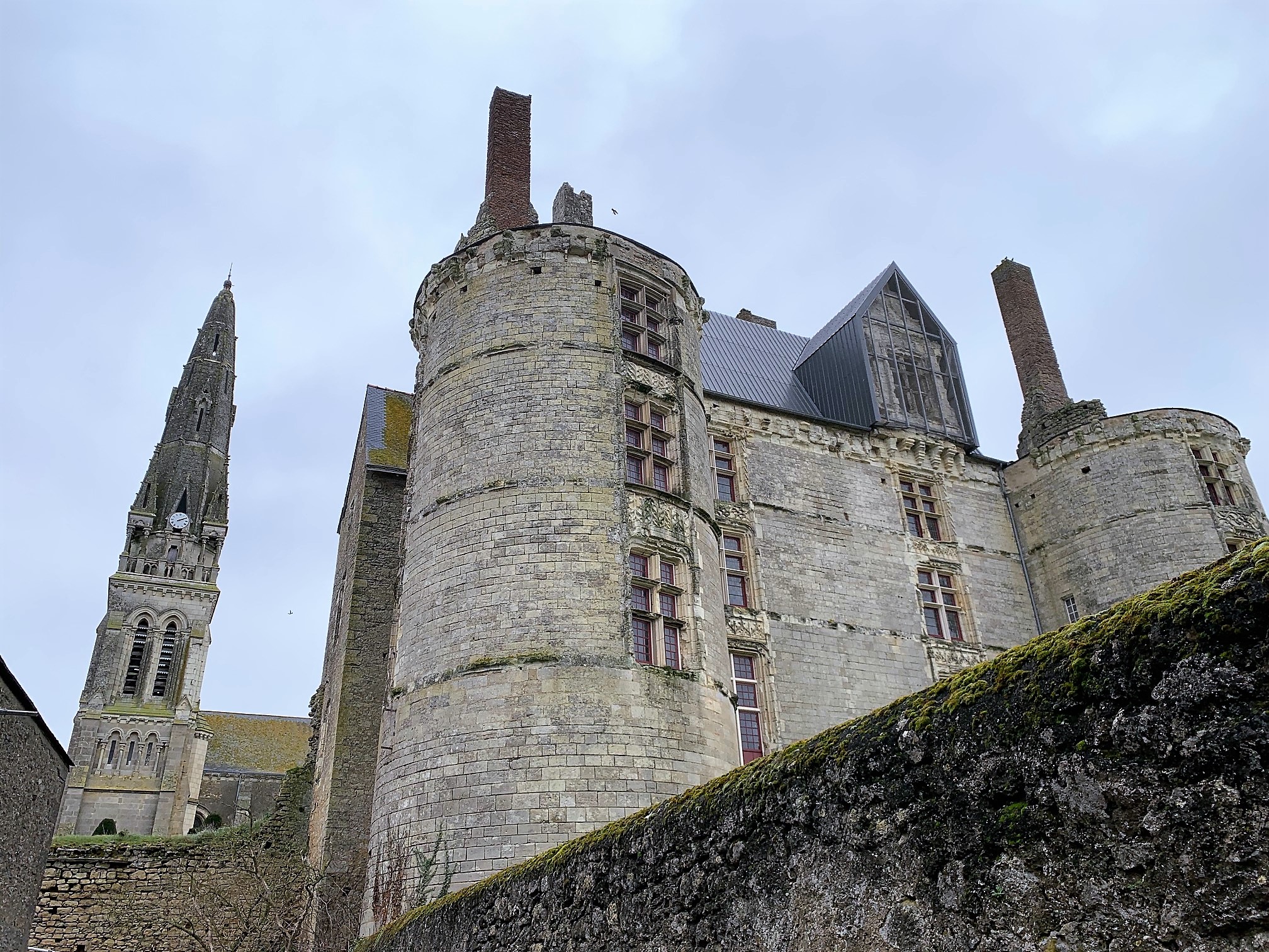 Une église, partie intégrante des fortifications du château attenant. Une église dont l'histoire est indissociable de celle du château, inscrite en totalité par les M.H. en 2015, comme le château du 15ème siècle. L'église primitive, une collégiale, vit le jour au 12ème siècle, modifiée et fortifiée au 15ème siècle puis reconstruite pour la plus grande partie au 19ème siècle. Le chevet fortifié de cette église servait de tour au châtelet d'entrée du domaine. L'église elle-même a la fonction de mur d'enceinte. Voila une architecture originale, d'autant plus que des souterrains joignent l'église au logis. Prendre le temps de faire le tour de l'enceinte permet de mieux appréhender l'architecture de l'ensemble église-château.