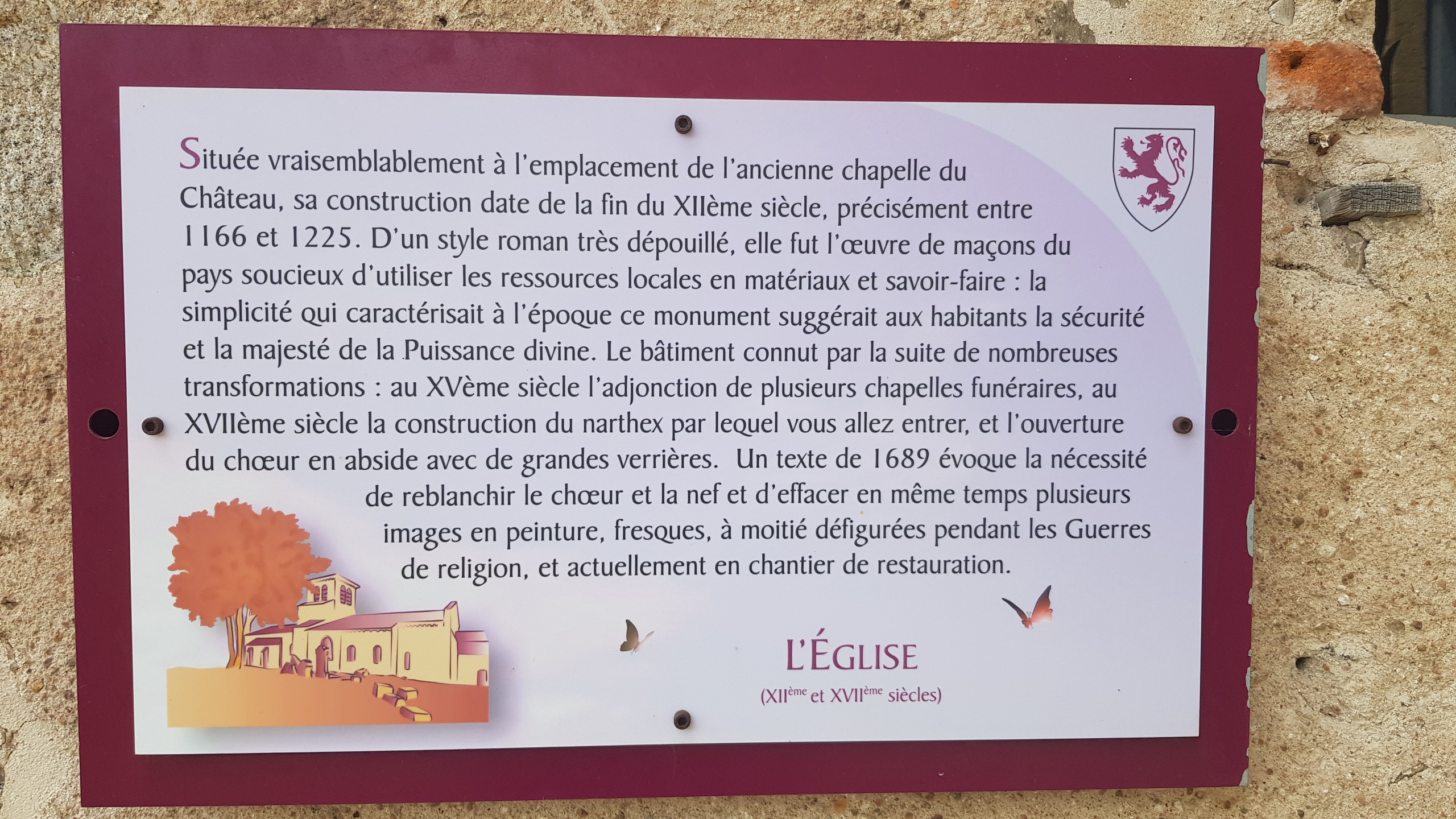 Située vraisemblablement à l'emplacement de l'ancienne chapelle du château, sa construction date de la fin du 12 ème siècle, précisément entre 1166 et 1225. D'un style roman très dépouillée, elle fut l'œuvre de maçons du pays soucieux d'utiliser les ressources locales en matièraux et en savoir faire : la simplicité qui caractérisait à l'époque ce monument suggérait aux habitants la sécurité et la majesté de la puissance divine. Le bâtiment connu par la suite de nombreuses transformations : au 15 ème siècle l'adjonction de plusieurs chapelles funéraires, au 17 ème siècle la construction du narthex par lequel vous allez rentrer, et l'ouverture du choeur en abside avec de grandes verrières. Un texte de 1689 évoque la nécessité de reblanchir le choeur et la nef et d'effacer en même temps plusieurs images en peinture, fresques, à moitié défiguré pendant les guerres de religion, et actuellement en chantier de restauration.