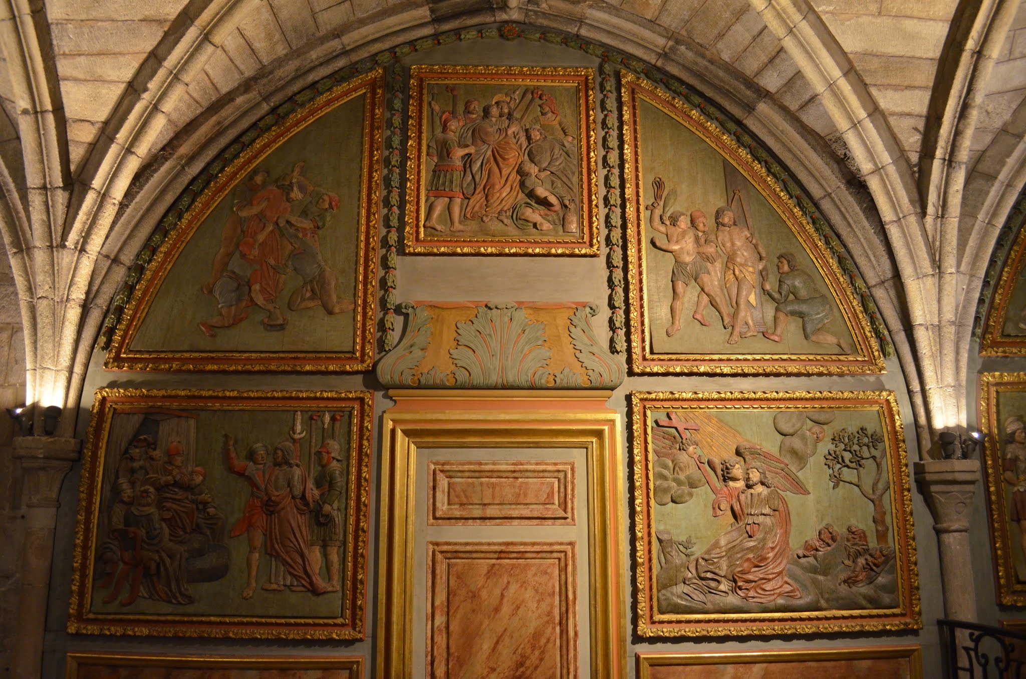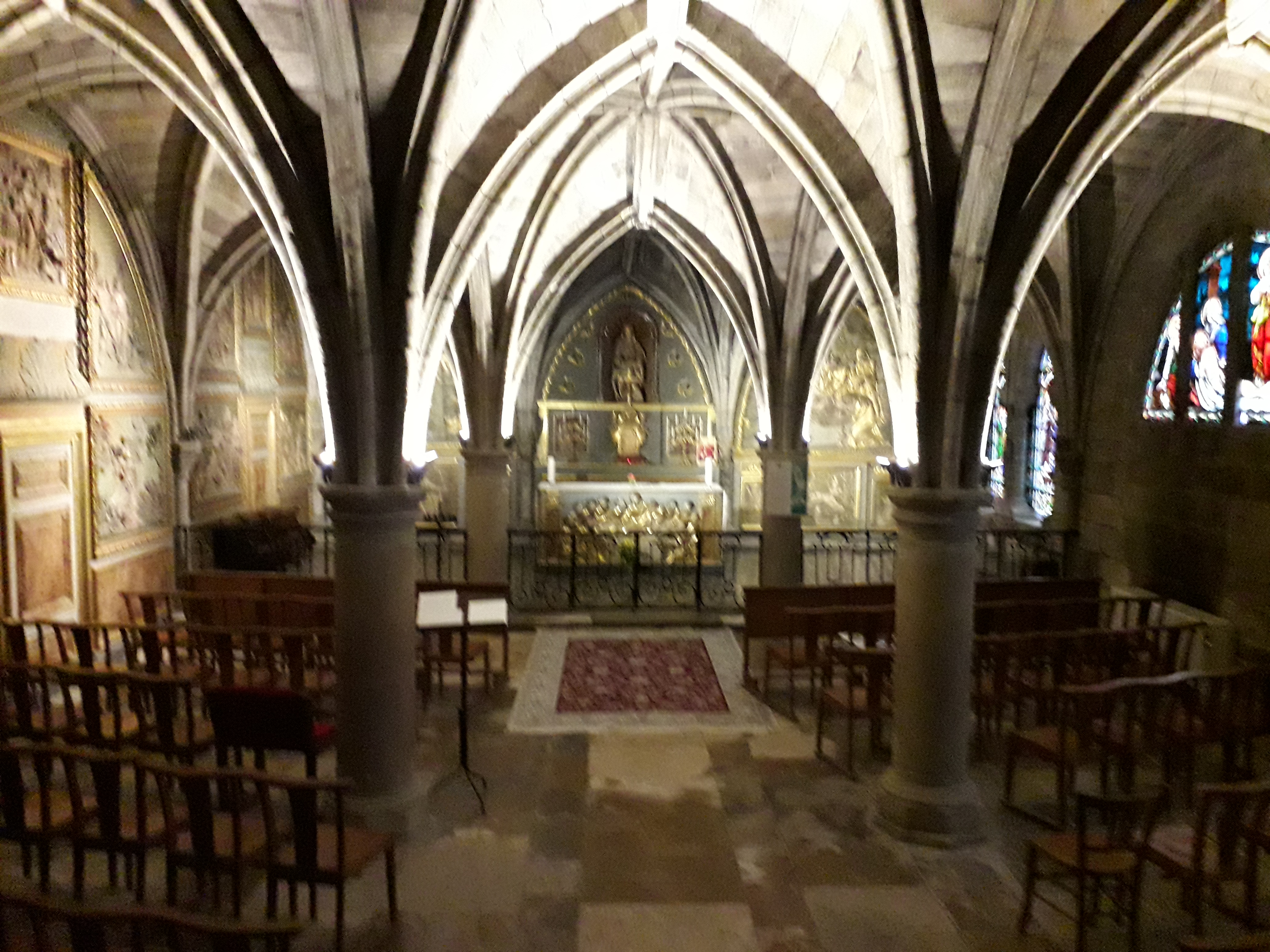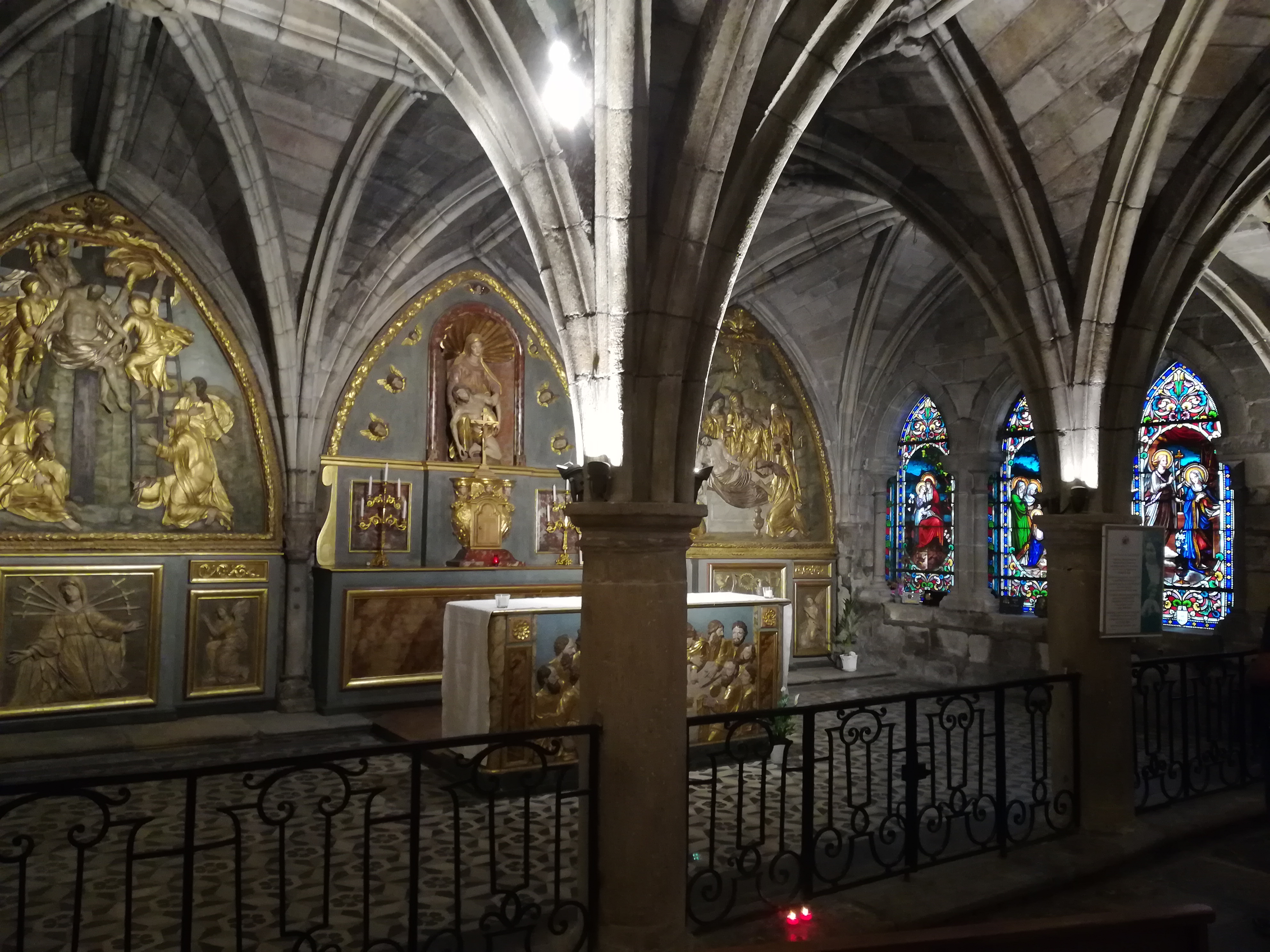 Dans l'aile droite de l'abbatiale Saint Sauveur s'ouvre la petite chapelle Notre-Dame de Pitié. Neuf travées séparées par quatre piliers. Remarquez le décor en bois sculpté et peint. Retable à 3 panneaux (thème de la passion)