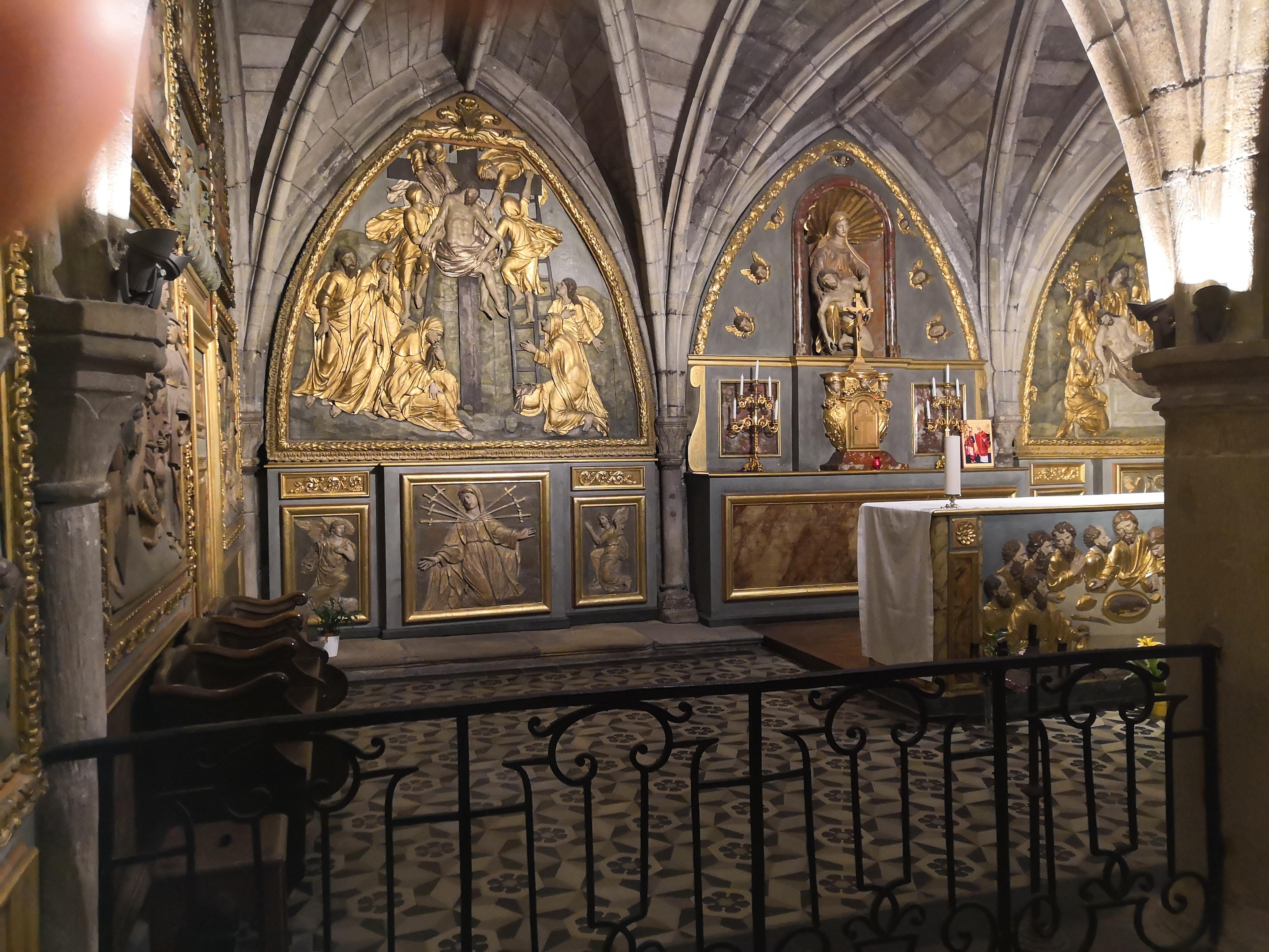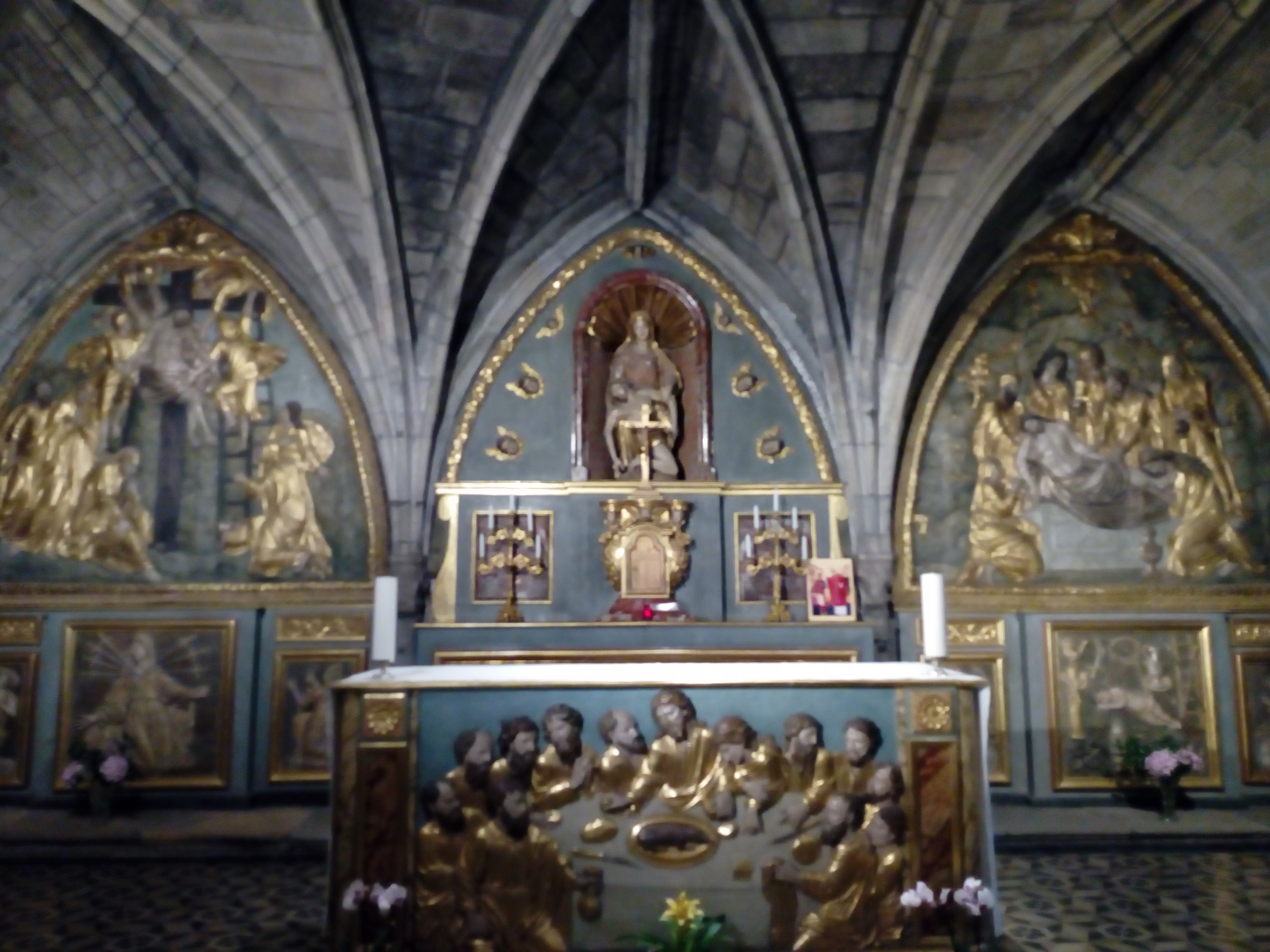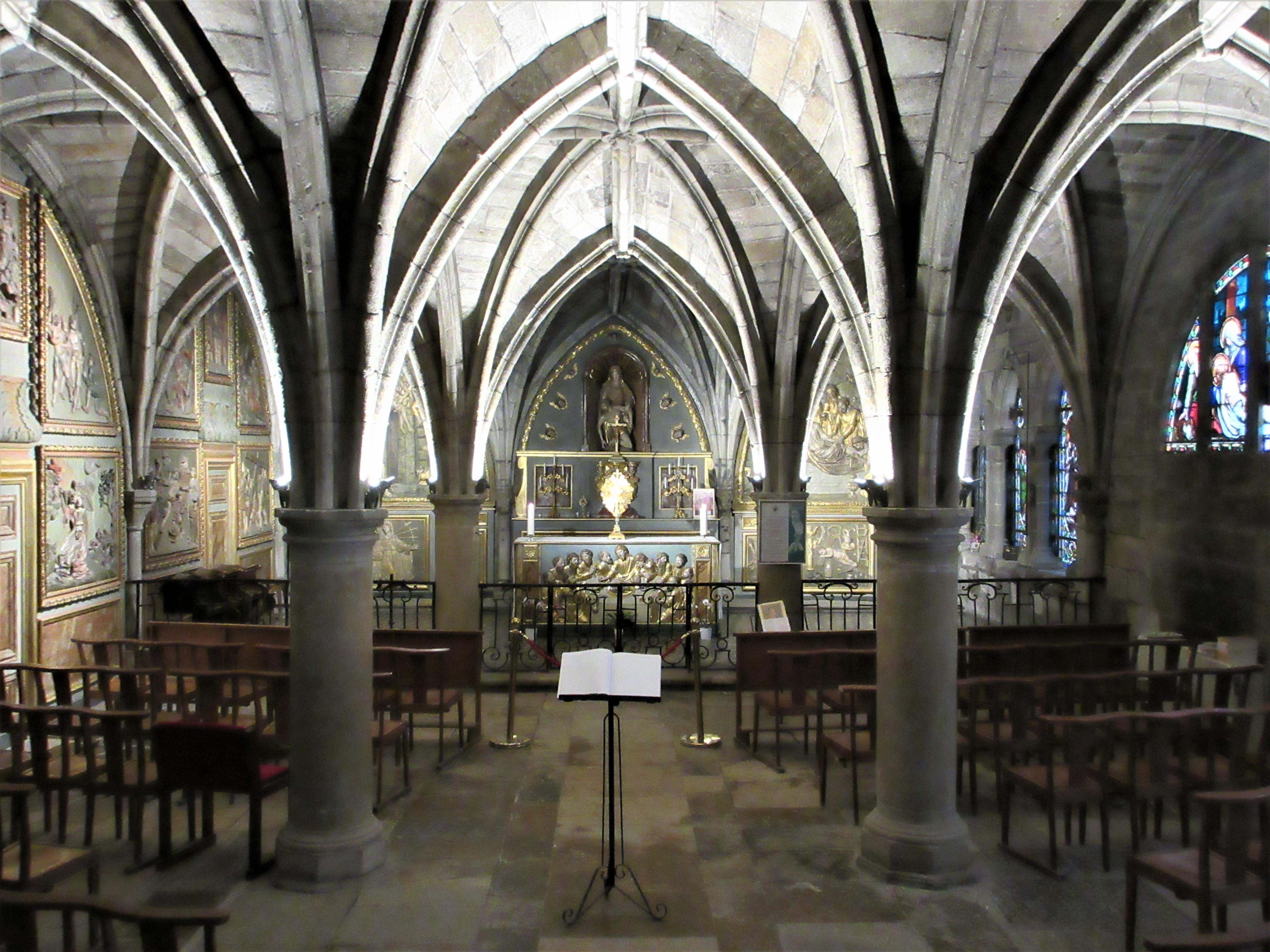 Dans l'aile droite de l'abbatiale Saint Sauveur s'ouvre la petite chapelle Notre-Dame de Pitié. Neuf travées séparées par quatre piliers. Remarquez le décor en bois sculpté et peint. Retable à 3 panneaux (thème de la passion)