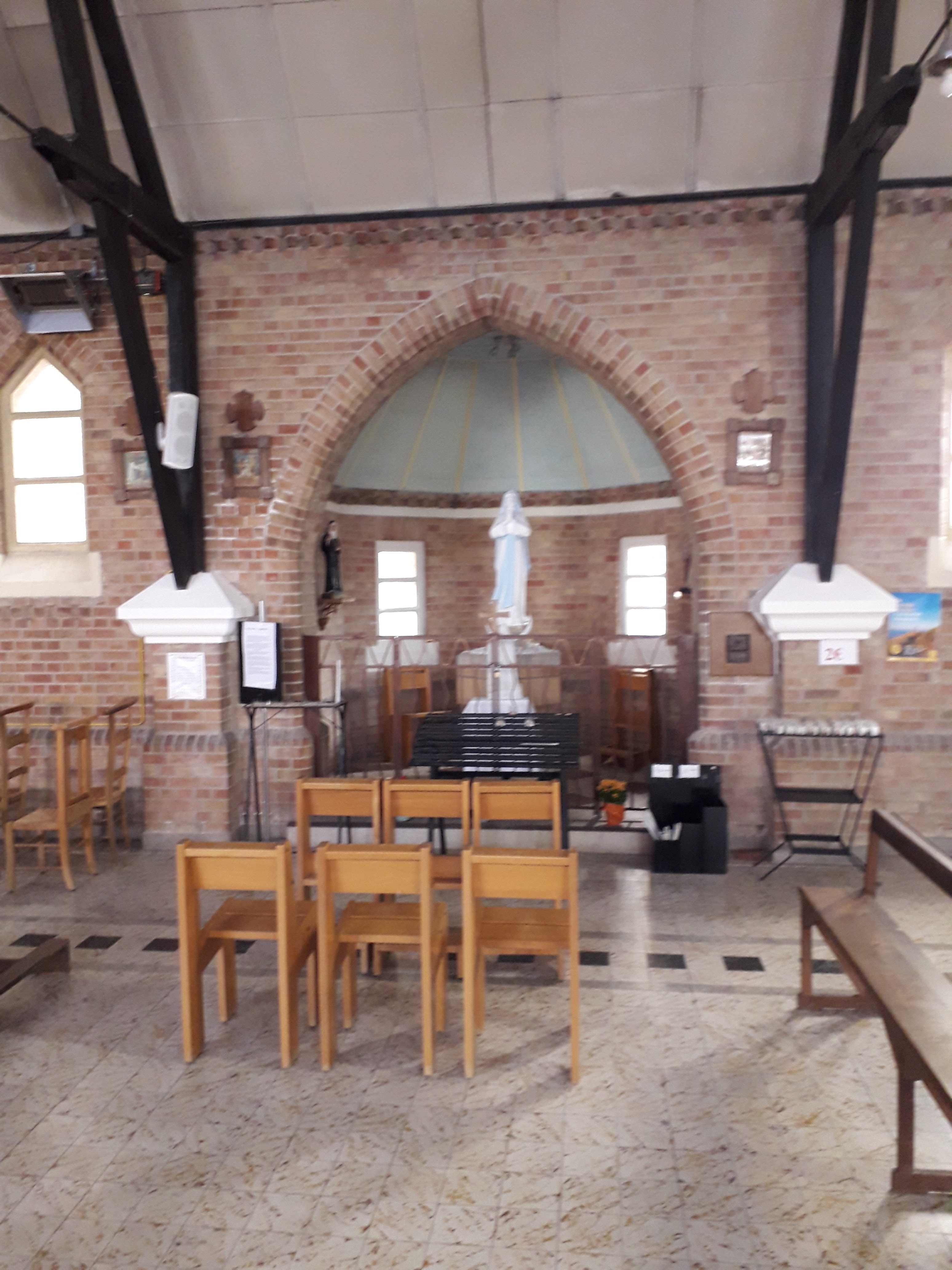 Sympa convivial une église en ville qui ressemble a celle des villages.