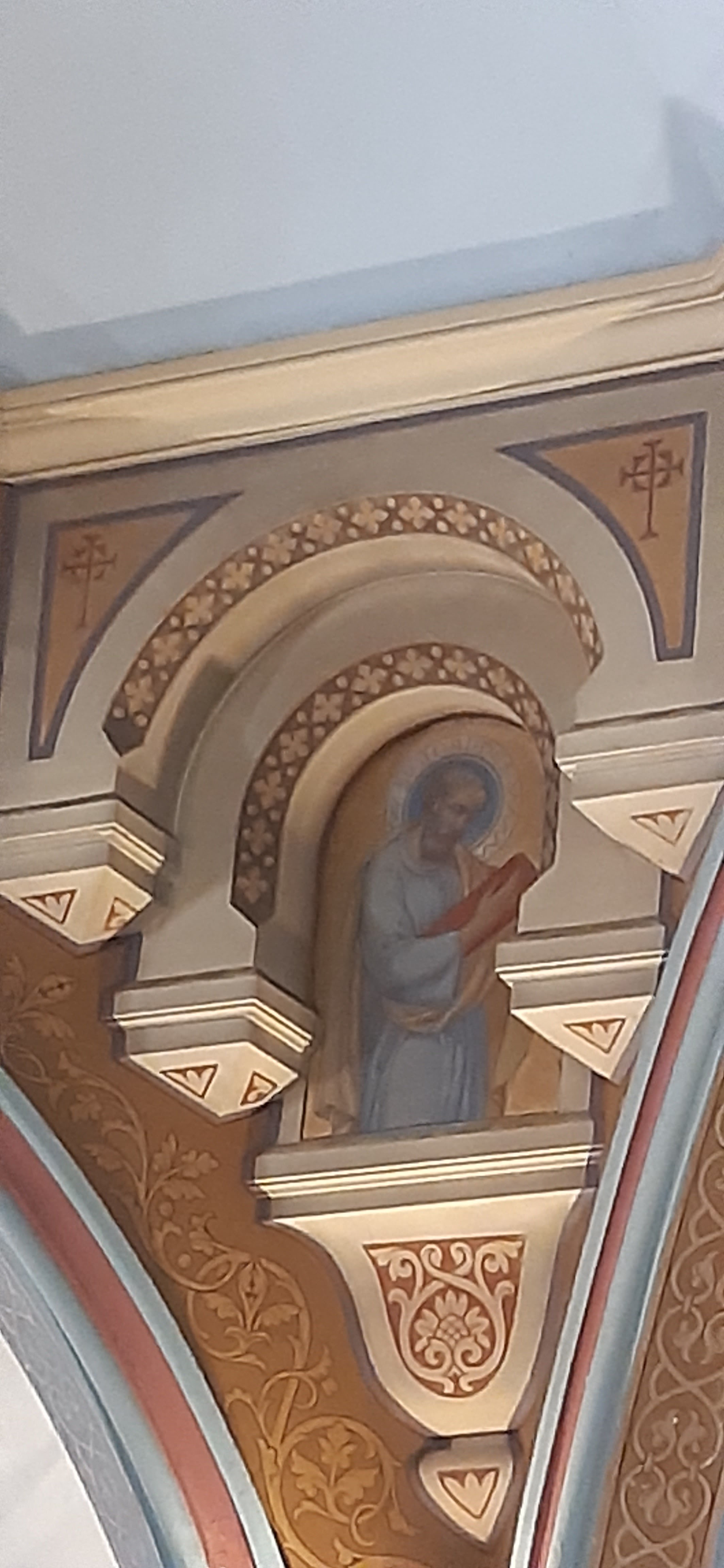 Très belle église avec de magnifiques peintures en médaillon et une jolie statue de la Vierge en bois