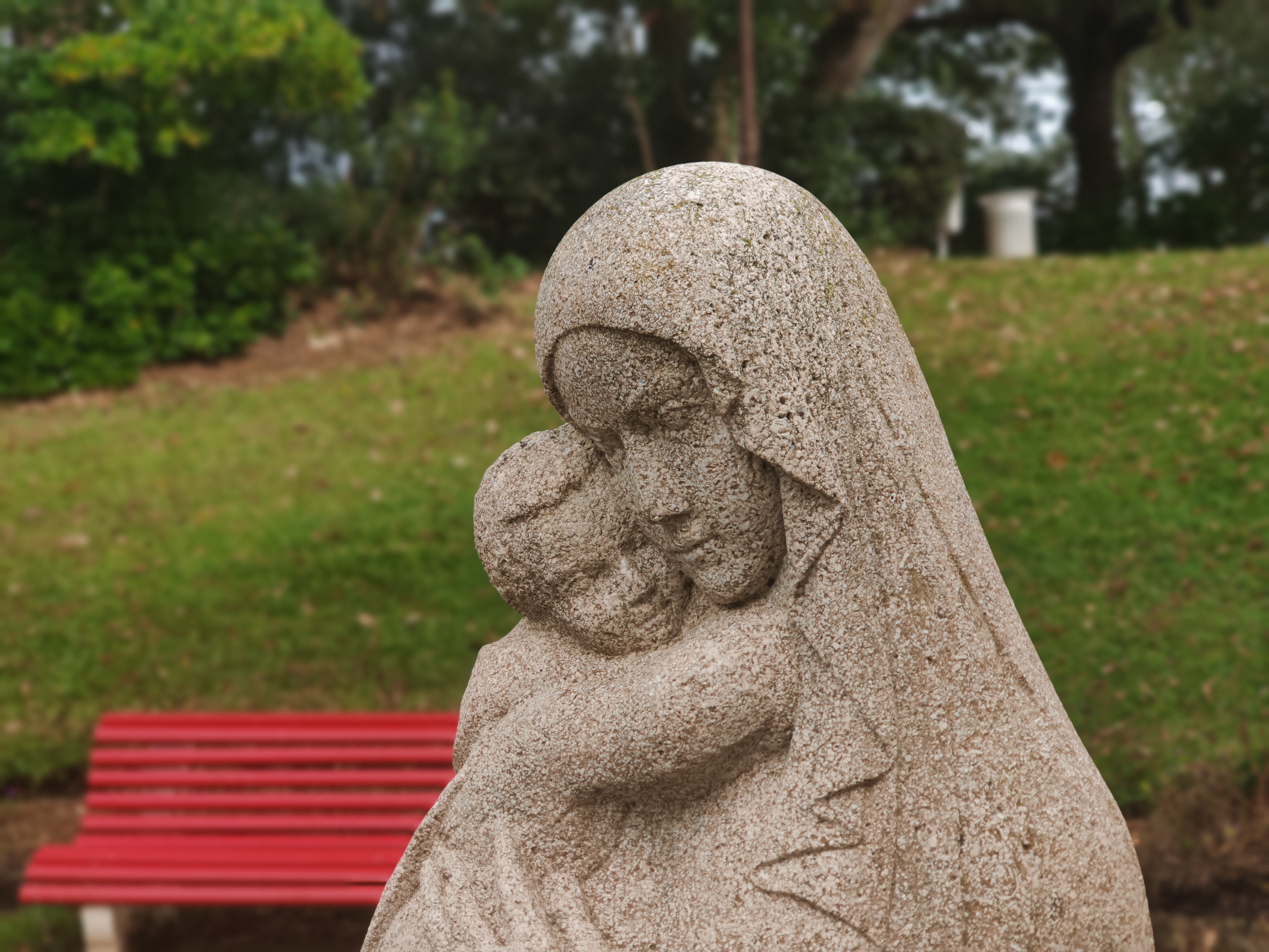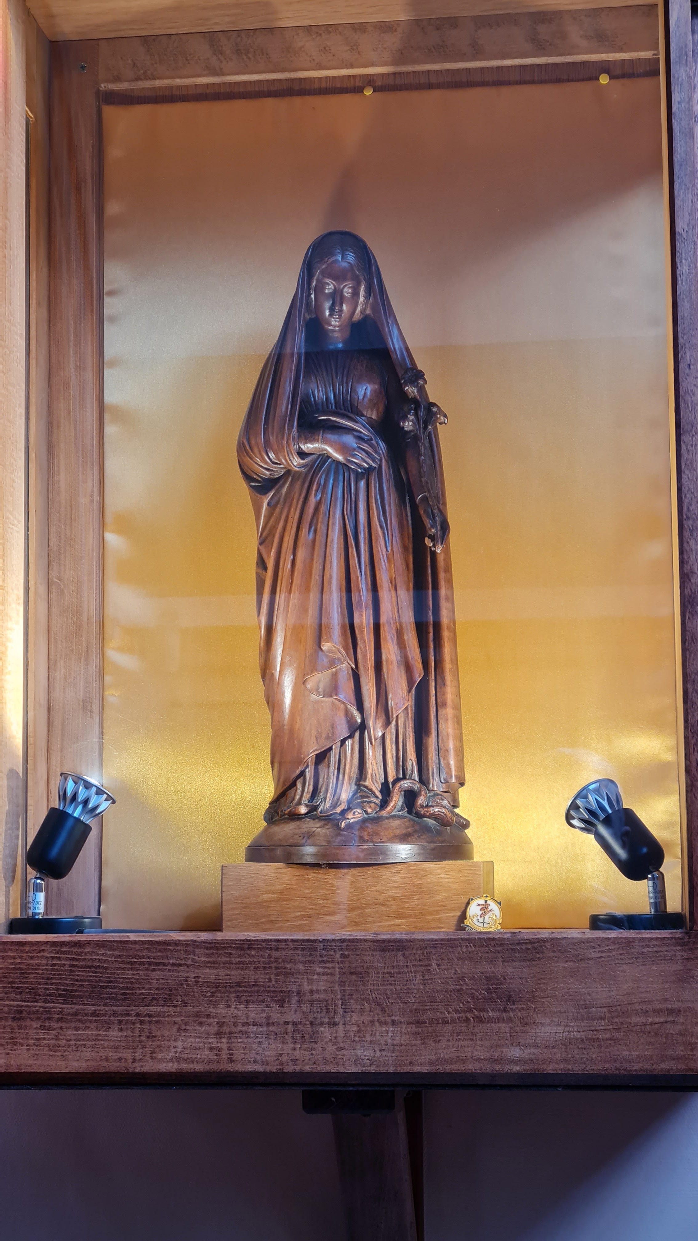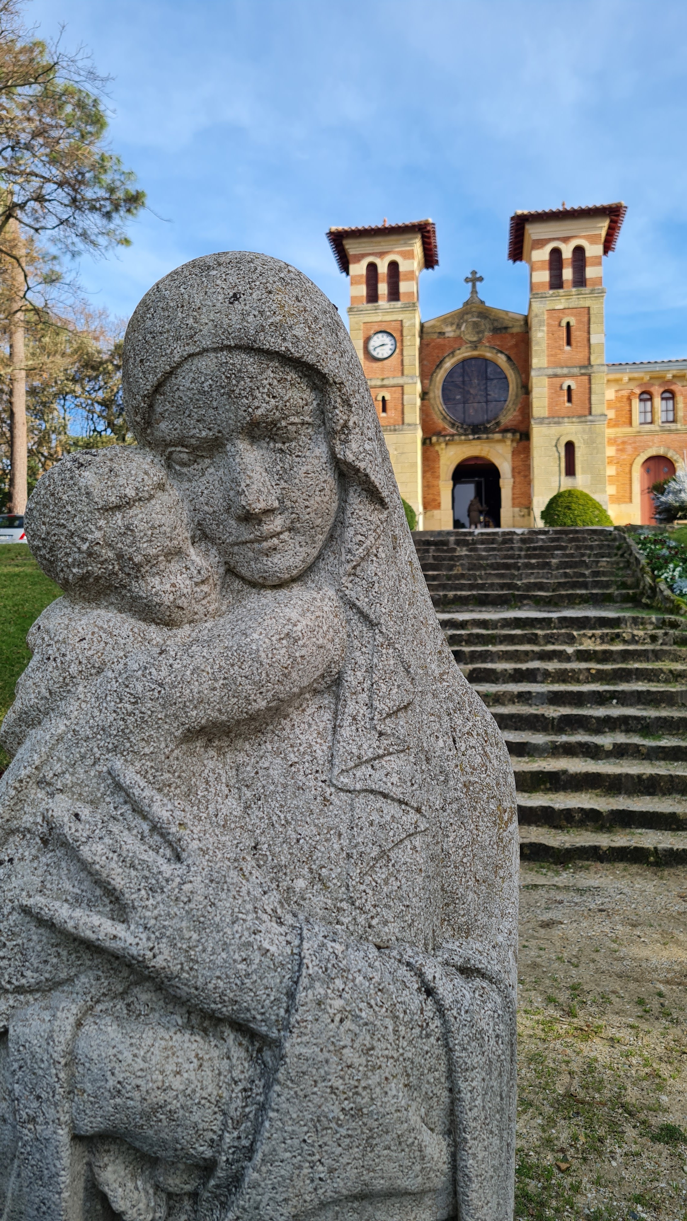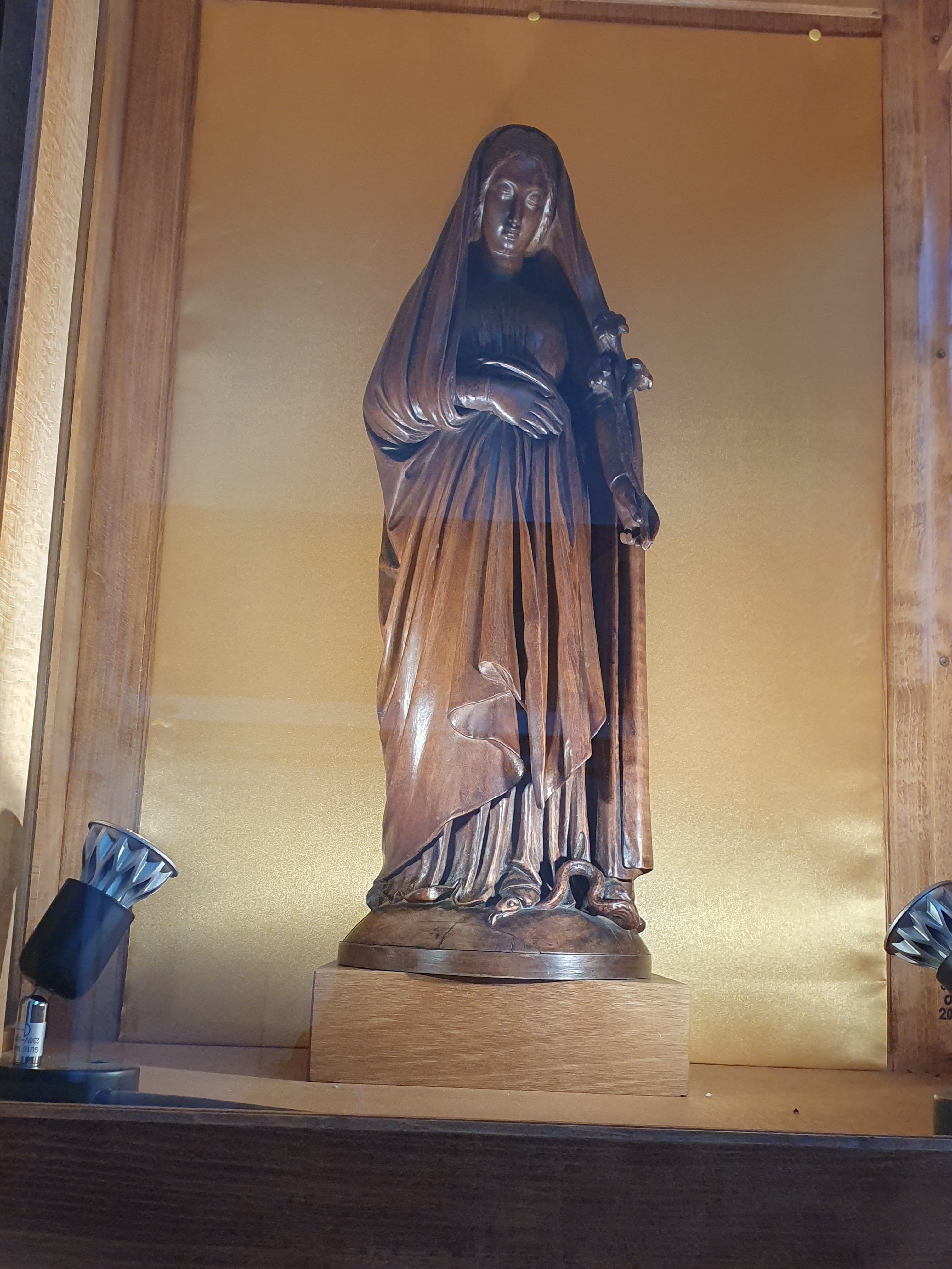 Petite ascension de marches pour y accéder entourées de fleurs qui entourent une statue de marie et l enfant. Une toute petite église accueillante et qui sentait bon la cire d abeilles... apaisante pour ce qu'on y recherche.