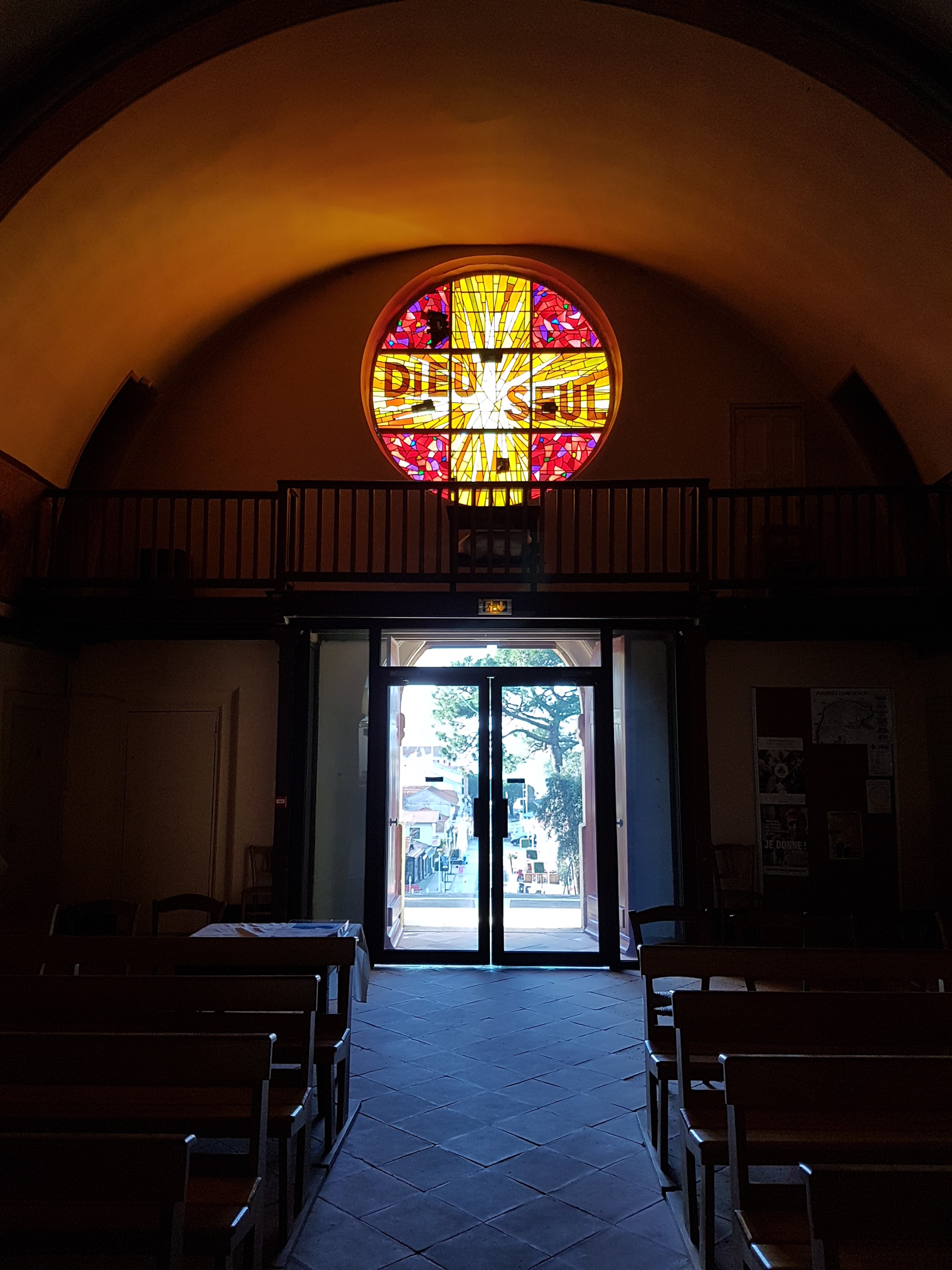 Intérieur sobre qui surprend au regard de l'extérieur. Monter à l'église vaut le coup