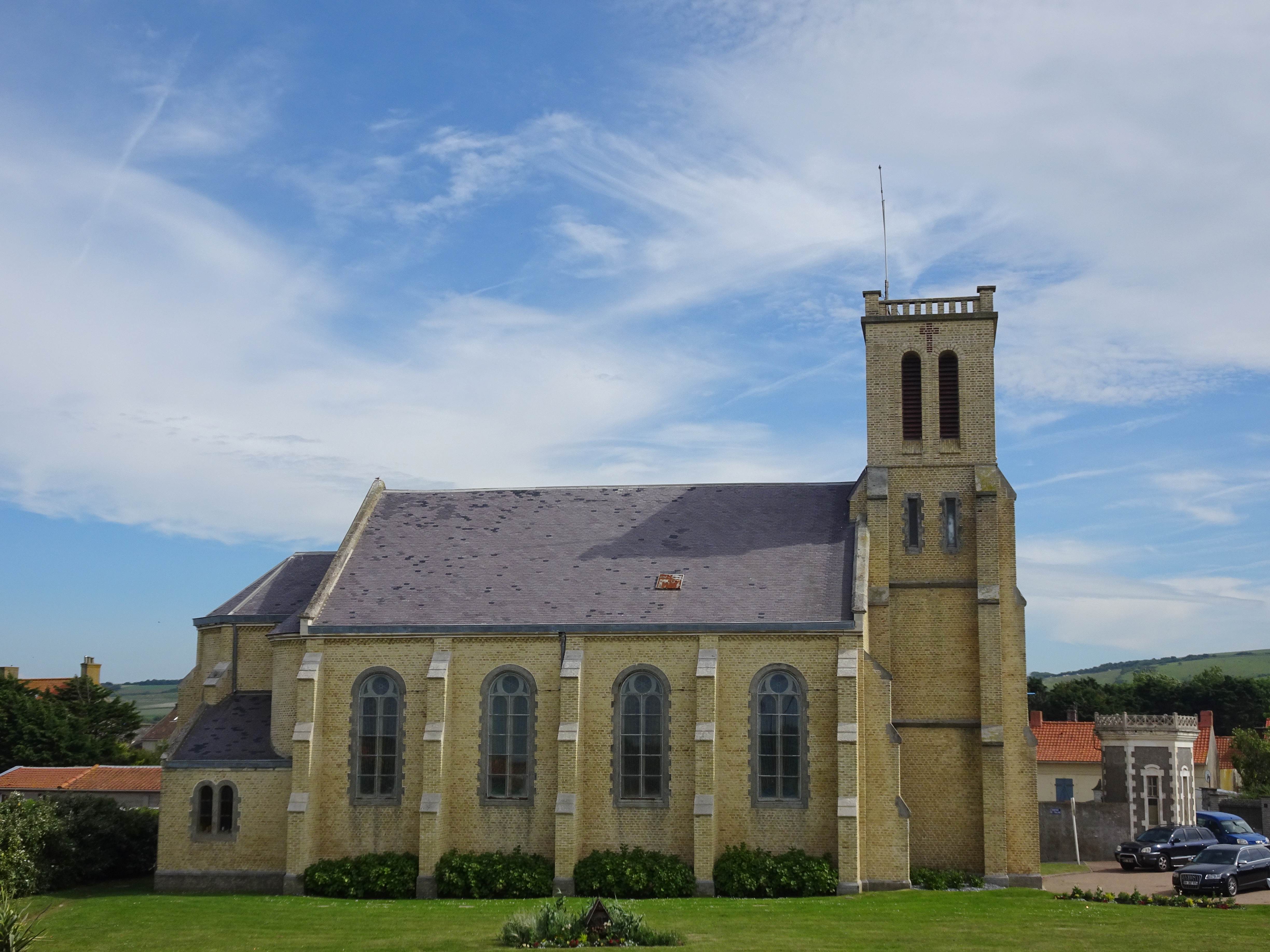 Une petite église côté terre , le Pas de Calais et son activité maritime importante côté mer , avec au loin l'Angleterre ...