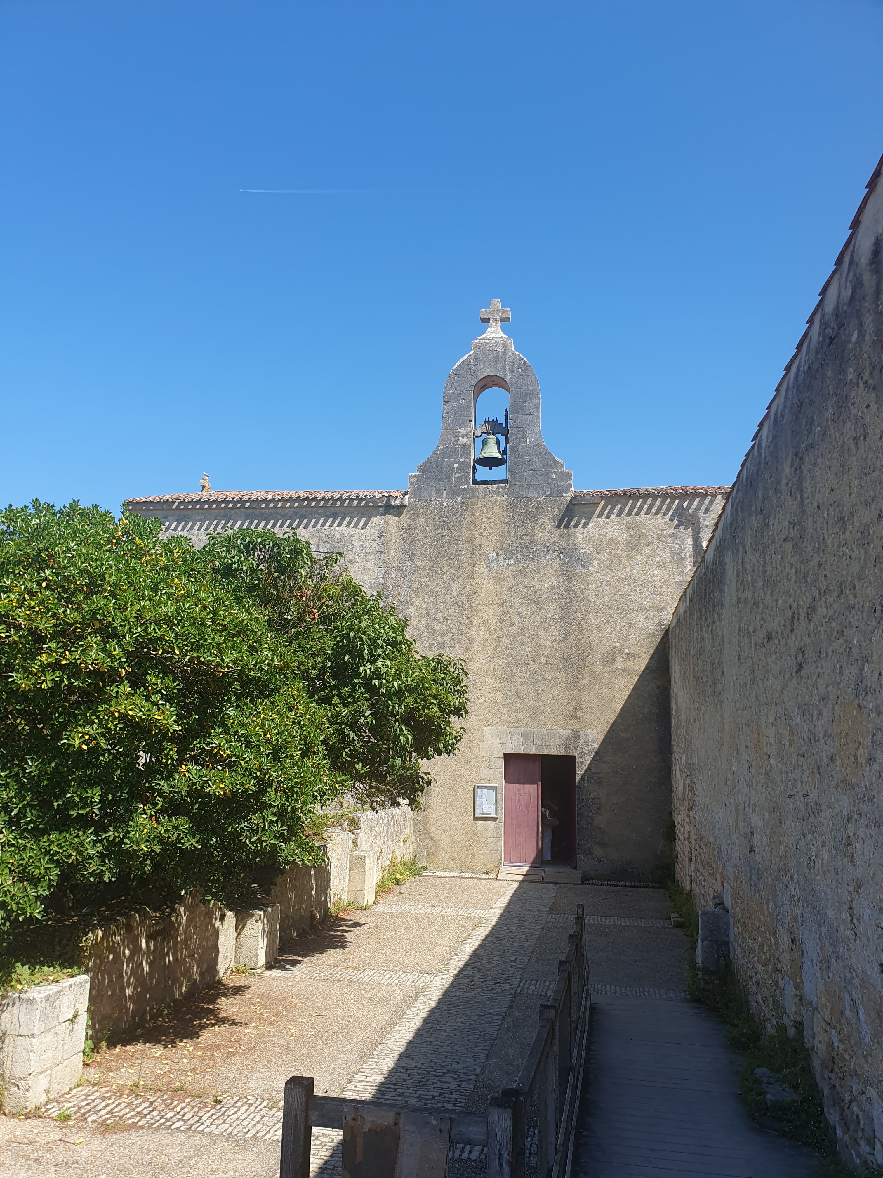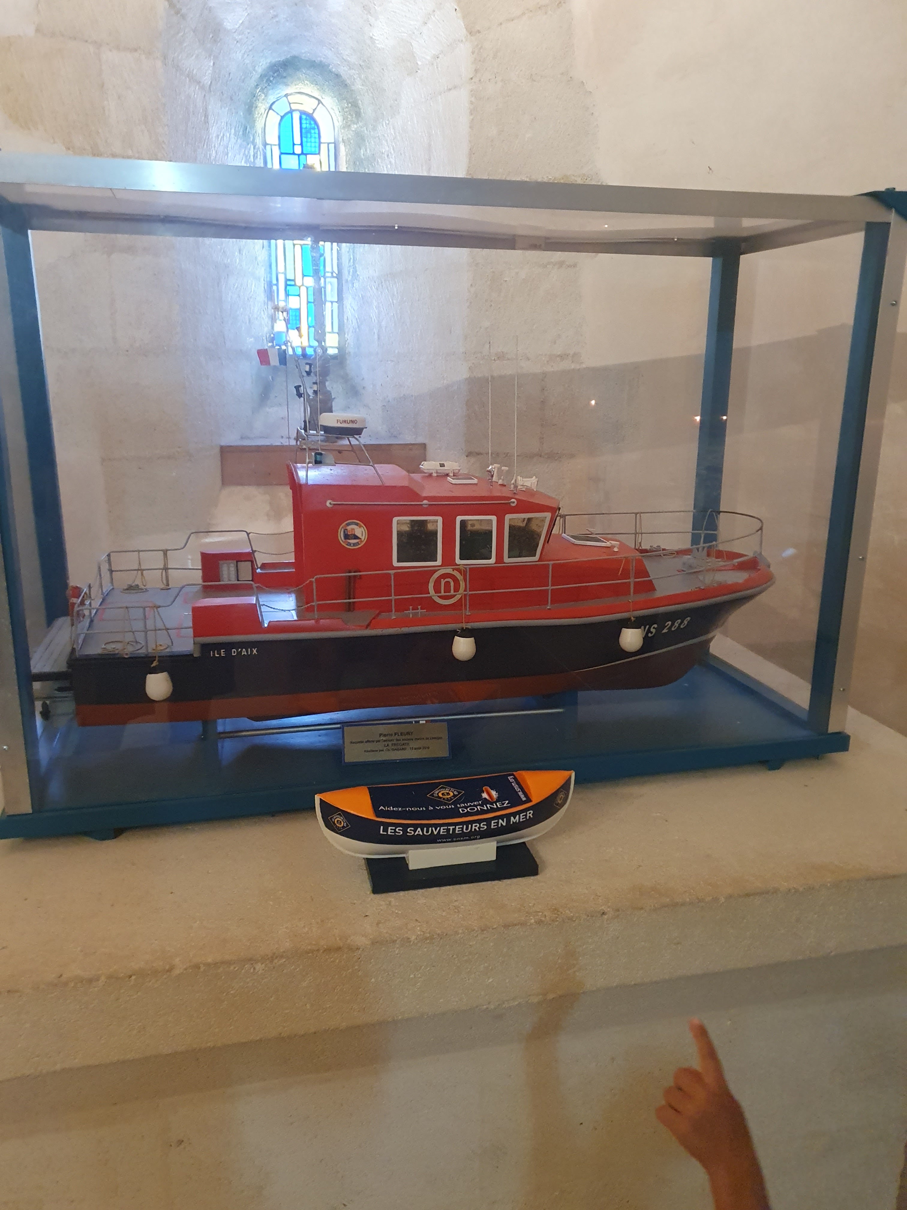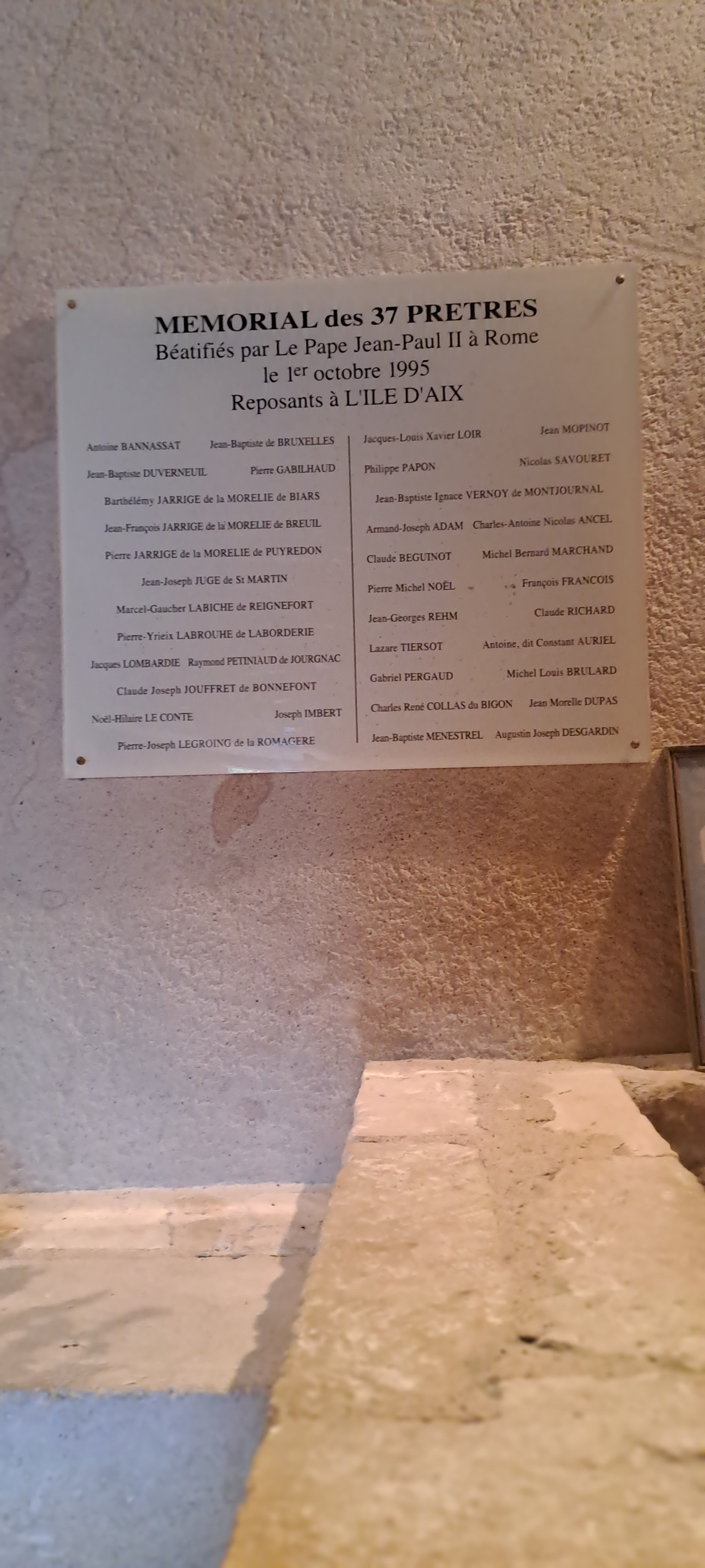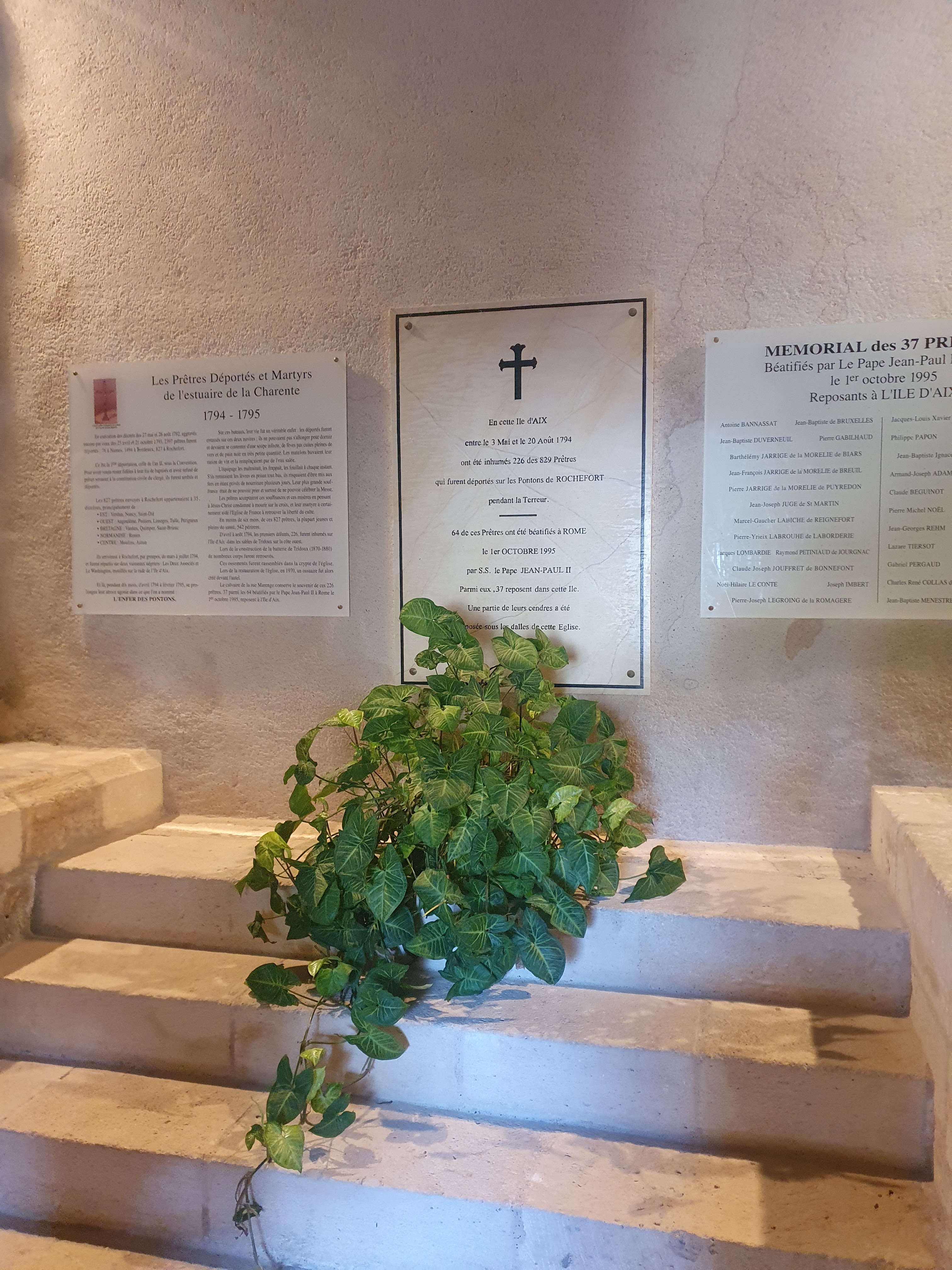 A mon arrivée, je me suis baladée mais vu le nombre de touristes qui se promenaient à pied comme moi, je n'ai pas trouvé l'entrée de l'église. Ah ! Ah ! Quel est ce mystère ? J'ai donc demandé ce jour , le lendemain, à la dame de l'office de tourisme et elle m'a expliqué que c'était dans une descente. C'est insolite. Elle m'a expliqué que cette église était liée à une triste histoire. En allant donc visiter la fameuse église, j'ai découvert que c'était pendant la révolution française de 1789 , notamment de la période dite de la terreur en 1794 qui s'en est suivie . Dans l'église, en effet, il y a un mémorial dédié aux prêtres réfractaires victimes de cette période de la terreur de 1794. Au total dans cette terrible histoire révolutionnaire, il y a eu 226 prêtres réfractaires concernés dont une partie est passée par l'île d'Aix. Dans cette église, Il y a aussi ce à quoi je ne m'attendais pas : le joli tabernacle, à côté d'une grande maquette de bateau et face à la statue de la Vierge . Puis j'ai découvert, une pancarte qui indiquait qu'il y avait une crypte. C'est toujours un endroit sombre et mystérieux. Une pancarte prévient de faire attention à la marche. Mais laquelle ? A l'extérieur, faites le tour de l'église et vous trouverez des architectures arrondies de l'église et de la crypte.