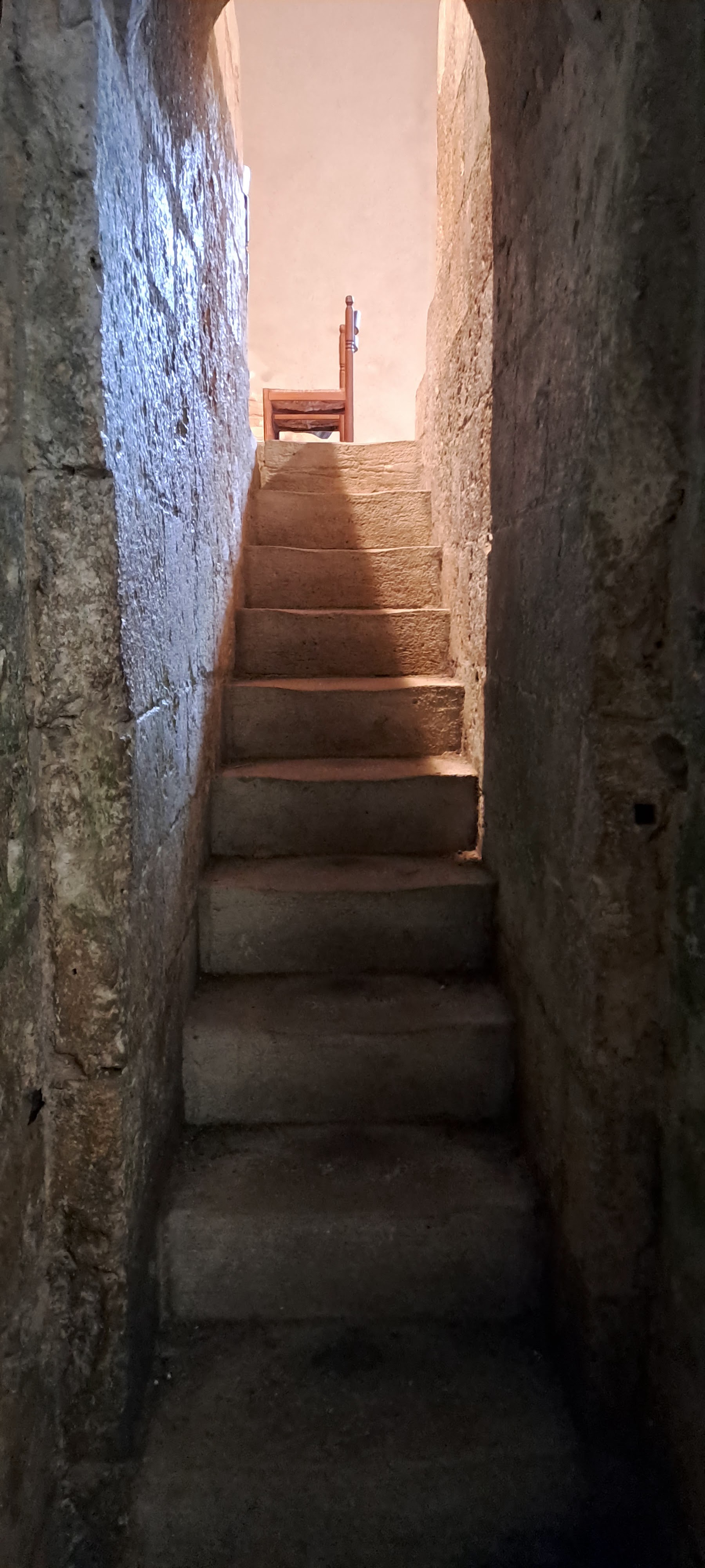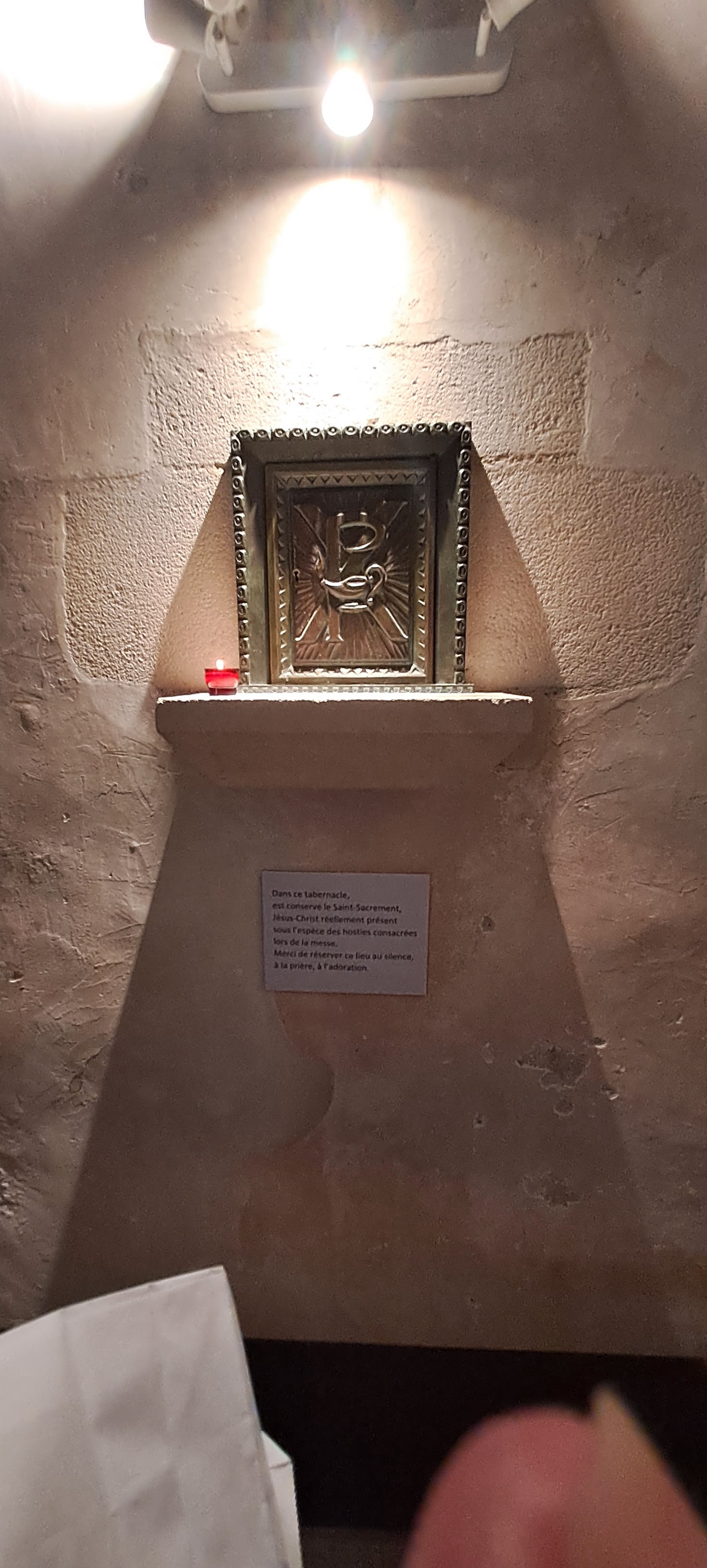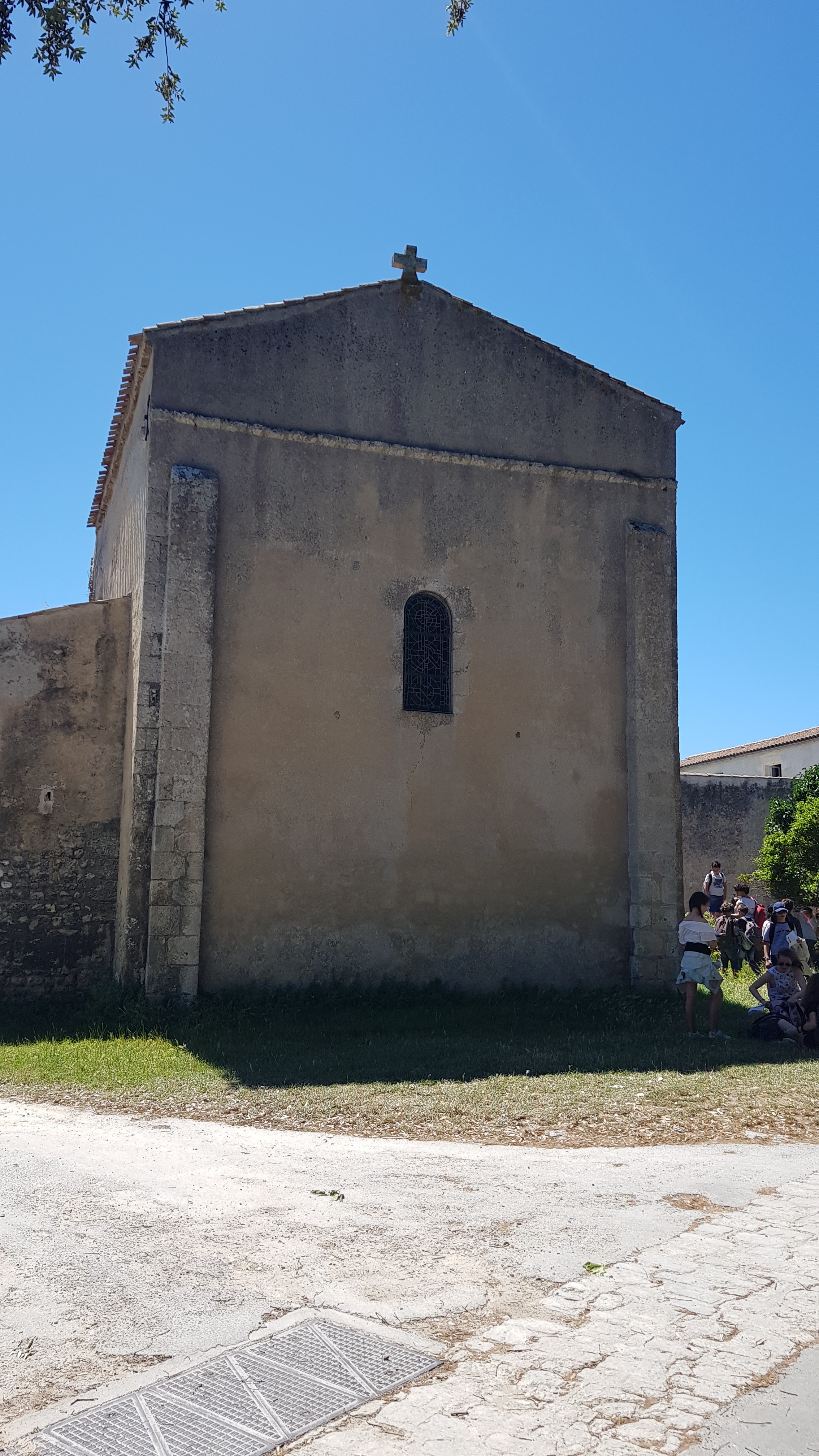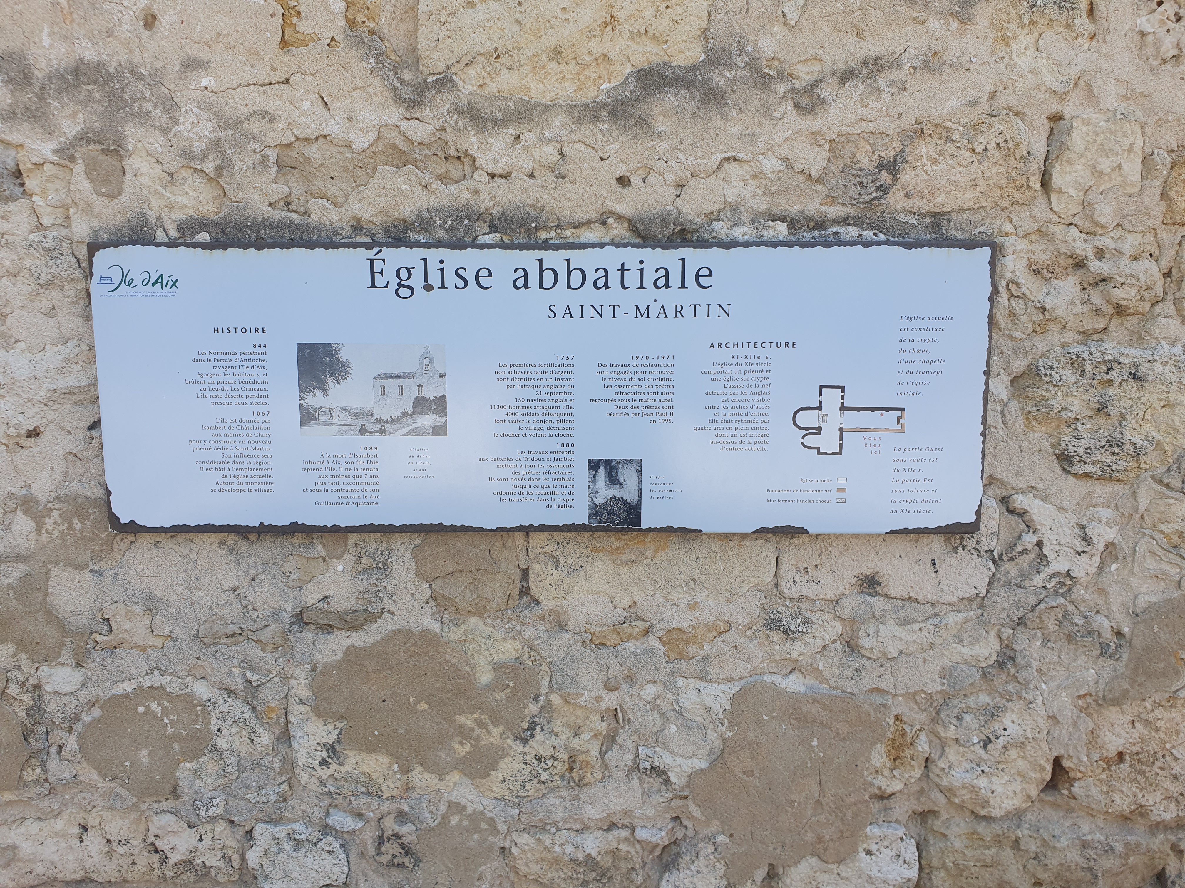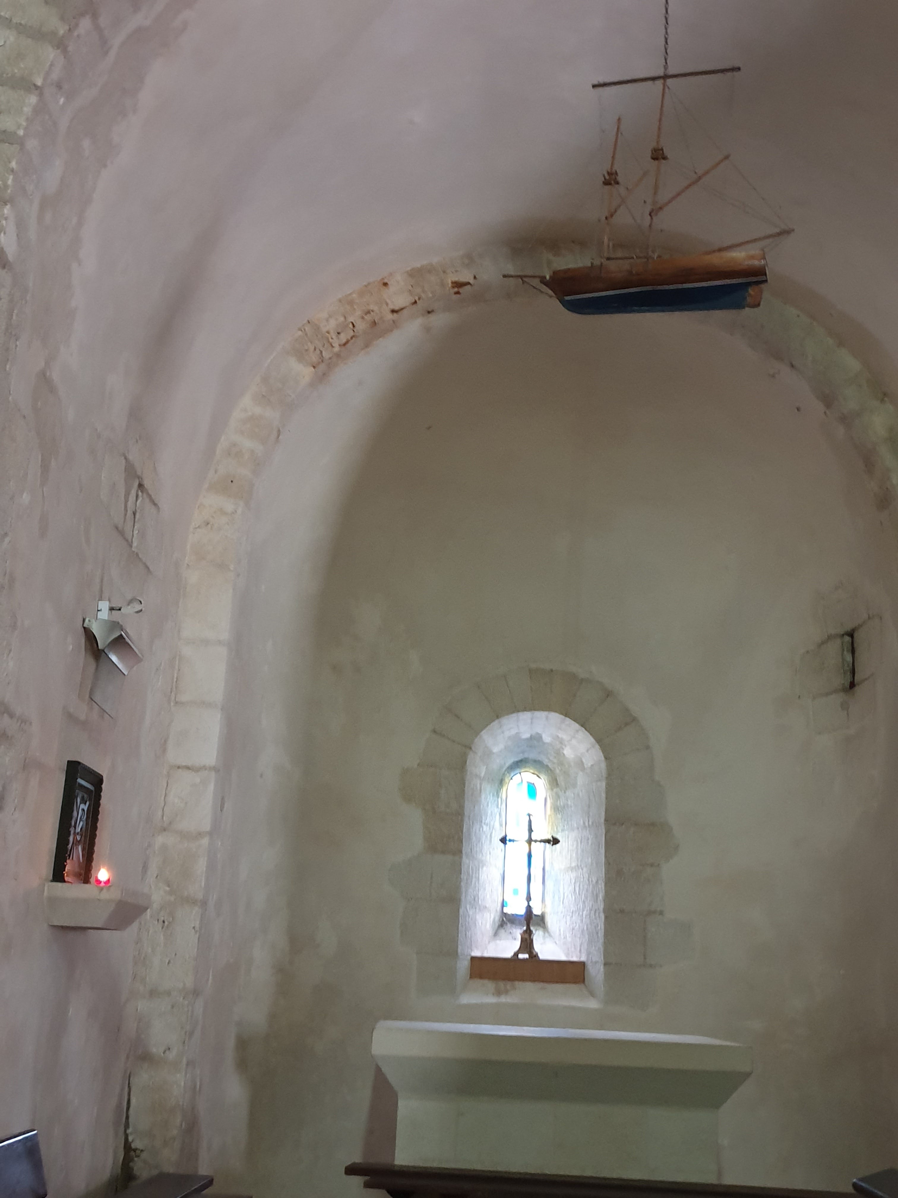 A mon arrivée, je me suis baladée mais vu le nombre de touristes qui se promenaient à pied comme moi, je n'ai pas trouvé l'entrée de l'église. Ah ! Ah ! Quel est ce mystère ? J'ai donc demandé ce jour , le lendemain, à la dame de l'office de tourisme et elle m'a expliqué que c'était dans une descente. C'est insolite. Elle m'a expliqué que cette église était liée à une triste histoire. En allant donc visiter la fameuse église, j'ai découvert que c'était pendant la révolution française de 1789 , notamment de la période dite de la terreur en 1794 qui s'en est suivie . Dans l'église, en effet, il y a un mémorial dédié aux prêtres réfractaires victimes de cette période de la terreur de 1794. Au total dans cette terrible histoire révolutionnaire, il y a eu 226 prêtres réfractaires concernés dont une partie est passée par l'île d'Aix. Dans cette église, Il y a aussi ce à quoi je ne m'attendais pas : le joli tabernacle, à côté d'une grande maquette de bateau et face à la statue de la Vierge . Puis j'ai découvert, une pancarte qui indiquait qu'il y avait une crypte. C'est toujours un endroit sombre et mystérieux. Une pancarte prévient de faire attention à la marche. Mais laquelle ? A l'extérieur, faites le tour de l'église et vous trouverez des architectures arrondies de l'église et de la crypte.