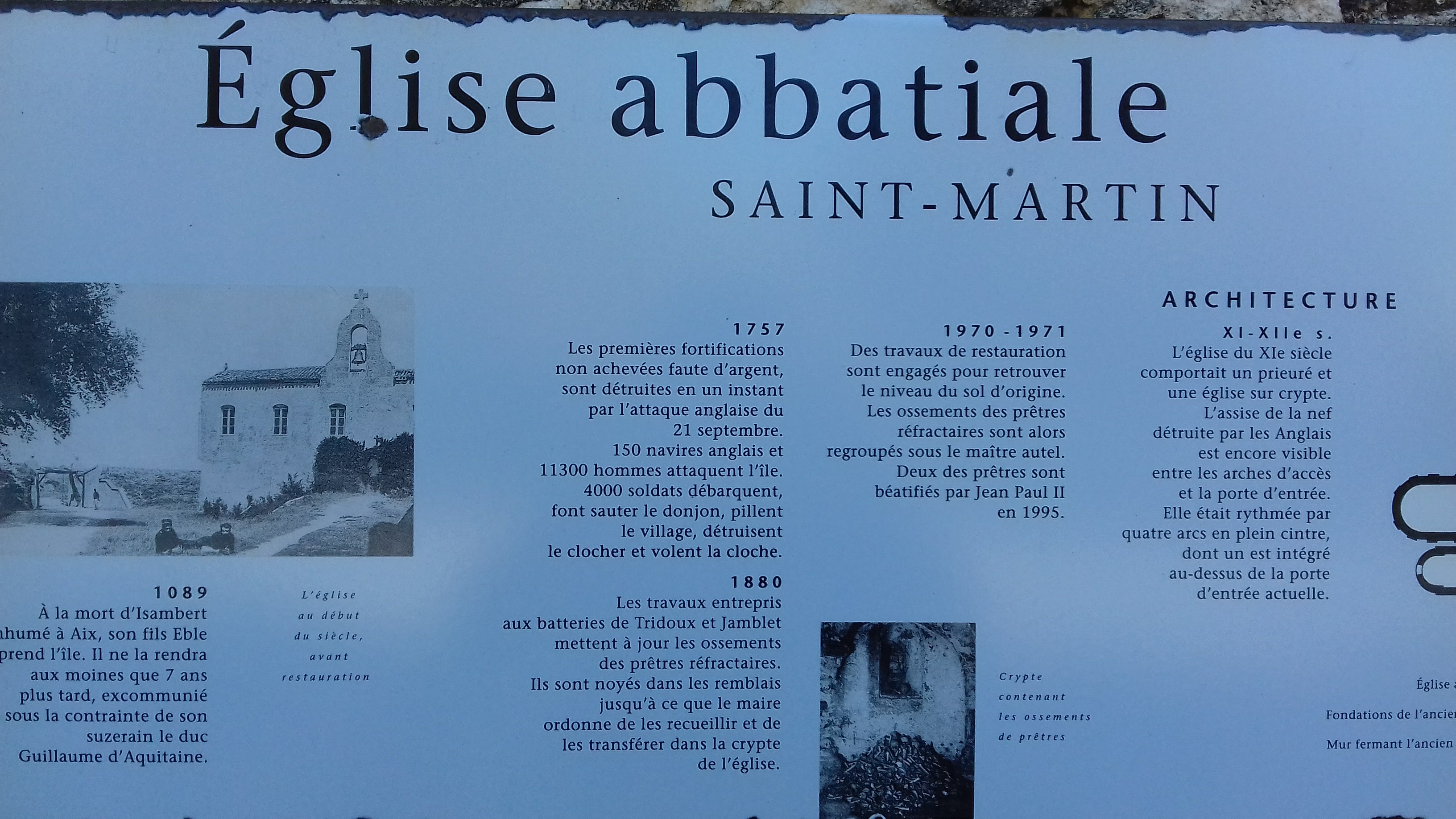 L'église Saint-Martin est un des maigres vestiges d'un prieuré établi en 1067, peu après la donation de l'île à la puissante abbaye de Cluny. L'église actuelle apparaît comme particulièrement mutilée, se limitant à l'ancien transept, à une petite absidiole (greffée sur l'ancien croisillon nord) ainsi qu'à une crypte romane aménagée entre le 11e et le 12e siècle. Elle est couverte d'une voûte d'arêtes portée par une série de 14 colonnettes aux chapiteaux ornés de motifs floraux, rare témoignage du premier art roman saintongeais.