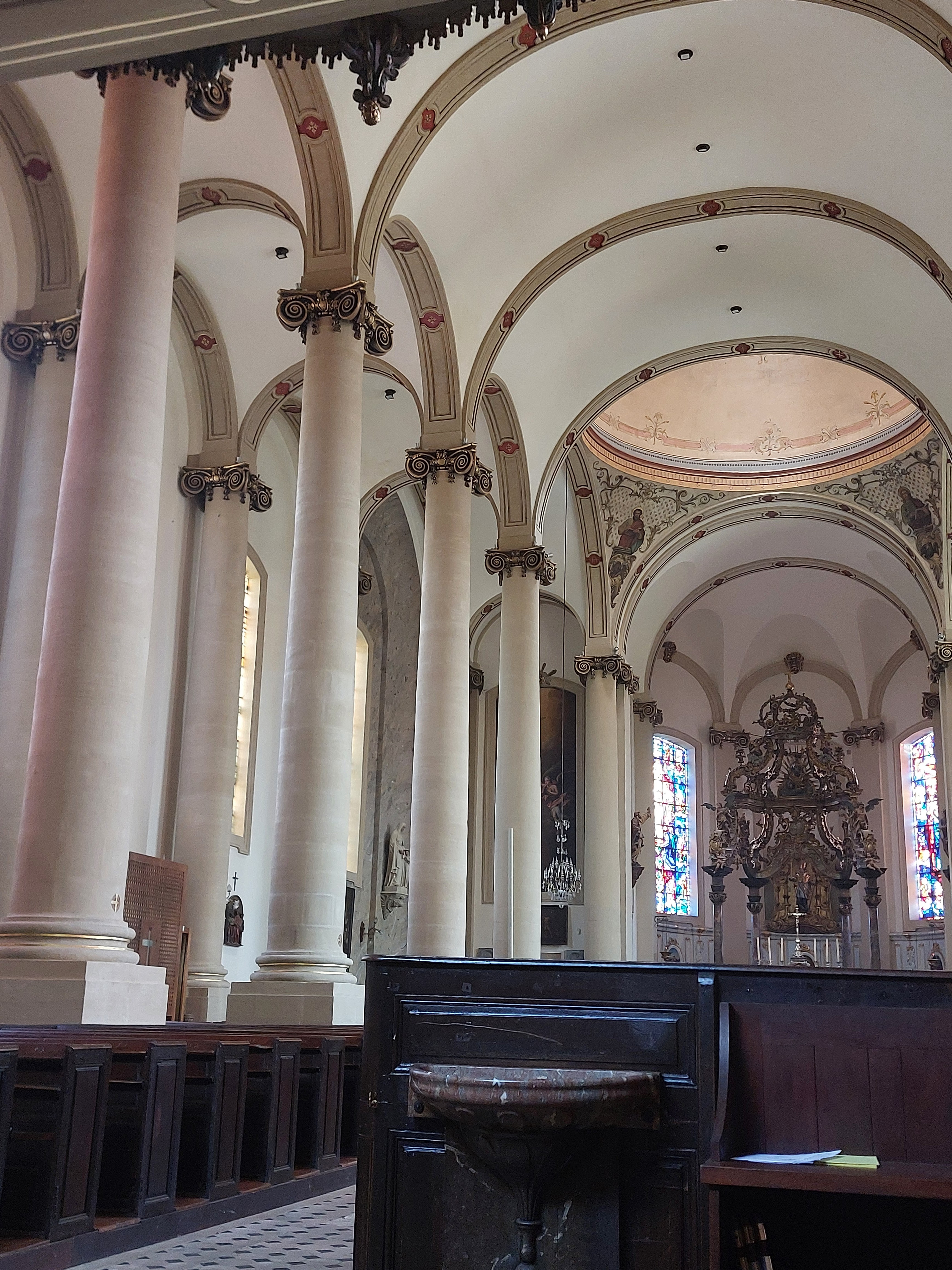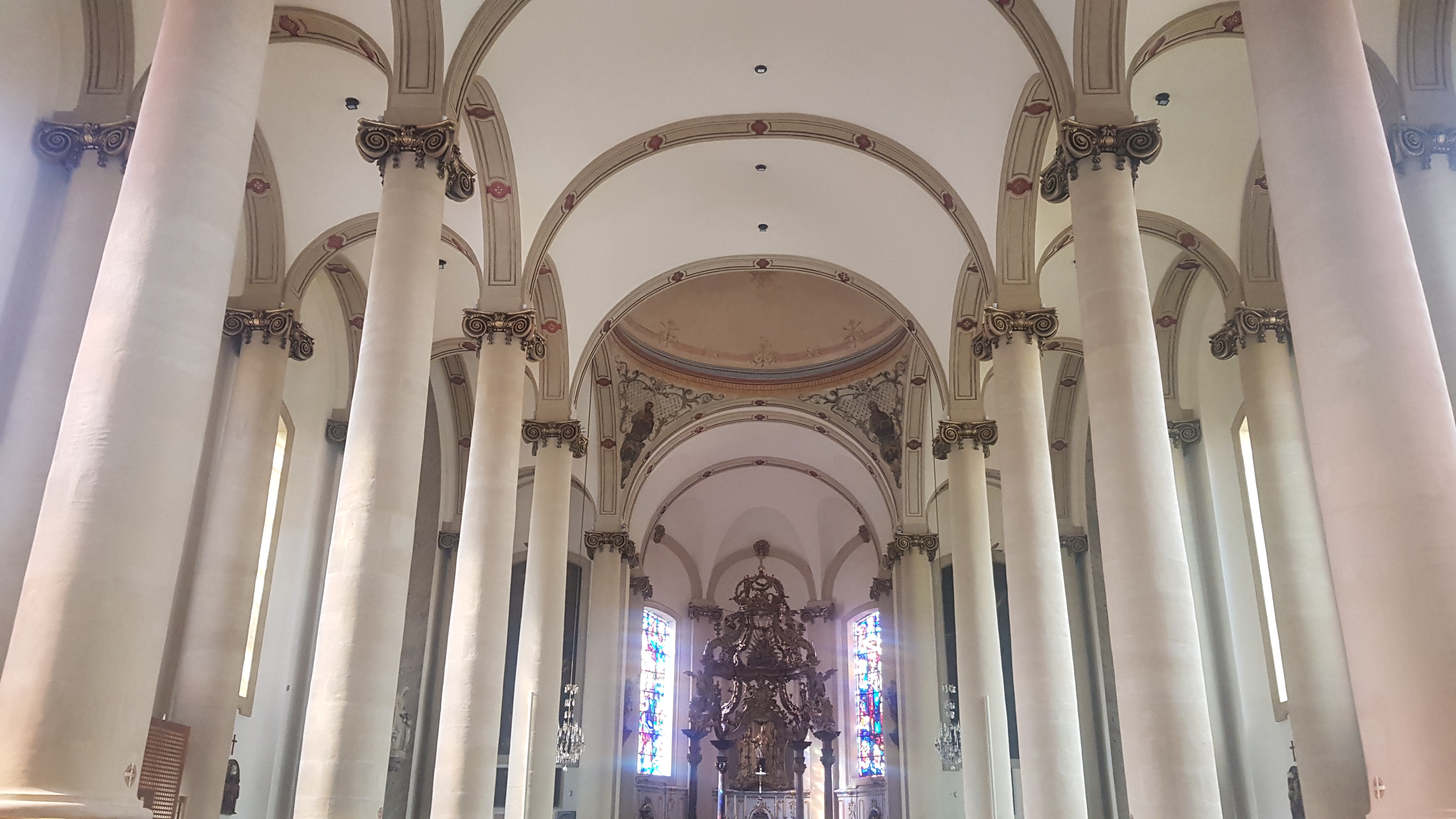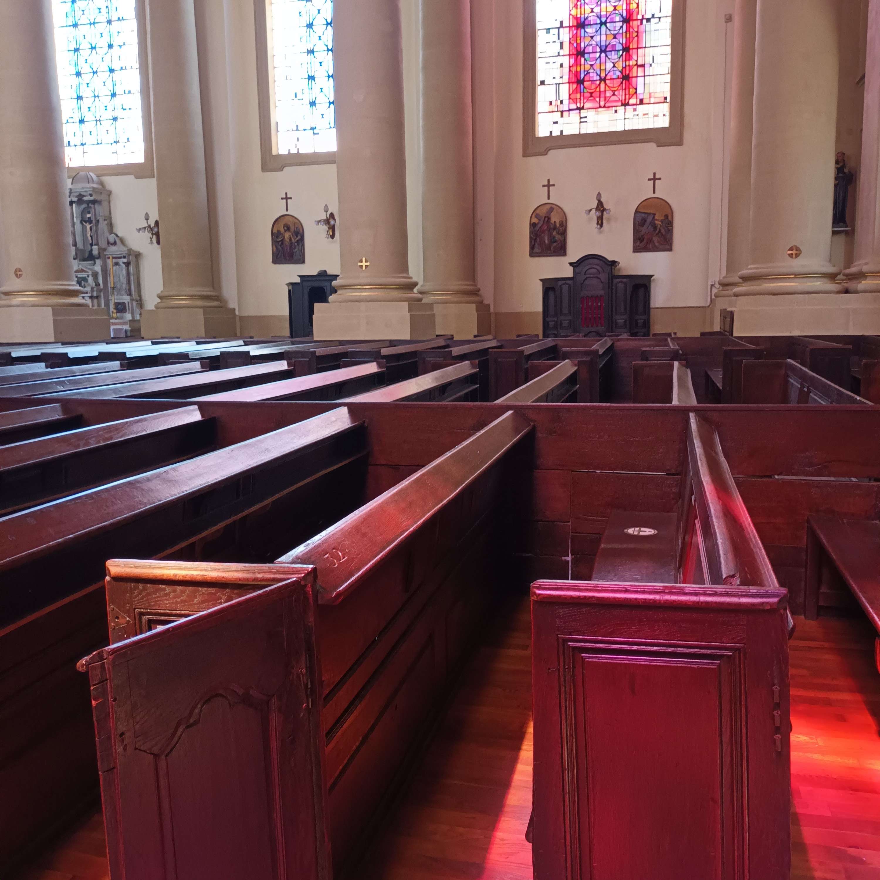 intérieur qui vaut surtout pour l'orgue, les vitraux n'ont rien d'extraordinaires même si le jeu de lumière scintille sur les colonnes
