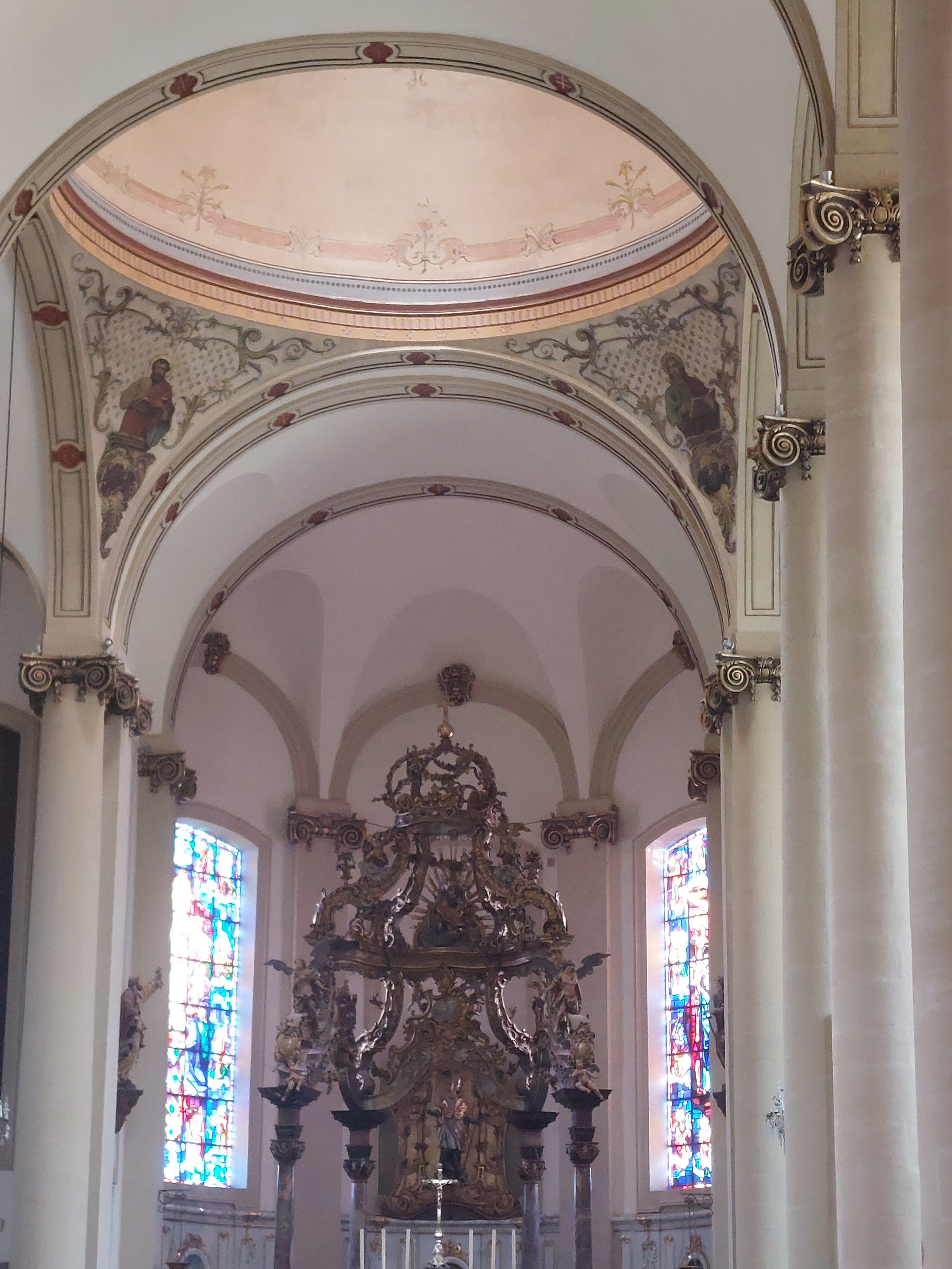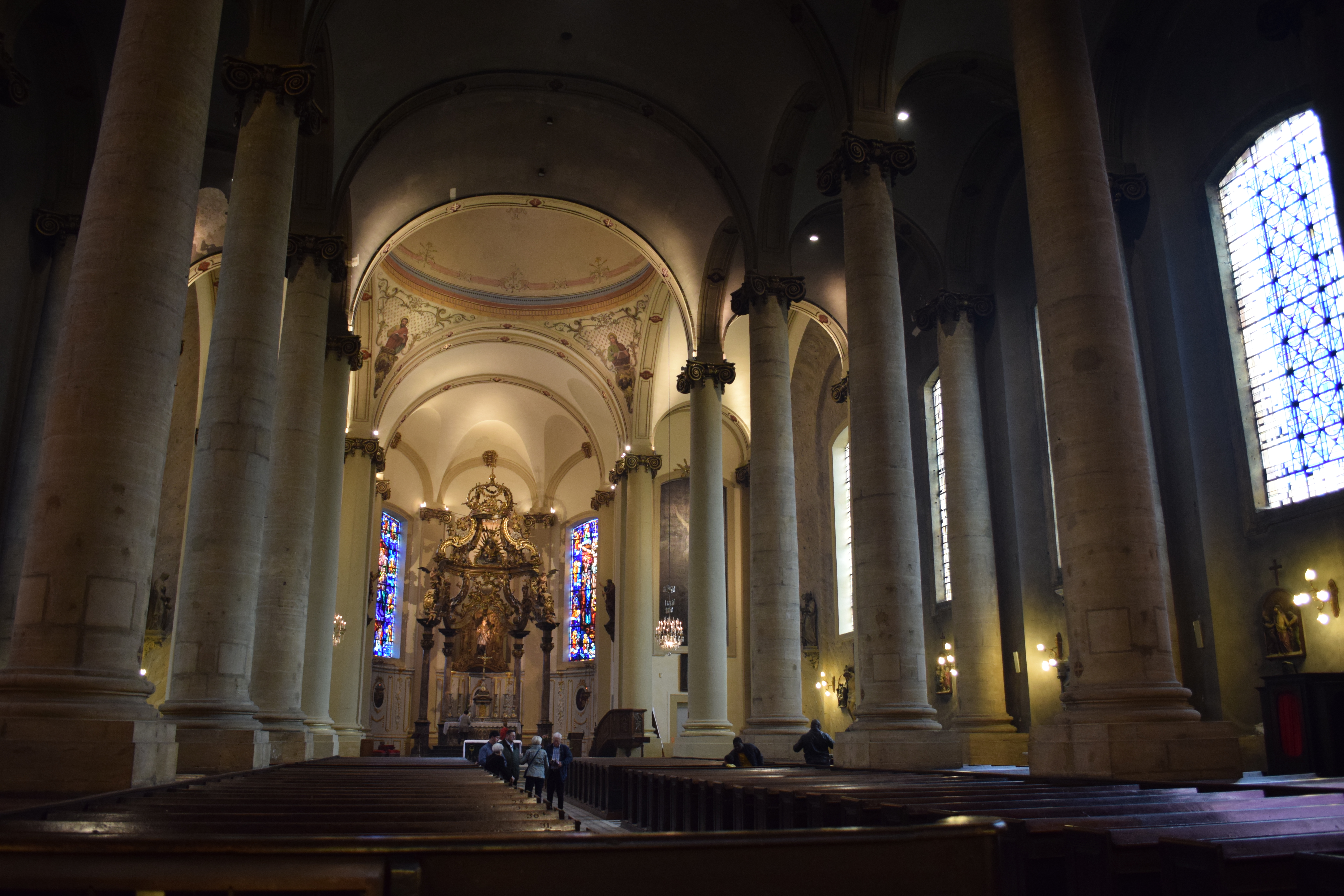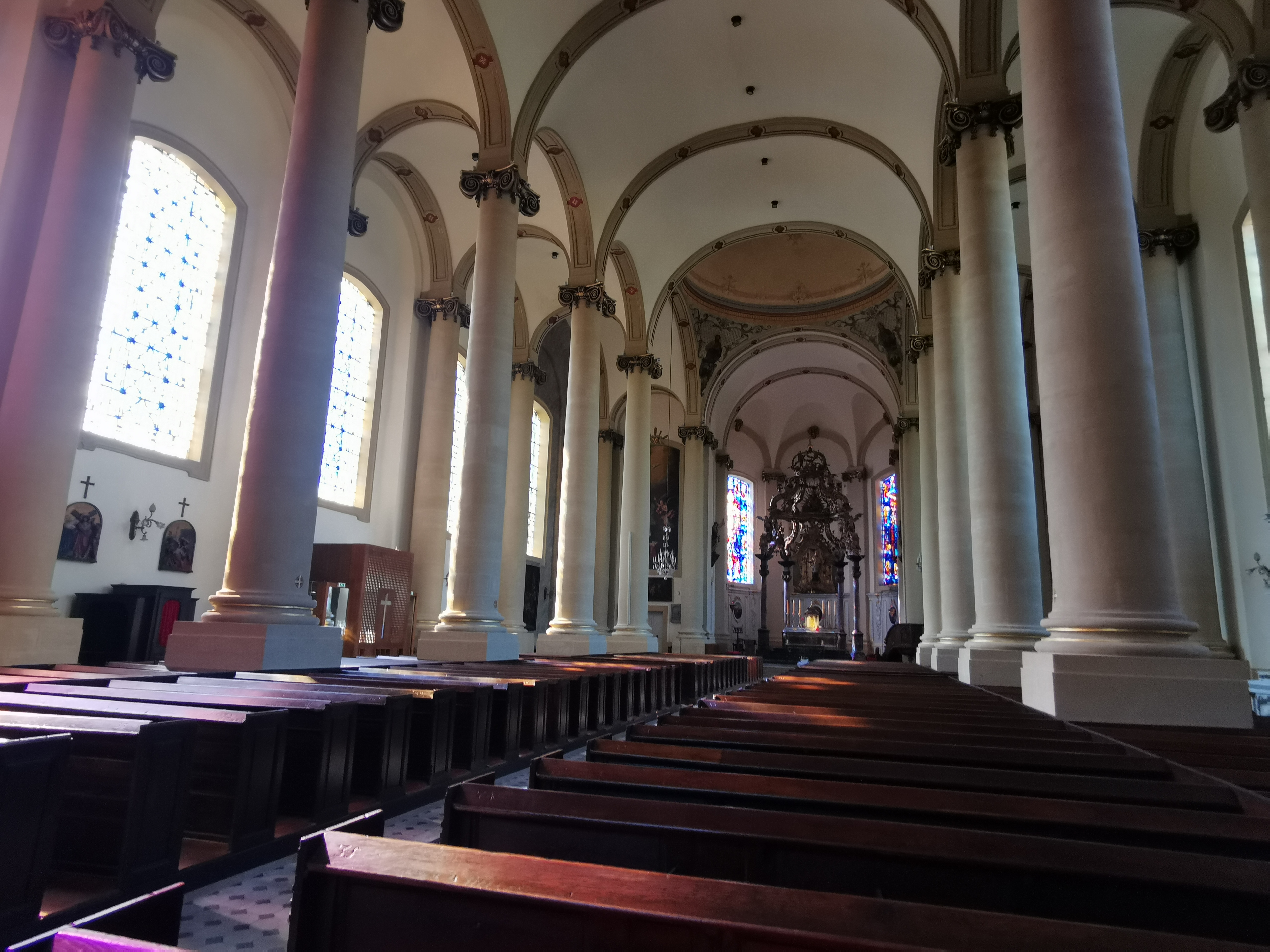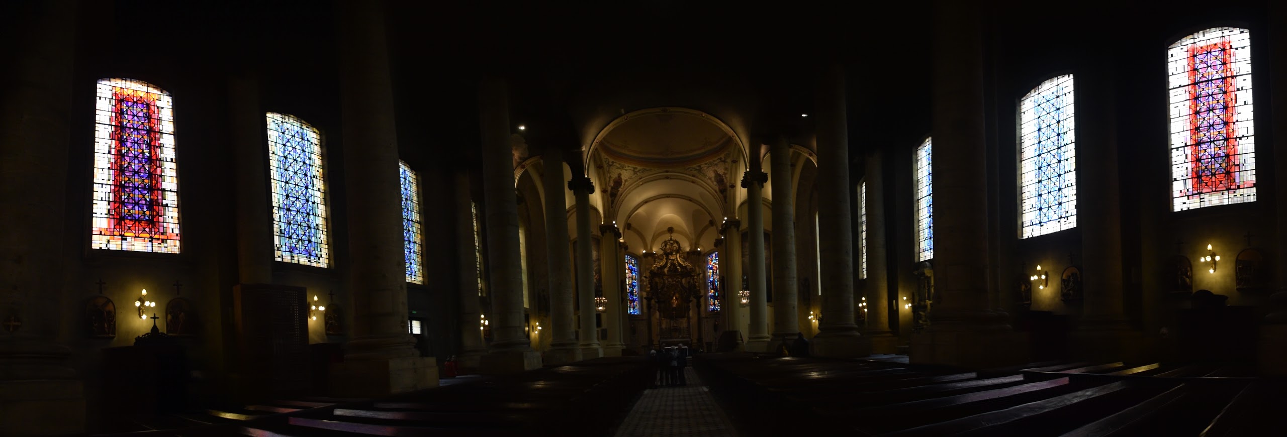 intérieur qui vaut surtout pour l'orgue, les vitraux n'ont rien d'extraordinaires même si le jeu de lumière scintille sur les colonnes